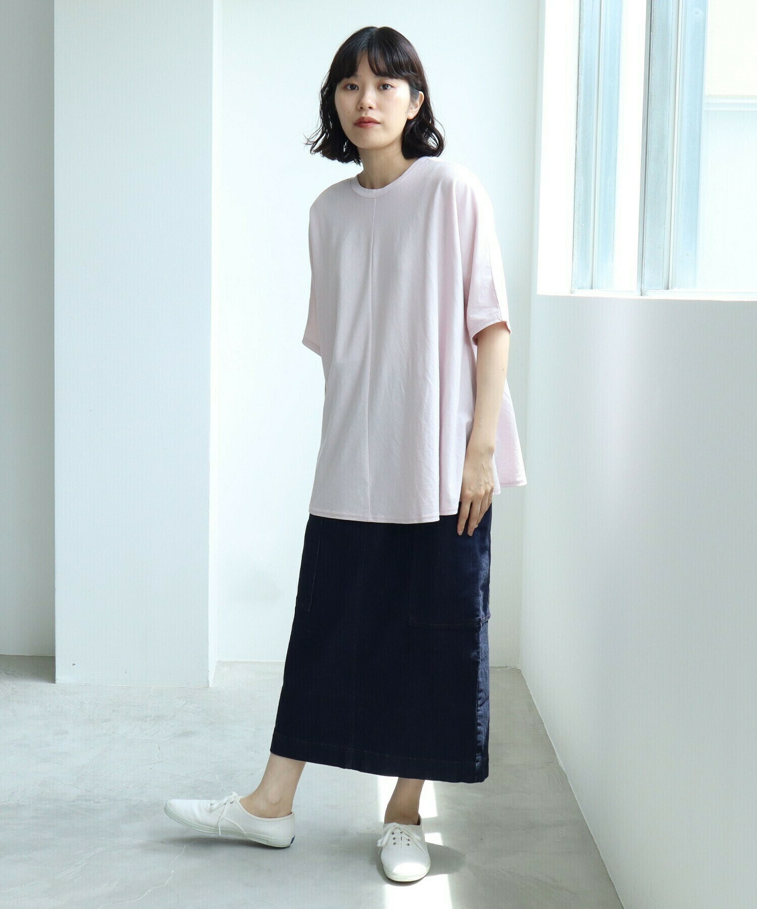 春夏はTシャツやブラウスと軽やかに、秋冬はニットやタイツを合わせて。