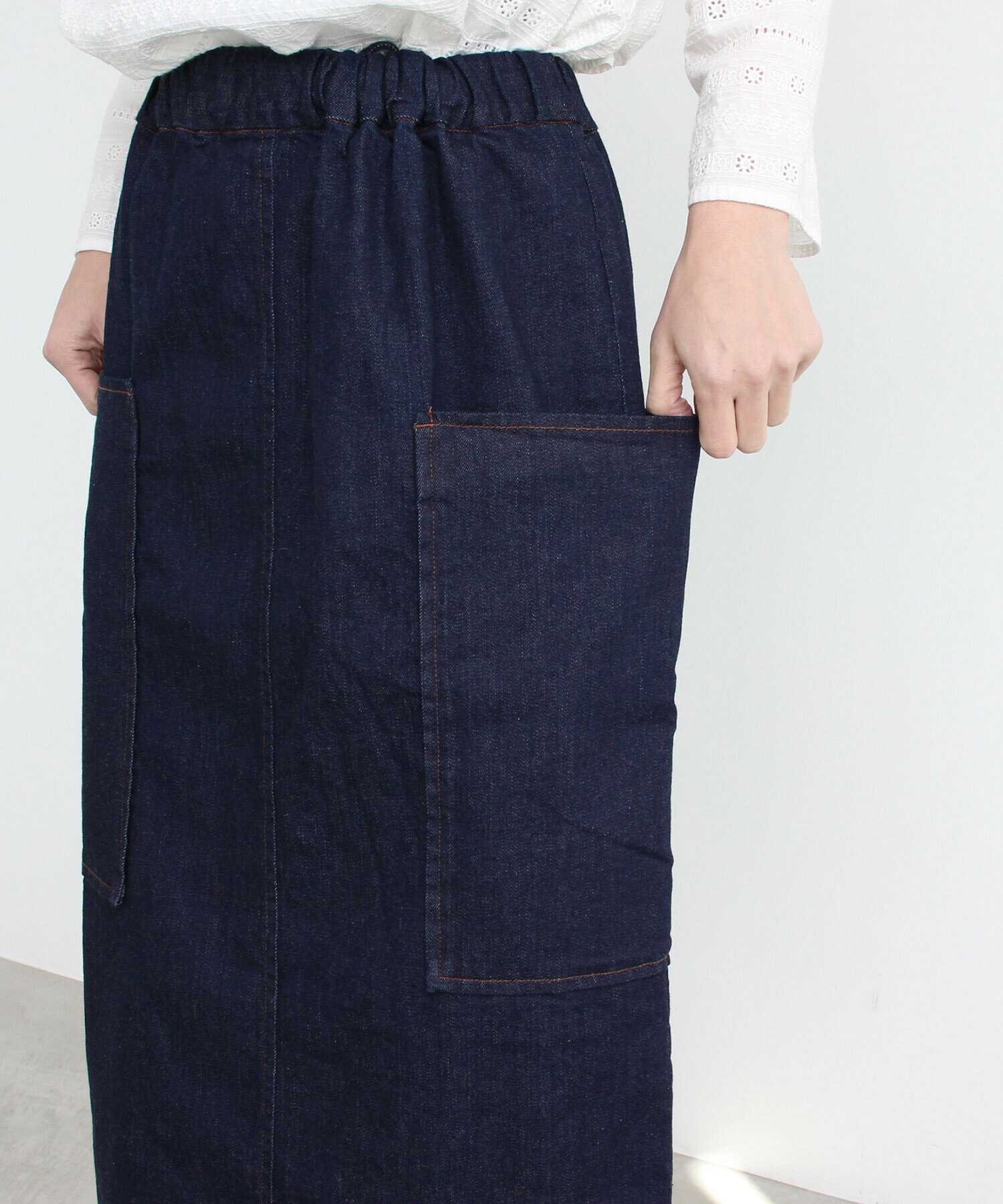 yuniで定番として愛されている、柔らかくストレッチの効いたムラ糸デニムを使ったタイトスカート。