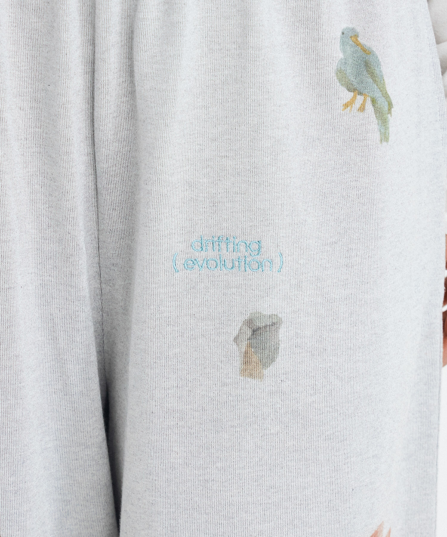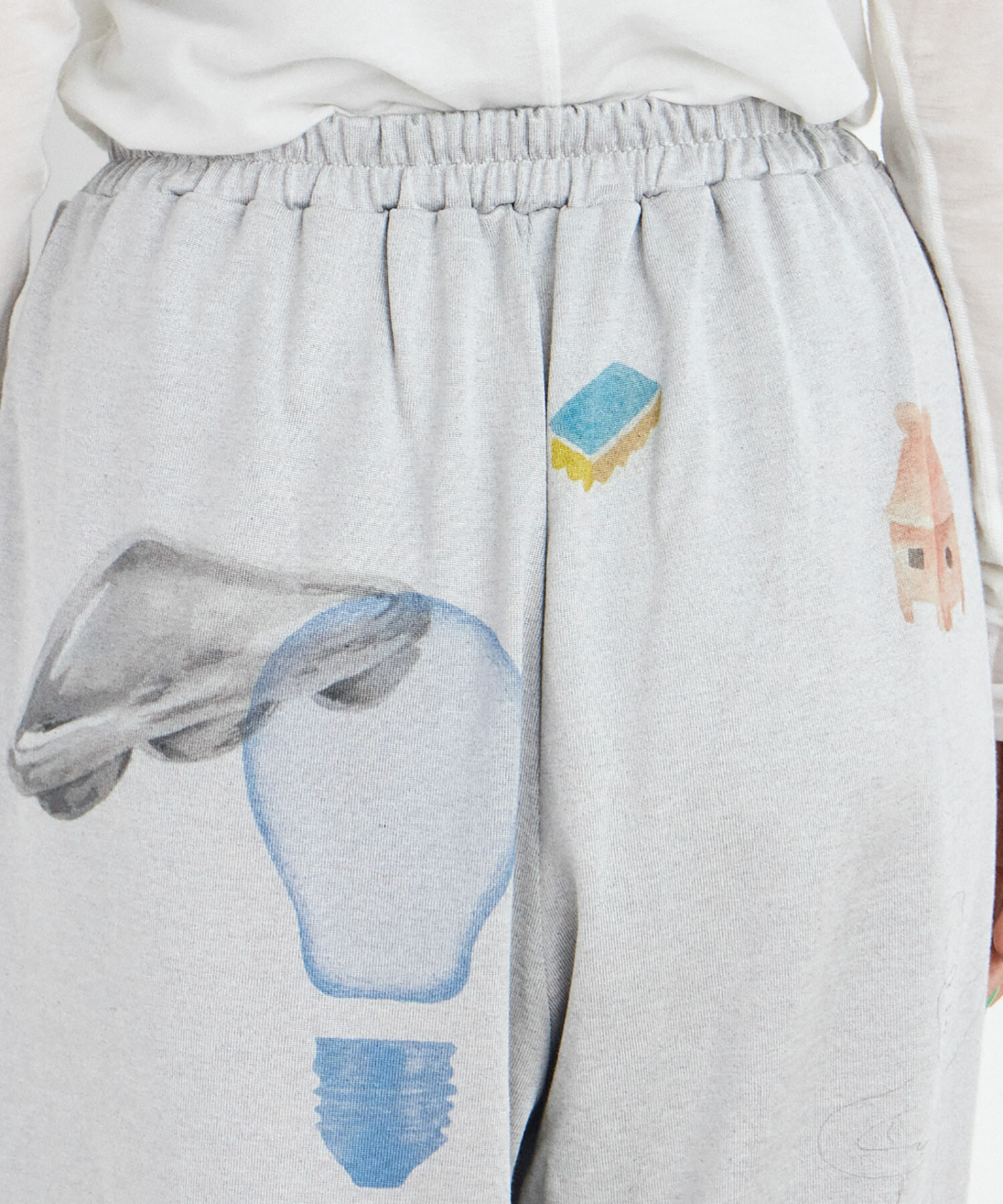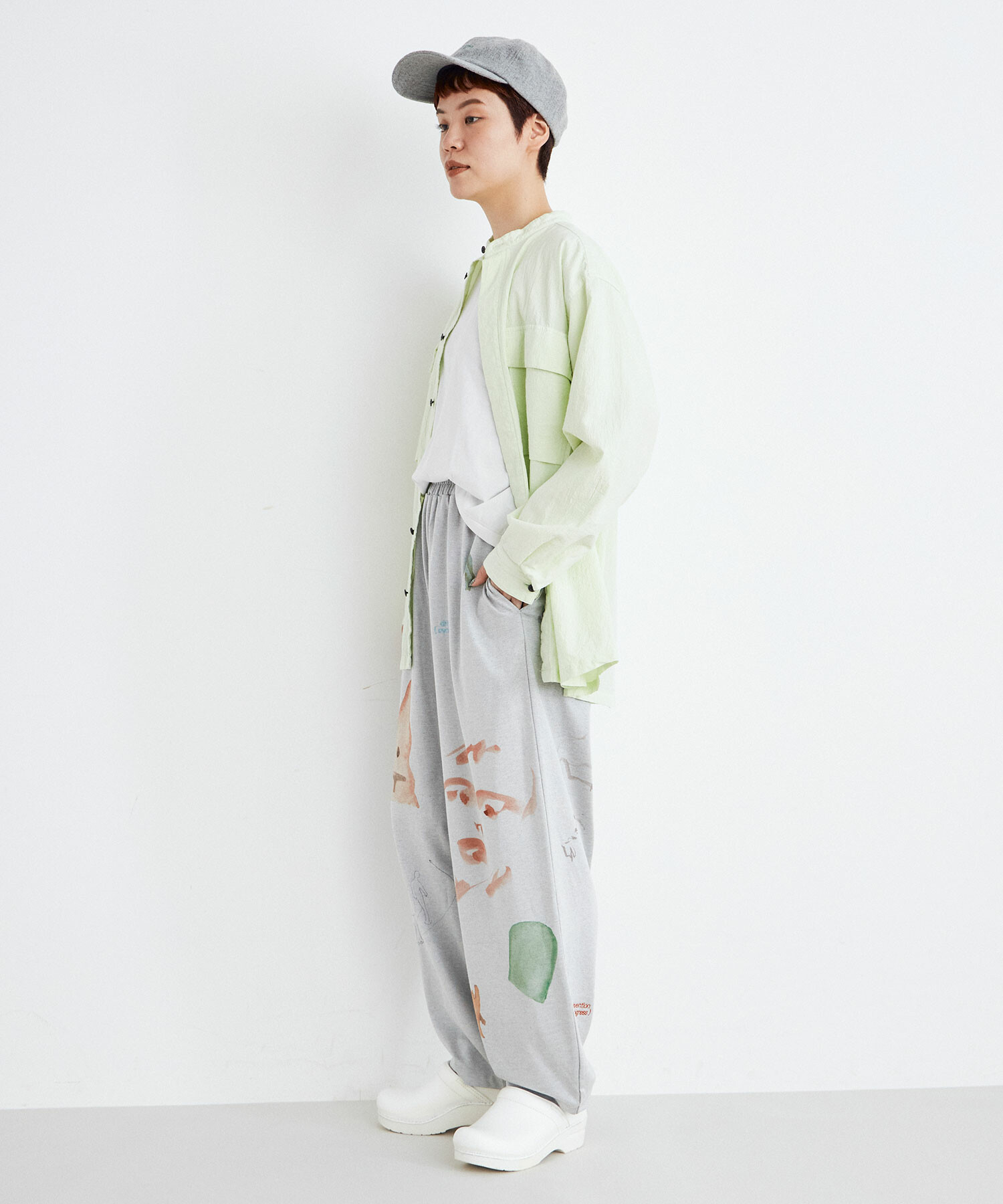 グレーの生地色に手描きの柔らかい色が溶け込み、味わい深く着用が楽しいパンツになりました。