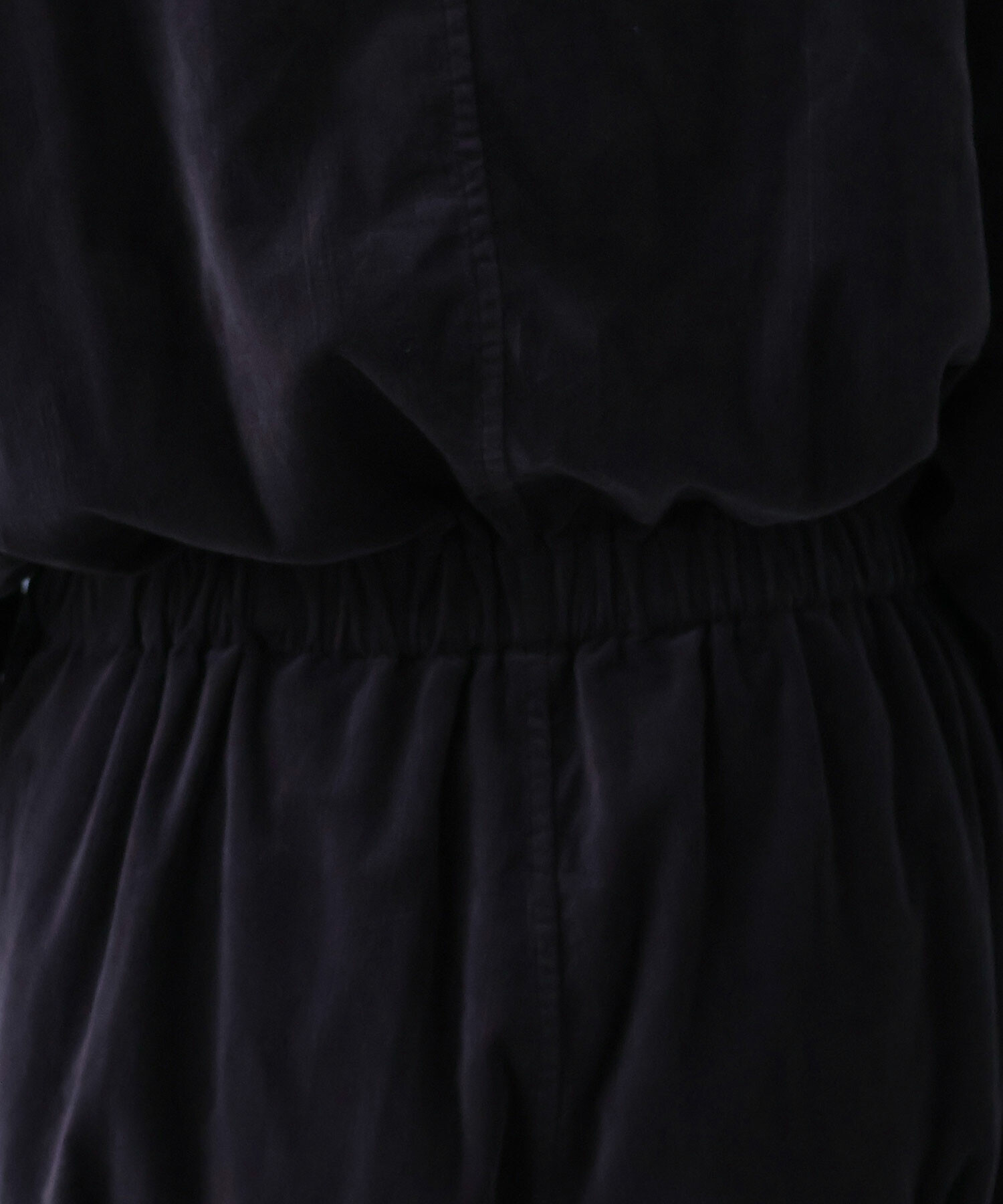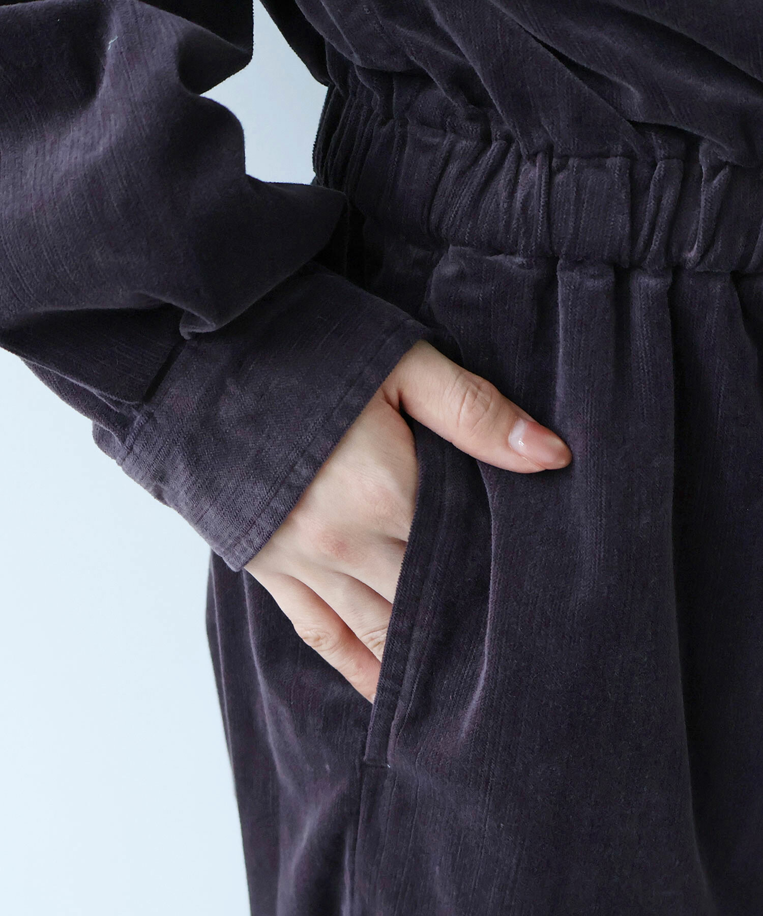 低めなハイネックでコンパクトなトップスにウエスト周りはゆったりとゴムを入れました。