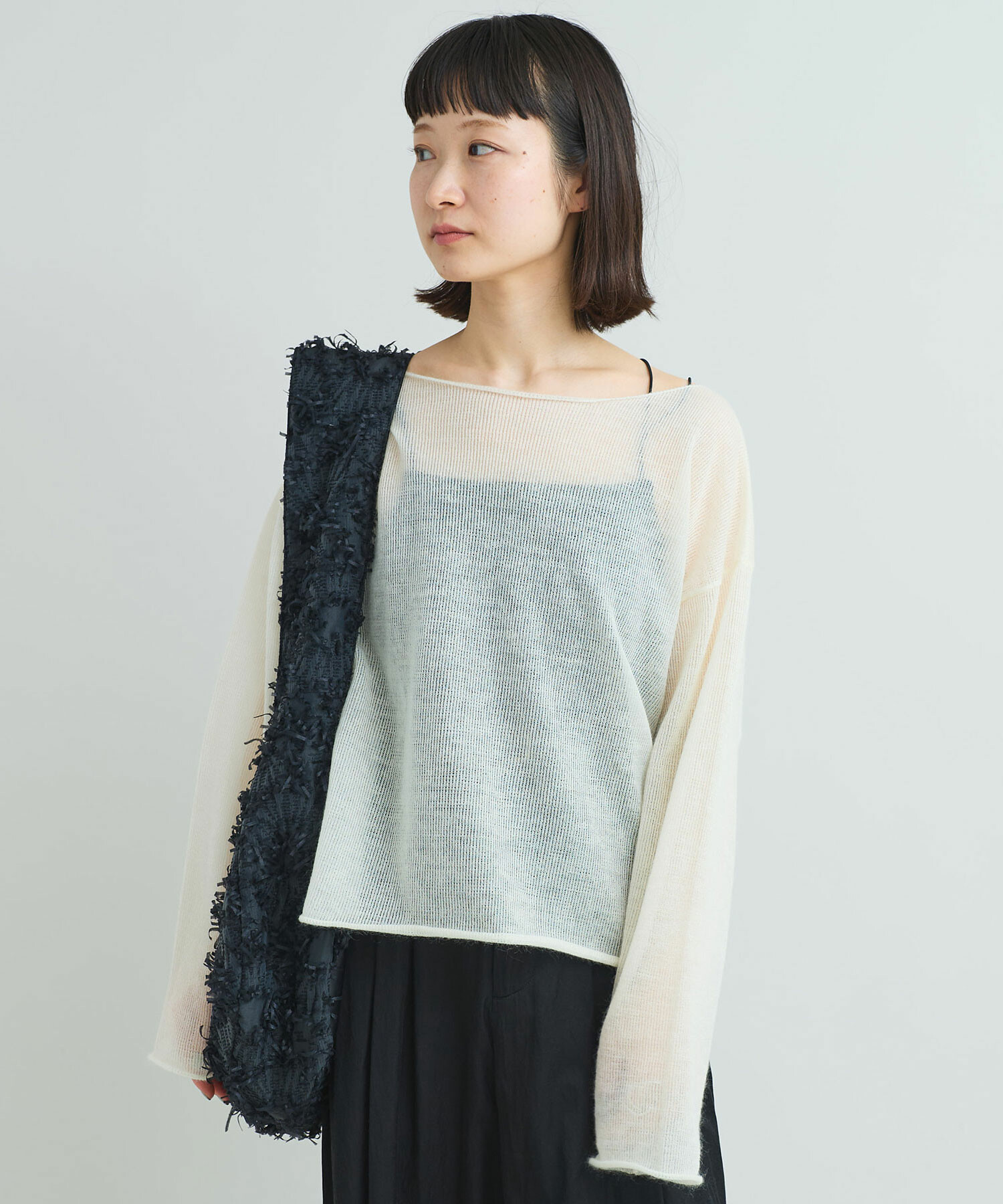 ・この製品に使用している生地はカットジャガードの組織になっています。毛足の部分は引っ張ると抜けてしまうので、取扱いにご注意ください。また、お洗濯は専門店での石油系ドライクリーニングでお願いします。また、縦糸にナイロン糸を使用しているため、熱で縮む恐れがありますのでアイロンはなるべくお避け下さい。毛足の部分は着用やお洗濯を重ねる事で毛が寝てしまったり、絡んでくる事がありますが、生地の特性になりますのでご了承ください。