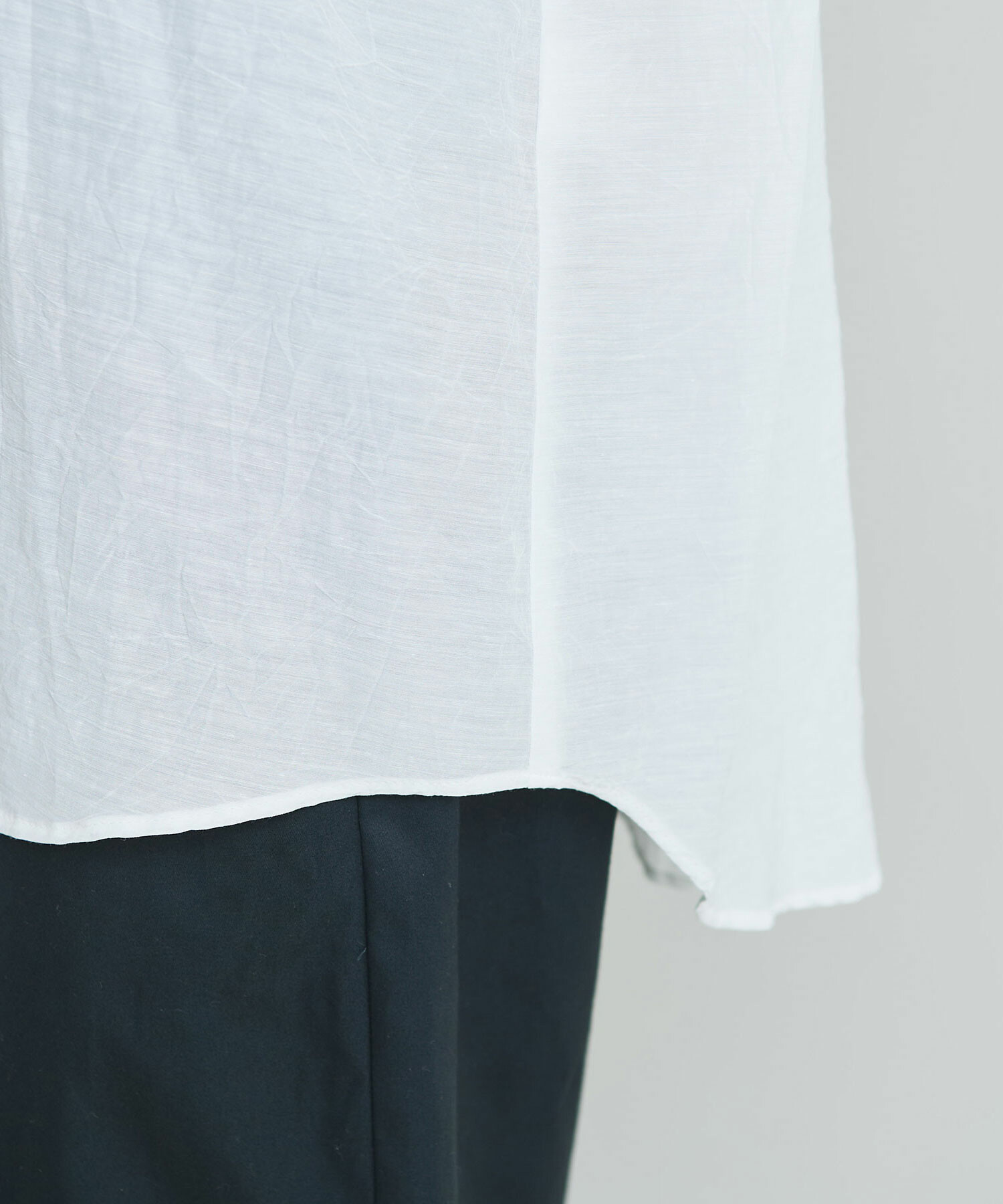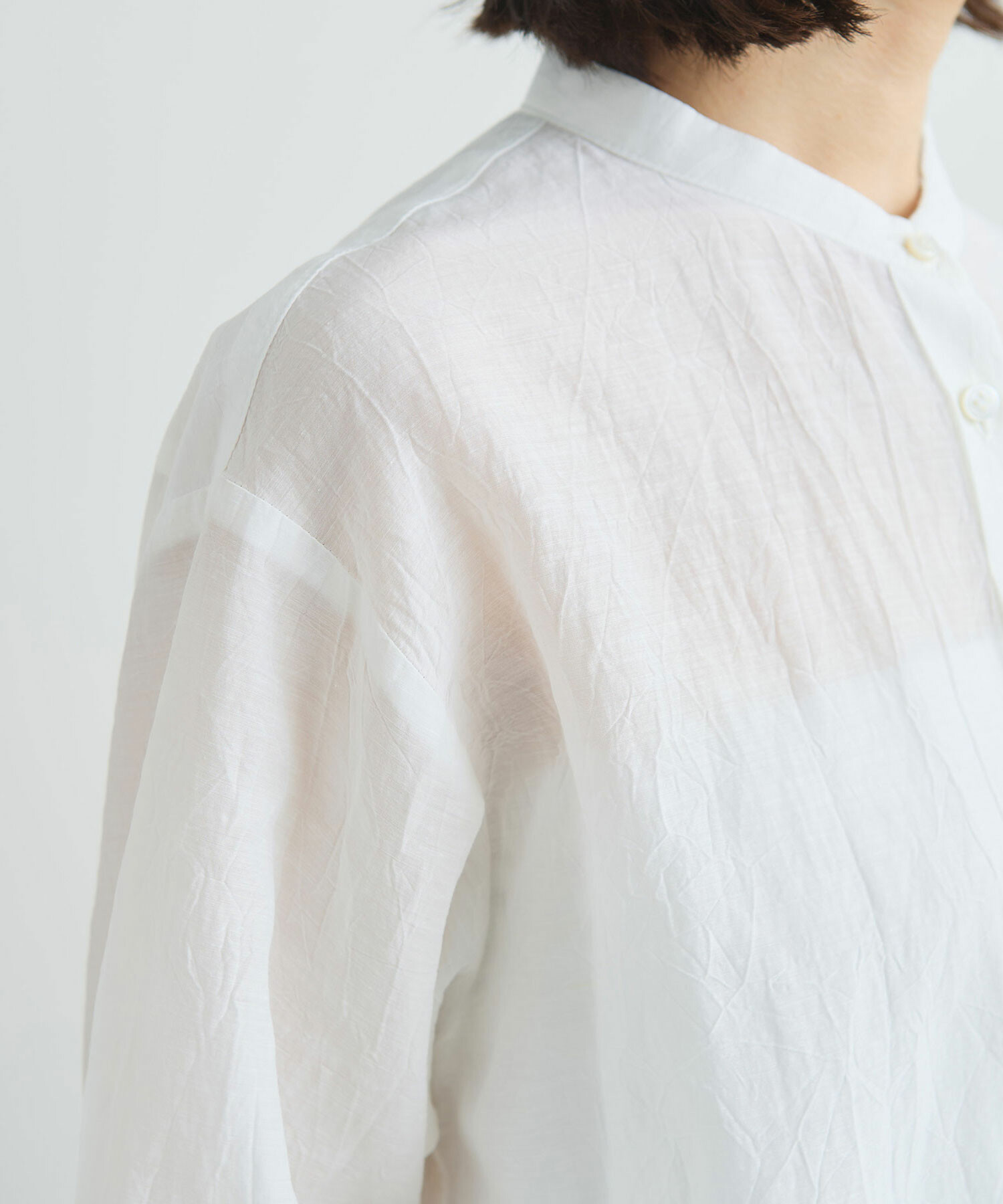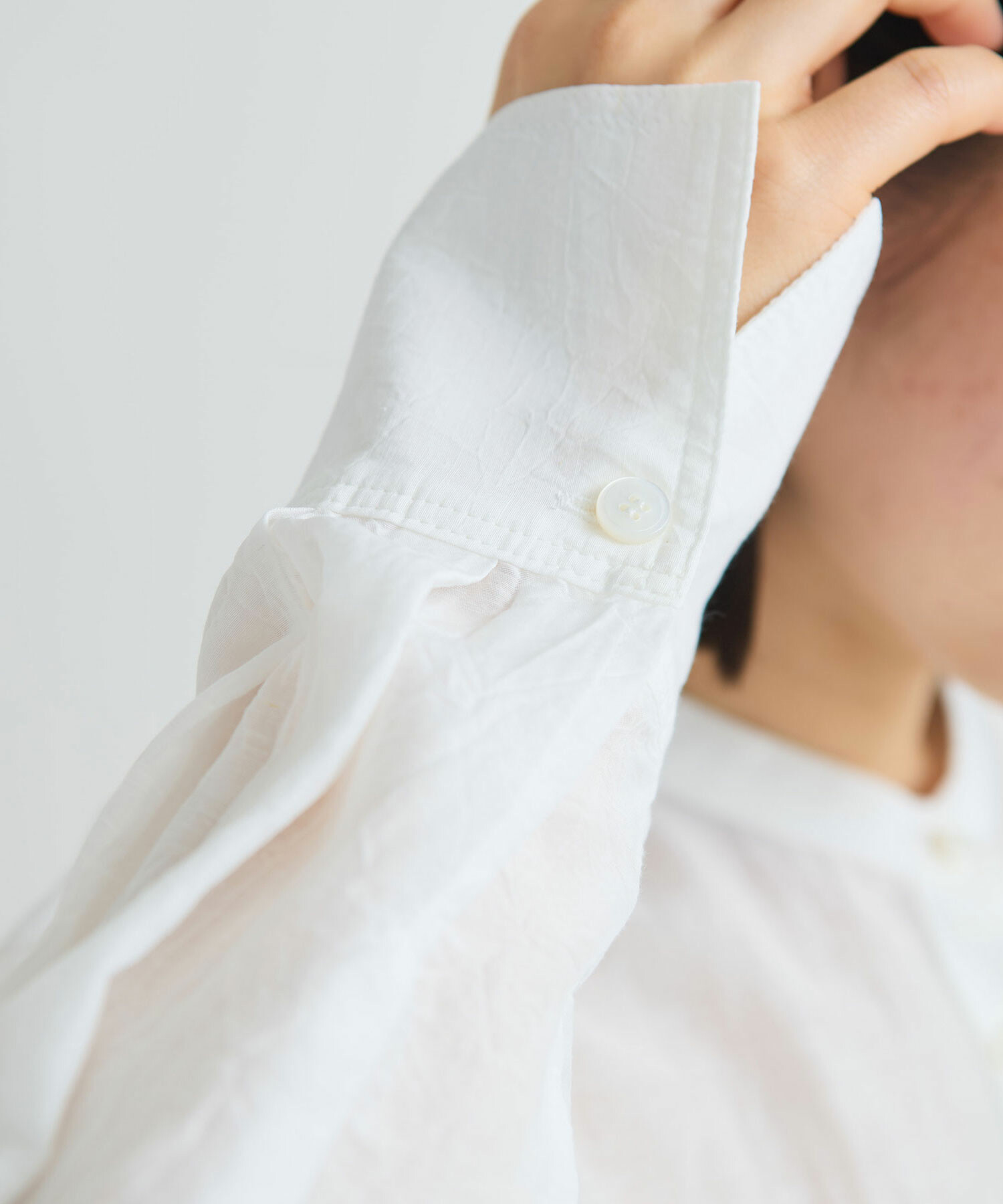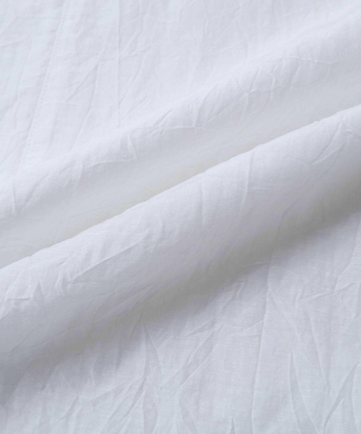縦糸に60デニールのキュプラ、横糸に綿リネンを織った平織り生地には、特殊シワ加工の桐生シワを生地の段階で施し、表情ある仕上がりに。