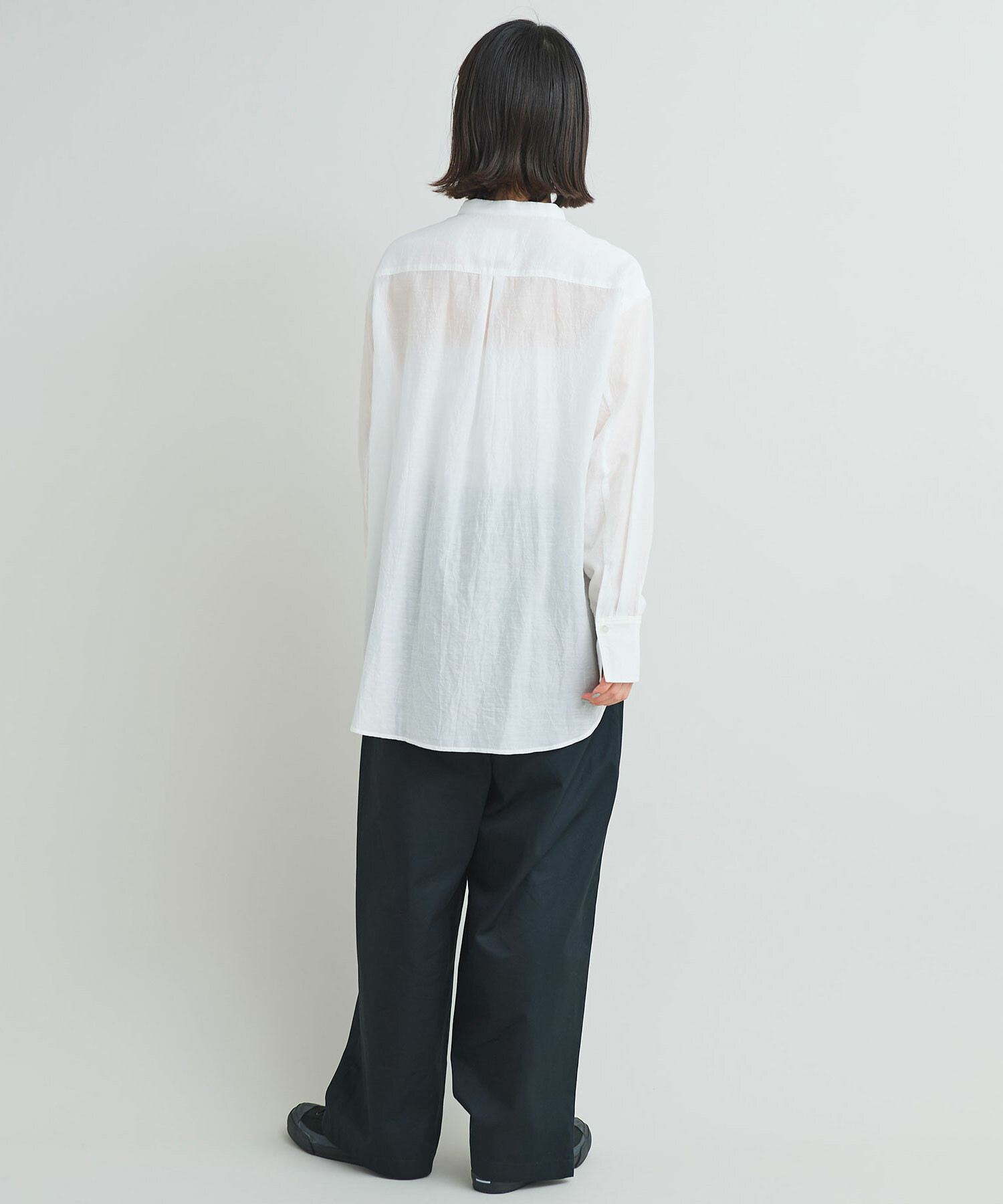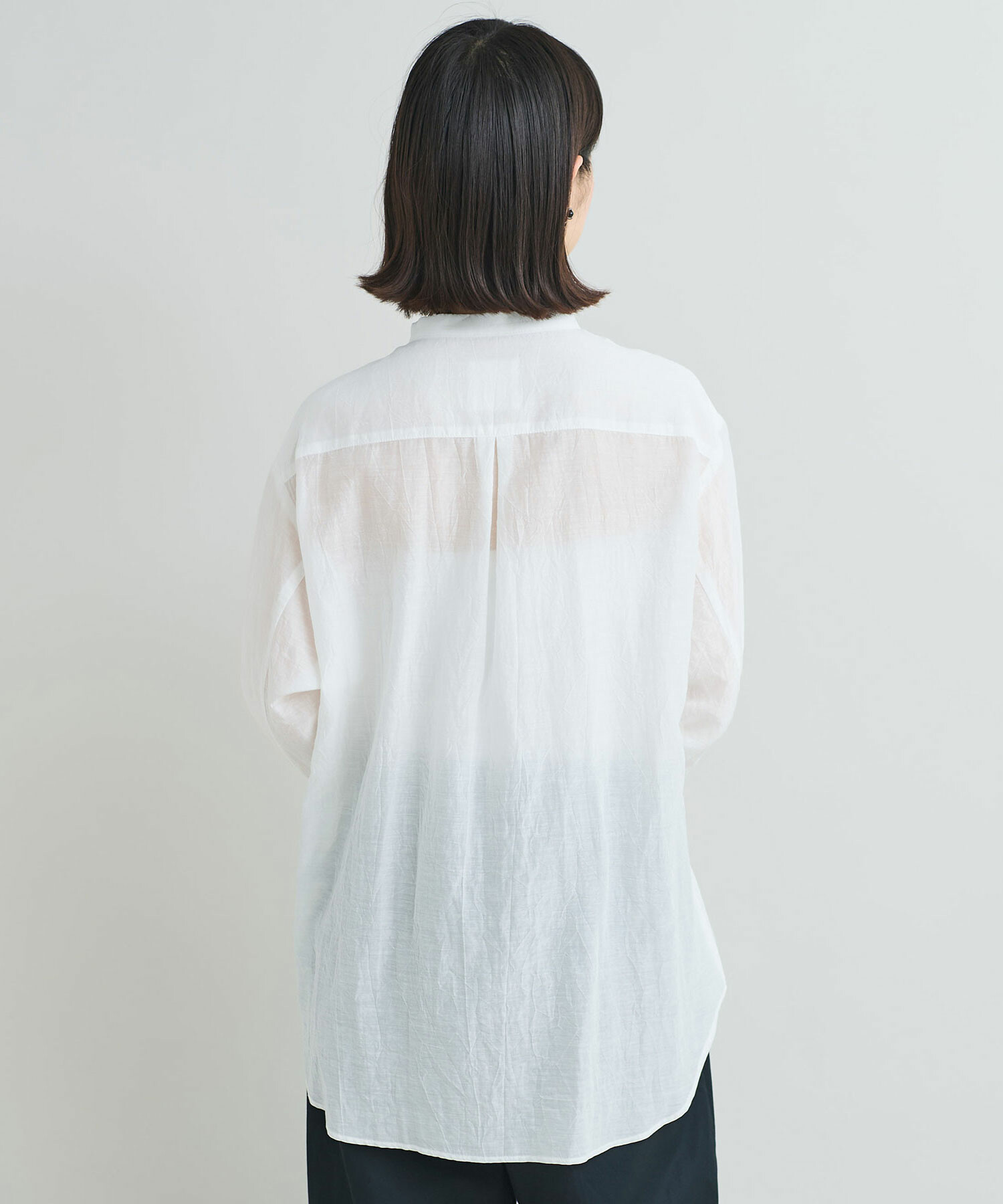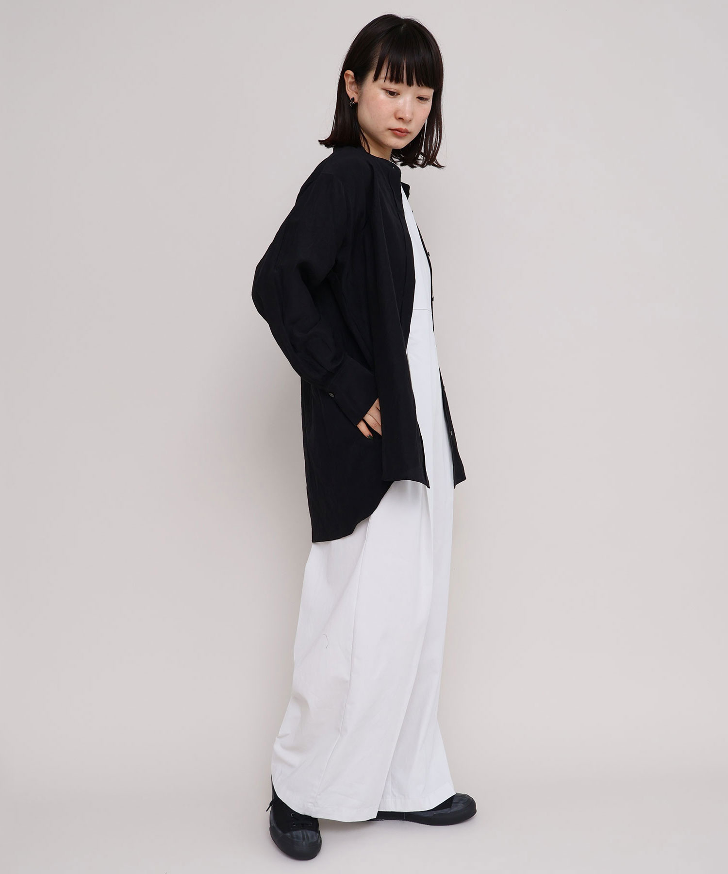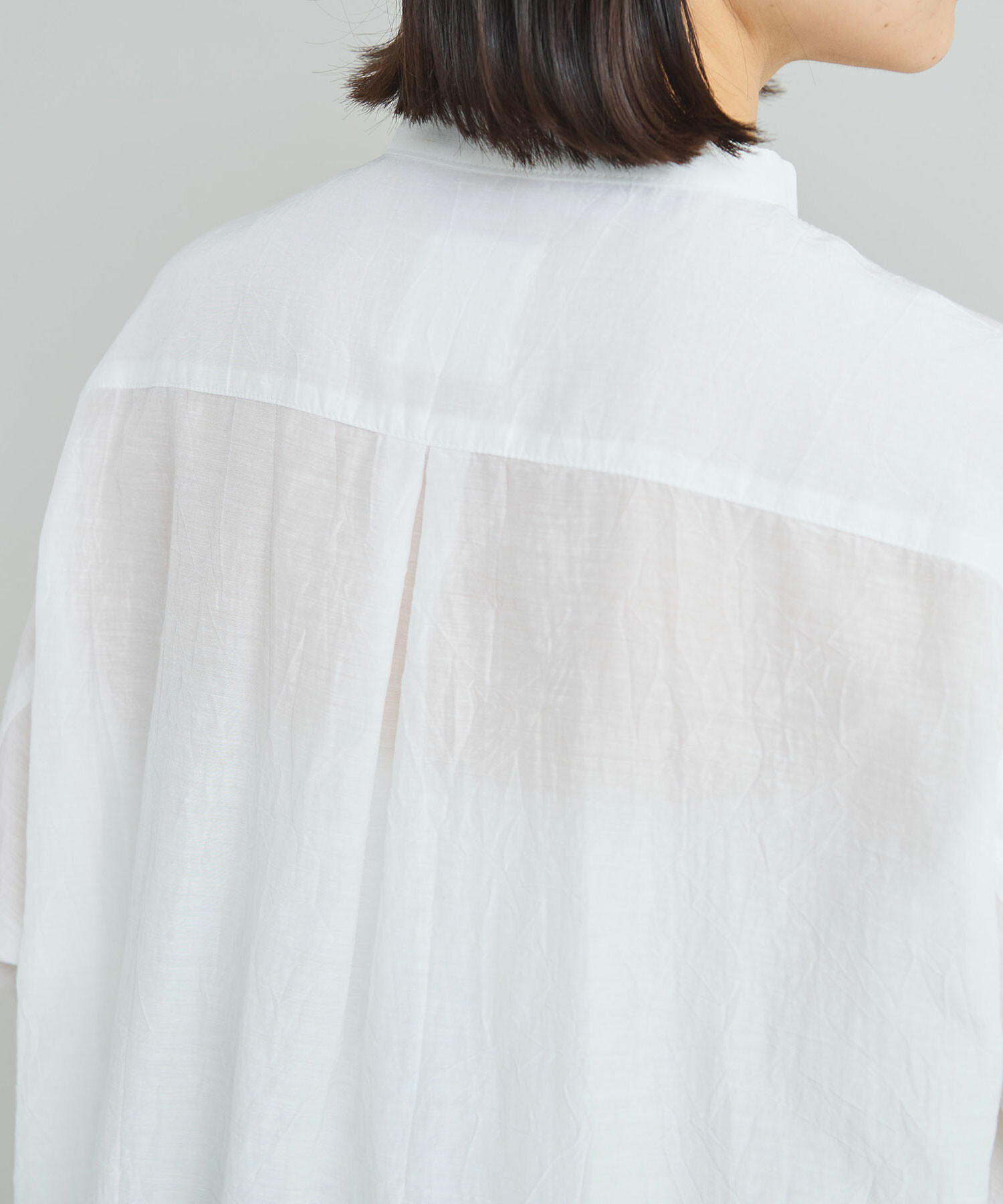 縦糸に60デニールのキュプラ、横糸に綿リネンを織った平織り生地には、特殊シワ加工の桐生シワを生地の段階で施し、表情ある仕上がりに。