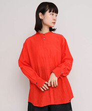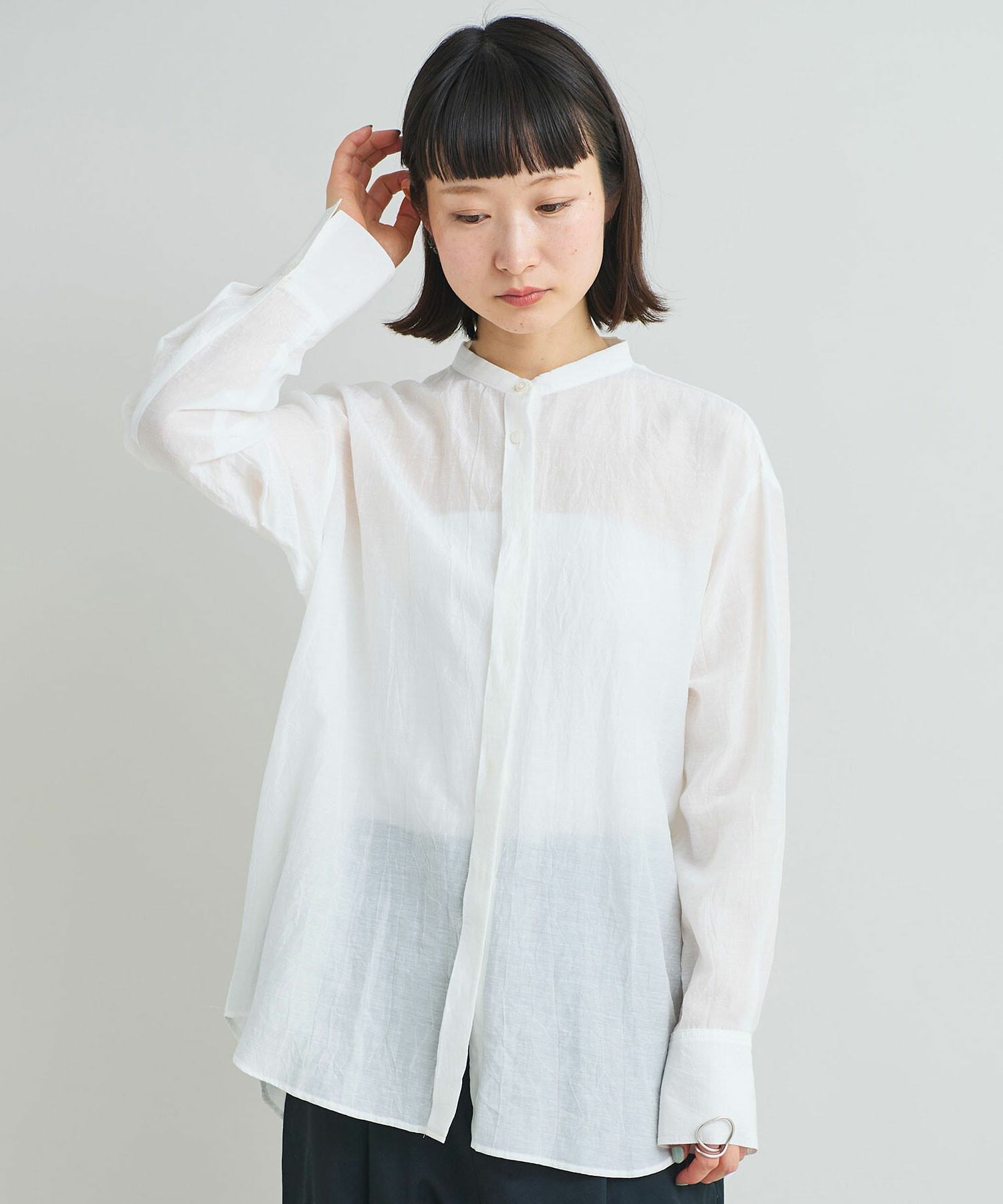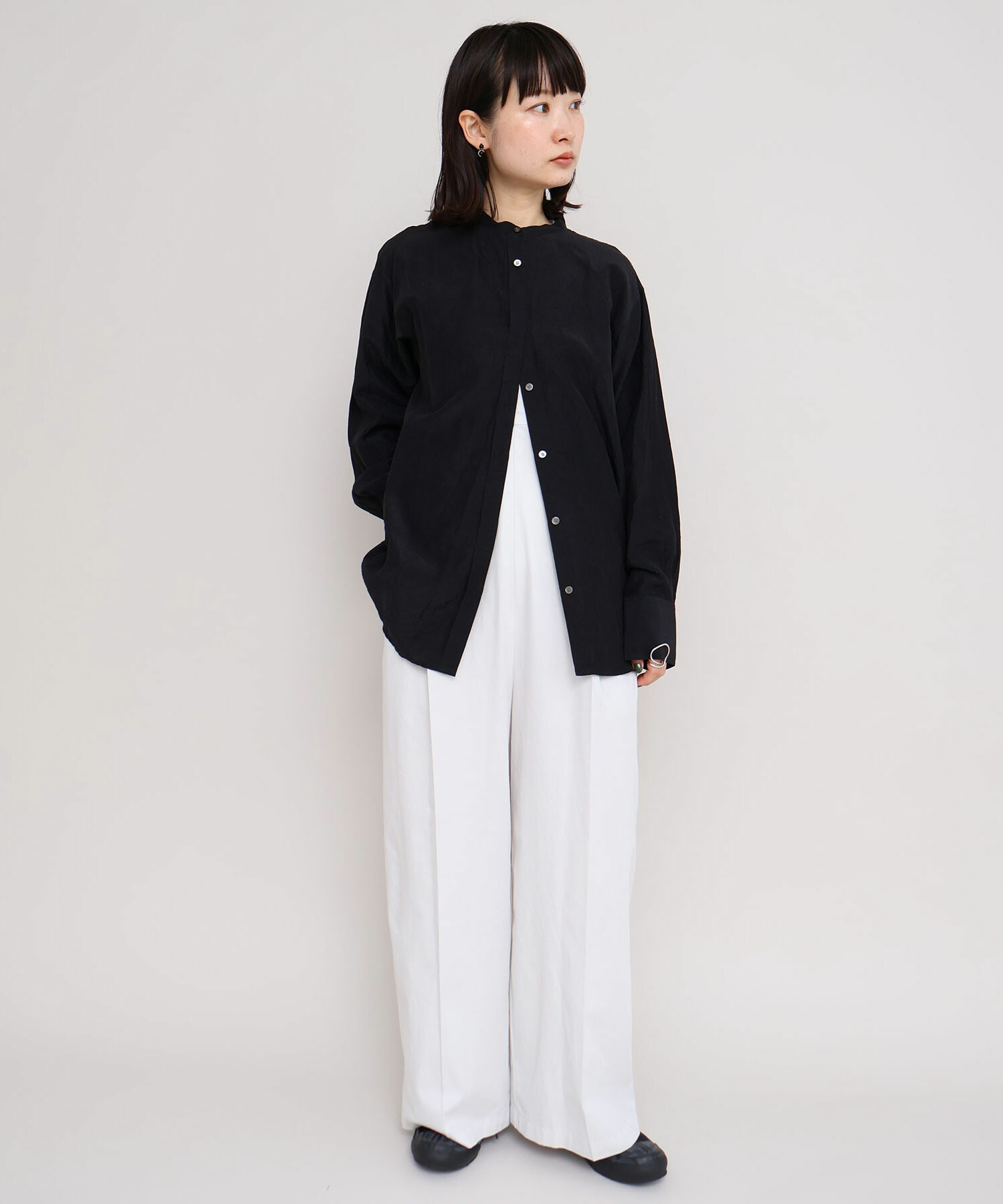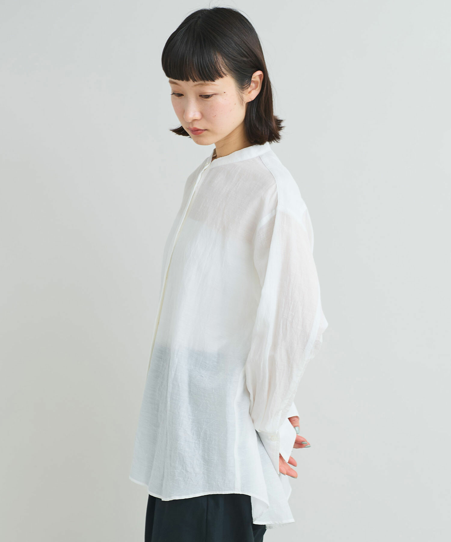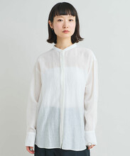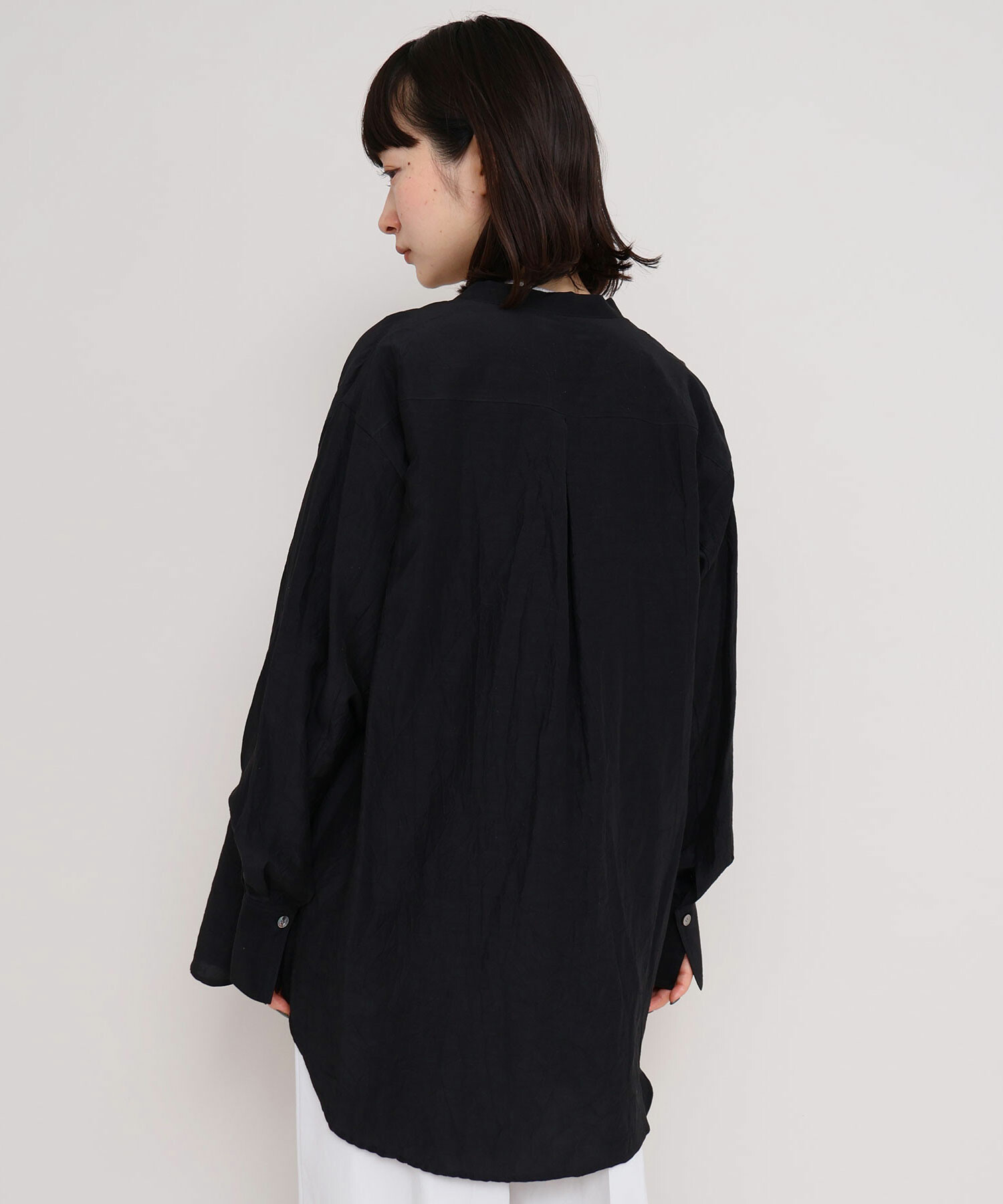 縦糸に60デニールのキュプラ、横糸に綿リネンを織った平織り生地には、特殊シワ加工の桐生シワを生地の段階で施し、表情ある仕上がりに。