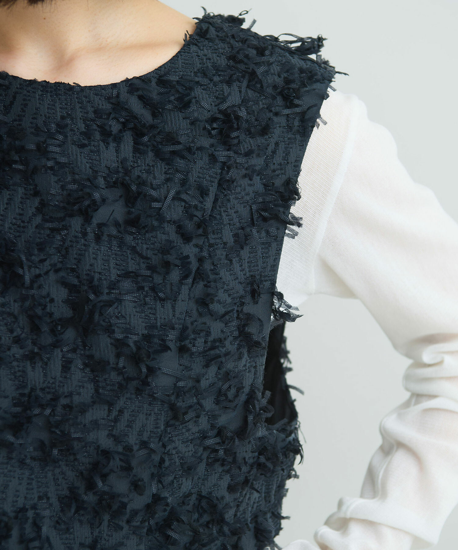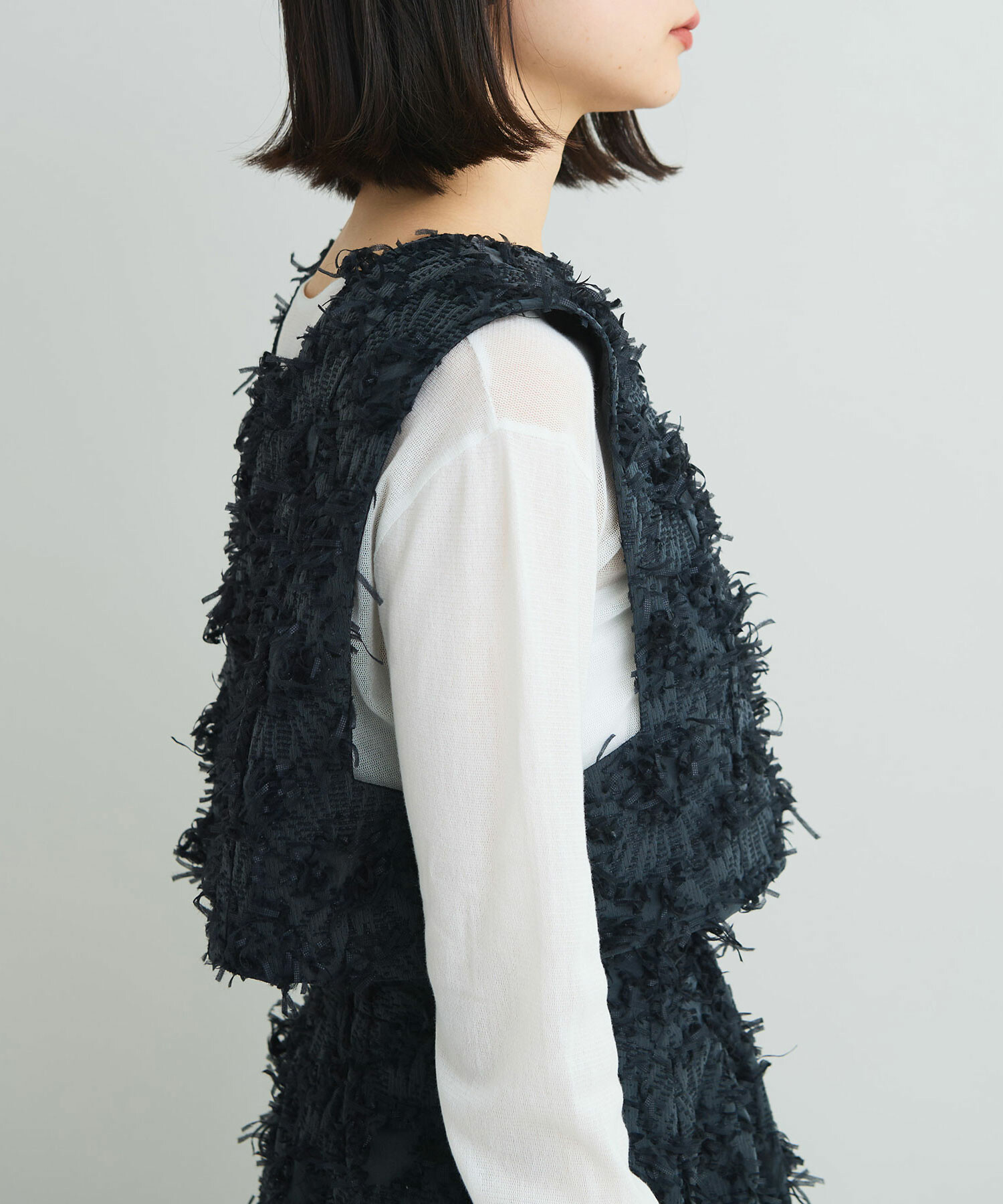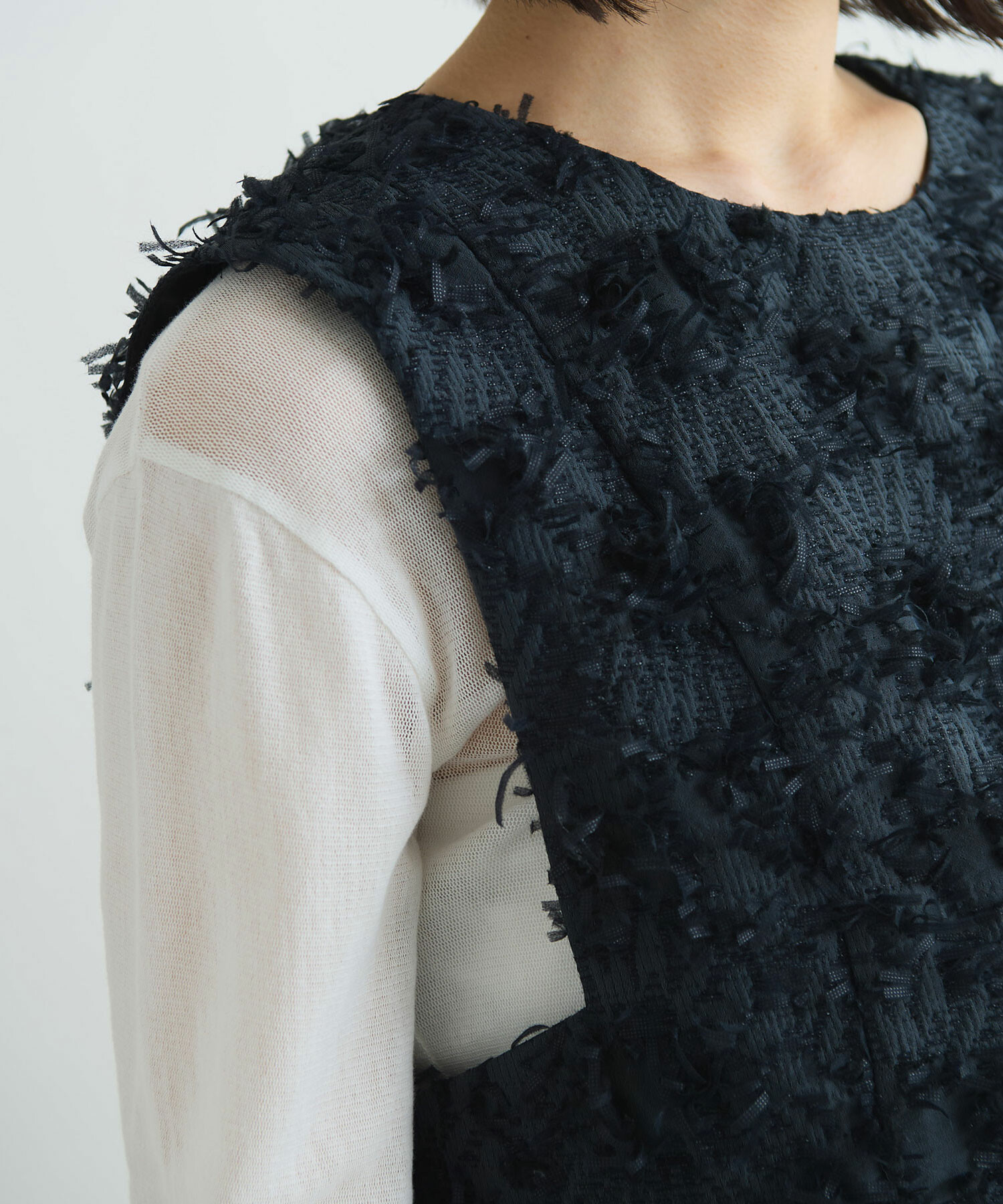 太幅のノースリ、スクエア型のアームホールが特徴的なベスト。