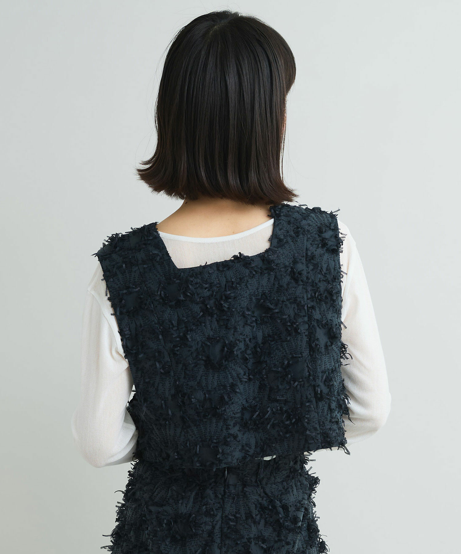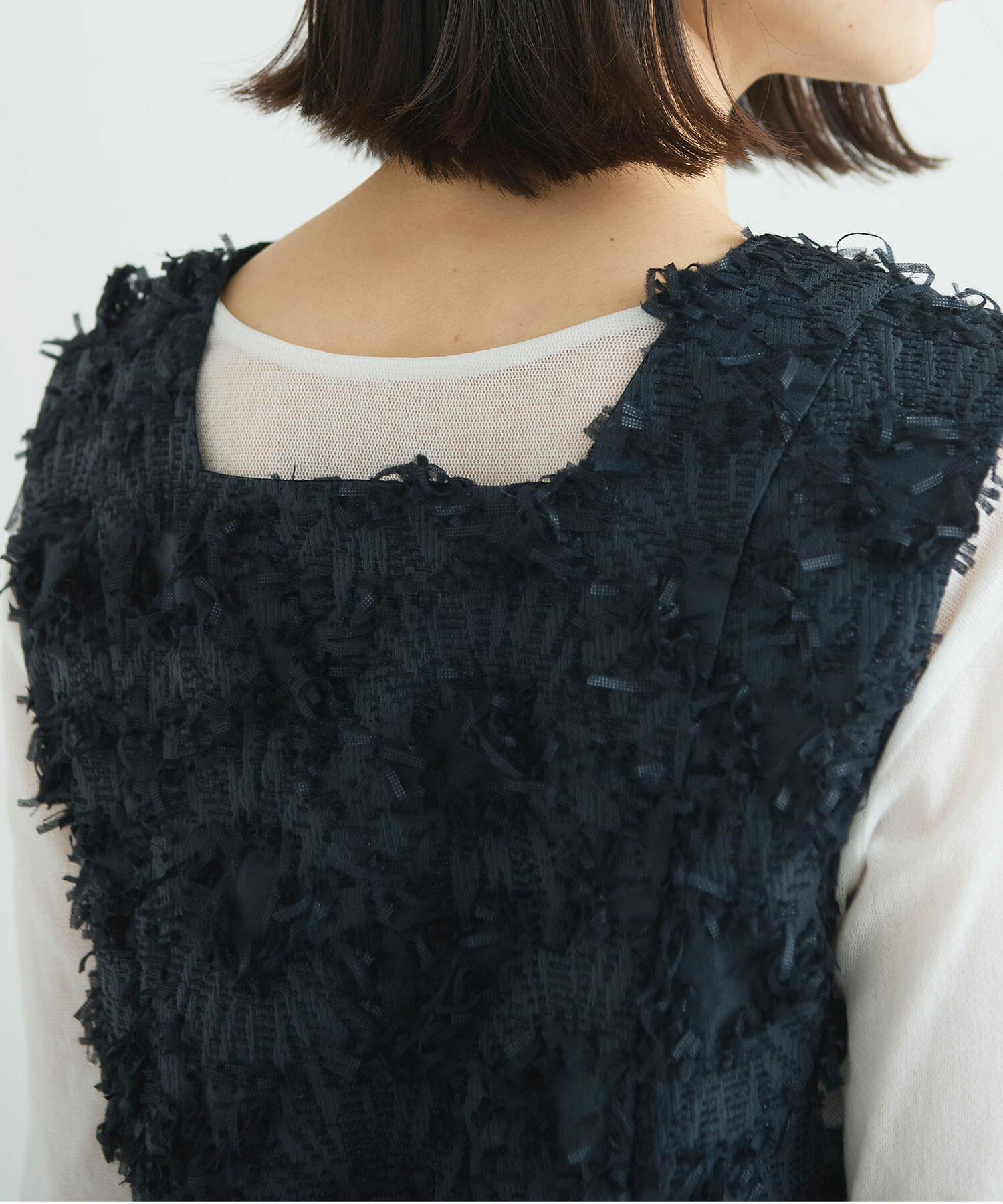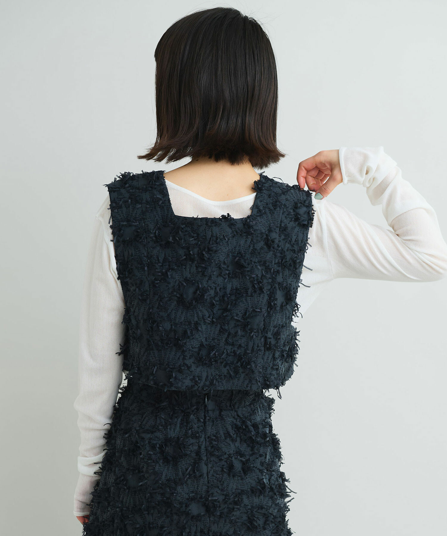 太幅のノースリ、スクエア型のアームホールが特徴的なベスト。
