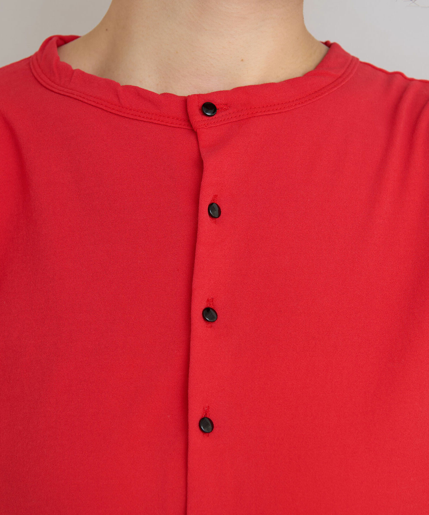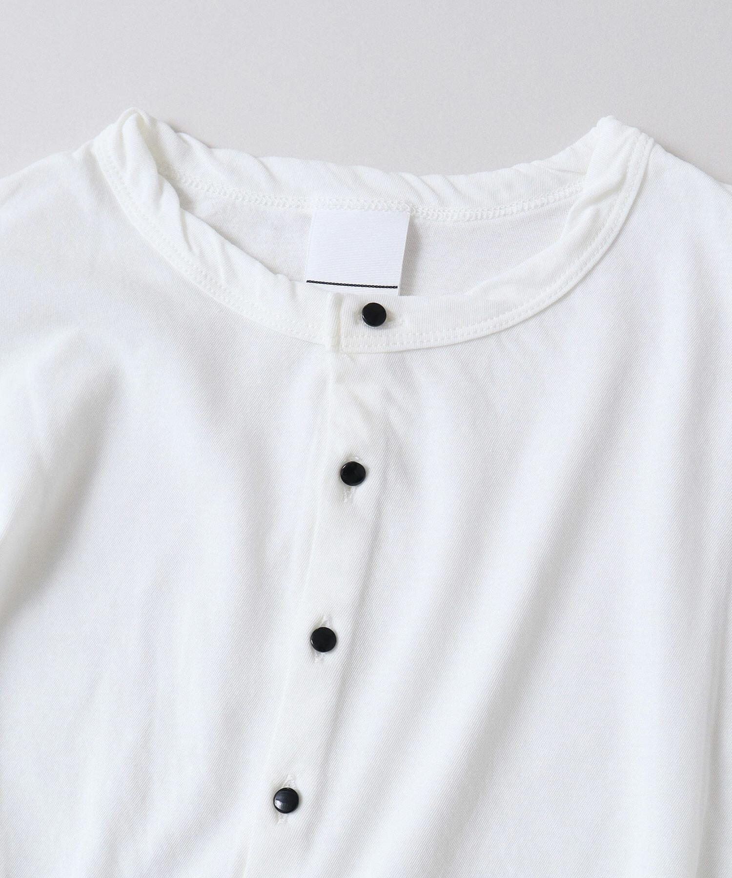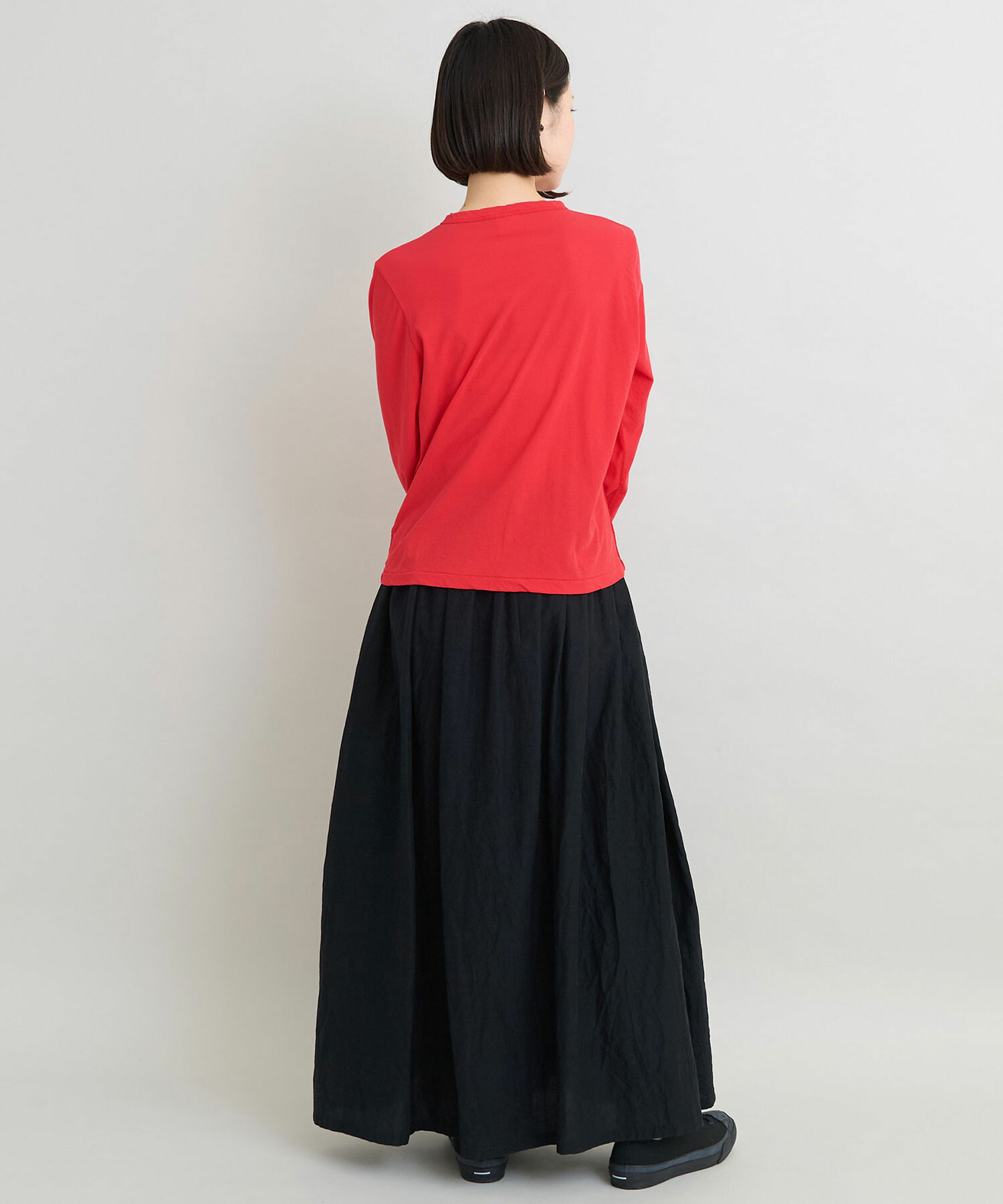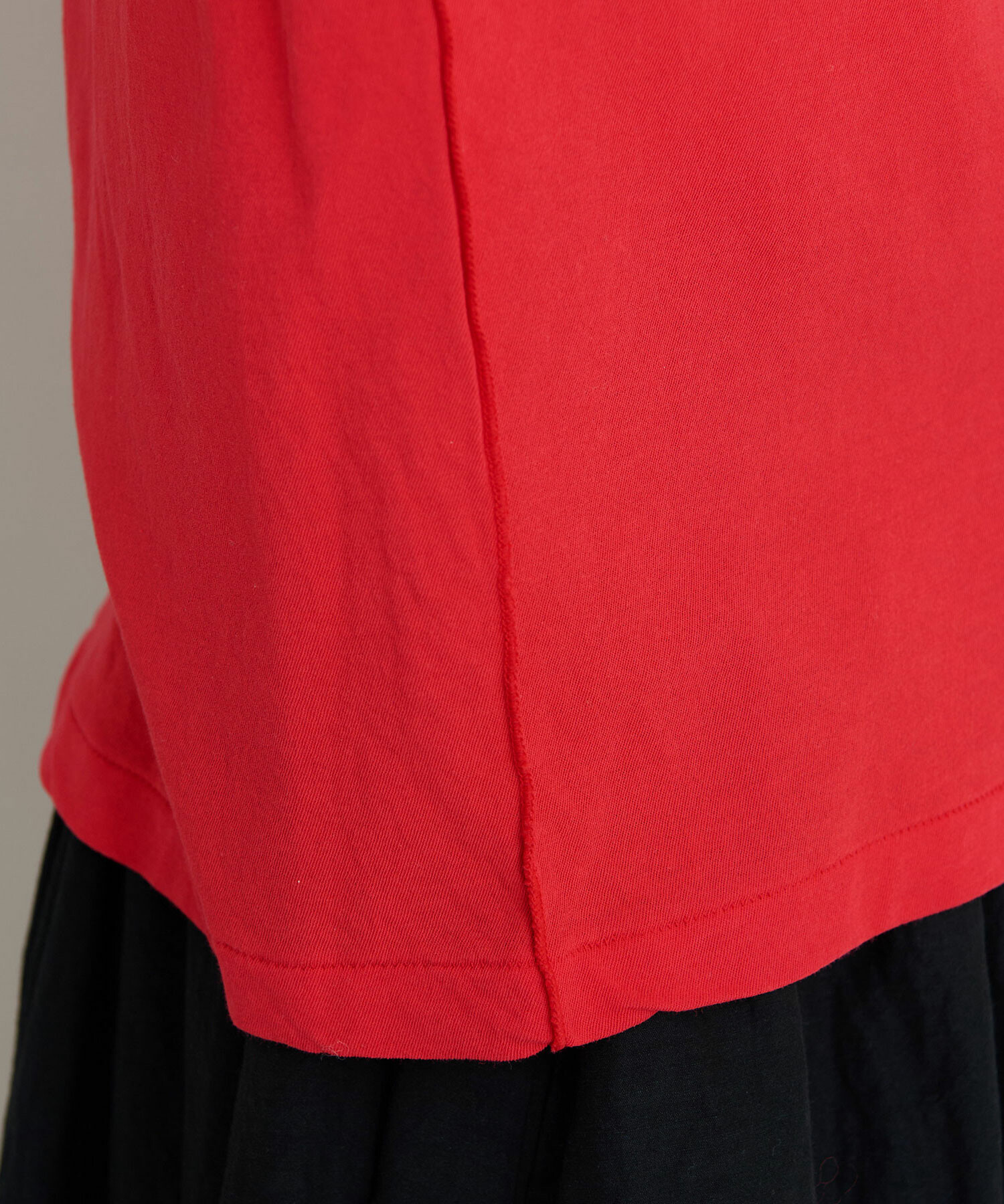 バーナーで表面を焼き、毛羽を取り除いた綿100%の糸を丁寧に編みたてたGV天竺を使用。