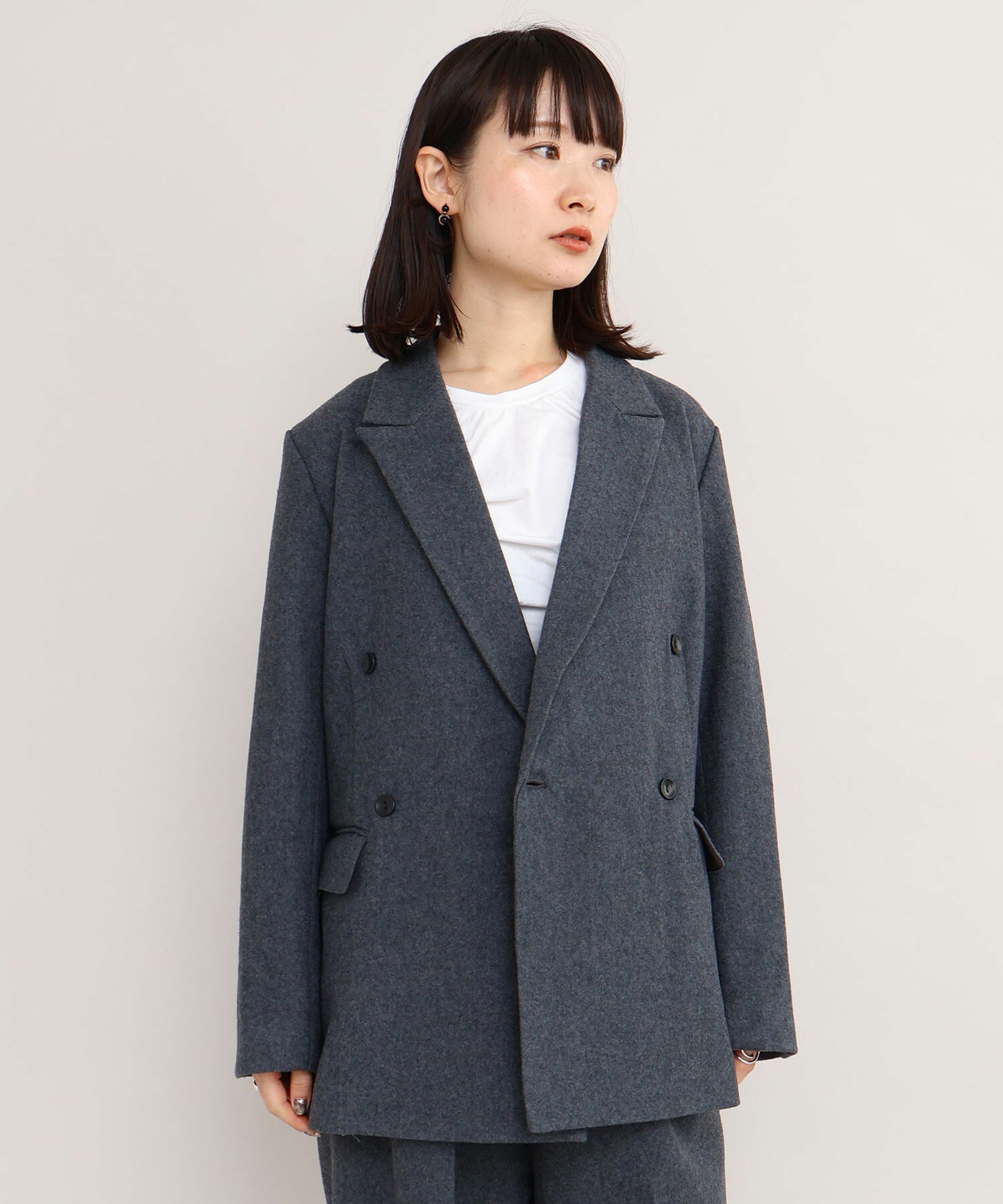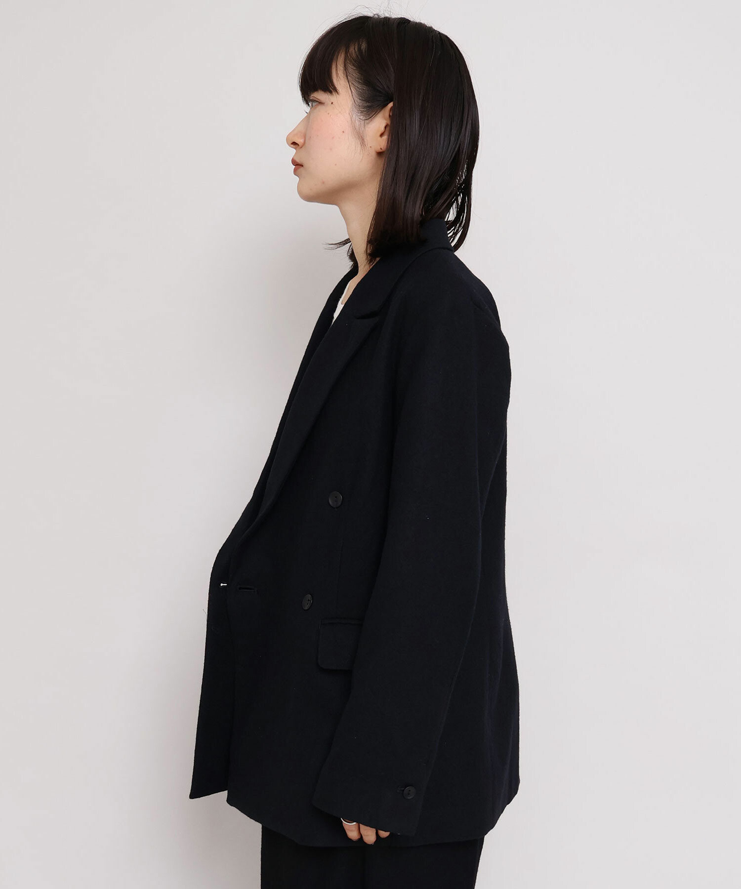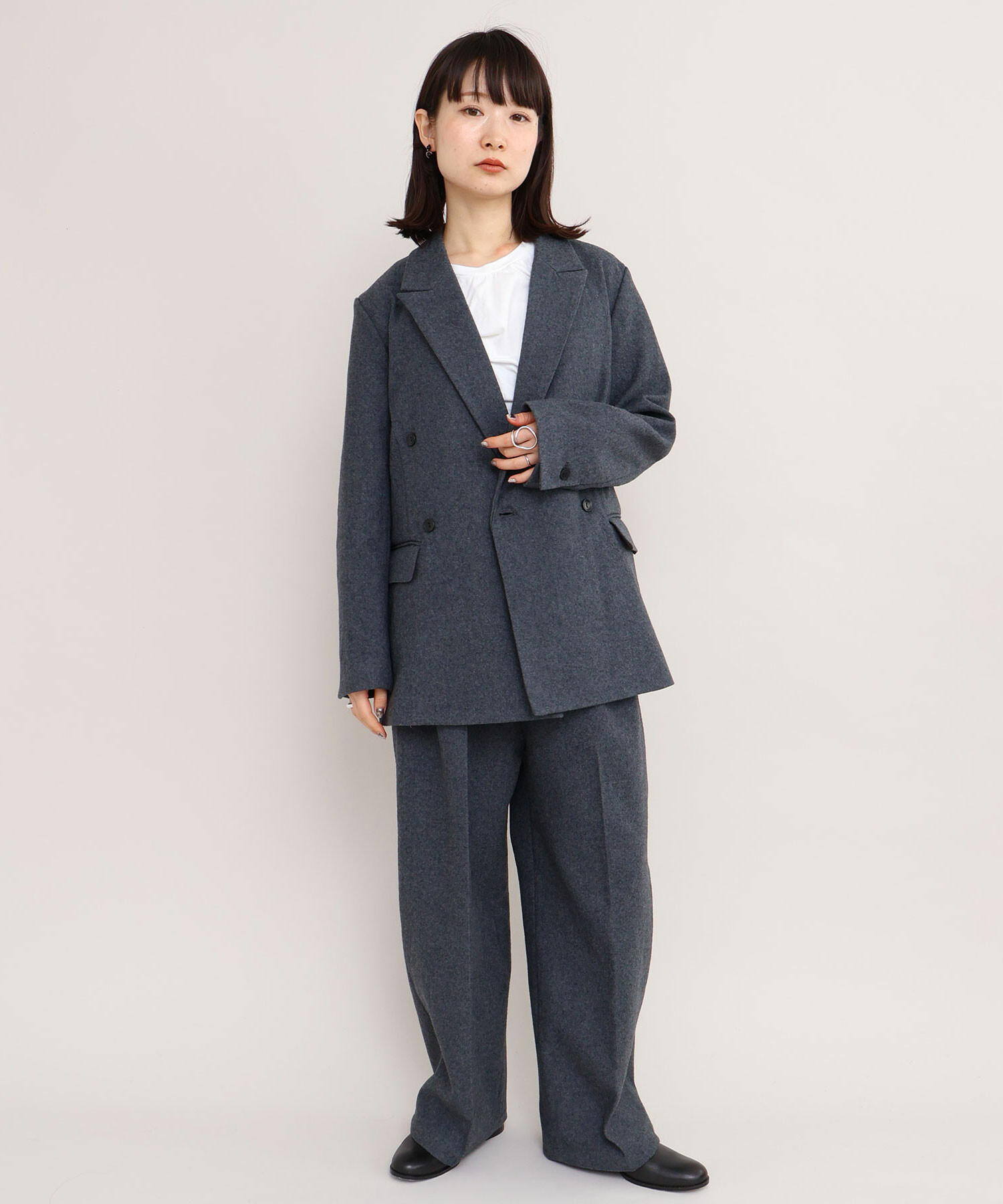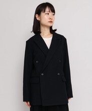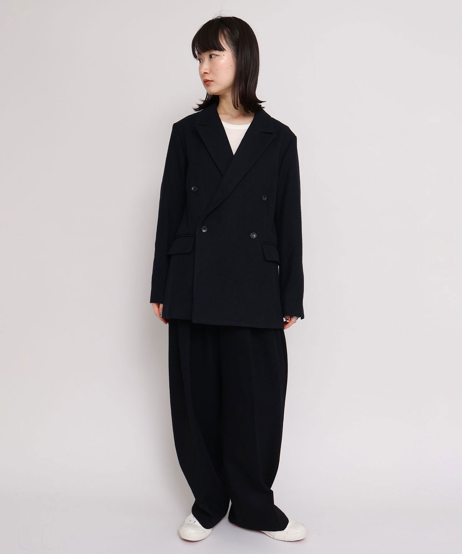 ジャケットは大き目のピークドラペルとダブルの合わせで辛めの印象に。