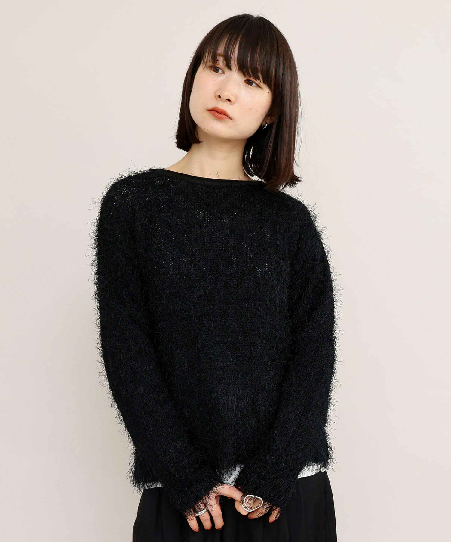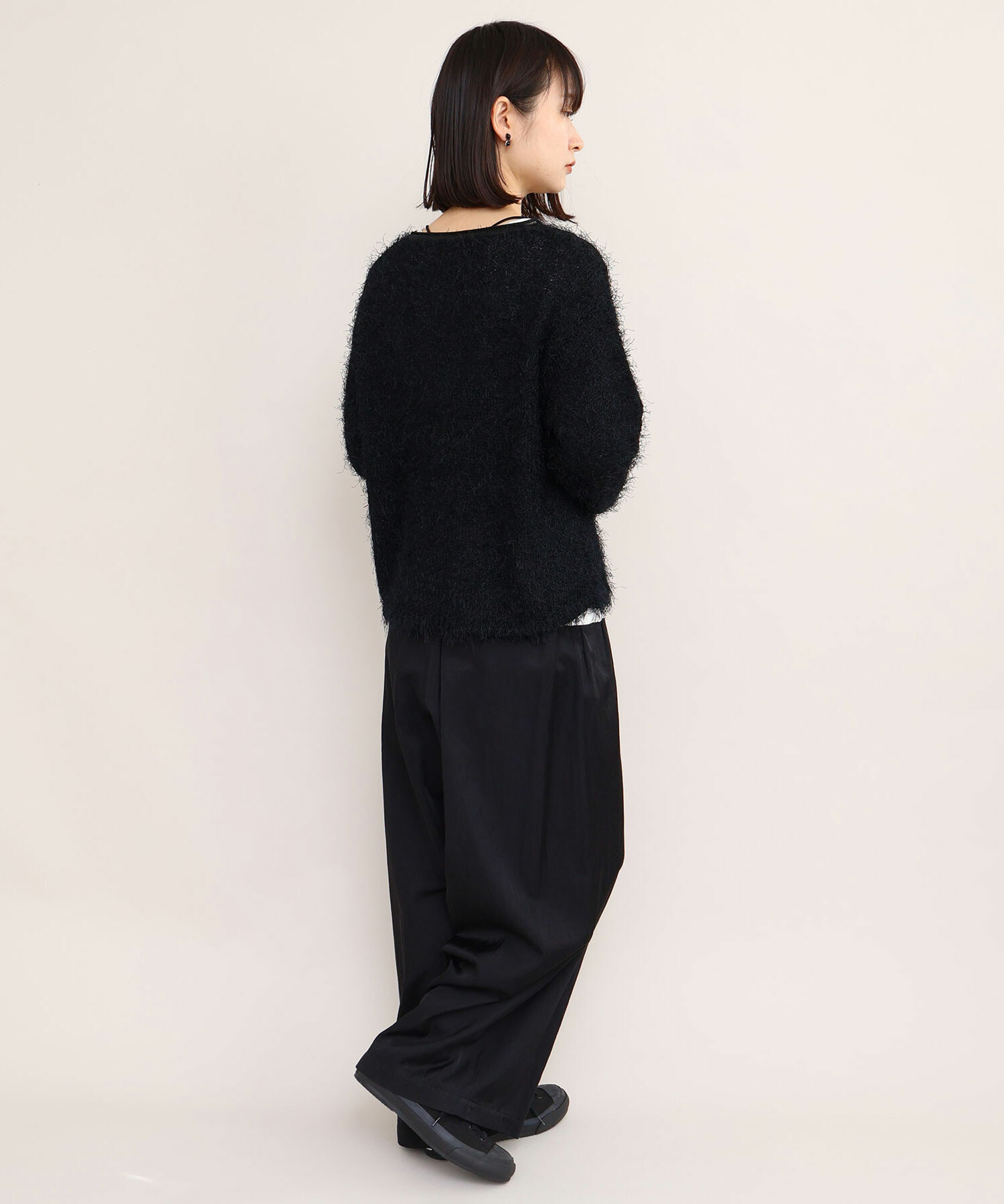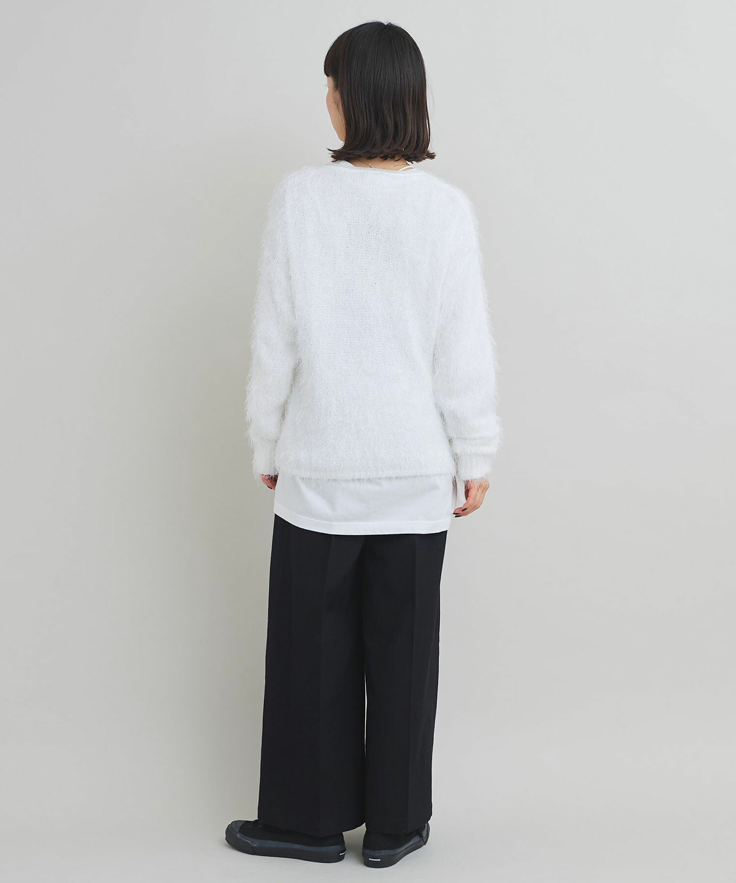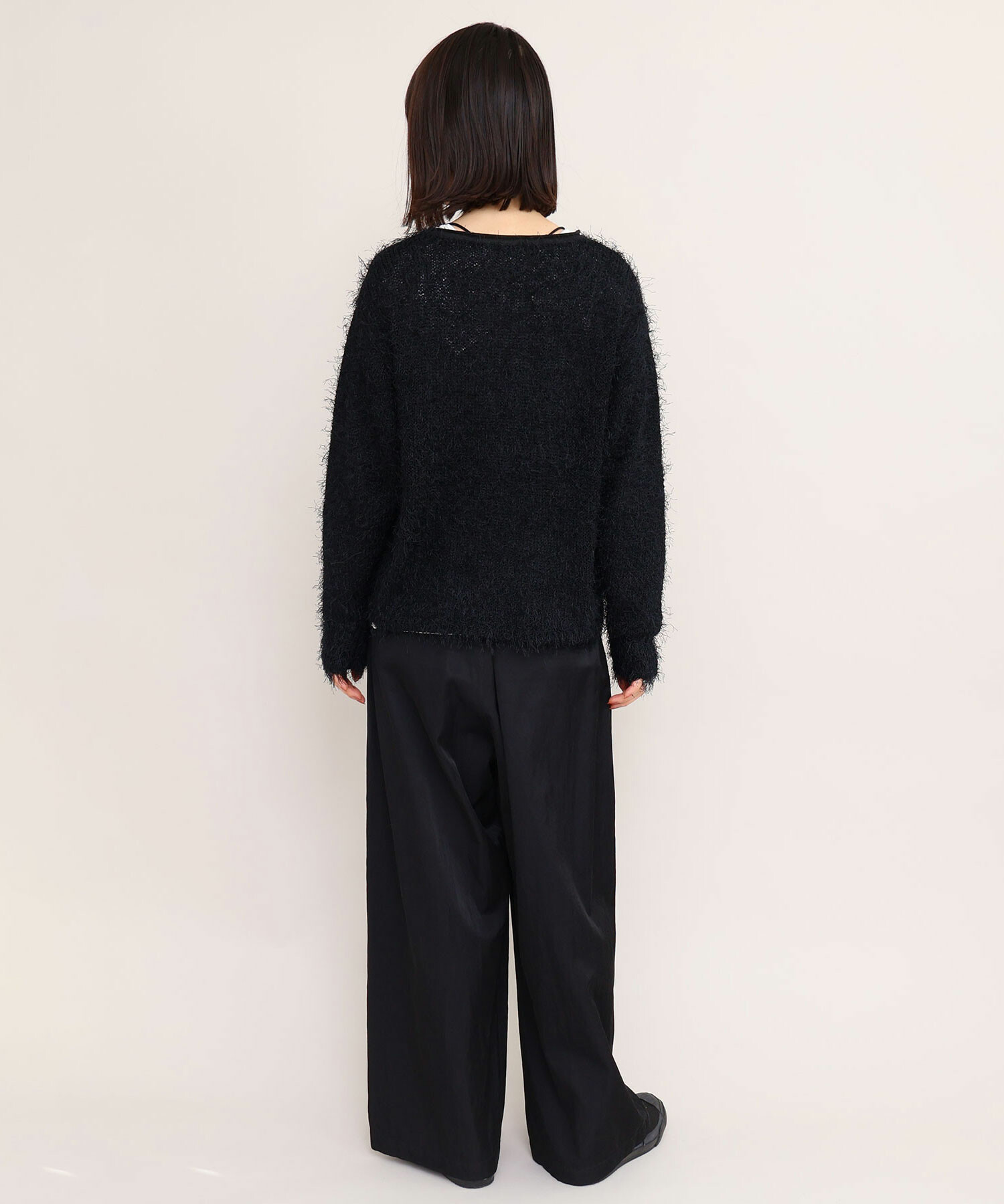 プルオーバーはローゲージニットらしく、ニット目を大きく編み上げ、ルーズな編み地で仕上げています。