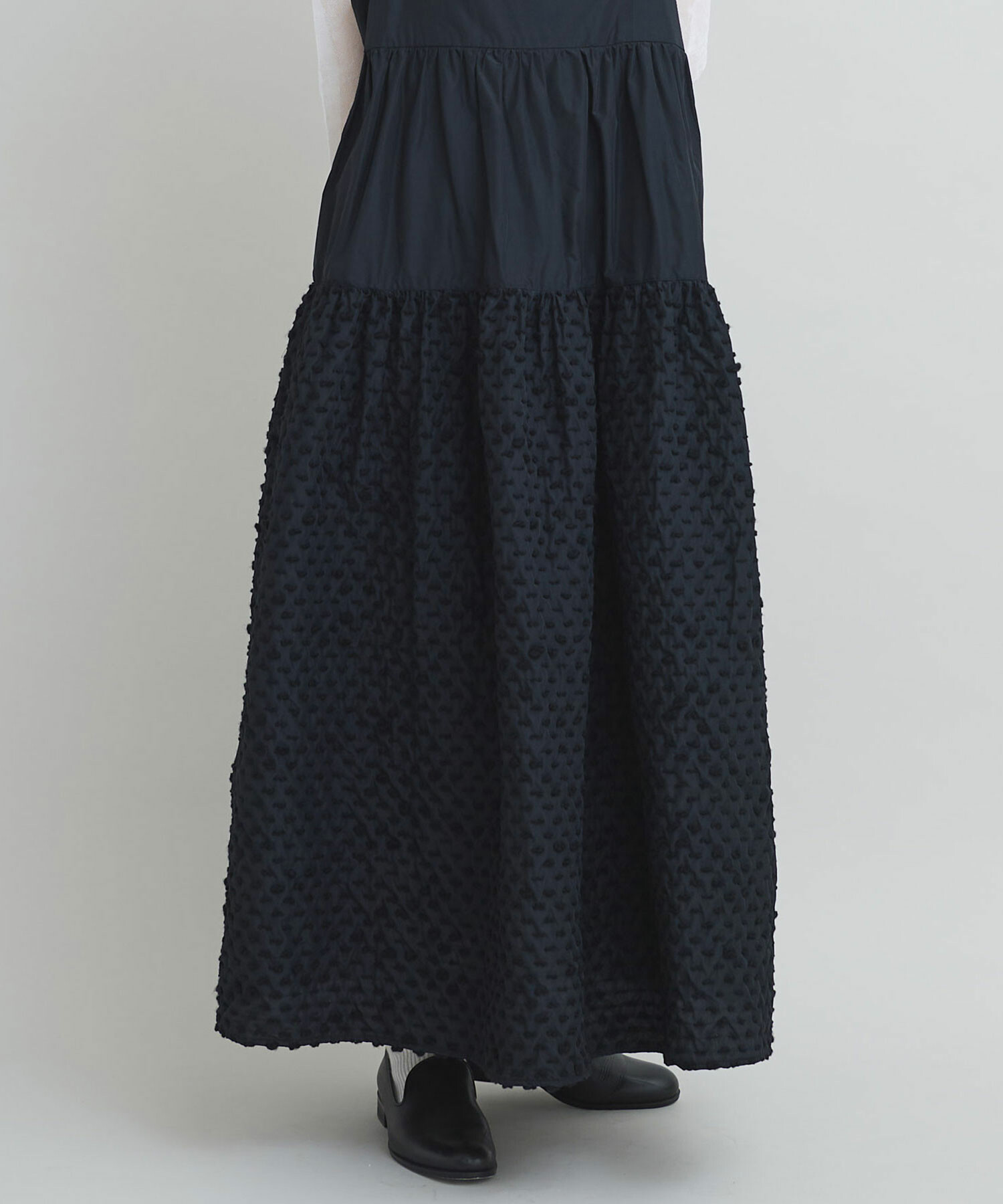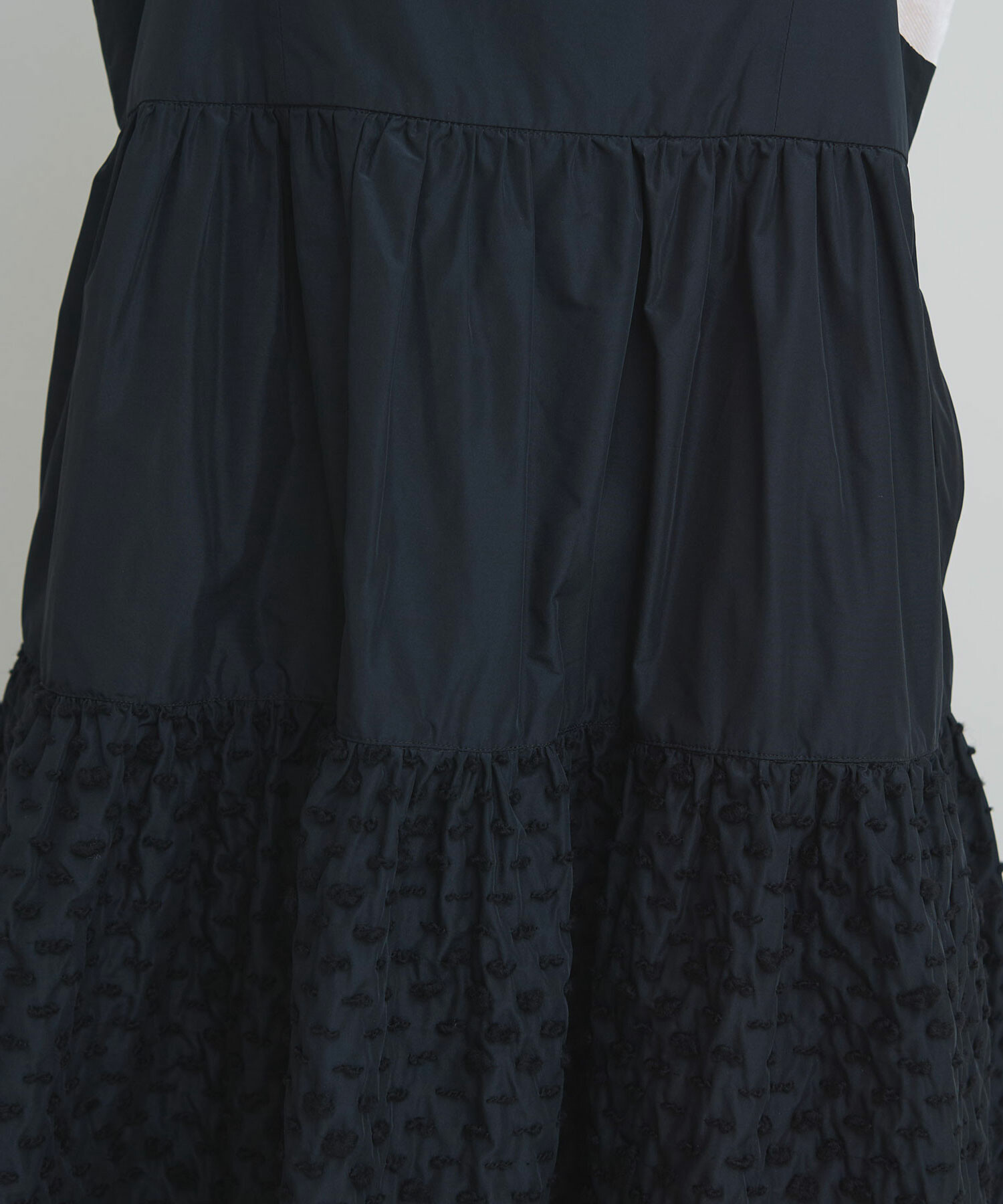 上身頃は無地のタフタ生地、スカート部分にジャカード生地を使用することですっきりとした印象に。