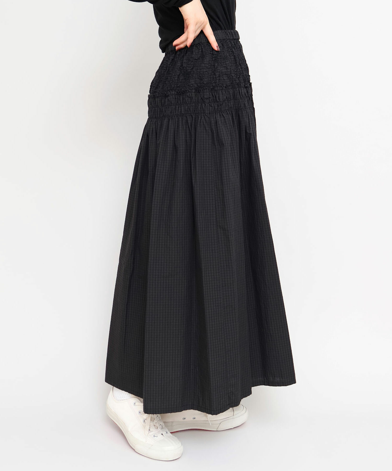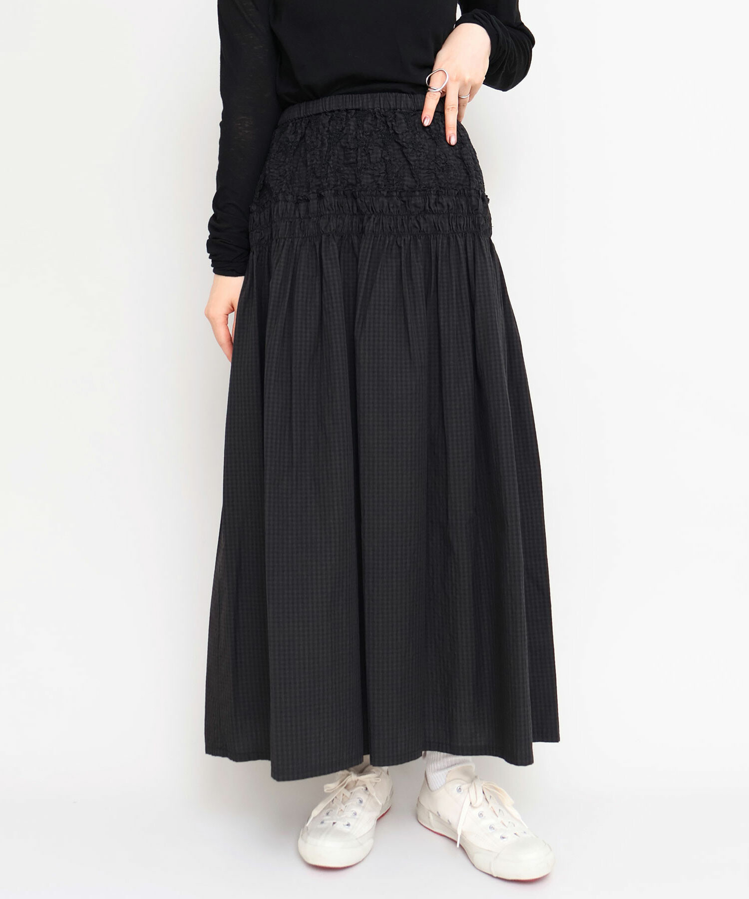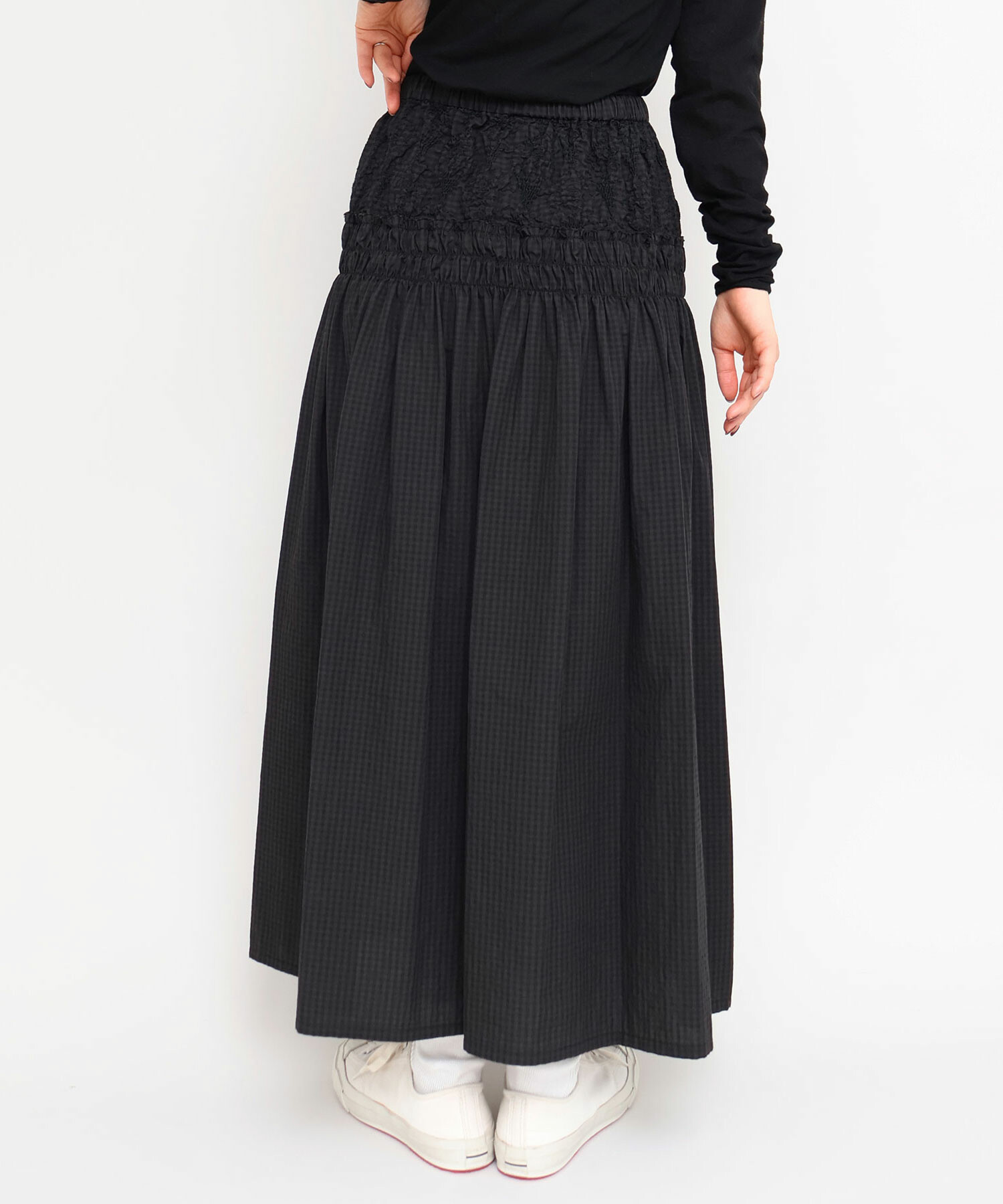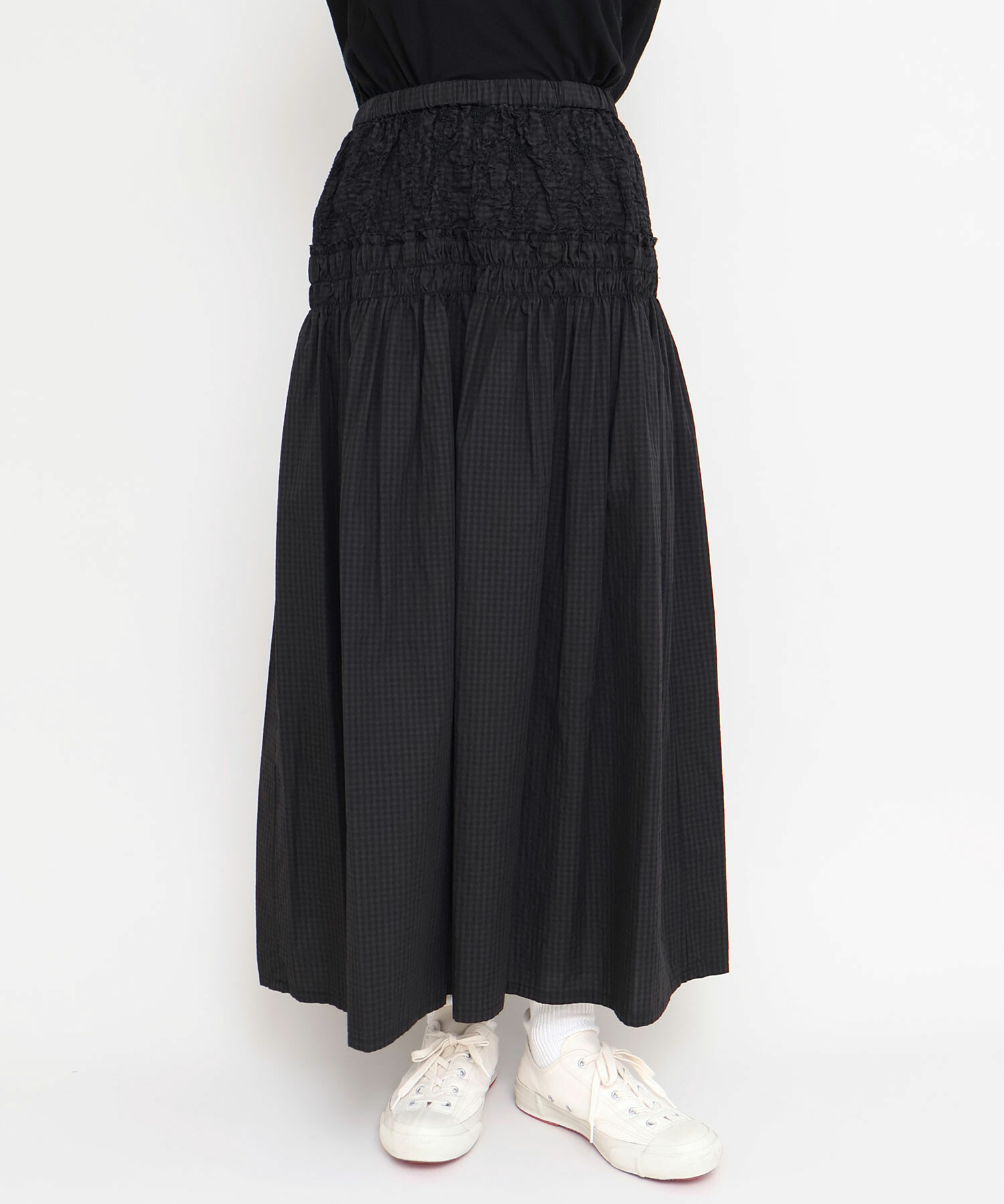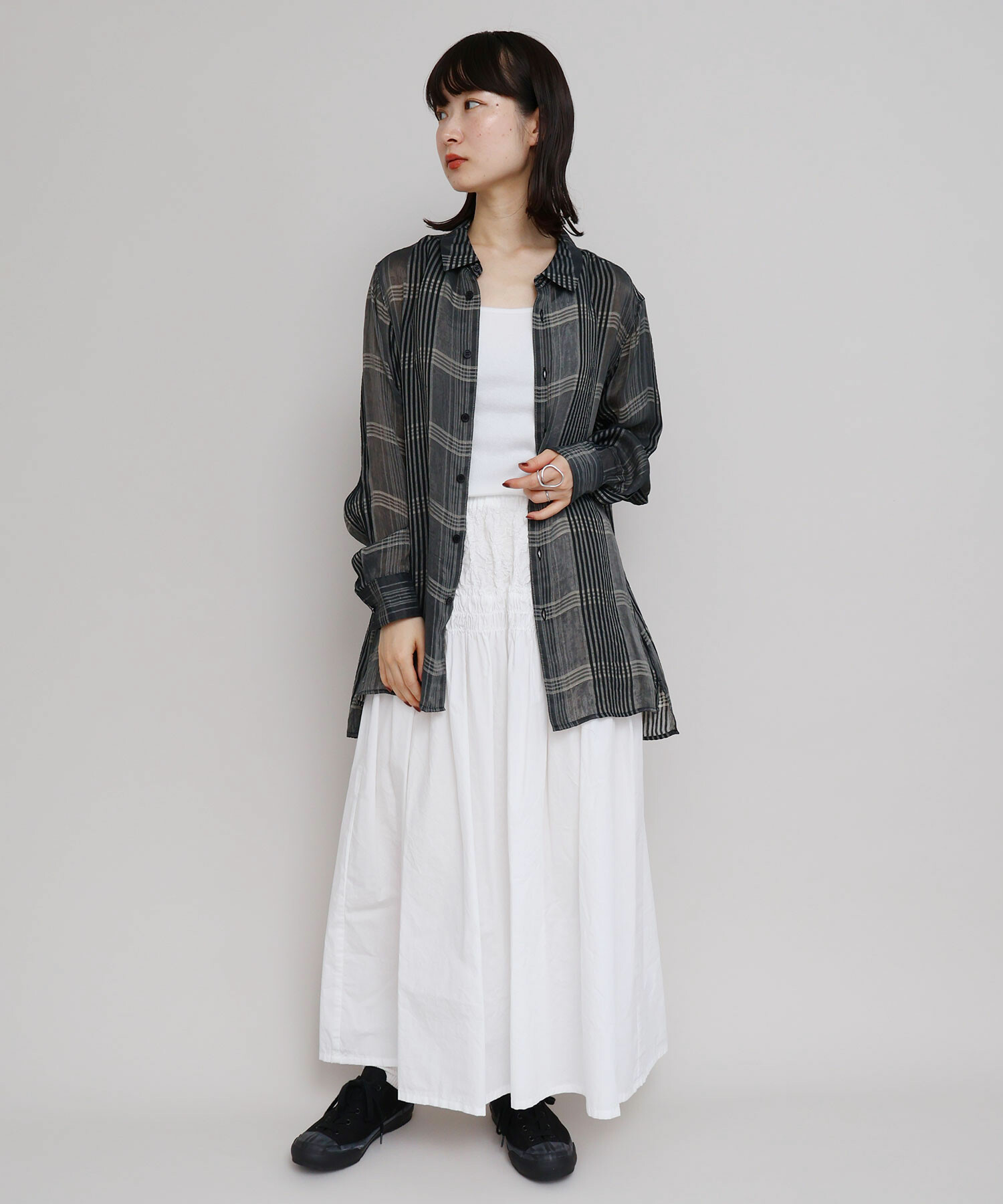 ギンガムの生地はシロ×クロの先染めギンガムをチャコールでオーバーダイしたiki別注色。