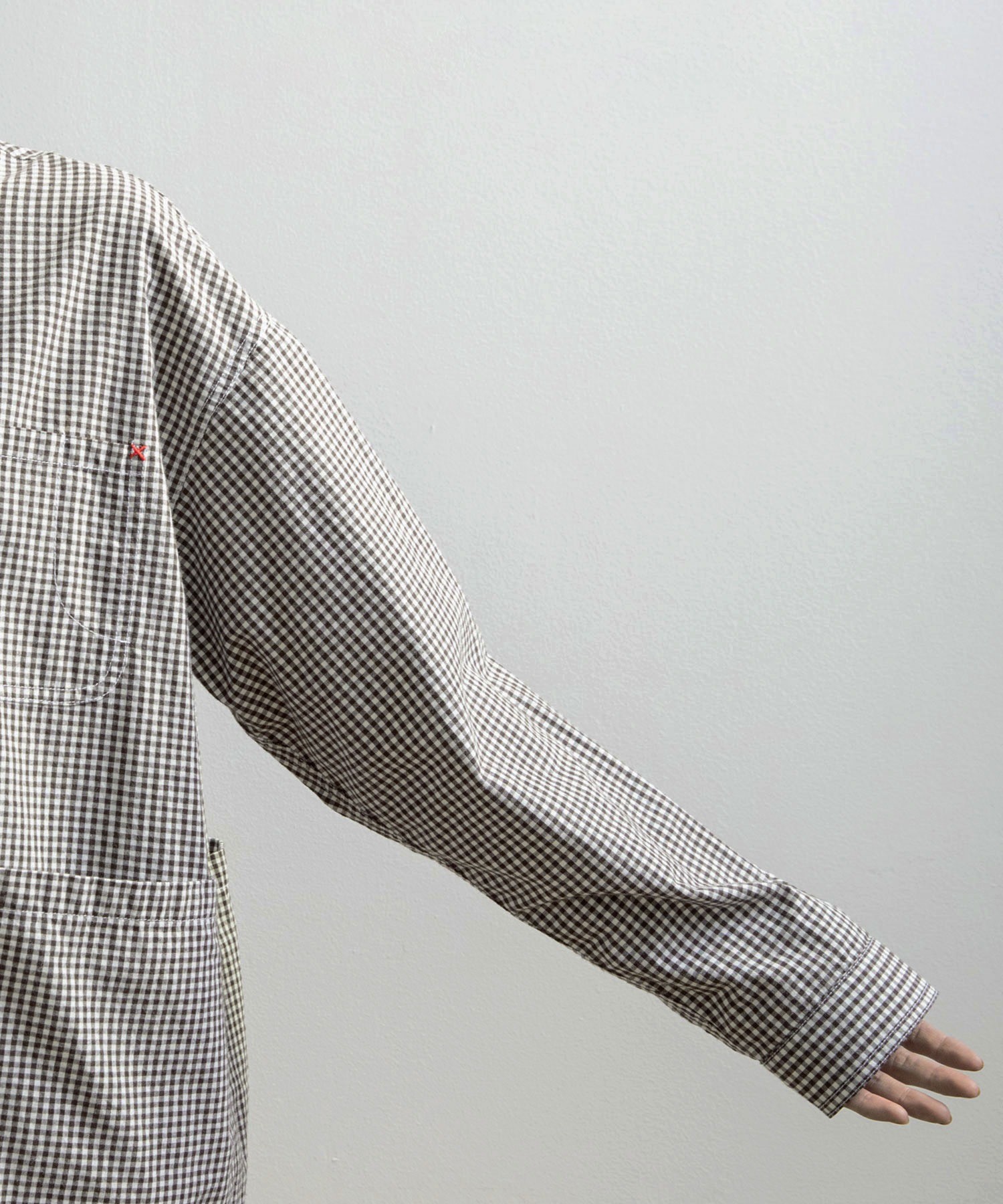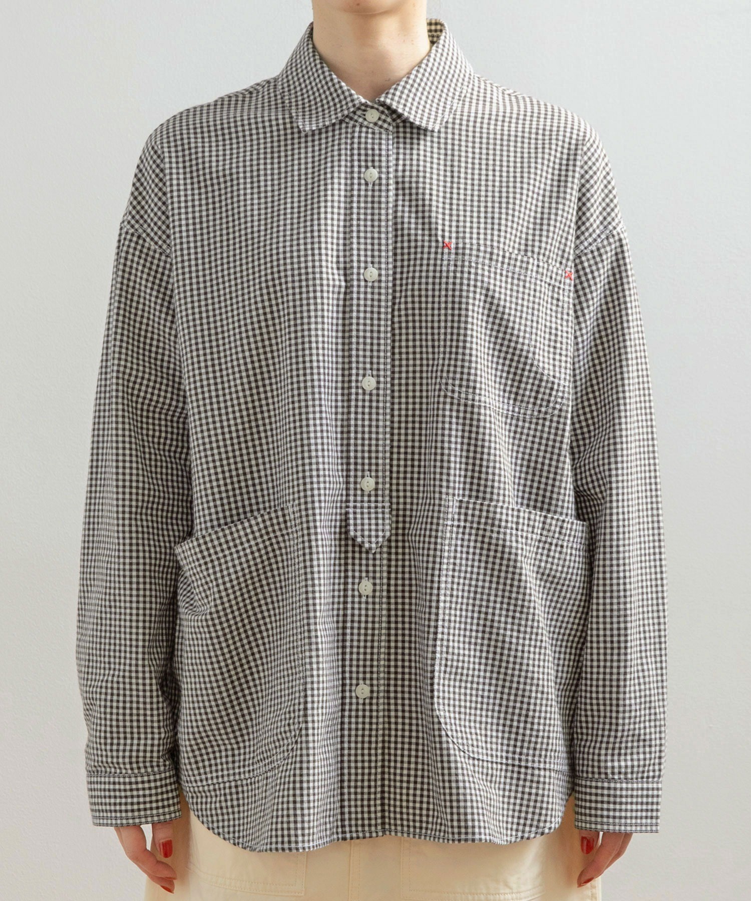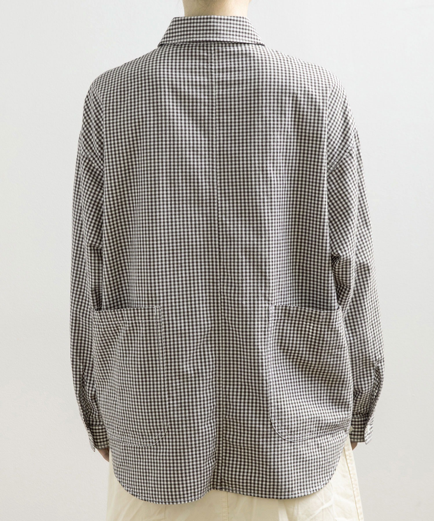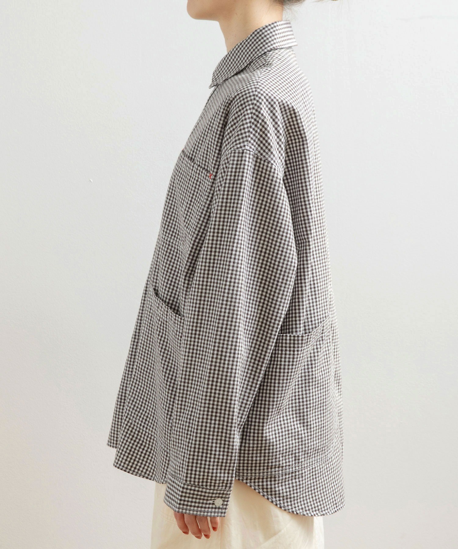軽やかなコットン100%の生地に自然なシワ感を出すワッシャー加工を施したことで、洗いざらしたようなやわらかい風合いに。着こなしに取り入れやすい絶妙な大きさのギンガムチェックをチョイスし、女性が着やすい程良くメンズライクなアイテムに仕上げました。園芸のガーデンシャツをベースに、ペン差しステッチを施した胸ポケットやコバステッチなどのブランドらしいワークディテールの効いた一着。胸ポケット部分には赤のクロスカンヌキを入れ、遊び心が感じられるポイントをプラスしました。きりりとした印象の剣ボロ仕様の前立てでクラシックな印象に。庭いじりをする時に着るガーデンシャツは、土の入った袋やシャベルなどを入れるポケットが細かく区切られて付いていますが、こちらは普段使いしやすいようサイドに広い大きめのパッチポケットを付けました。ゆったりとしたシルエットや前後差をつけた丈感で、ラフに羽織るだけでもこなれた着こなしが叶います。