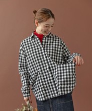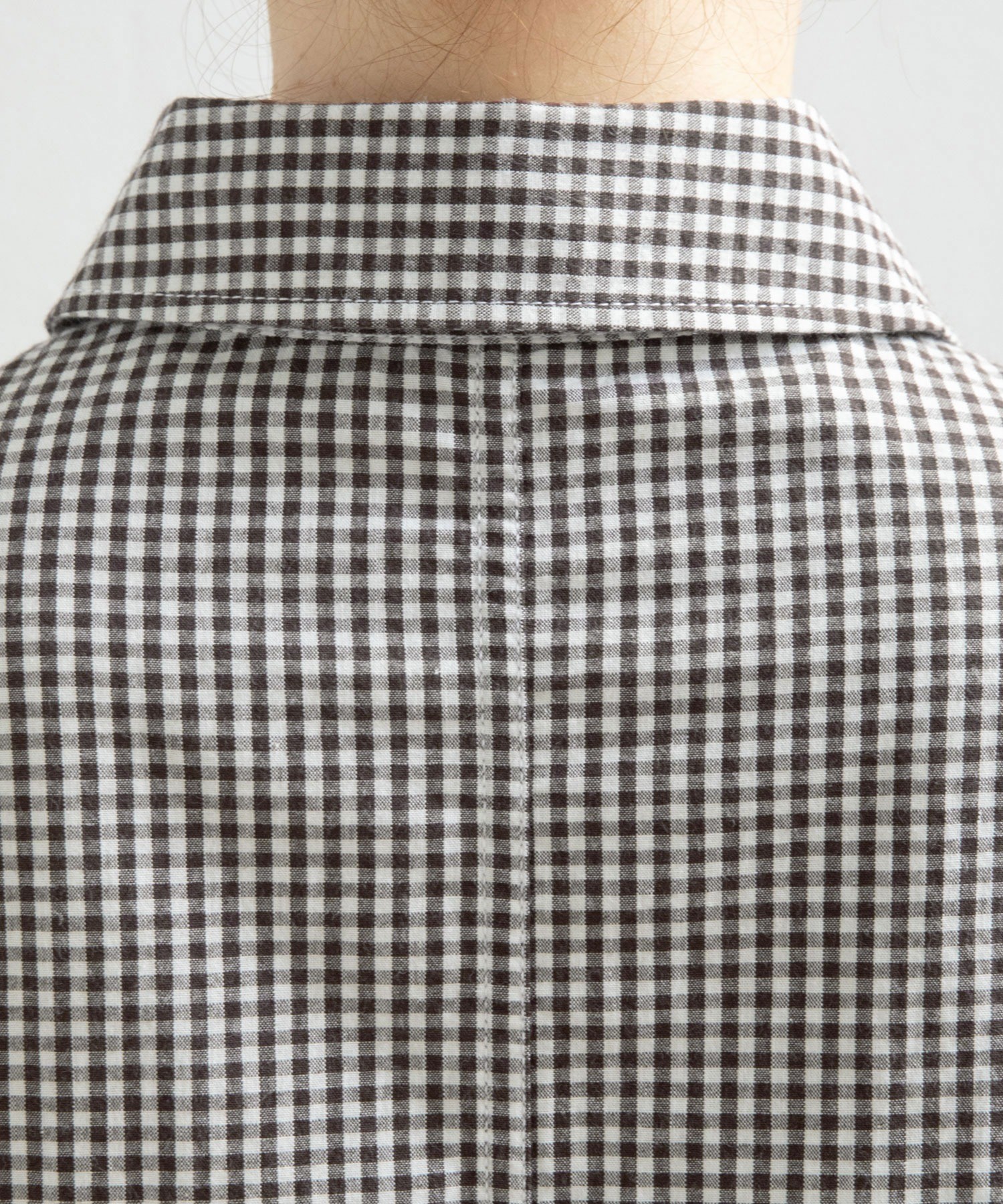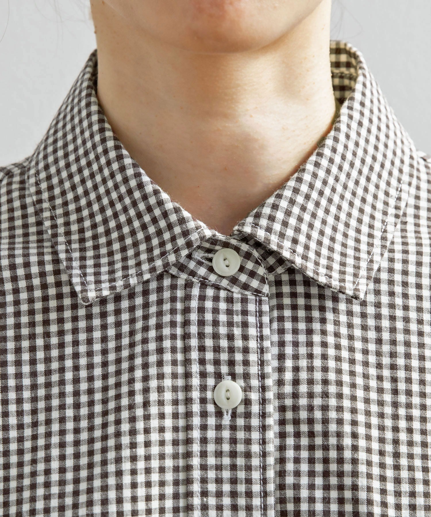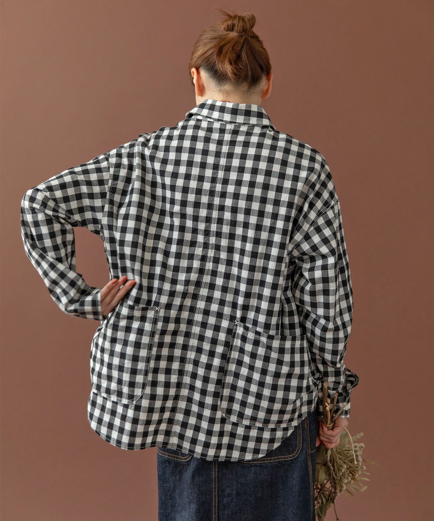 軽やかなコットン100%の生地に自然なシワ感を出すワッシャー加工を施したことで、洗いざらしたようなやわらかい風合いに。着こなしに取り入れやすい絶妙な大きさのギンガムチェックをチョイスし、女性が着やすい程良くメンズライクなアイテムに仕上げました。園芸のガーデンシャツをベースに、ペン差しステッチを施した胸ポケットやコバステッチなどのブランドらしいワークディテールの効いた一着。胸ポケット部分には赤のクロスカンヌキを入れ、遊び心が感じられるポイントをプラスしました。きりりとした印象の剣ボロ仕様の前立てでクラシックな印象に。庭いじりをする時に着るガーデンシャツは、土の入った袋やシャベルなどを入れるポケットが細かく区切られて付いていますが、こちらは普段使いしやすいようサイドに広い大きめのパッチポケットを付けました。ゆったりとしたシルエットや前後差をつけた丈感で、ラフに羽織るだけでもこなれた着こなしが叶います。
