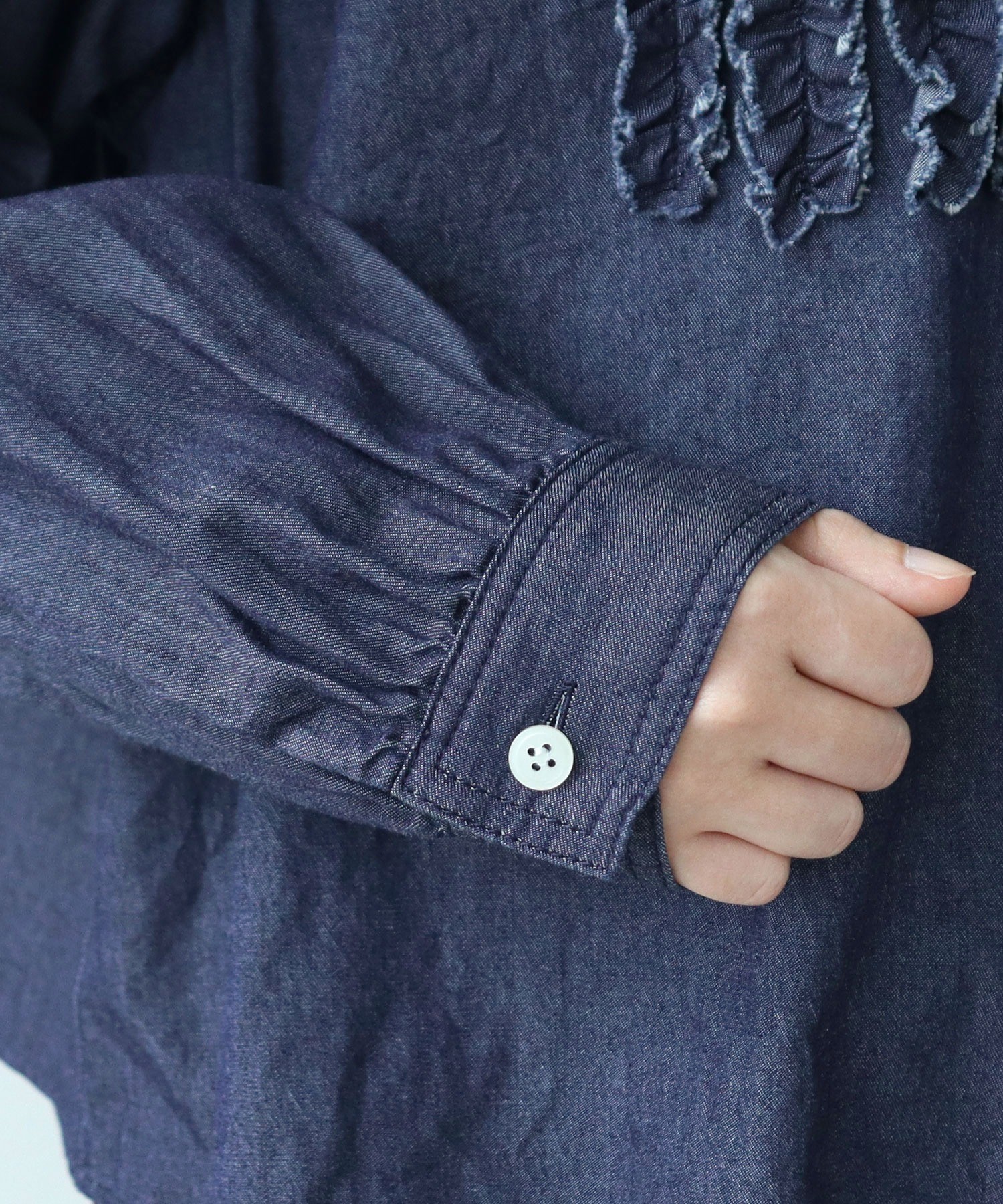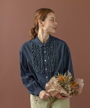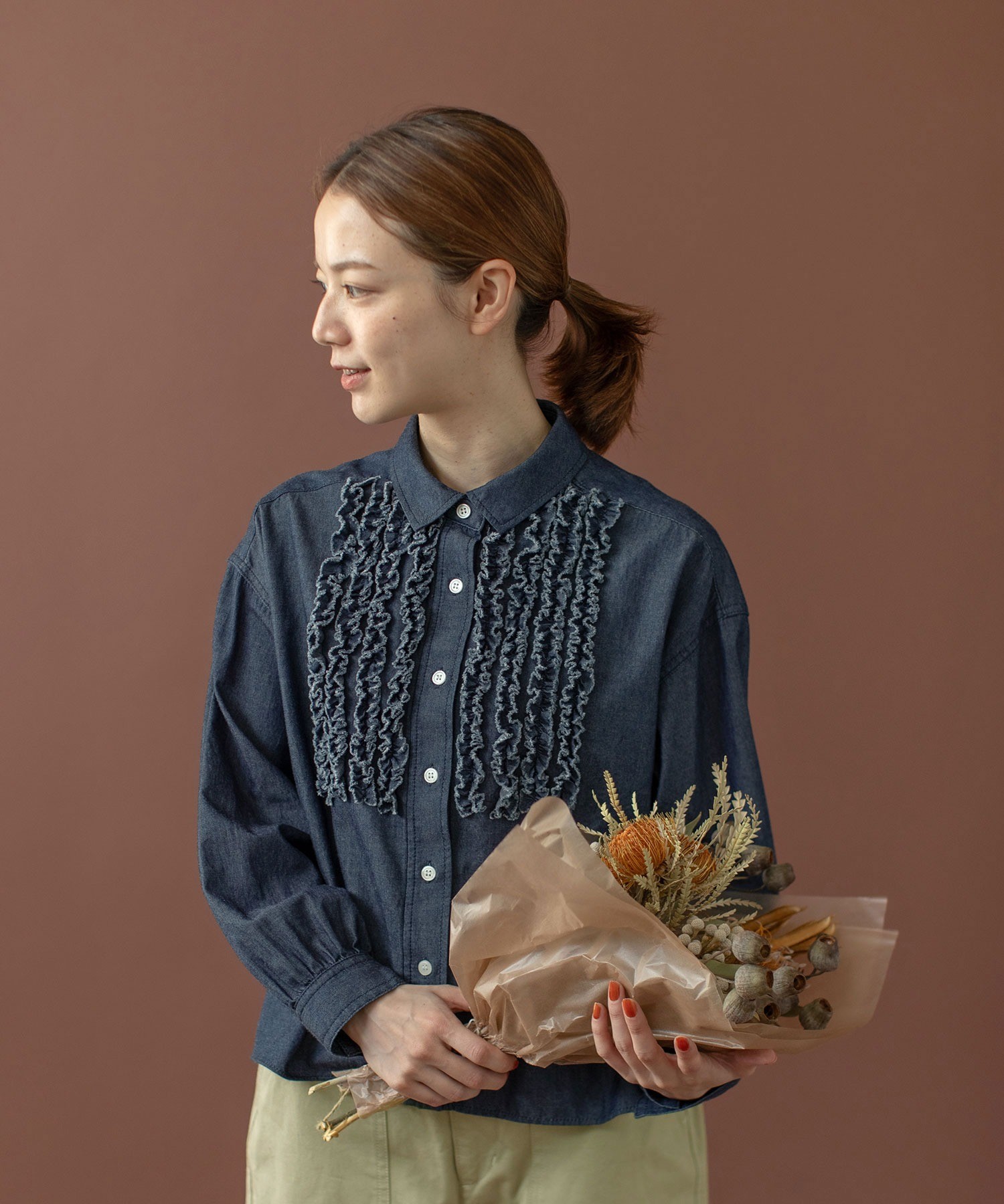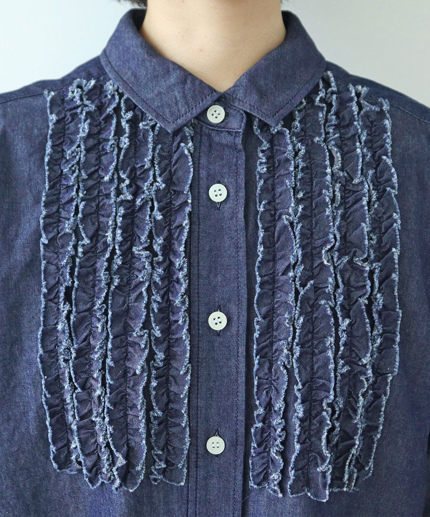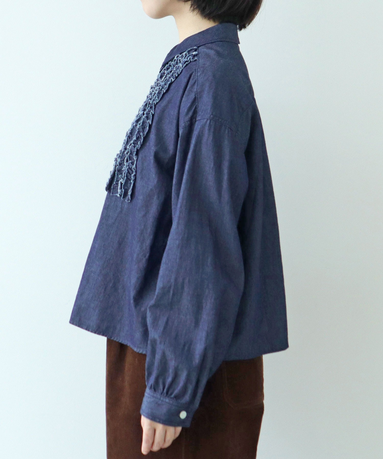 通常のデニムよりも糸を甘く撚った、軽くて柔らかいライトオンスデニムを使用しました。細番手の糸で織った生地はさらっとした肌触りでソフトな着心地です。縫い上がった製品を一度洗いにかける製品水洗い加工を施しているので、味のある風合いに。身頃にフリルをたっぷりとあしらいつつも、甘くなりすぎないようにフリル端を断ち切り仕様にする事でラフに仕上げました。ちょっぴりかわいらしいデザインも、スパイスの効いたデニム素材でスタイリングに取り入れやすい、程良い甘さのシャツです。コンパクトな丈感で羽織った時にバランス良く見えるところも嬉しいポイント。
