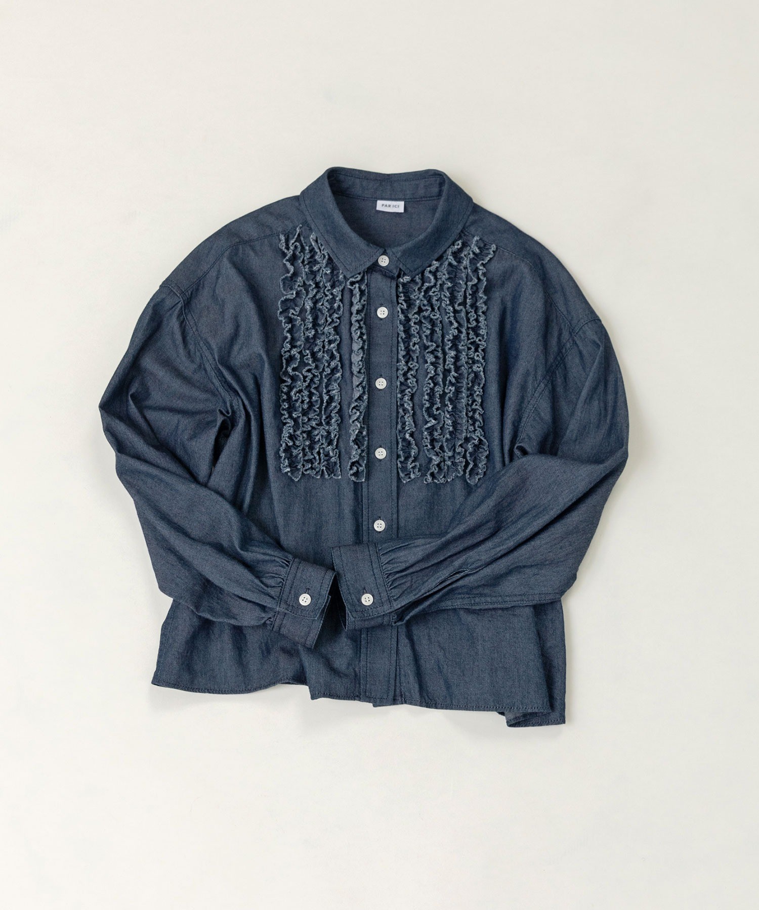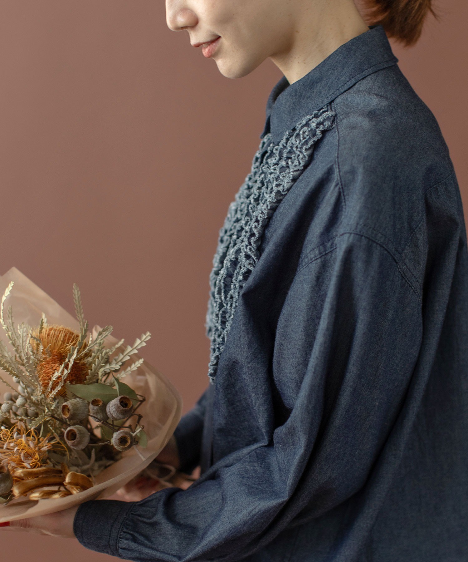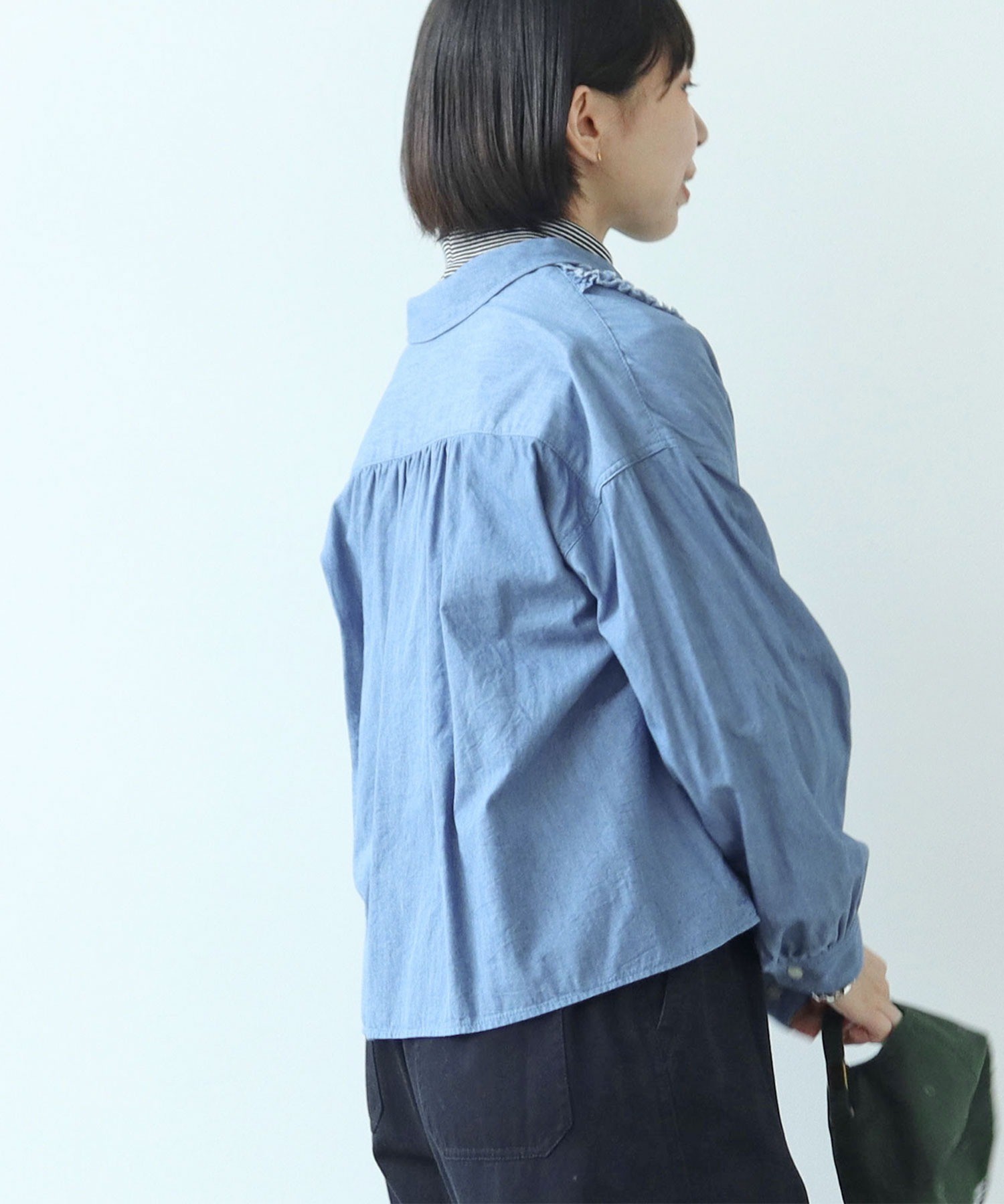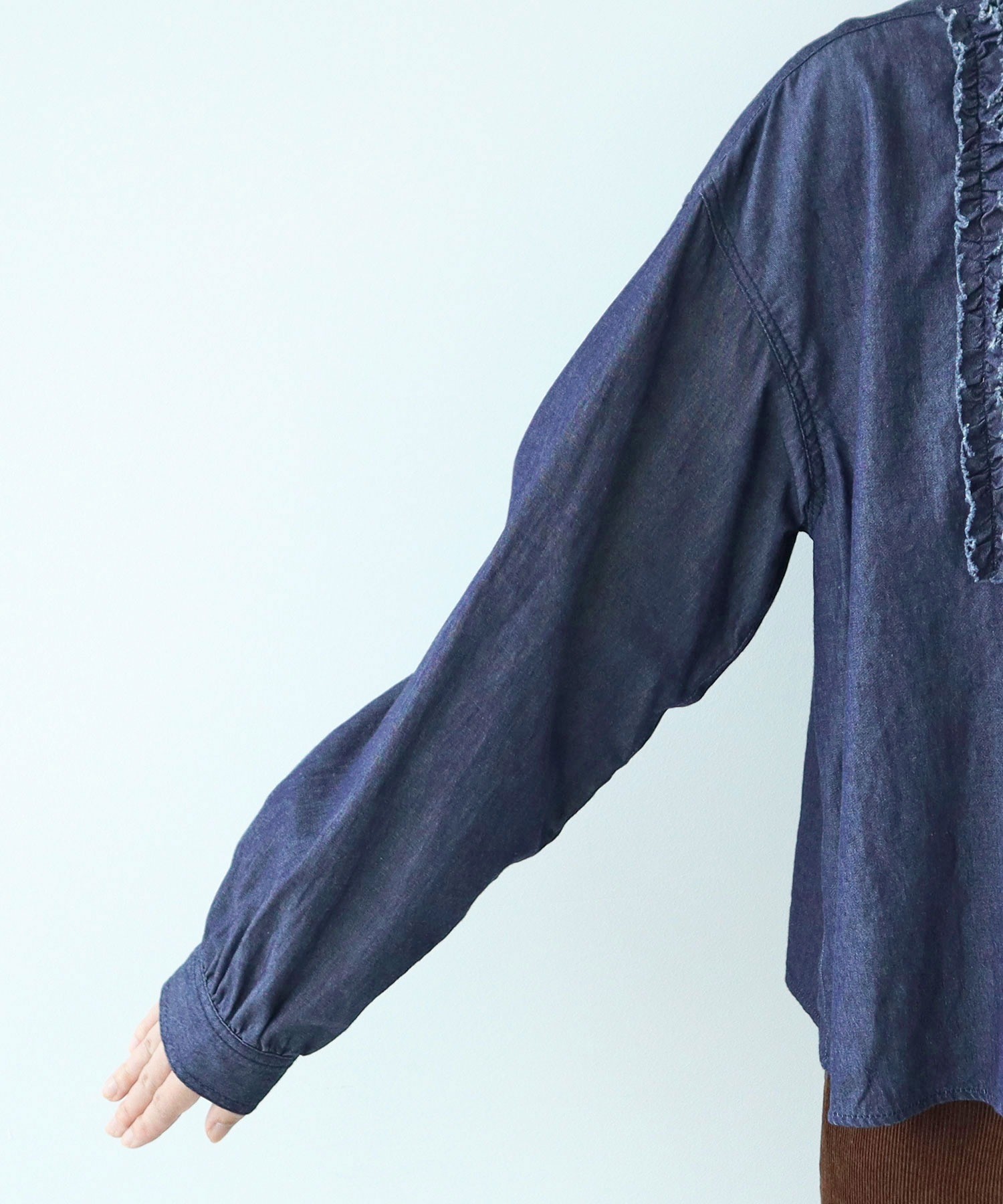 通常のデニムよりも糸を甘く撚った、軽くて柔らかいライトオンスデニムを使用しました。細番手の糸で織った生地はさらっとした肌触りでソフトな着心地です。縫い上がった製品を一度洗いにかける製品水洗い加工を施しているので、味のある風合いに。身頃にフリルをたっぷりとあしらいつつも、甘くなりすぎないようにフリル端を断ち切り仕様にする事でラフに仕上げました。ちょっぴりかわいらしいデザインも、スパイスの効いたデニム素材でスタイリングに取り入れやすい、程良い甘さのシャツです。コンパクトな丈感で羽織った時にバランス良く見えるところも嬉しいポイント。