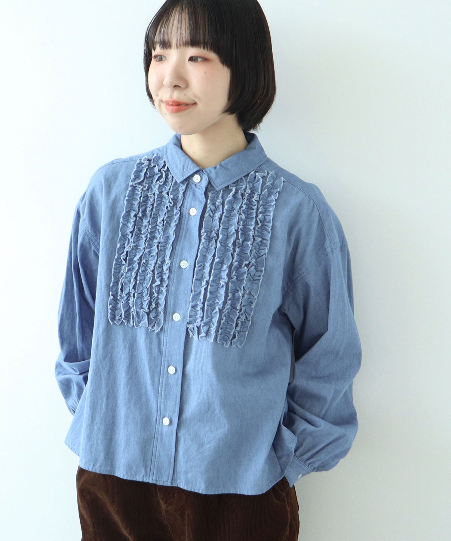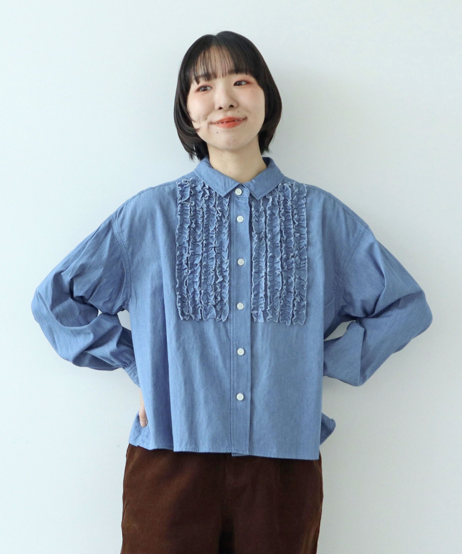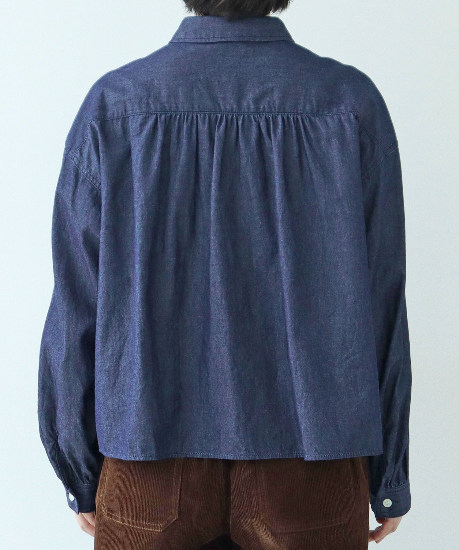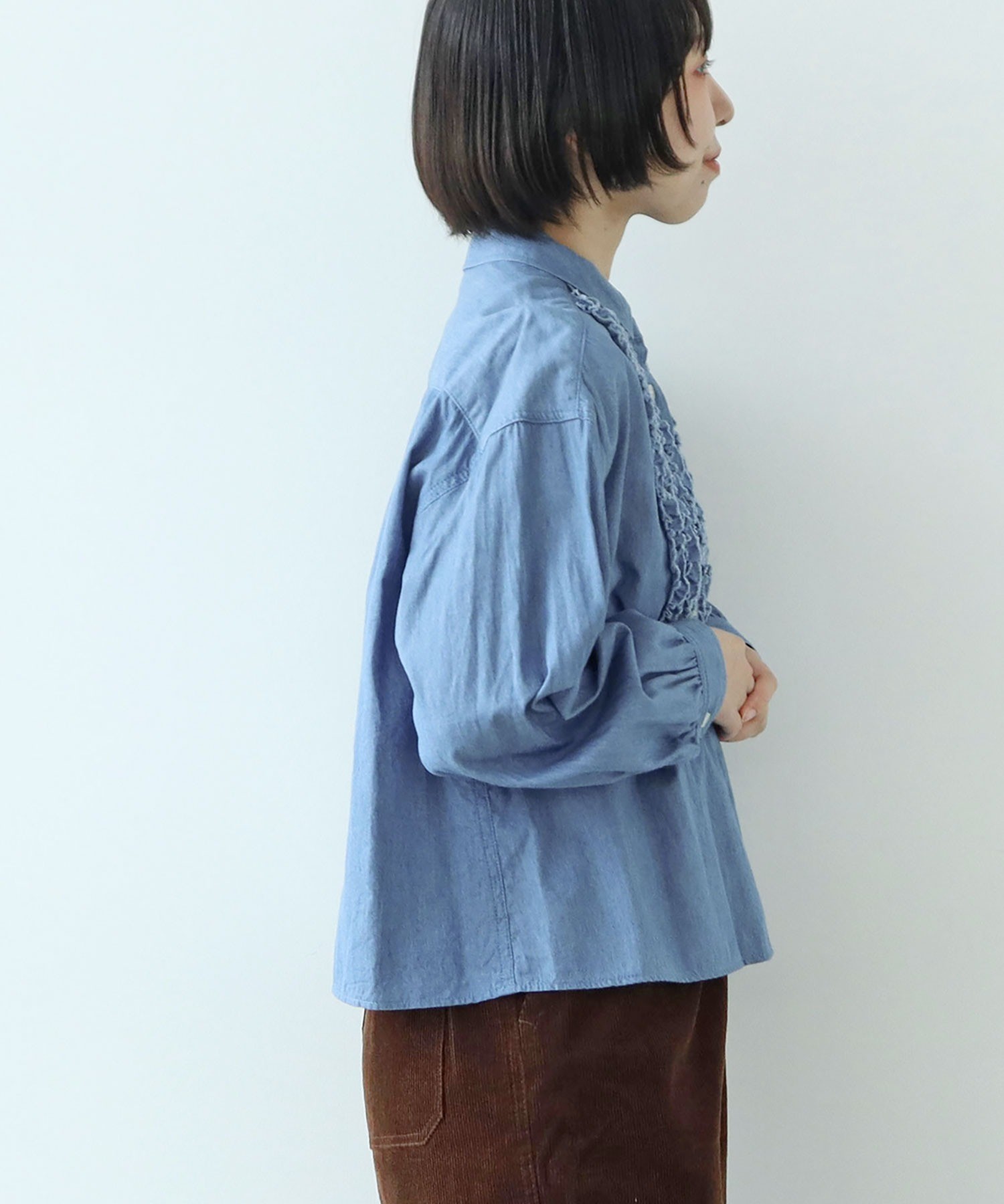 通常のデニムよりも糸を甘く撚った、軽くて柔らかいライトオンスデニムを使用しました。細番手の糸で織った生地はさらっとした肌触りでソフトな着心地です。縫い上がった製品を一度洗いにかける製品水洗い加工を施しているので、味のある風合いに。身頃にフリルをたっぷりとあしらいつつも、甘くなりすぎないようにフリル端を断ち切り仕様にする事でラフに仕上げました。ちょっぴりかわいらしいデザインも、スパイスの効いたデニム素材でスタイリングに取り入れやすい、程良い甘さのシャツです。コンパクトな丈感で羽織った時にバランス良く見えるところも嬉しいポイント。