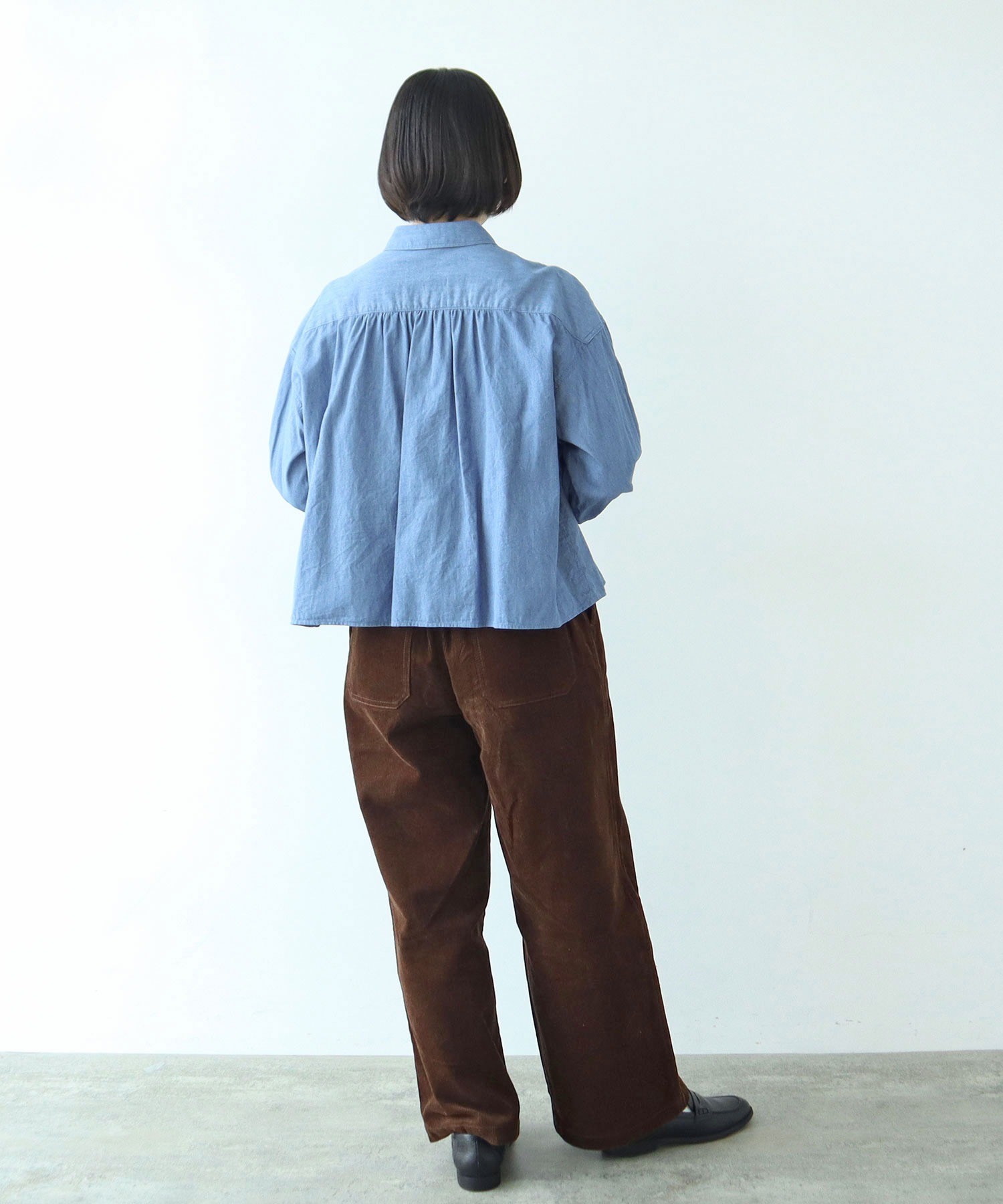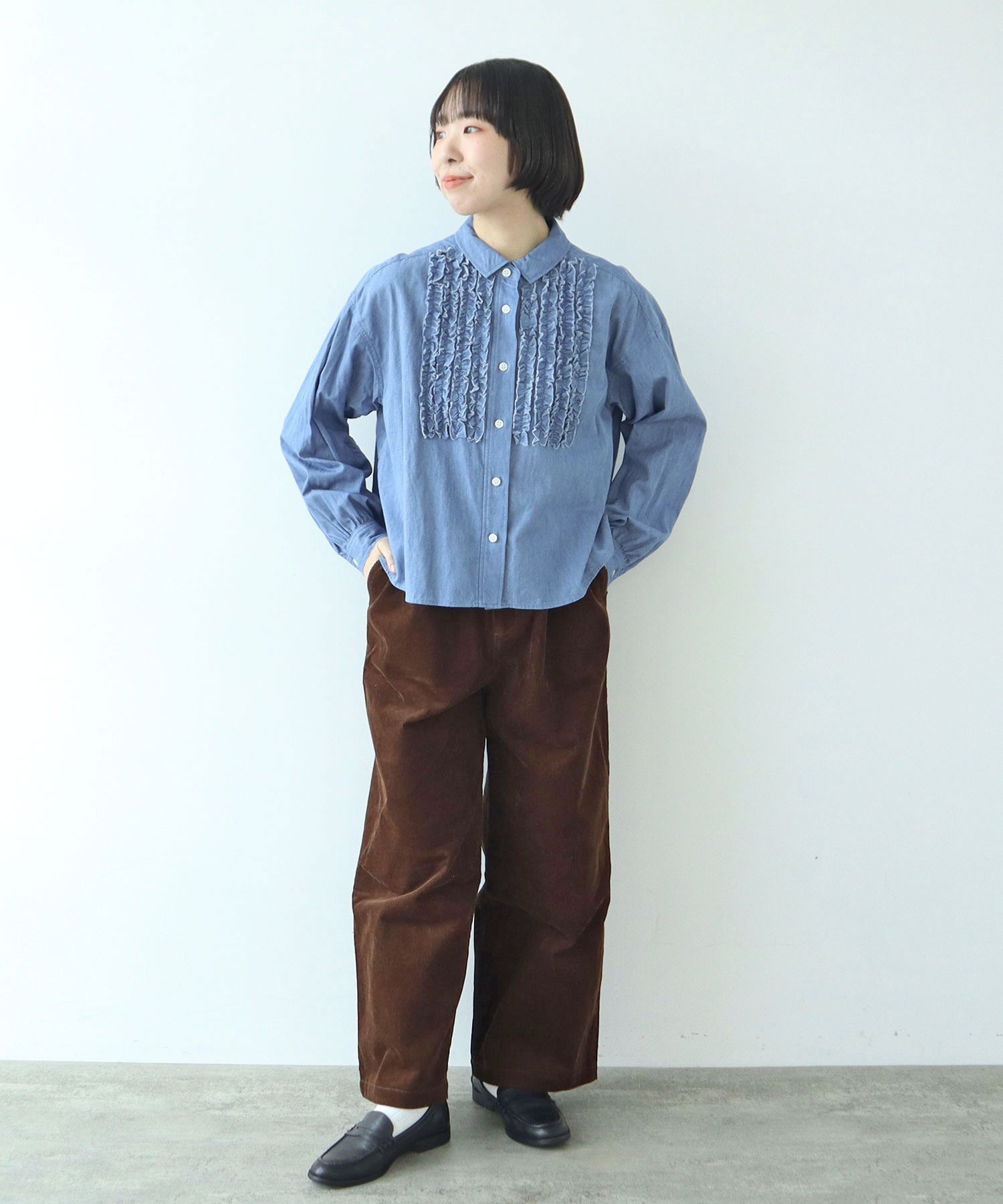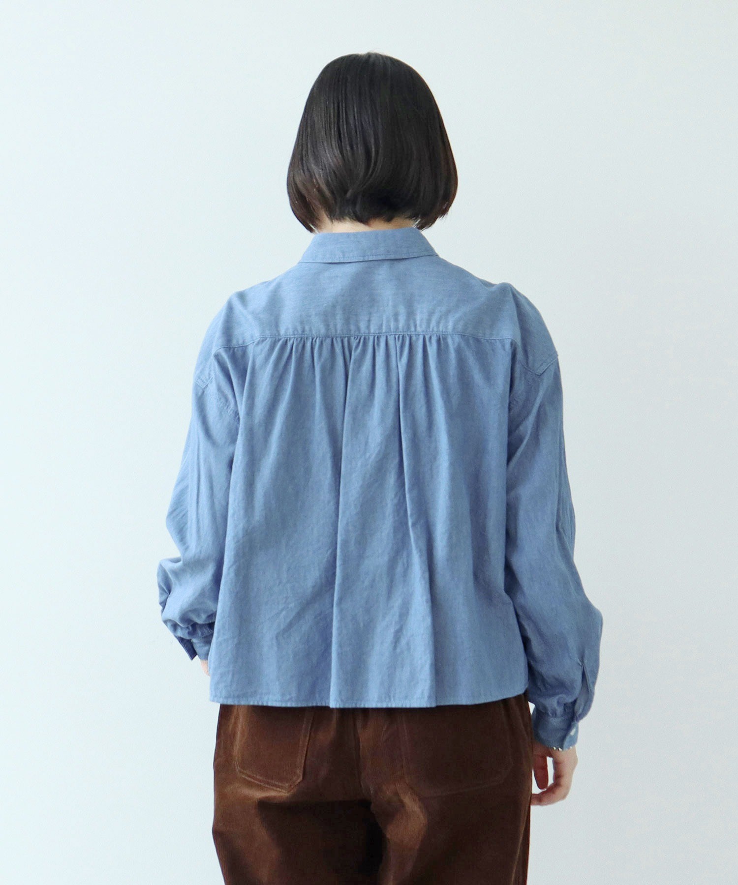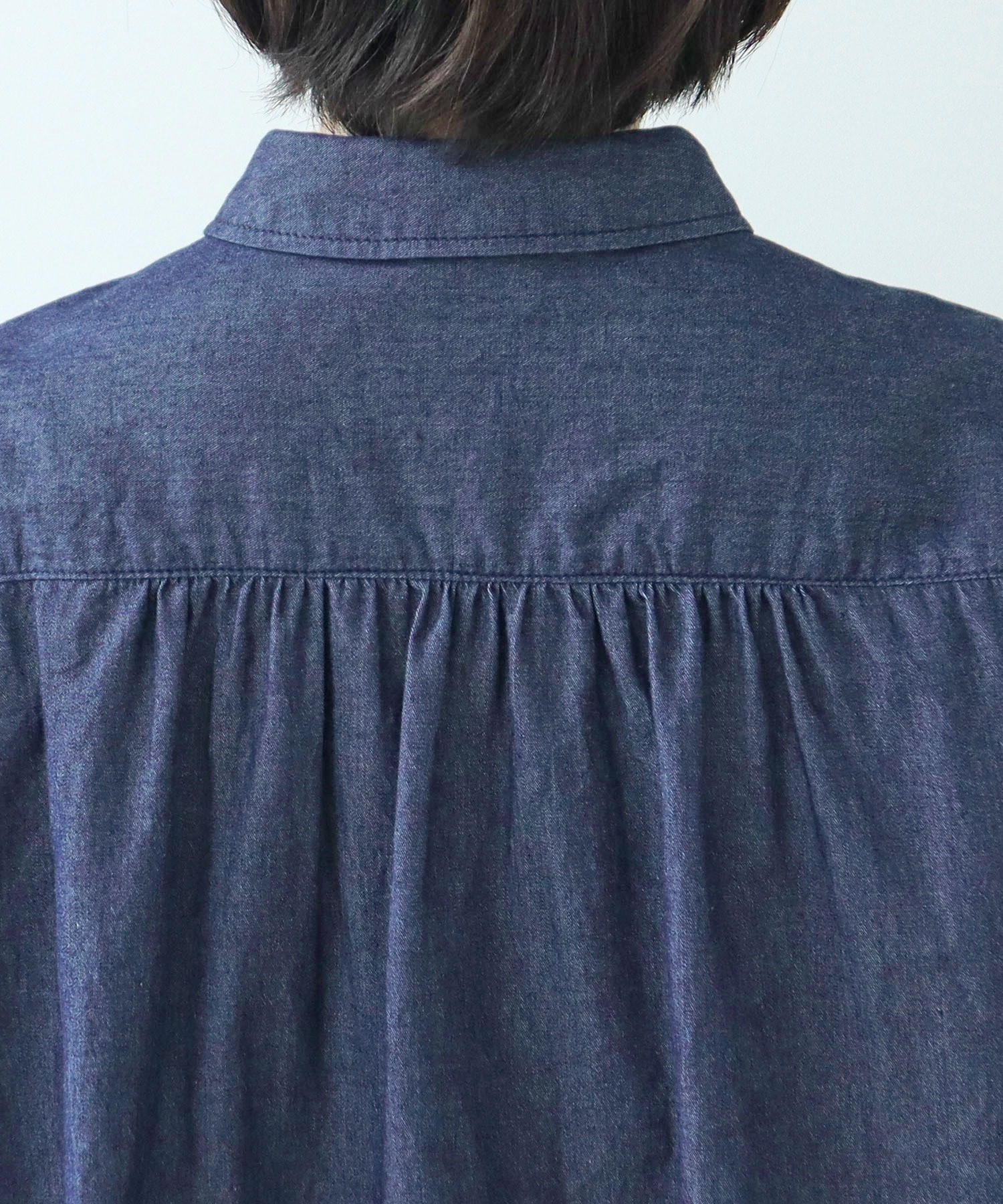 通常のデニムよりも糸を甘く撚った、軽くて柔らかいライトオンスデニムを使用しました。細番手の糸で織った生地はさらっとした肌触りでソフトな着心地です。縫い上がった製品を一度洗いにかける製品水洗い加工を施しているので、味のある風合いに。身頃にフリルをたっぷりとあしらいつつも、甘くなりすぎないようにフリル端を断ち切り仕様にする事でラフに仕上げました。ちょっぴりかわいらしいデザインも、スパイスの効いたデニム素材でスタイリングに取り入れやすい、程良い甘さのシャツです。コンパクトな丈感で羽織った時にバランス良く見えるところも嬉しいポイント。