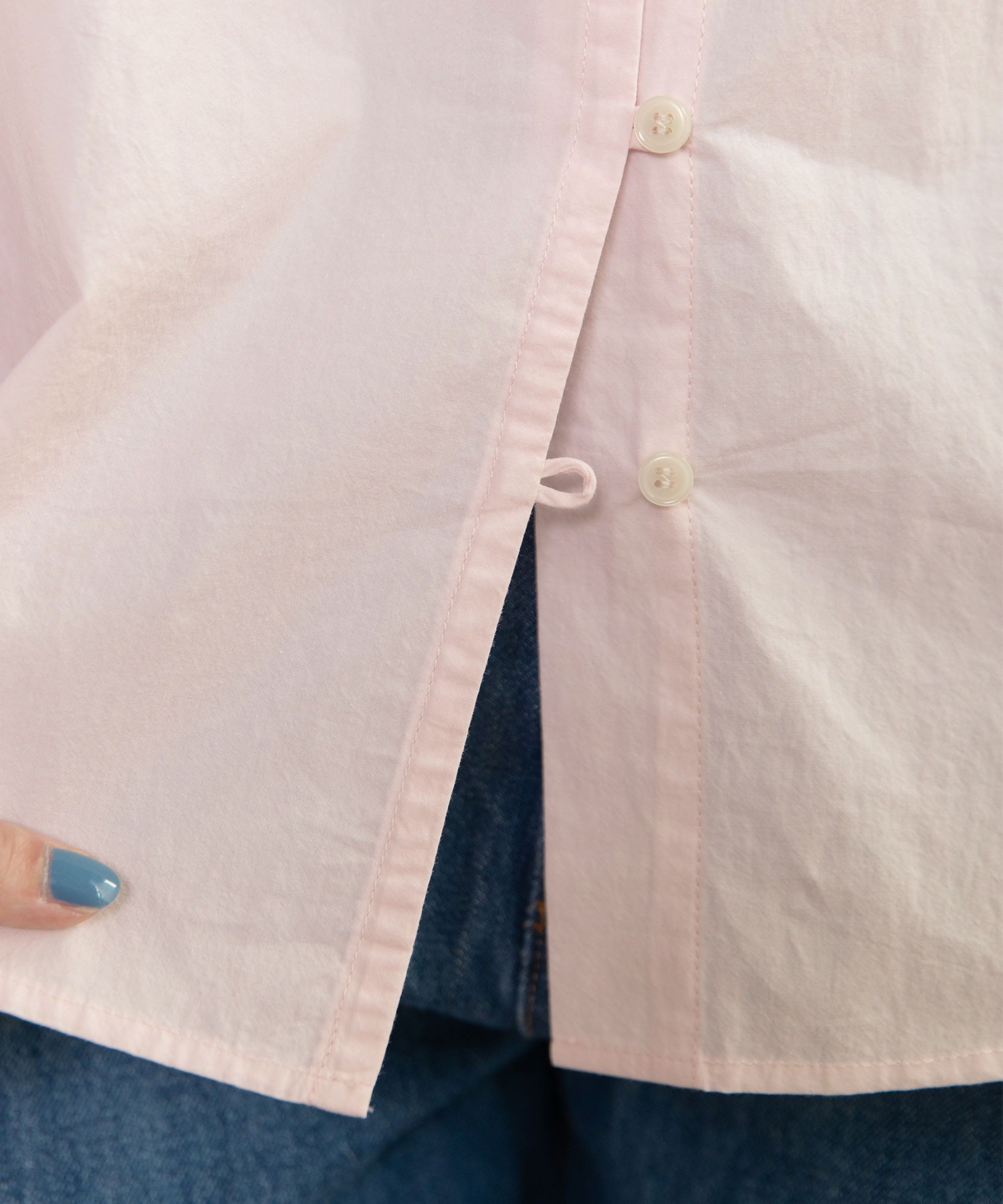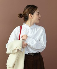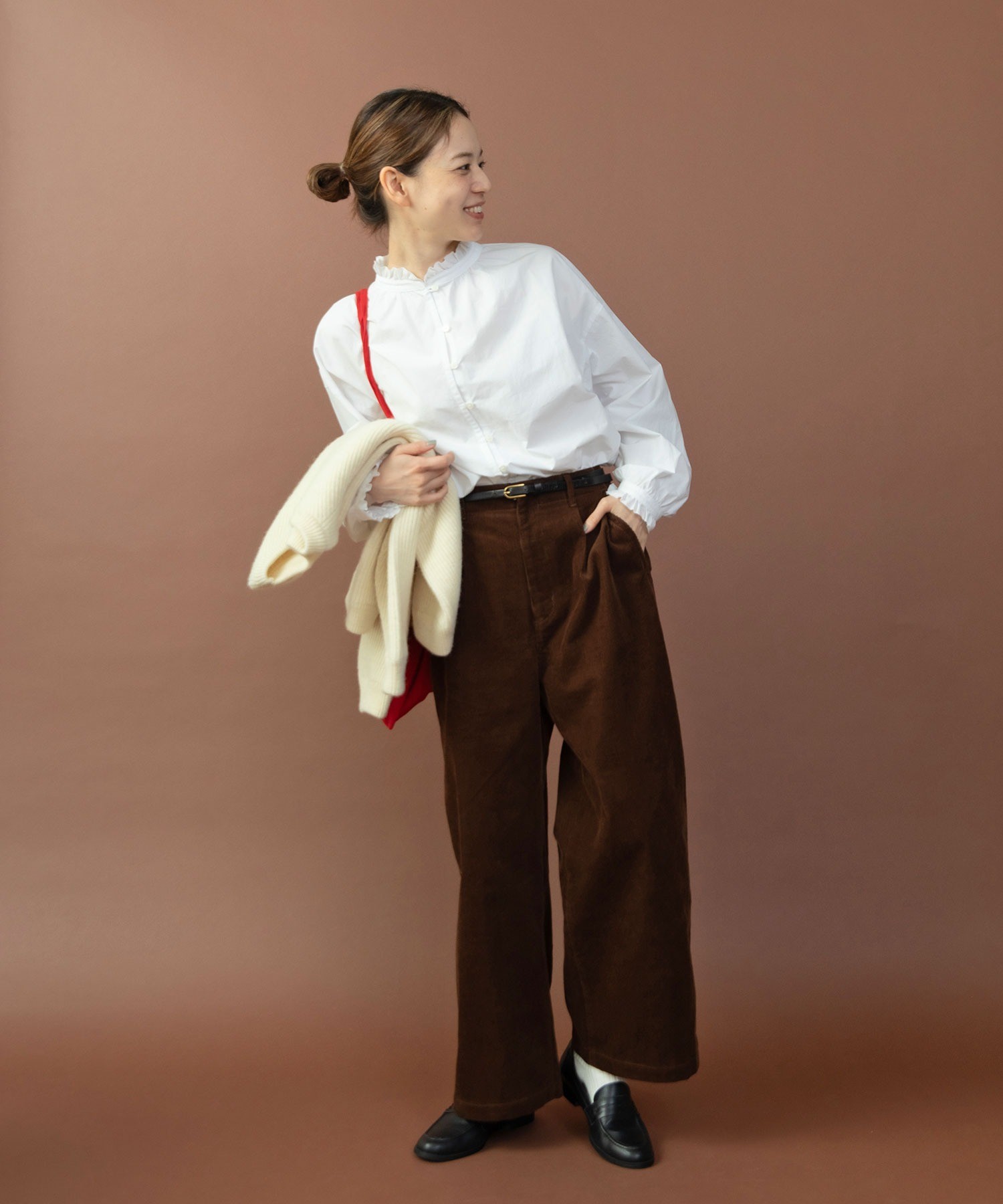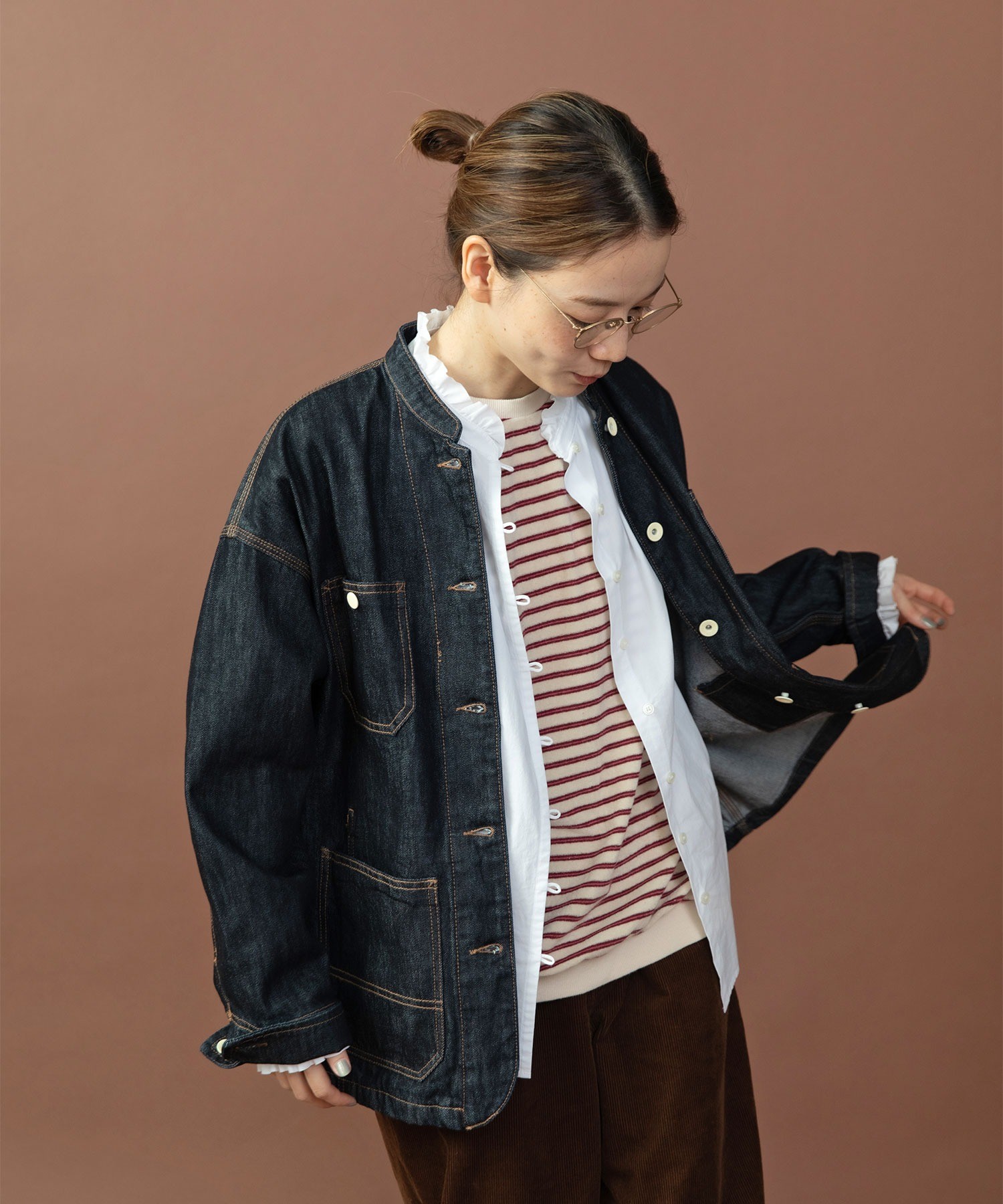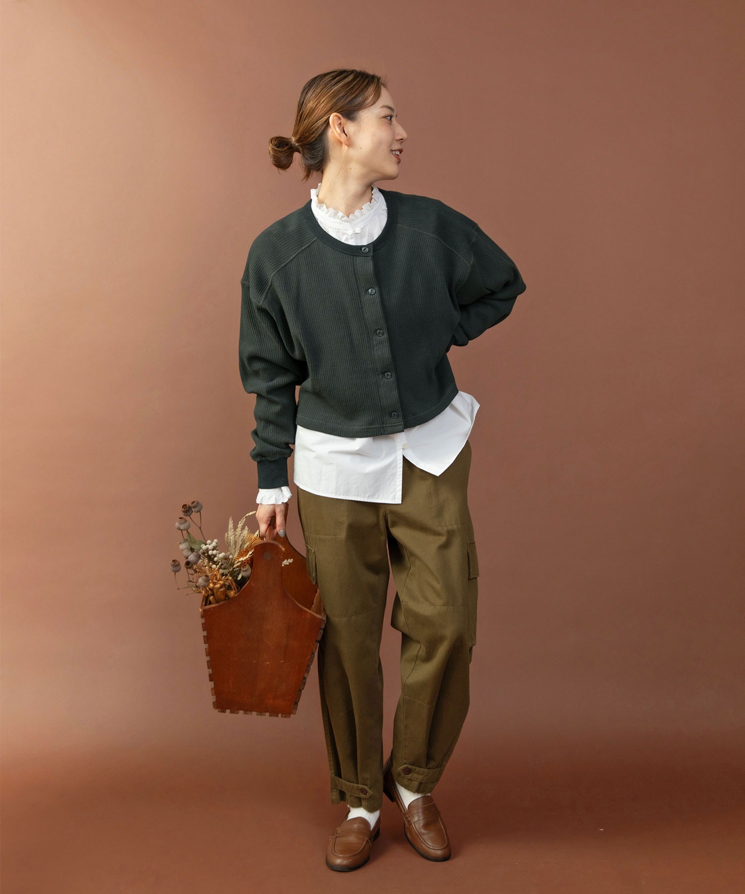 クラシックな印象のループボタンホールは、前を開けて羽織った時にもさりげないポイントに。かわいいだけではなくメンズライクなアイテムに合わせても馴染みの良いPAR ICIらしいこだわりです。デニムやカーゴパンツを合わせれば、丁度良い甘さ加減のカジュアルスタイルに。チノやデニムなど硬めの素材のロングスカートと合わせても、上品ながらもどこかカレッジな雰囲気に。