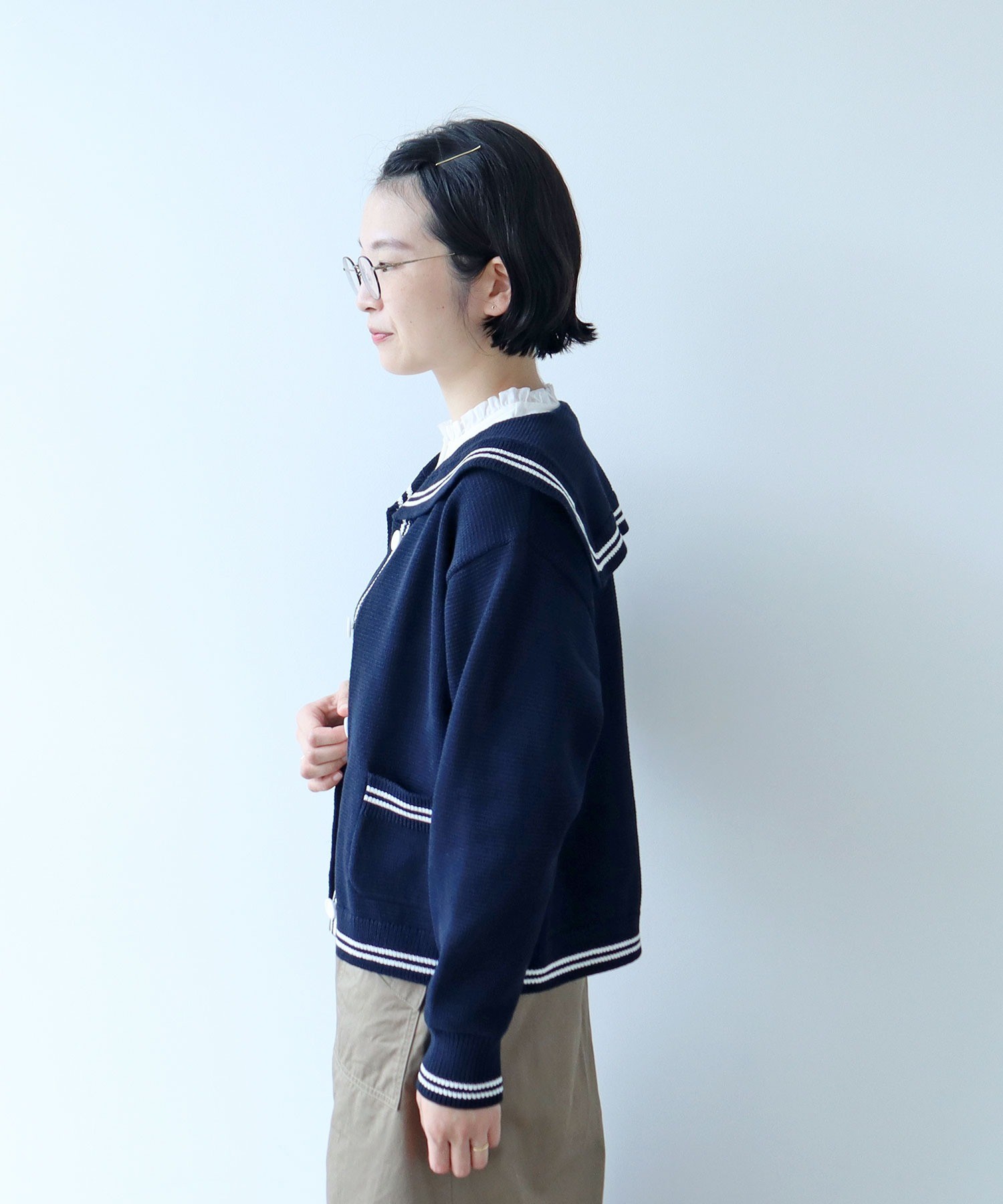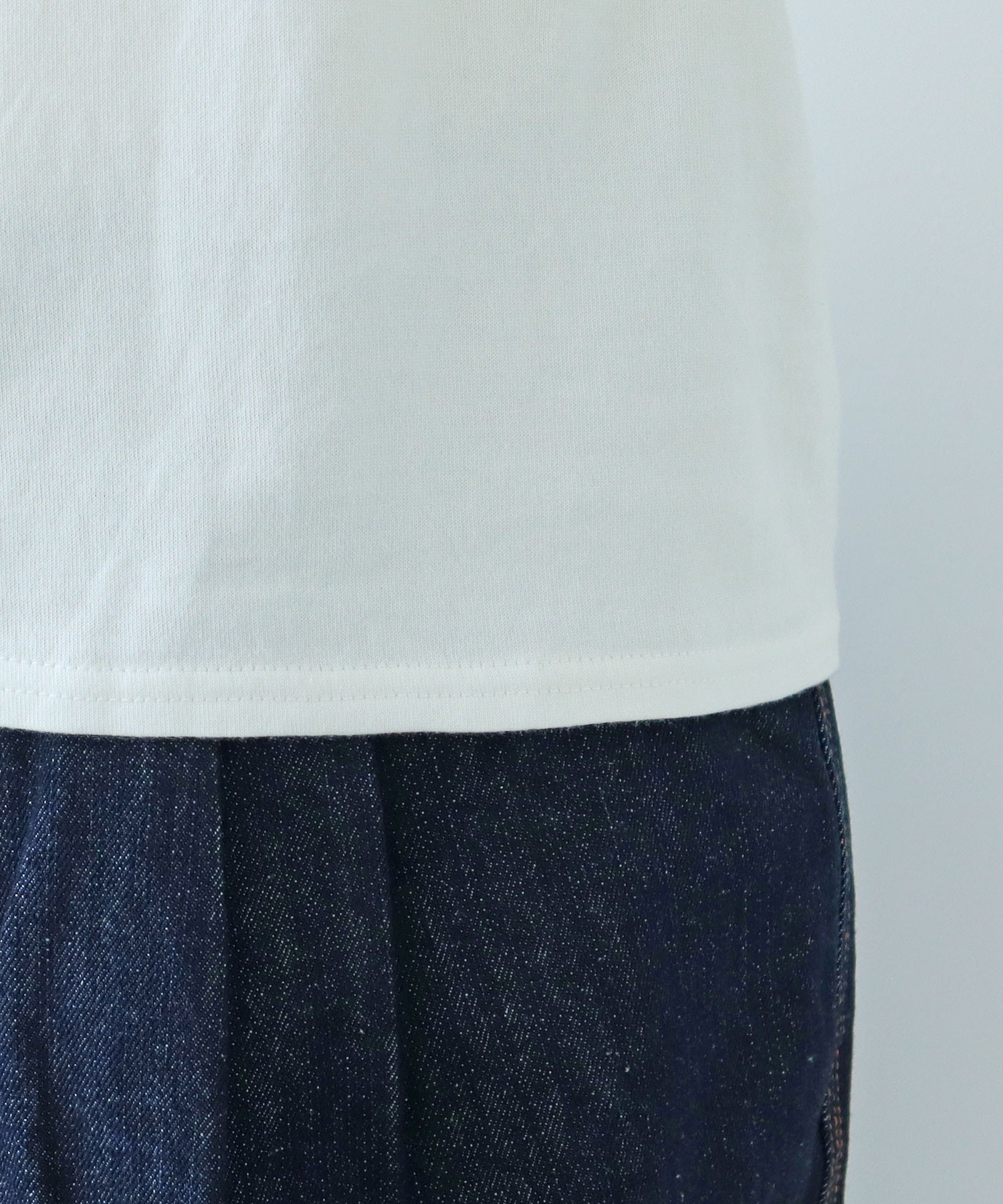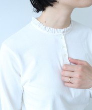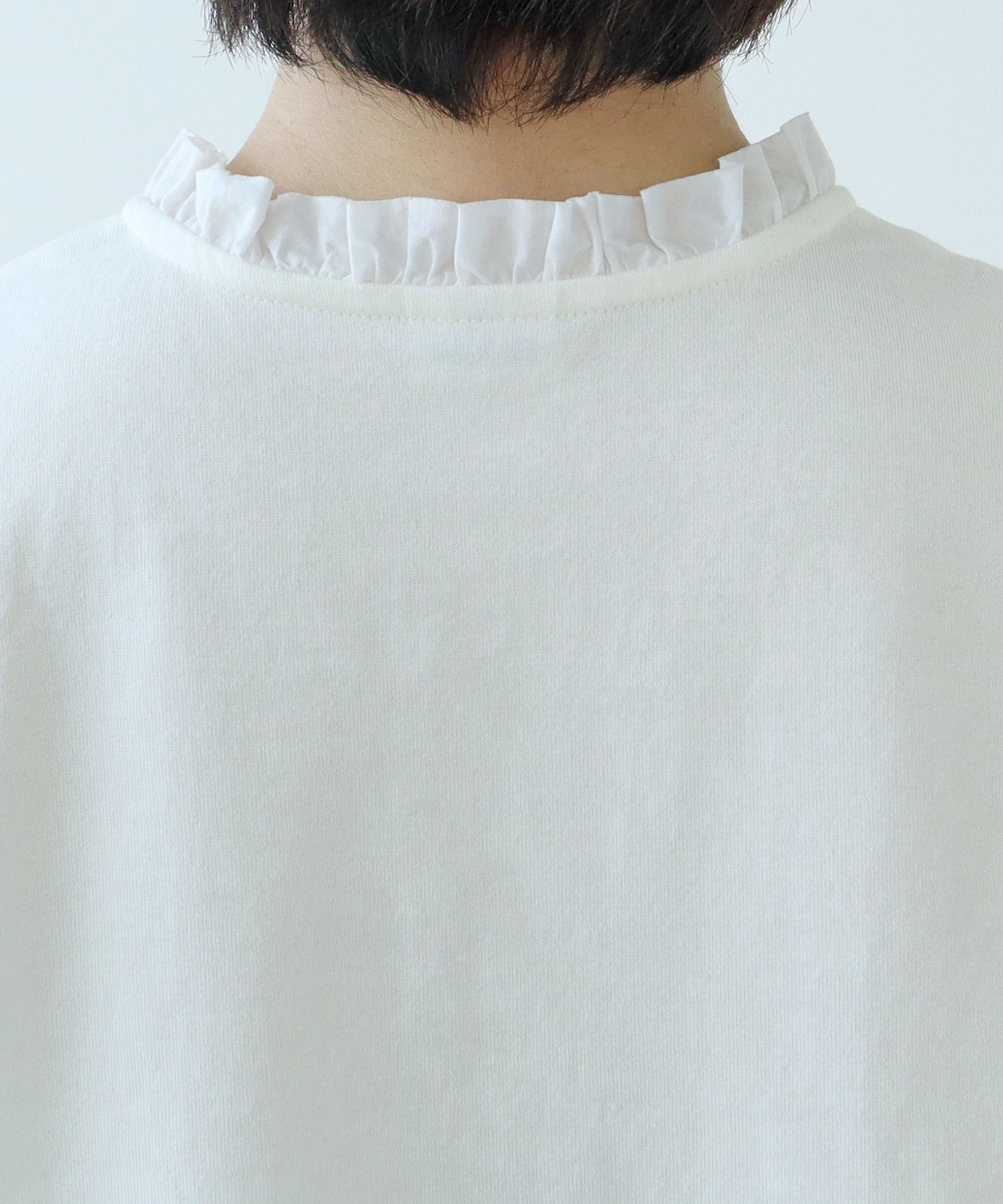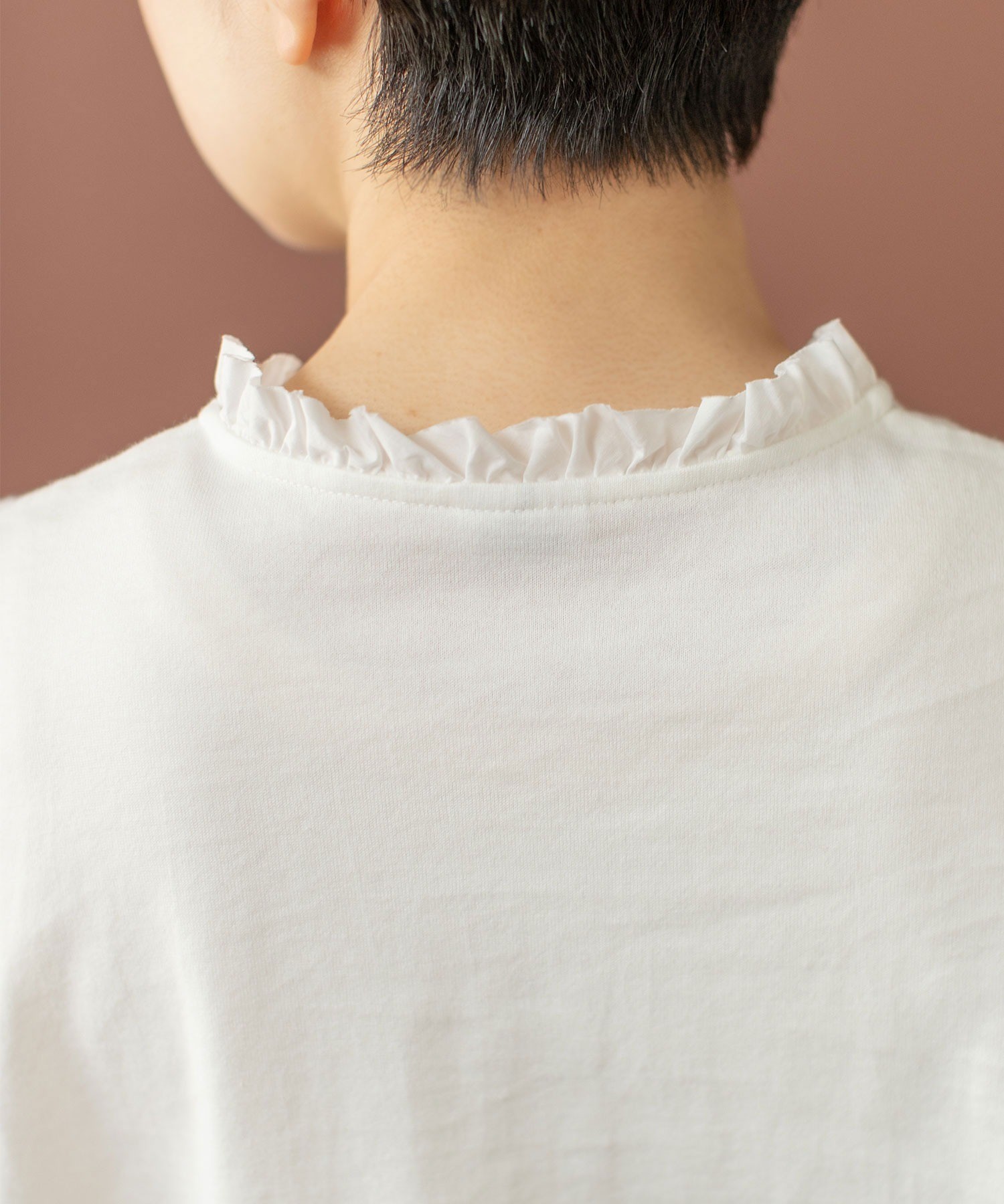 ソフトで滑らかな風合いを持つコーマフライス素材のボディに、しなやかで適度なハリ感のあるフリルを施し、ちょっぴり甘さのあるディテールをプラス。甘くなりすぎないよう、フリルは断ち切り仕様にすることでラフに仕上げました。肌に馴染む快適な着心地のカットソーは、重ね着した時にも動きやすくストレスフリーに着られます。ちょこんとした小さなサイズ感が愛らしいアンティークのような貝ボタンは、サロペットやカーディガンからちらっと覗かせてもスタイリングのポイントに。
