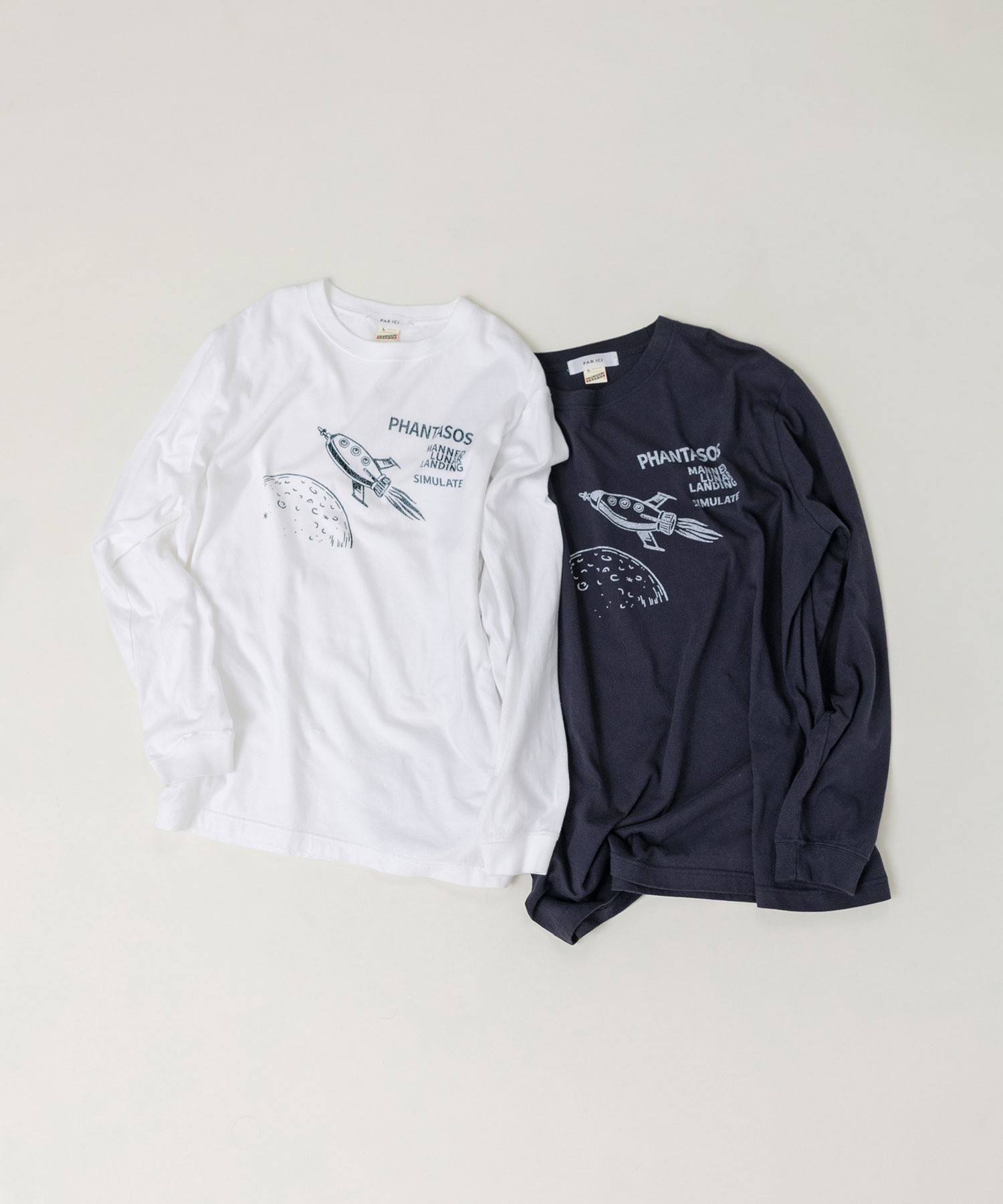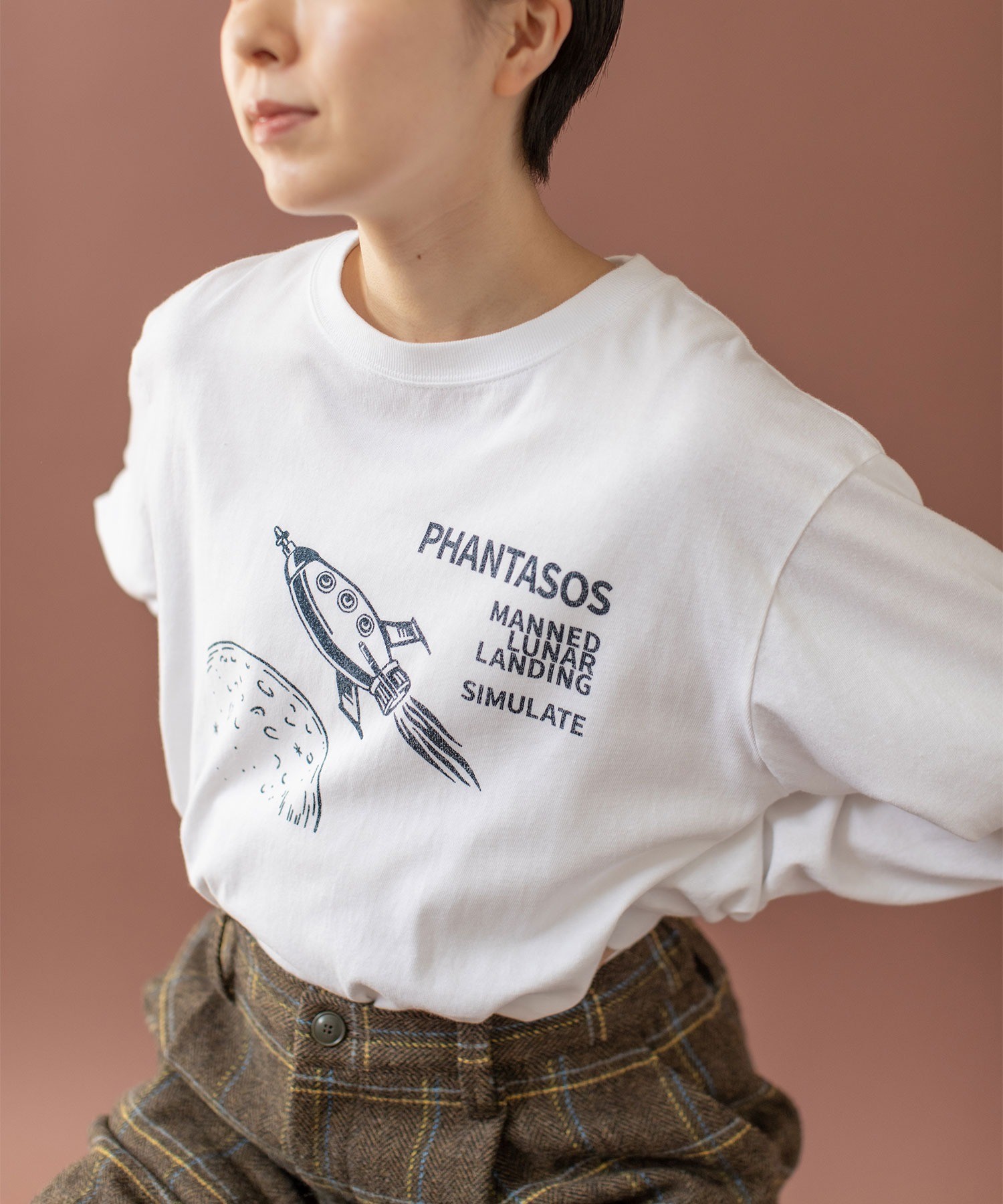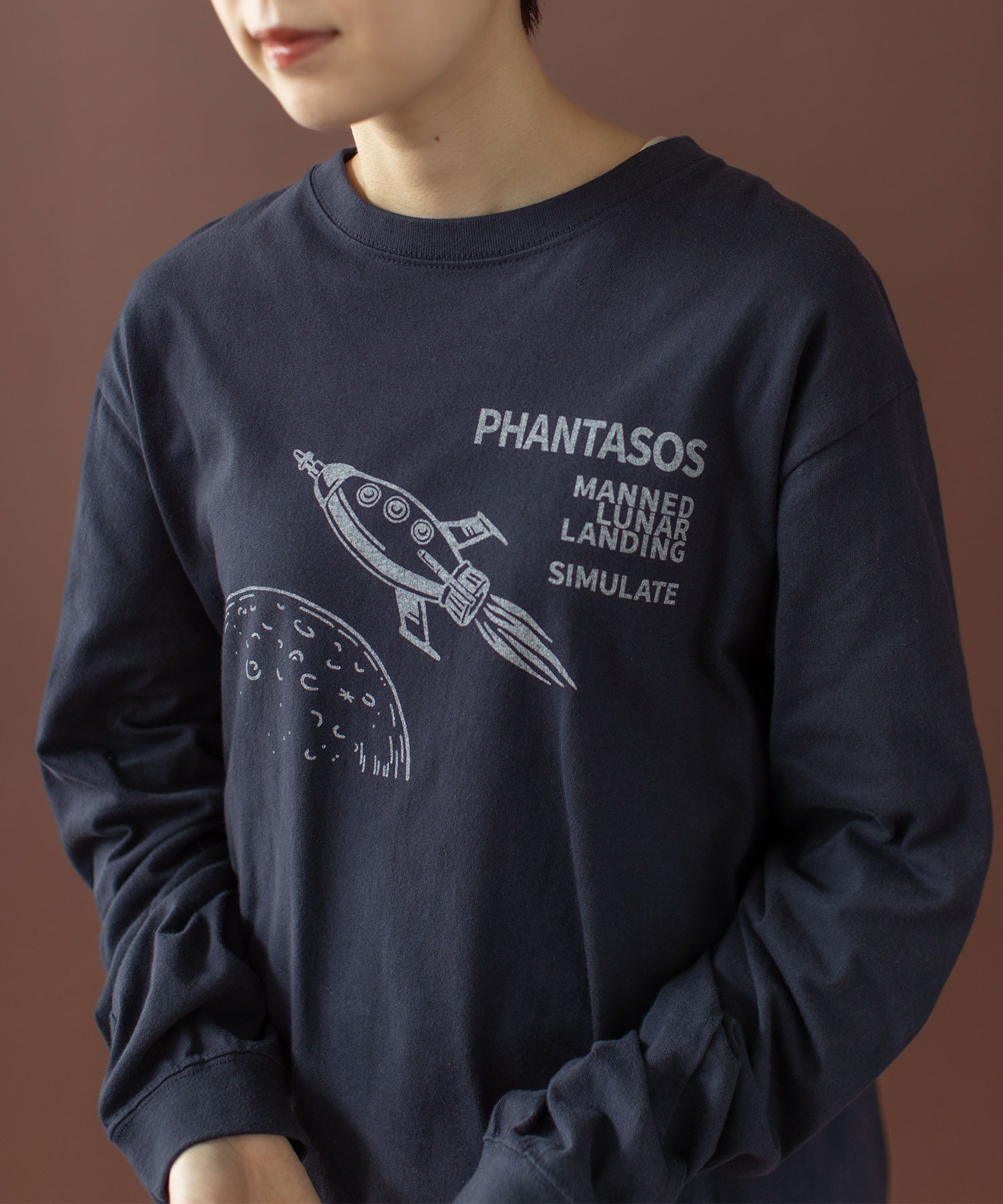 よく見るとユニークな丸い窓の宇宙船や月のクレーターなど、メンズのデザインにありそうなアートワークをプリントしました。宇宙船“PHANTASOS”の船名の由来は、ギリシャ神話に登場する夢の神様の名前から。イラストのサイドに記された“有人月面着陸”“模擬実験をする”という意味のフレーズで、想像しただけでわくわくした気持ちになりそう。イラストと文字の配置間隔や、プリントの大きさは微調整を重ね、一枚で着た時にもスタイリングの主役になるアイテムに仕上げました。プリントで遊び心を効かせた分、ベースカラーはシロとコンのベーシックカラーをチョイス。シロボディには紺、コンボディには白のかすれプリントを単色で施し、どこか古着のような雰囲気に。カーディガンや前開きベストのインナーとしてプリントを覗かせるのもおすすめ。