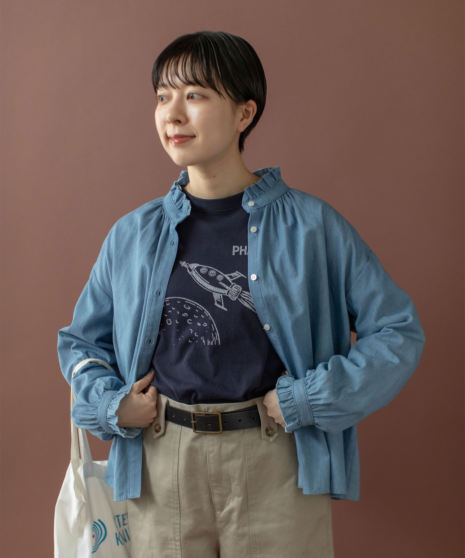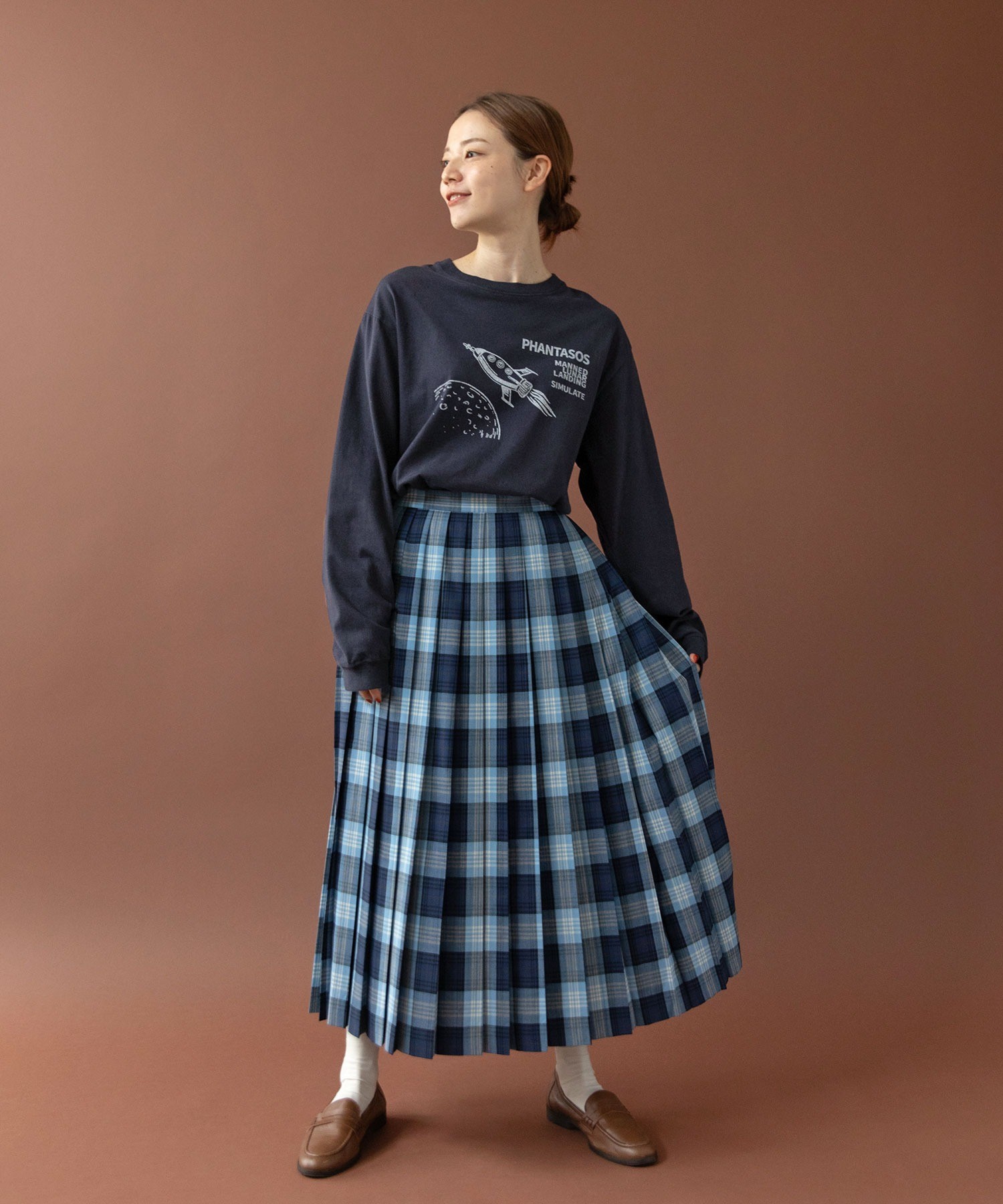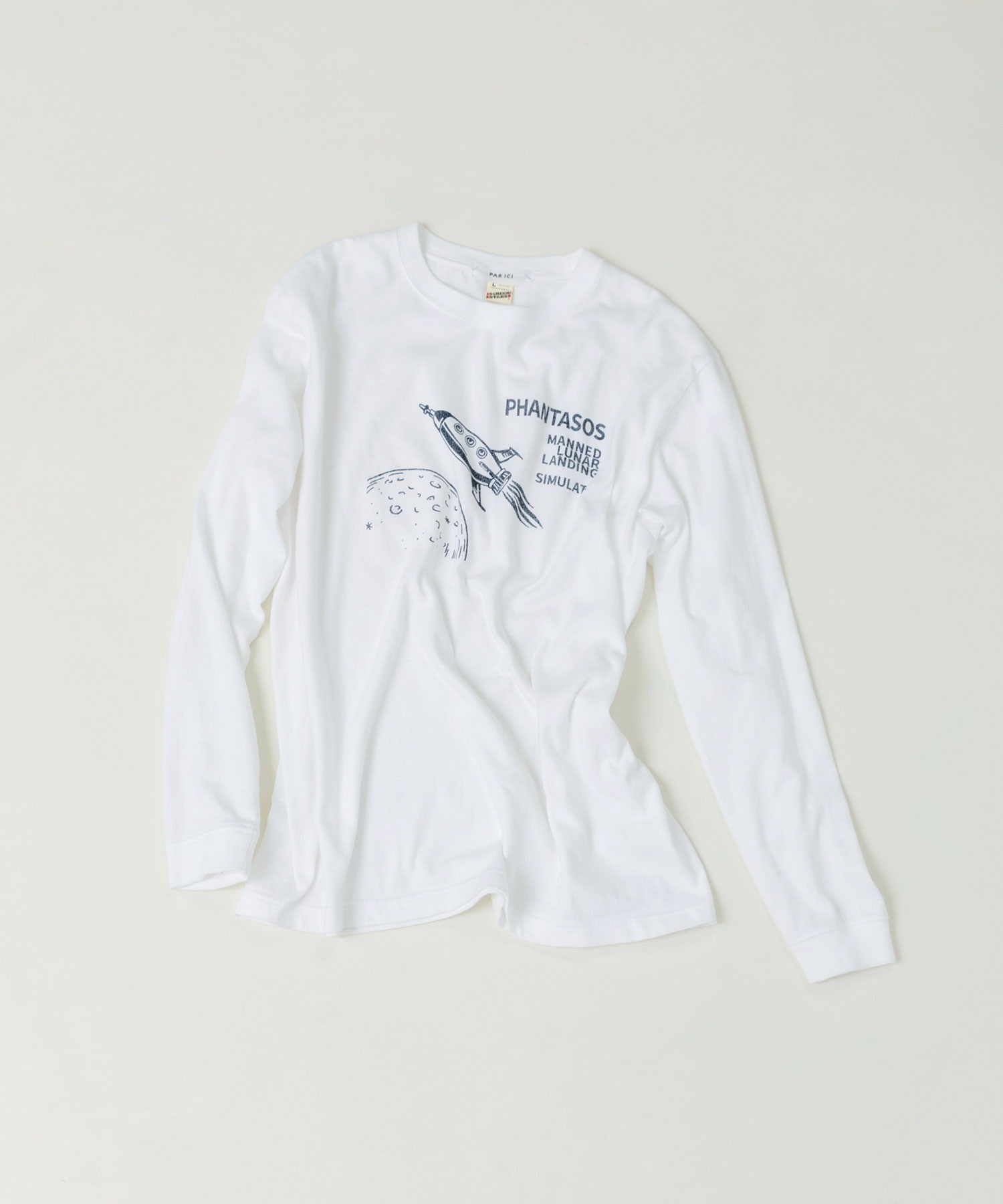 よく見るとユニークな丸い窓の宇宙船や月のクレーターなど、メンズのデザインにありそうなアートワークをプリントしました。宇宙船“PHANTASOS”の船名の由来は、ギリシャ神話に登場する夢の神様の名前から。イラストのサイドに記された“有人月面着陸”“模擬実験をする”という意味のフレーズで、想像しただけでわくわくした気持ちになりそう。イラストと文字の配置間隔や、プリントの大きさは微調整を重ね、一枚で着た時にもスタイリングの主役になるアイテムに仕上げました。プリントで遊び心を効かせた分、ベースカラーはシロとコンのベーシックカラーをチョイス。シロボディには紺、コンボディには白のかすれプリントを単色で施し、どこか古着のような雰囲気に。カーディガンや前開きベストのインナーとしてプリントを覗かせるのもおすすめ。