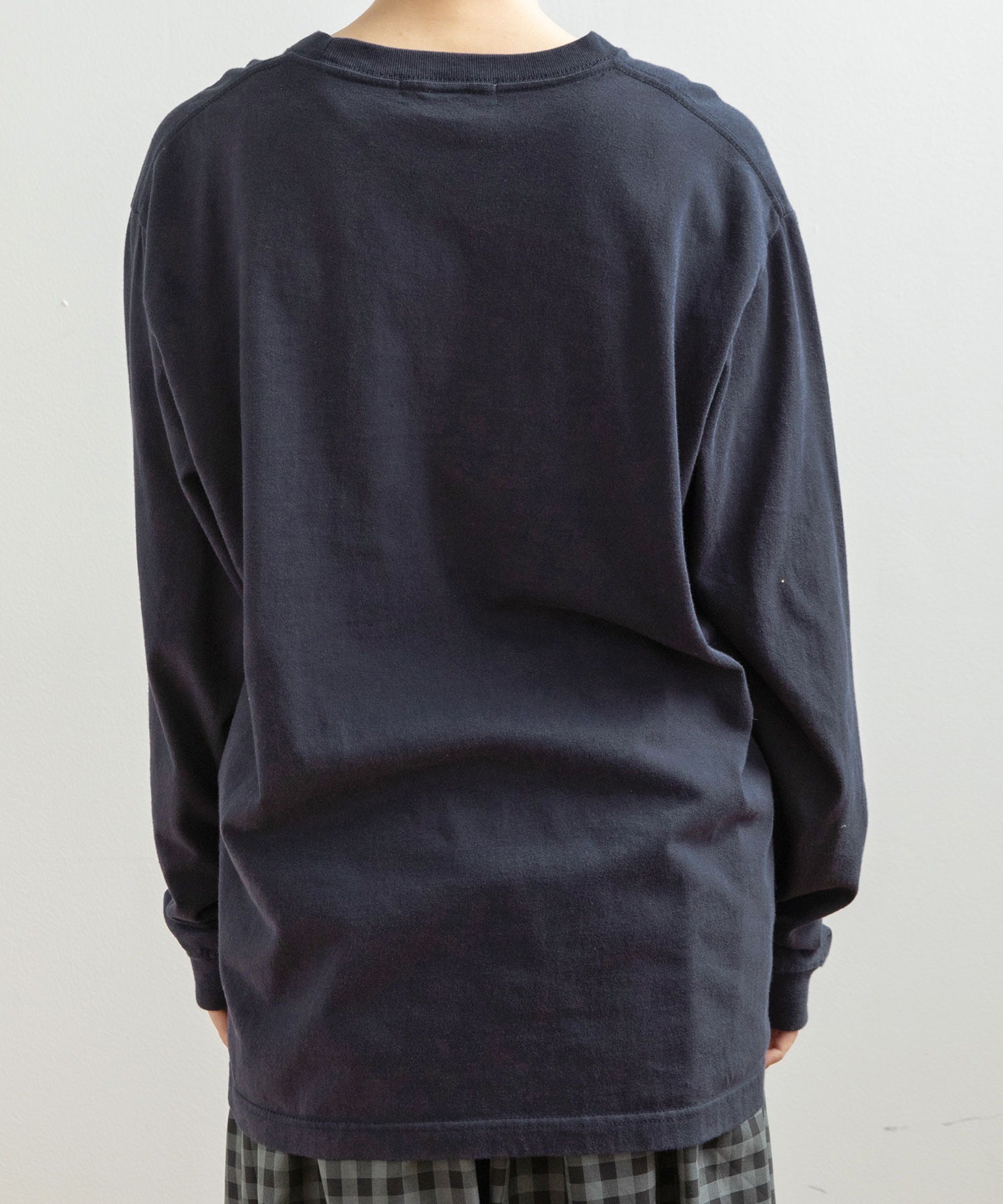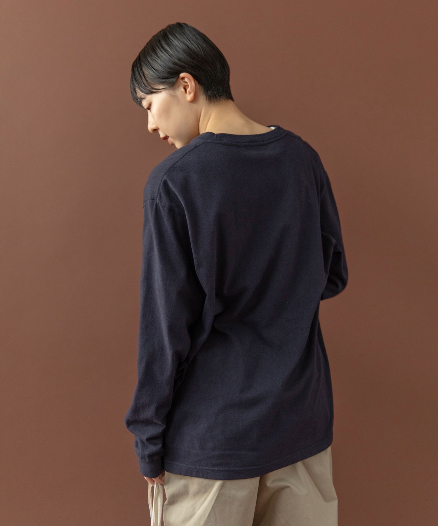 SCREEN STARSの5.6オンスのコットン100%ボディを使用。一枚で着用できる程良い厚みと強度を兼ね揃え、洗濯を繰り返してもよれにくい作りです。縫い上がった製品を一度洗いにかける製品水洗い加工を加え、味のある風合いに仕上げました。ゆったりとしたサイズ感で気軽に日常使いしやすいところも嬉しい。