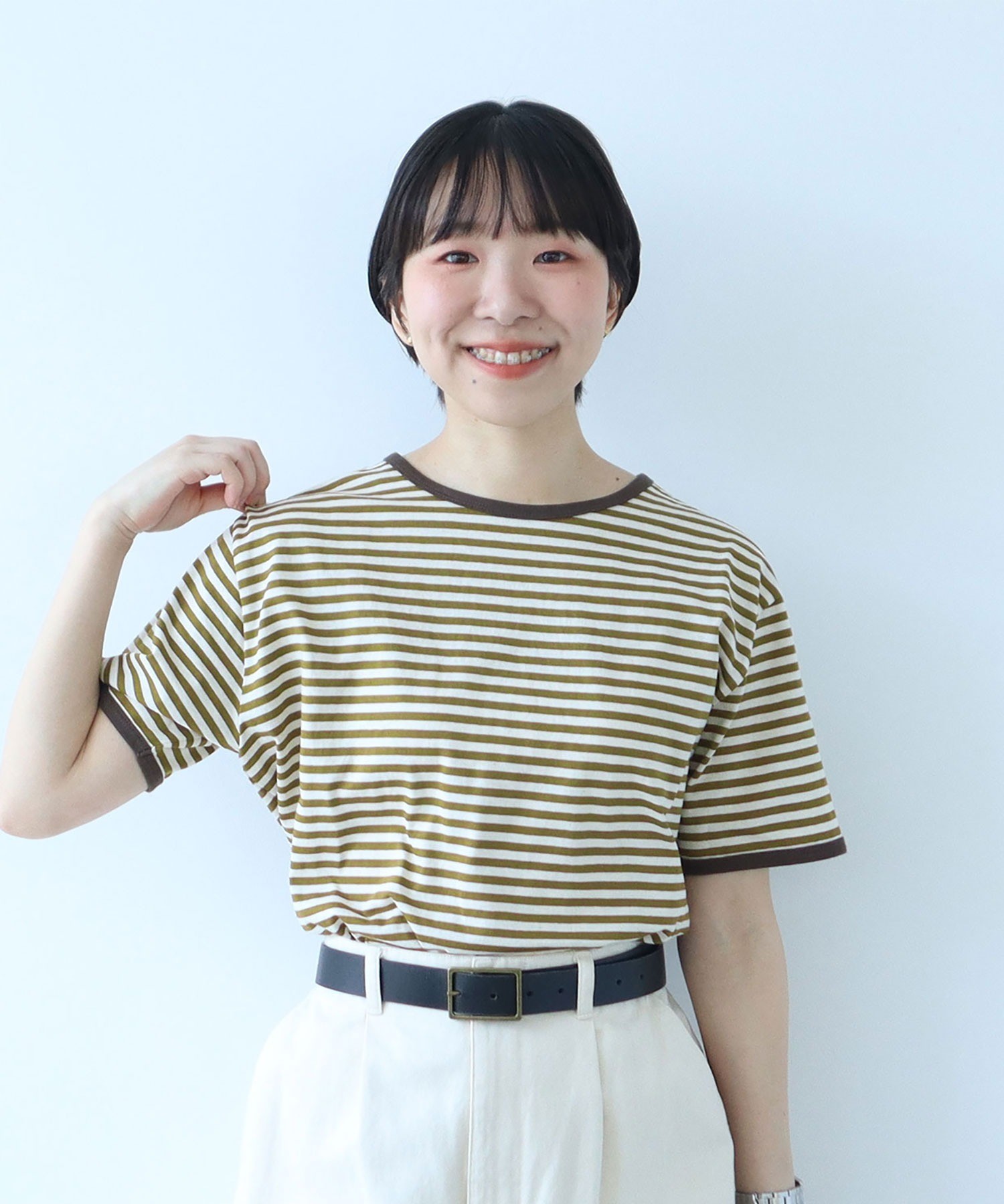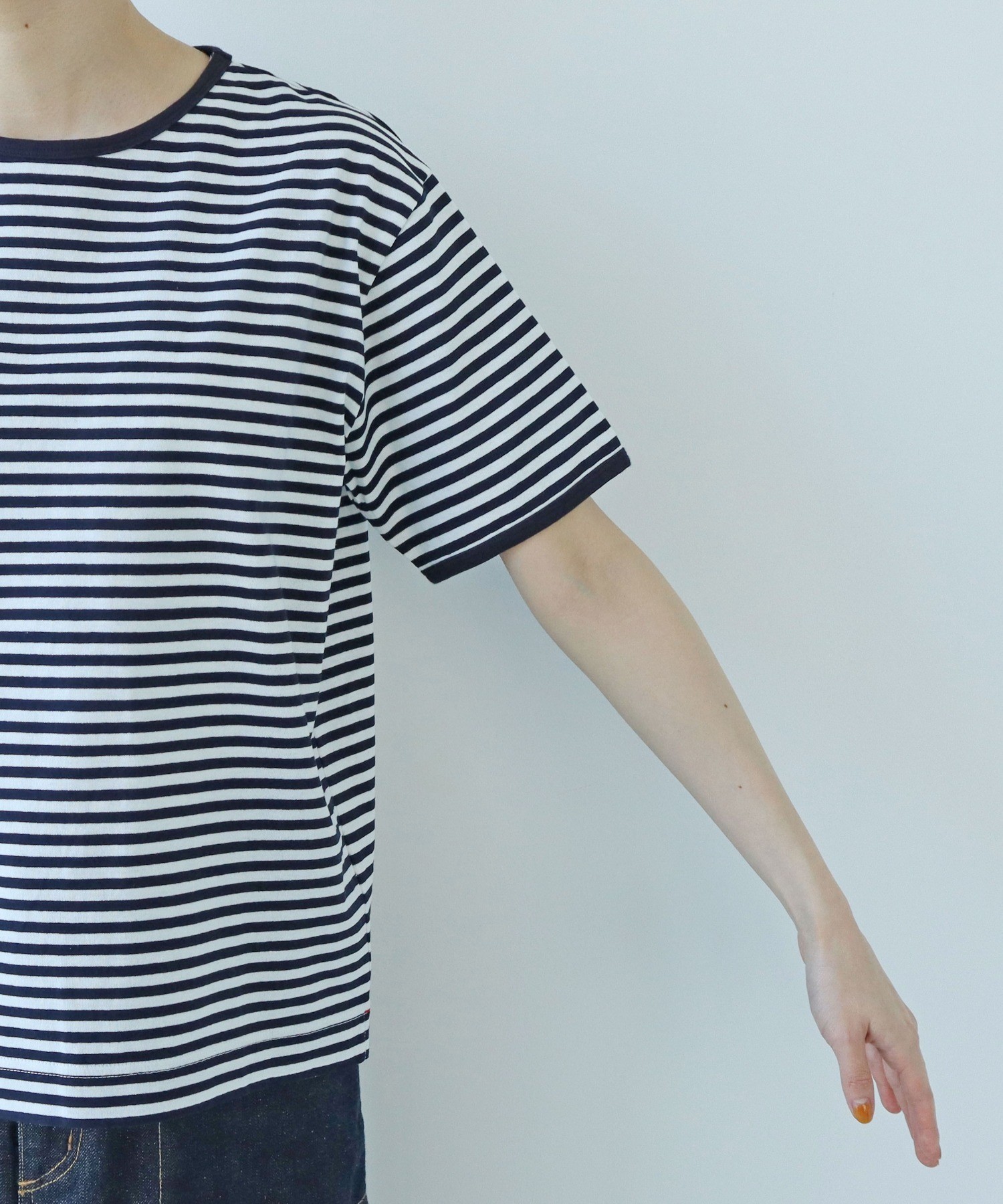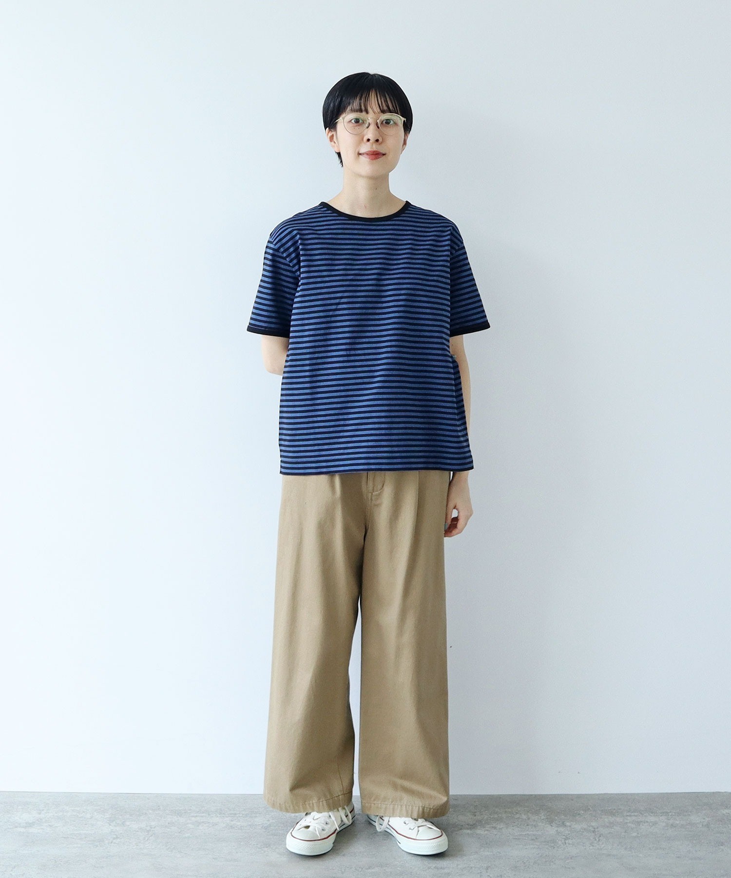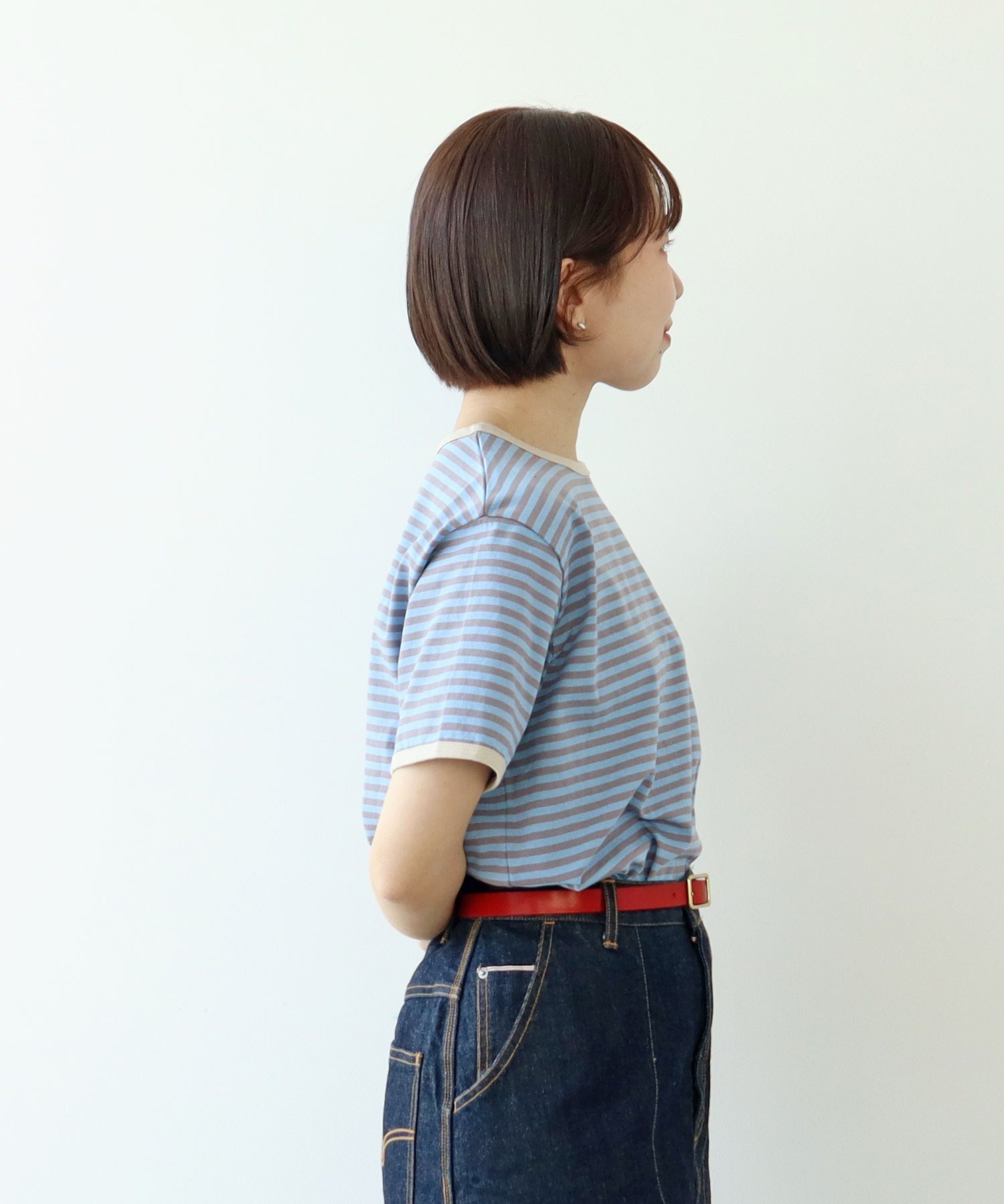 襟と袖口のバインダーがフレンチなイメージ。シャツやカーディガンとの重ね着もしやすいベーシックなシルエットの半袖ですが、一枚着として着やすいよう、袖や身幅の太さ、肩の落ち感などボディラインに沿わないややゆとりを持たせたサイズ感に仕上げました。こちらのシリーズはハリのあるやや硬めの生地感ながらも、どんなシーズンにも着やすい厚みが使いやすい。