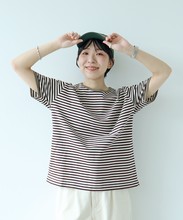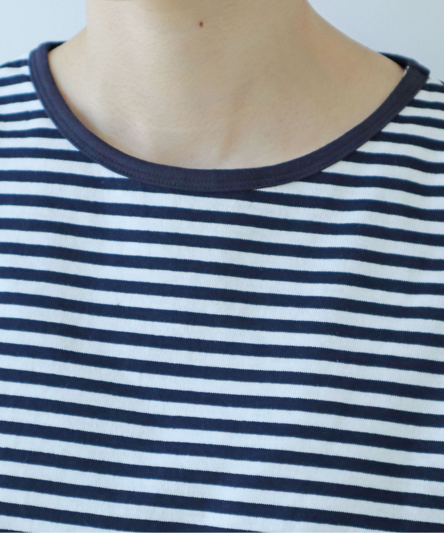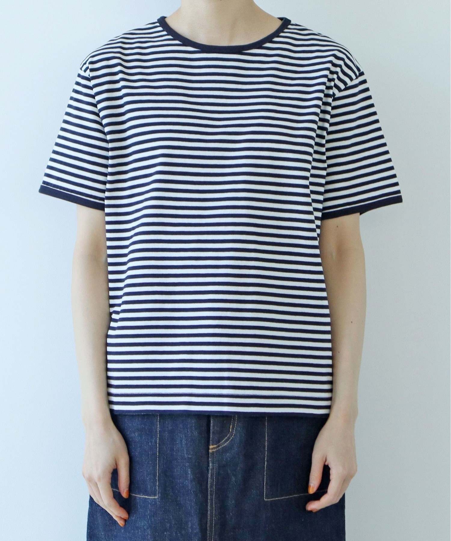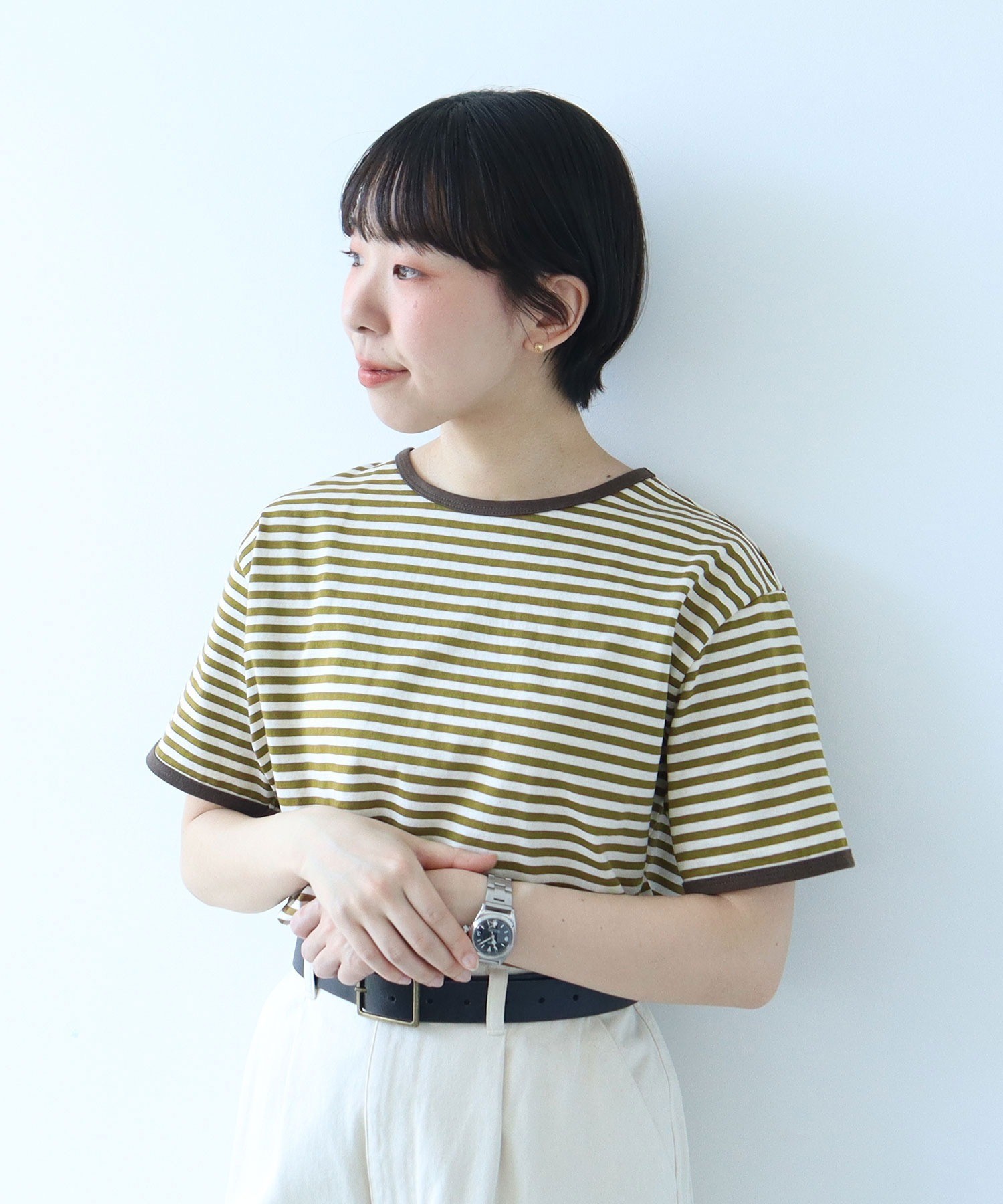 襟と袖口のバインダーがフレンチなイメージ。シャツやカーディガンとの重ね着もしやすいベーシックなシルエットの半袖ですが、一枚着として着やすいよう、袖や身幅の太さ、肩の落ち感などボディラインに沿わないややゆとりを持たせたサイズ感に仕上げました。こちらのシリーズはハリのあるやや硬めの生地感ながらも、どんなシーズンにも着やすい厚みが使いやすい。