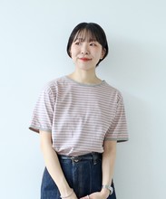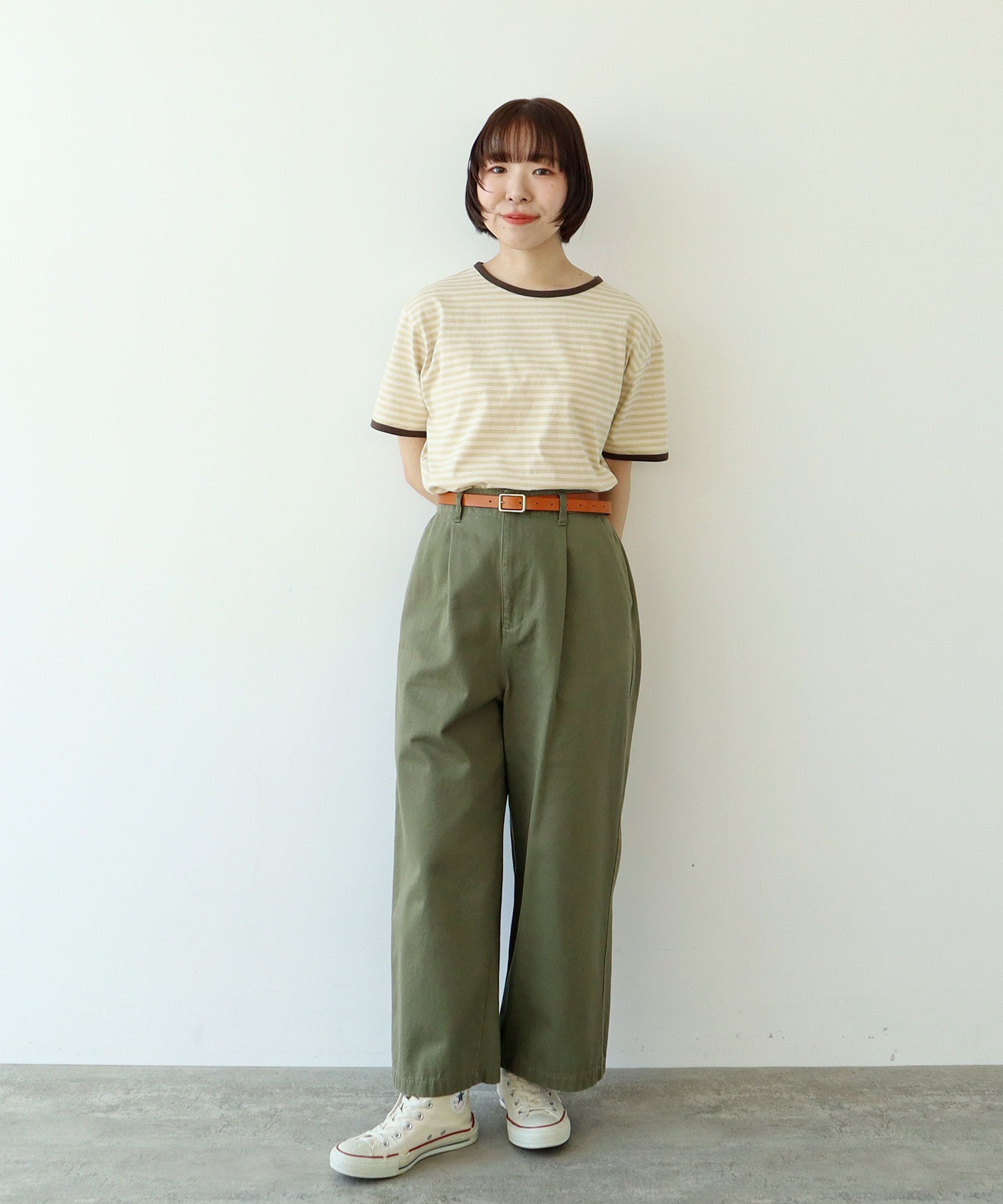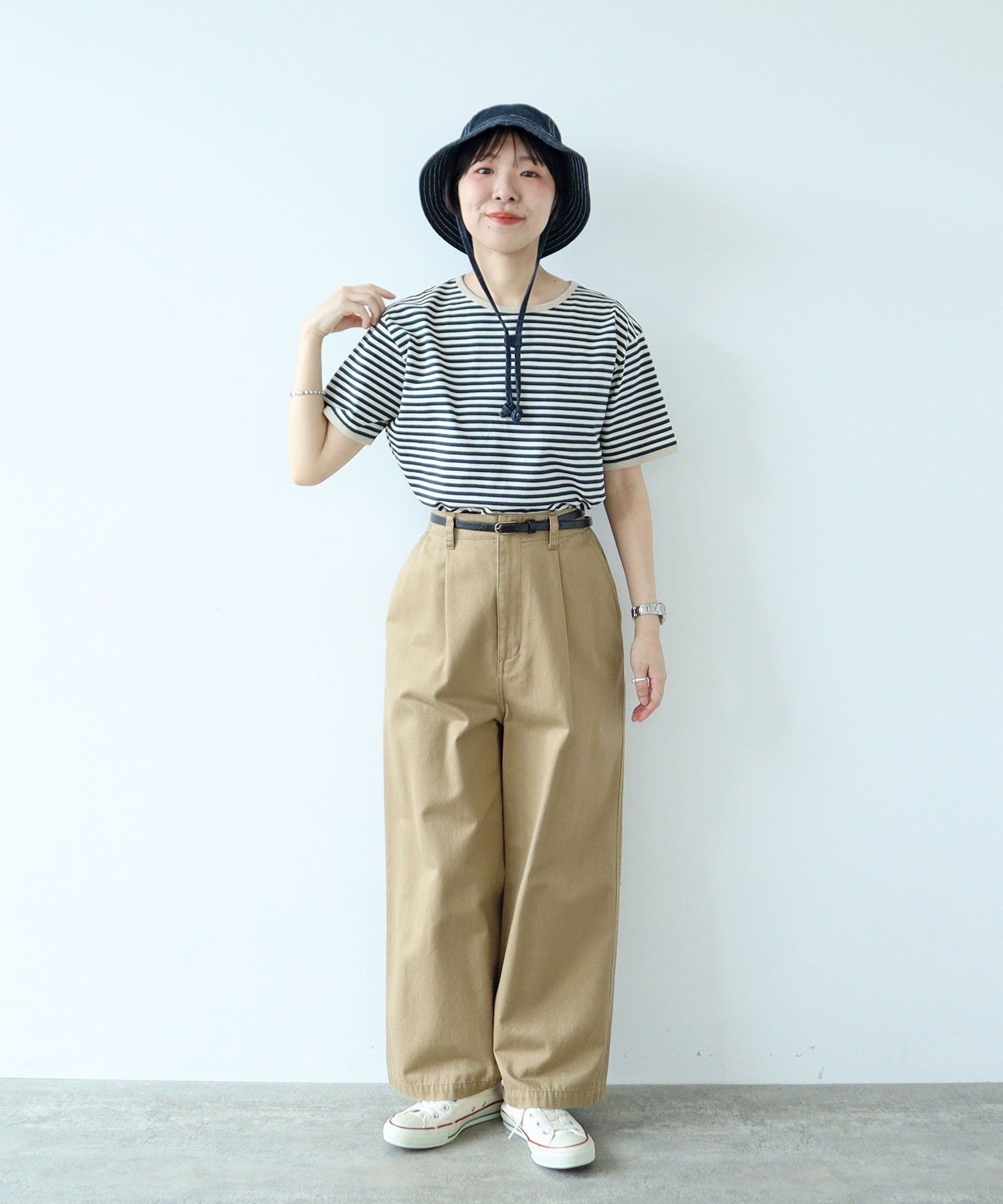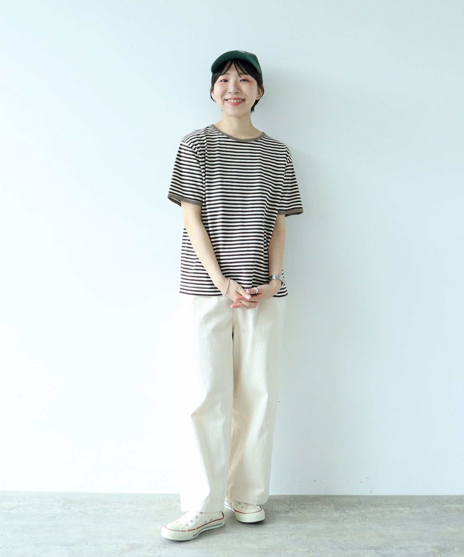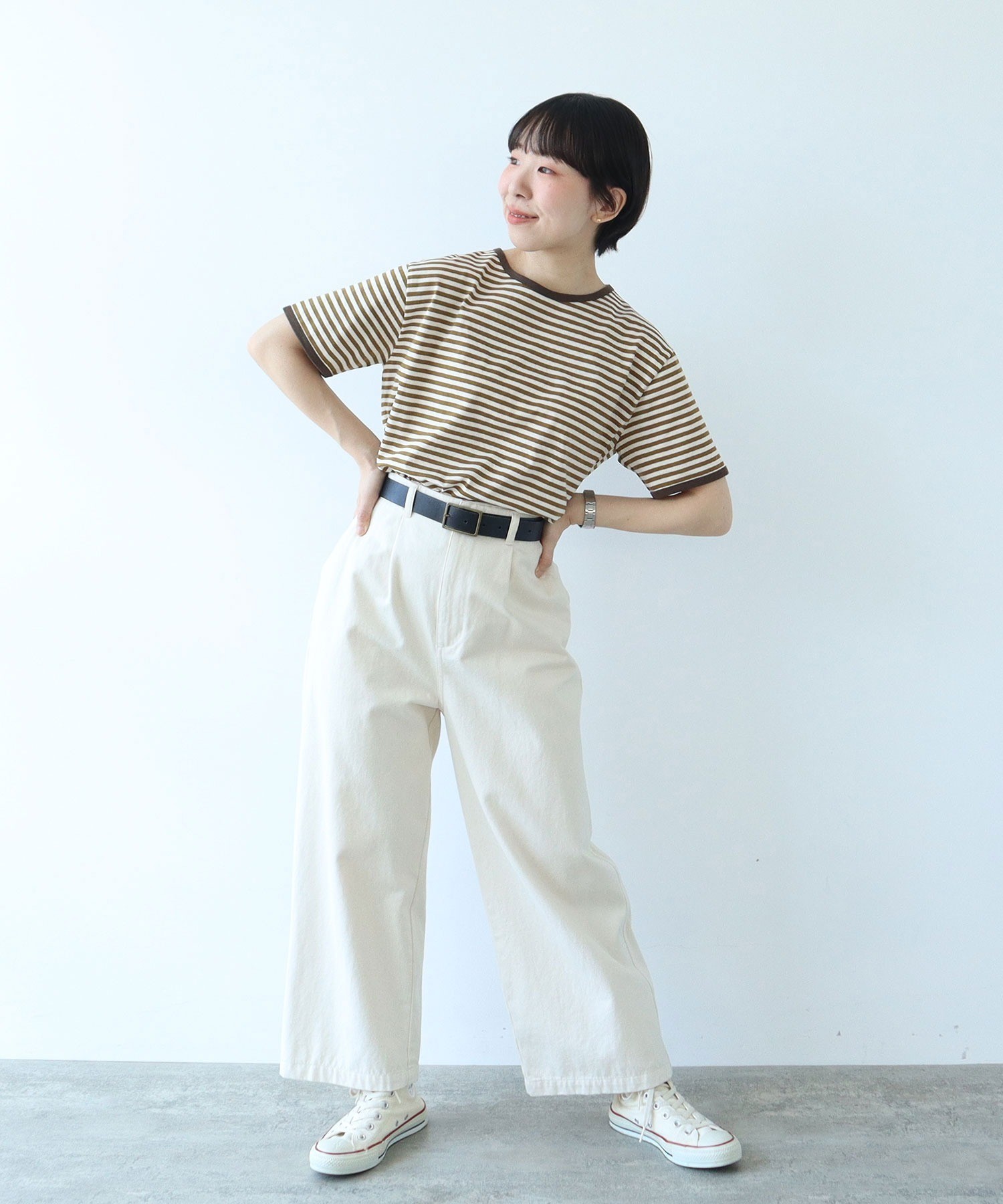 襟と袖口のバインダーがフレンチなイメージ。シャツやカーディガンとの重ね着もしやすいベーシックなシルエットの半袖ですが、一枚着として着やすいよう、袖や身幅の太さ、肩の落ち感などボディラインに沿わないややゆとりを持たせたサイズ感に仕上げました。こちらのシリーズはハリのあるやや硬めの生地感ながらも、どんなシーズンにも着やすい厚みが使いやすい。