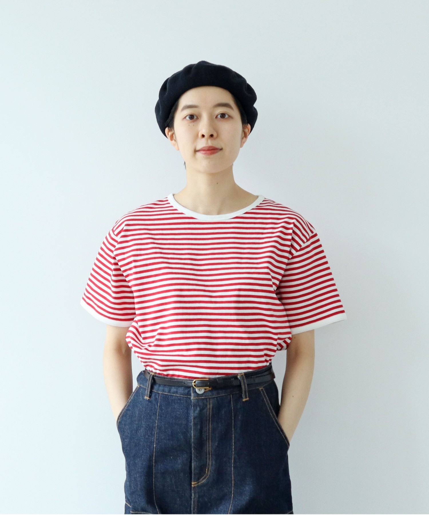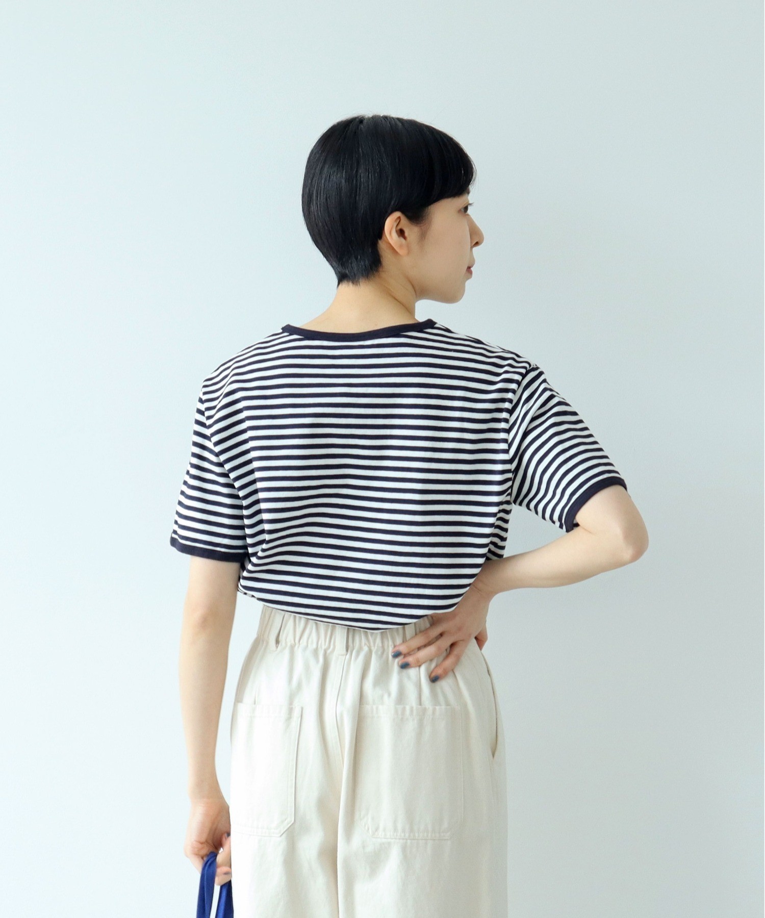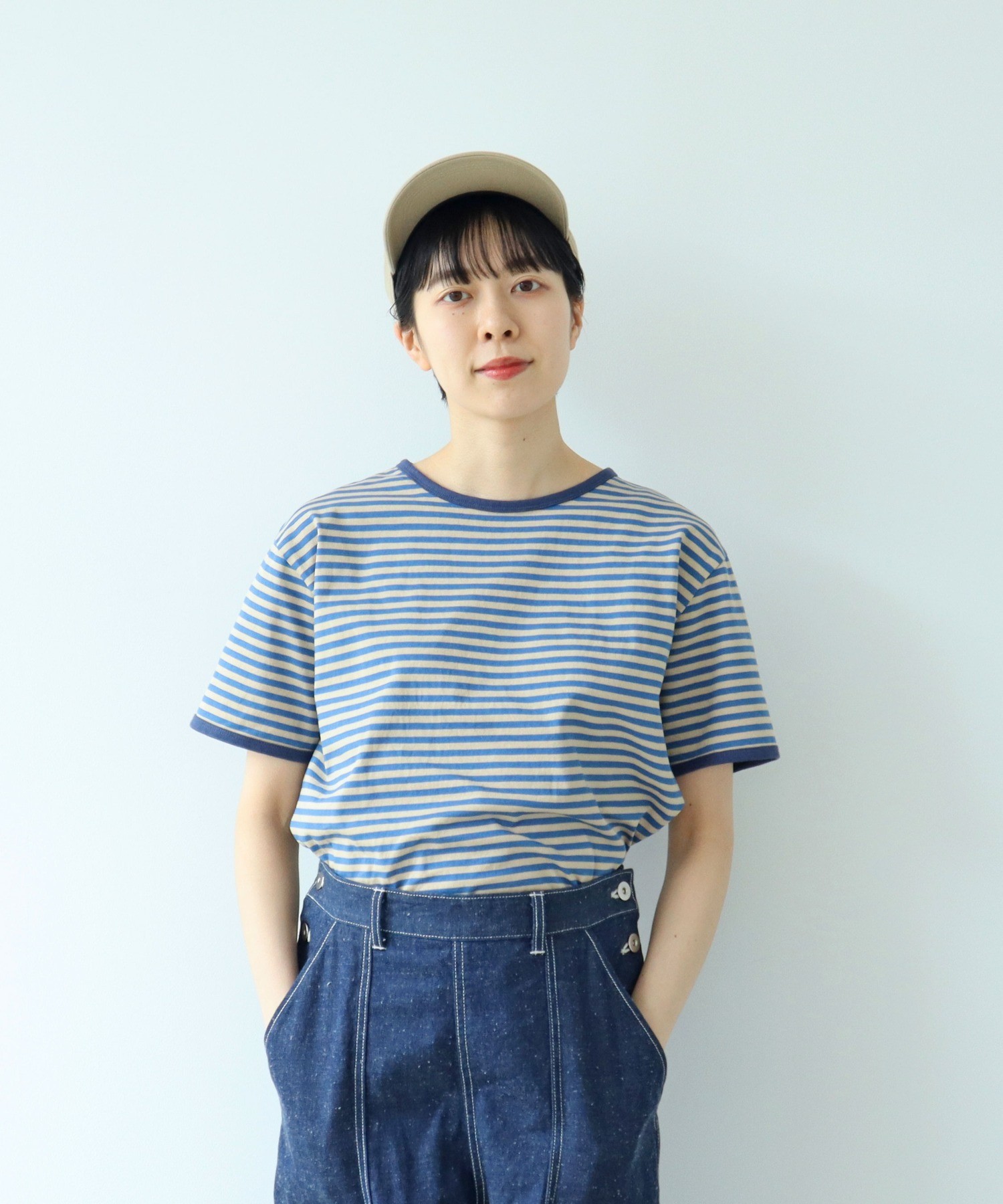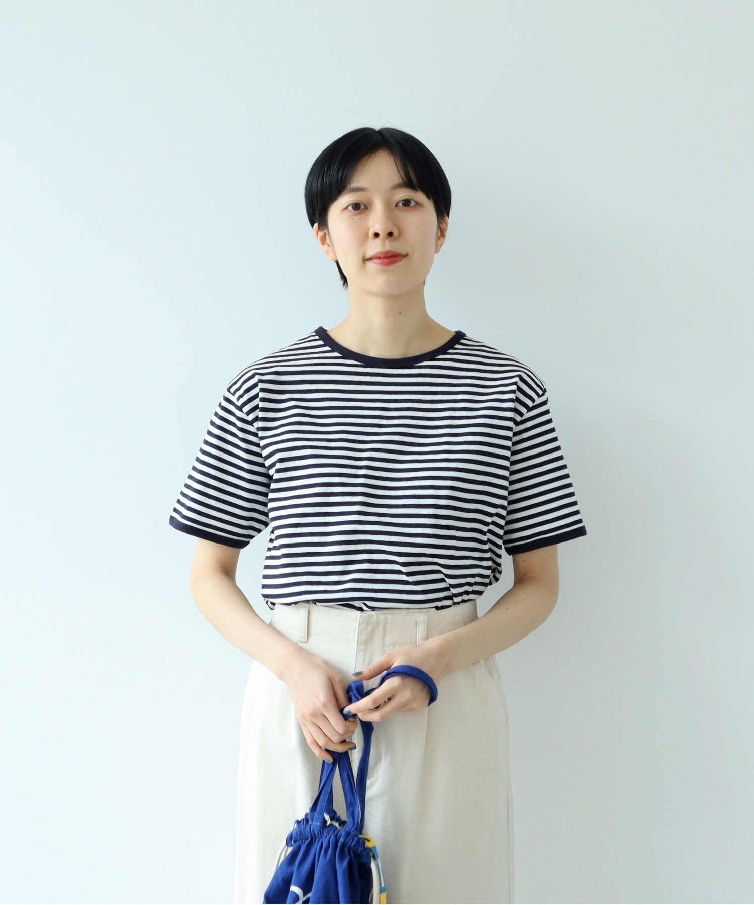 襟と袖口のバインダーがフレンチなイメージ。シャツやカーディガンとの重ね着もしやすいベーシックなシルエットの半袖ですが、一枚着として着やすいよう、袖や身幅の太さ、肩の落ち感などボディラインに沿わないややゆとりを持たせたサイズ感に仕上げました。こちらのシリーズはハリのあるやや硬めの生地感ながらも、どんなシーズンにも着やすい厚みが使いやすい。