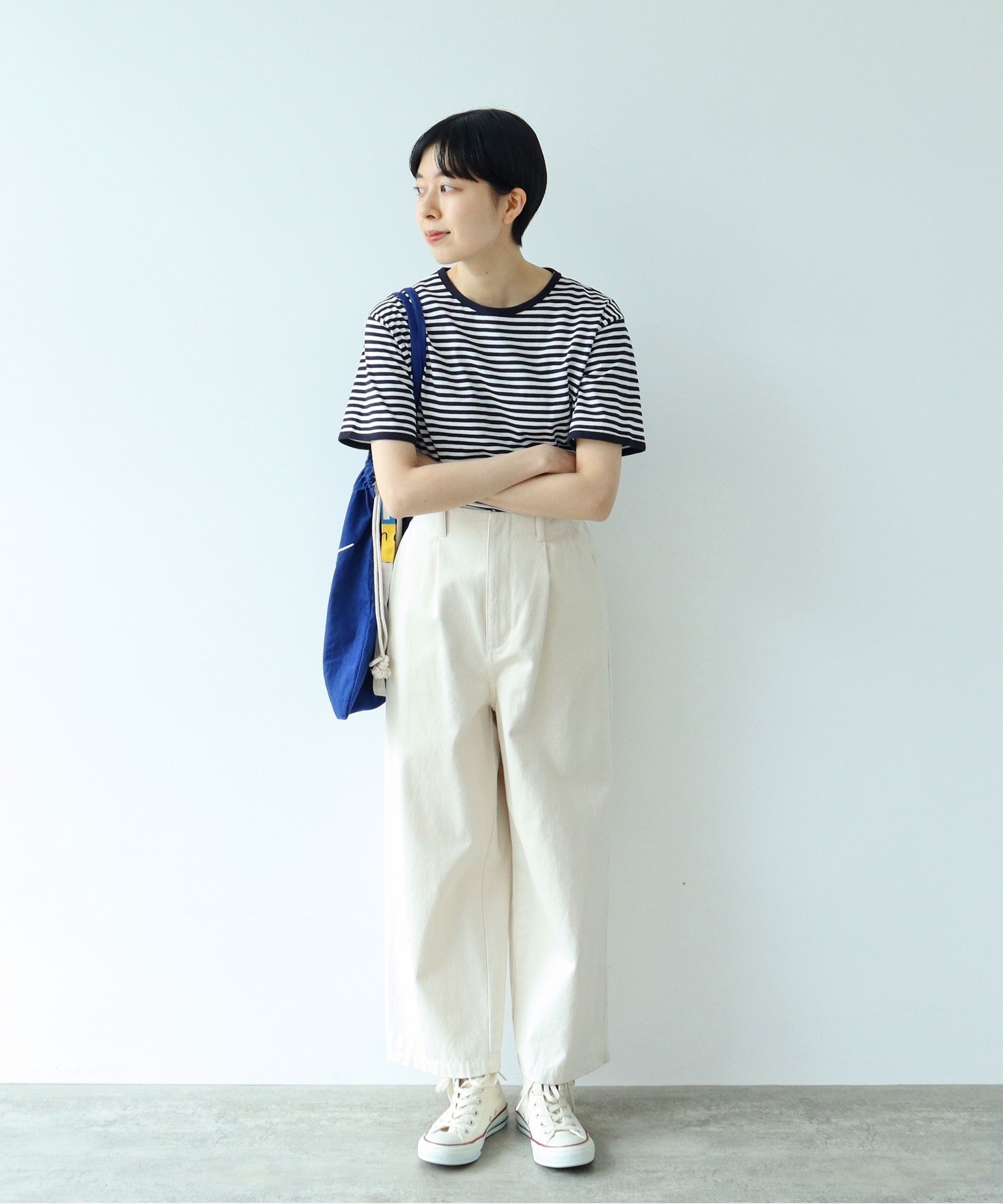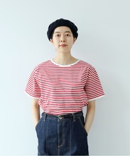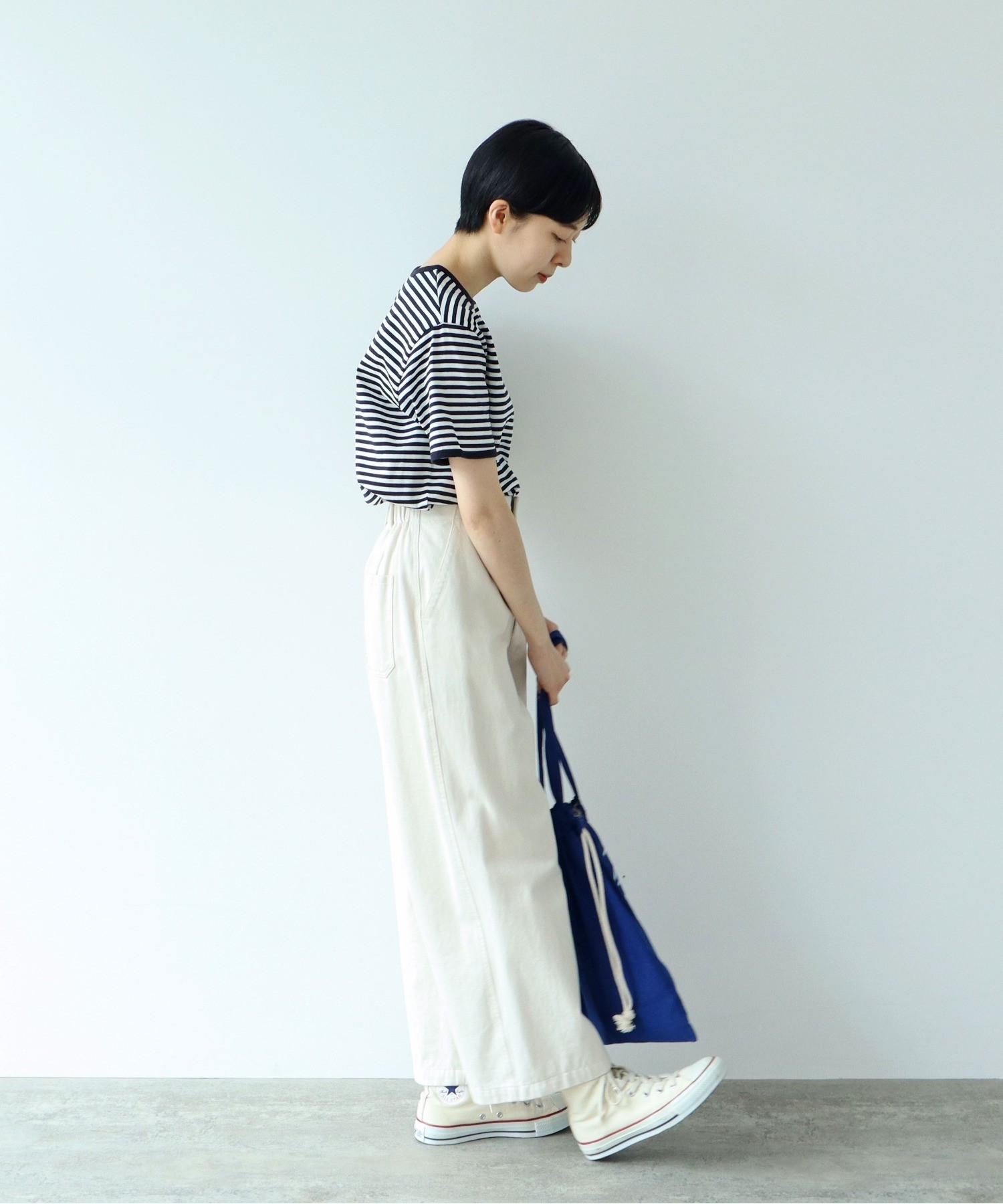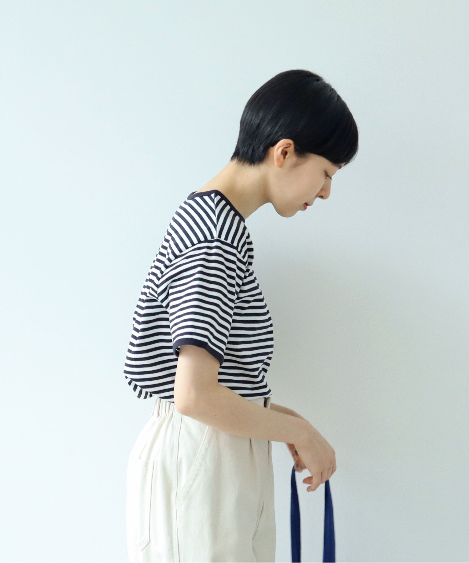 襟と袖口のバインダーがフレンチなイメージ。シャツやカーディガンとの重ね着もしやすいベーシックなシルエットの半袖ですが、一枚着として着やすいよう、袖や身幅の太さ、肩の落ち感などボディラインに沿わないややゆとりを持たせたサイズ感に仕上げました。こちらのシリーズはハリのあるやや硬めの生地感ながらも、どんなシーズンにも着やすい厚みが使いやすい。