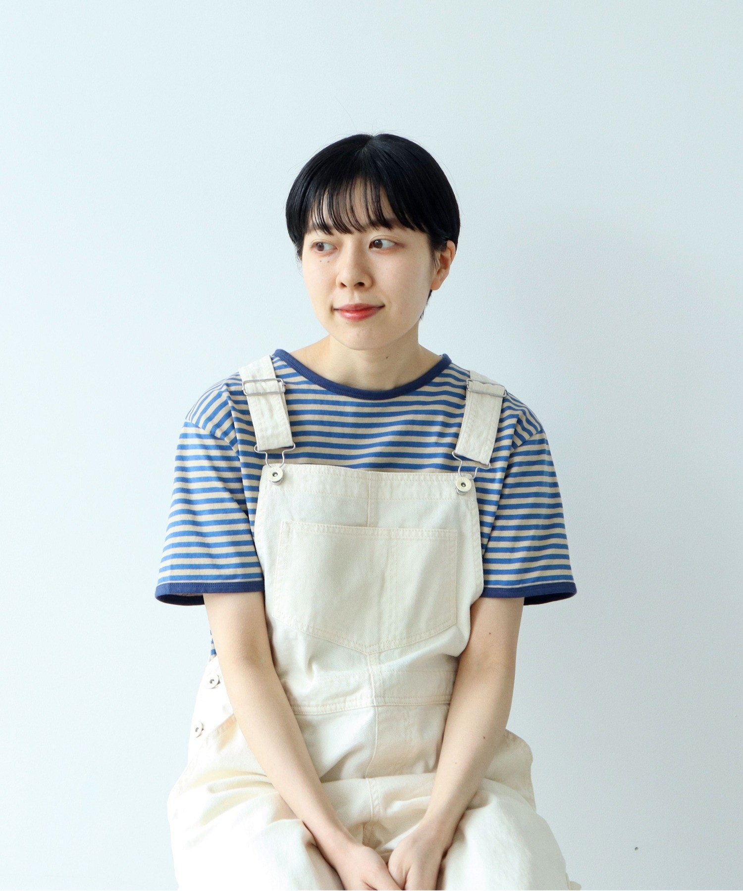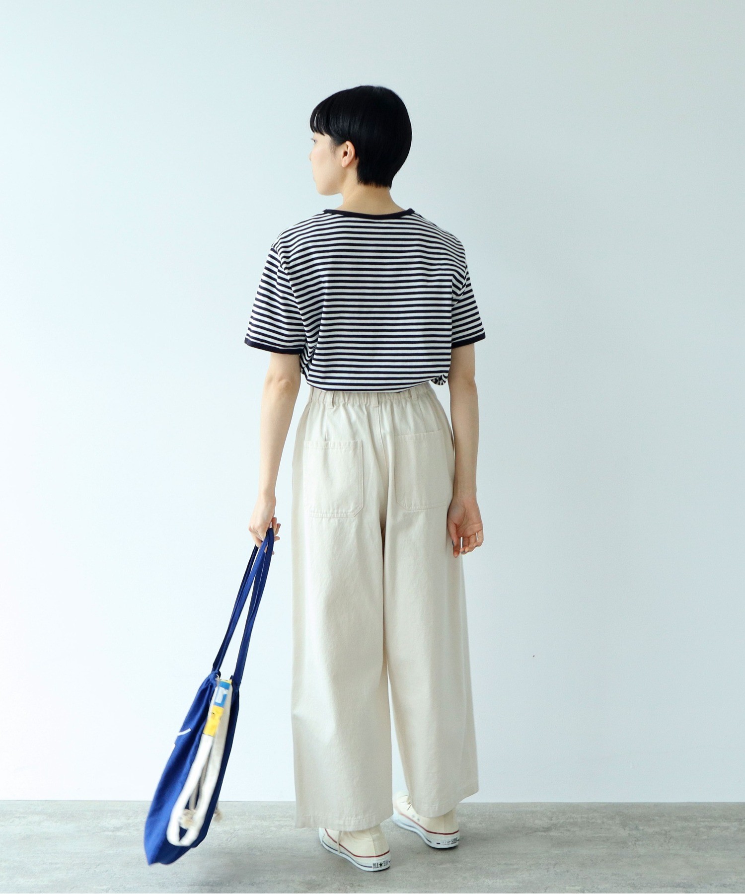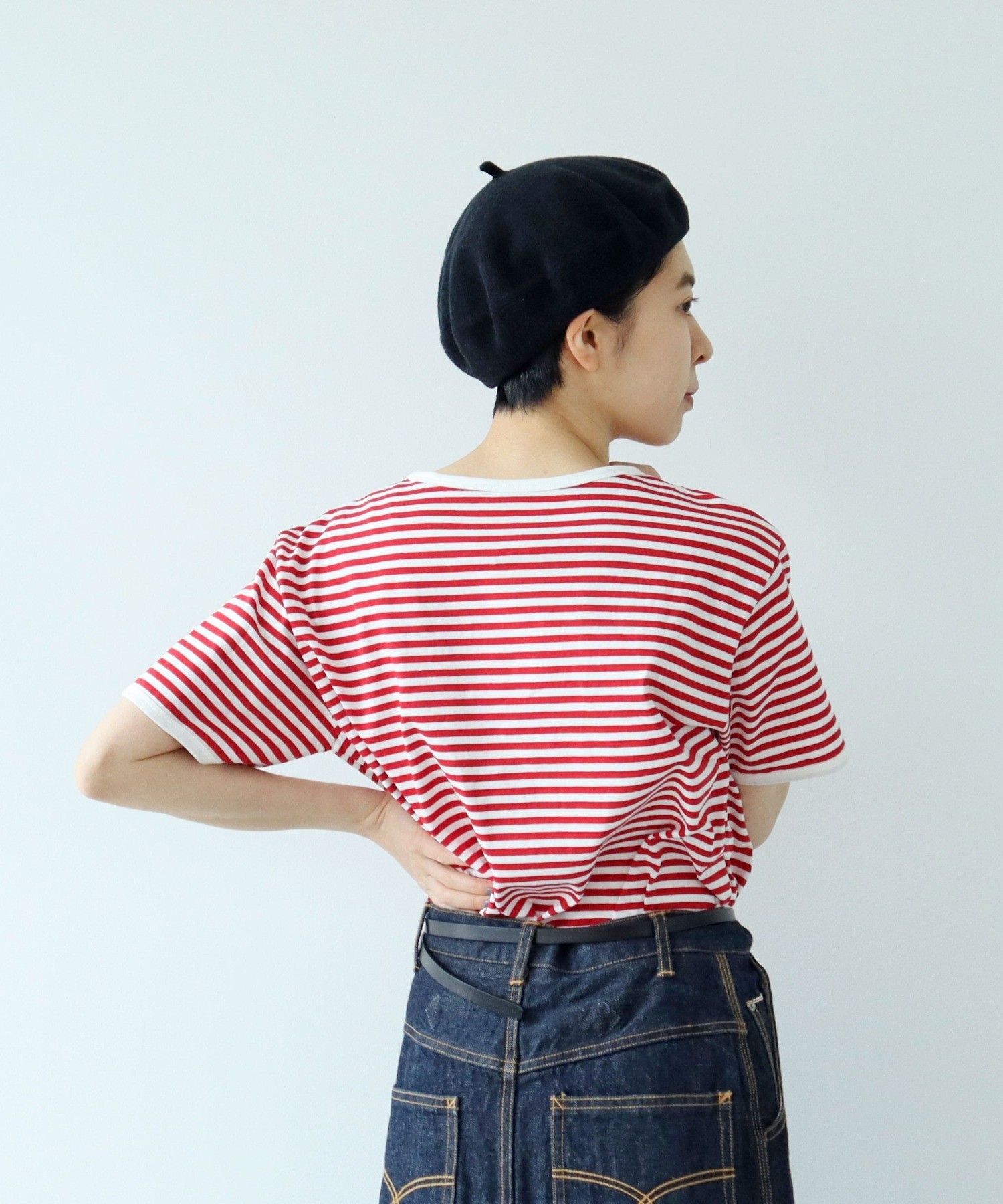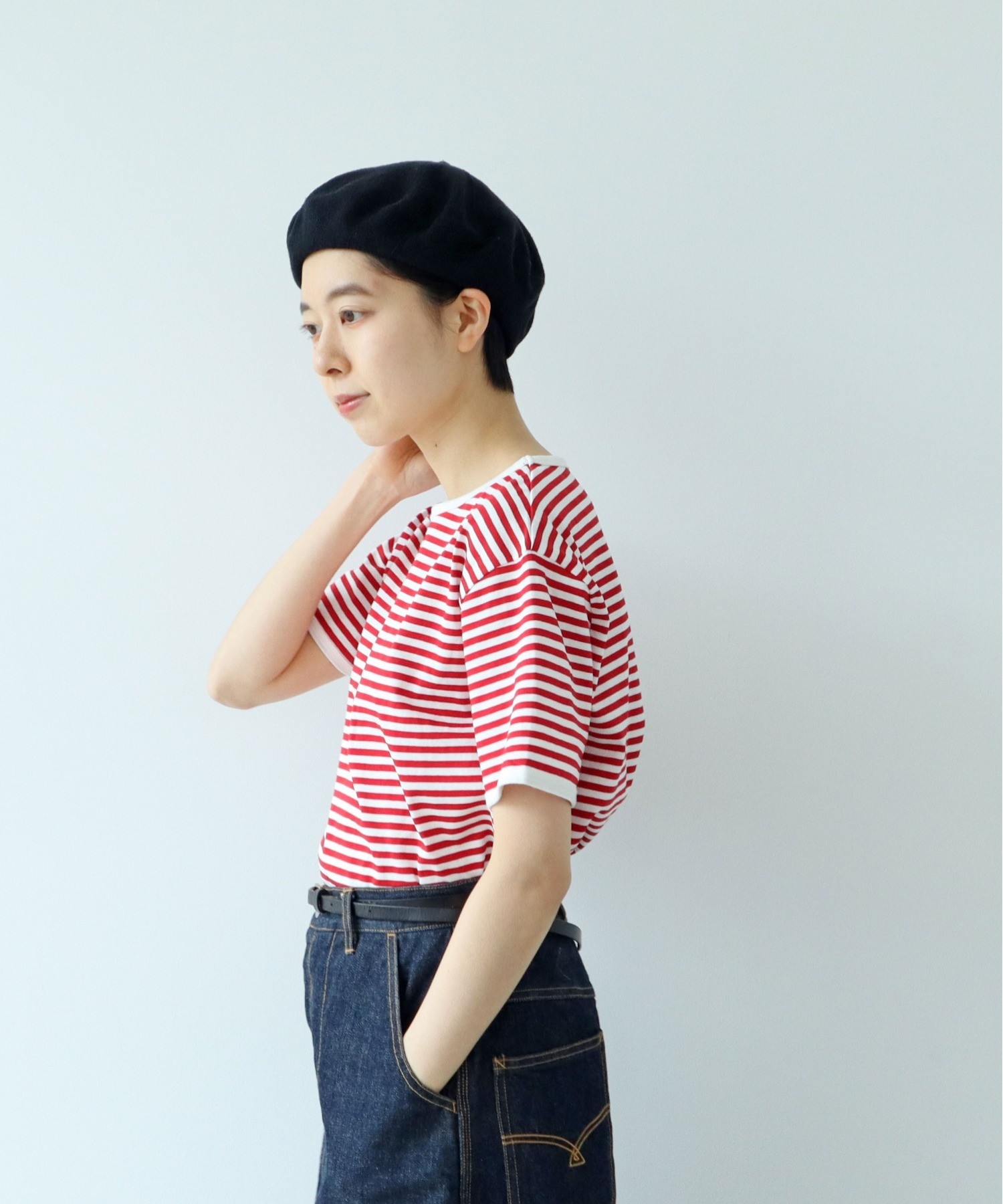 襟と袖口のバインダーがフレンチなイメージ。シャツやカーディガンとの重ね着もしやすいベーシックなシルエットの半袖ですが、一枚着として着やすいよう、袖や身幅の太さ、肩の落ち感などボディラインに沿わないややゆとりを持たせたサイズ感に仕上げました。こちらのシリーズはハリのあるやや硬めの生地感ながらも、どんなシーズンにも着やすい厚みが使いやすい。