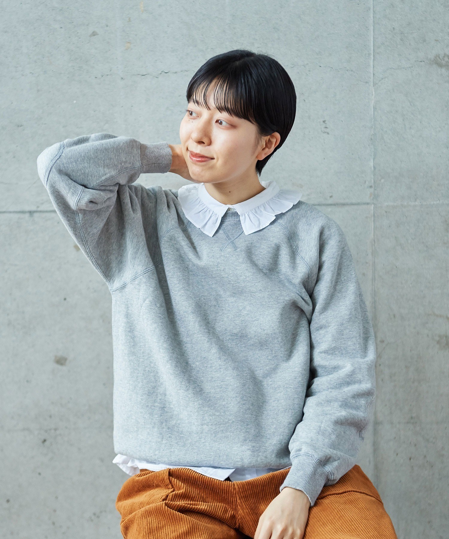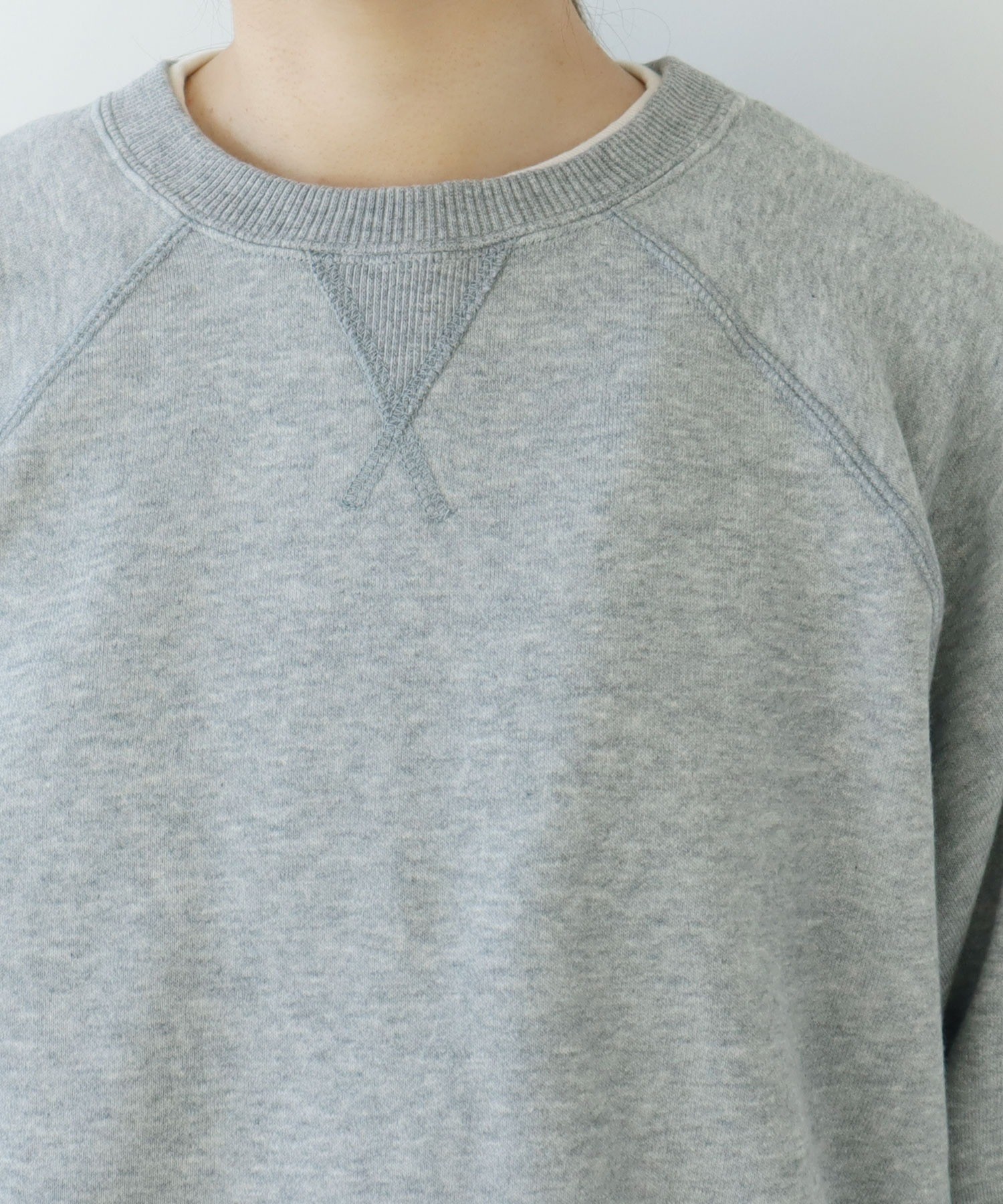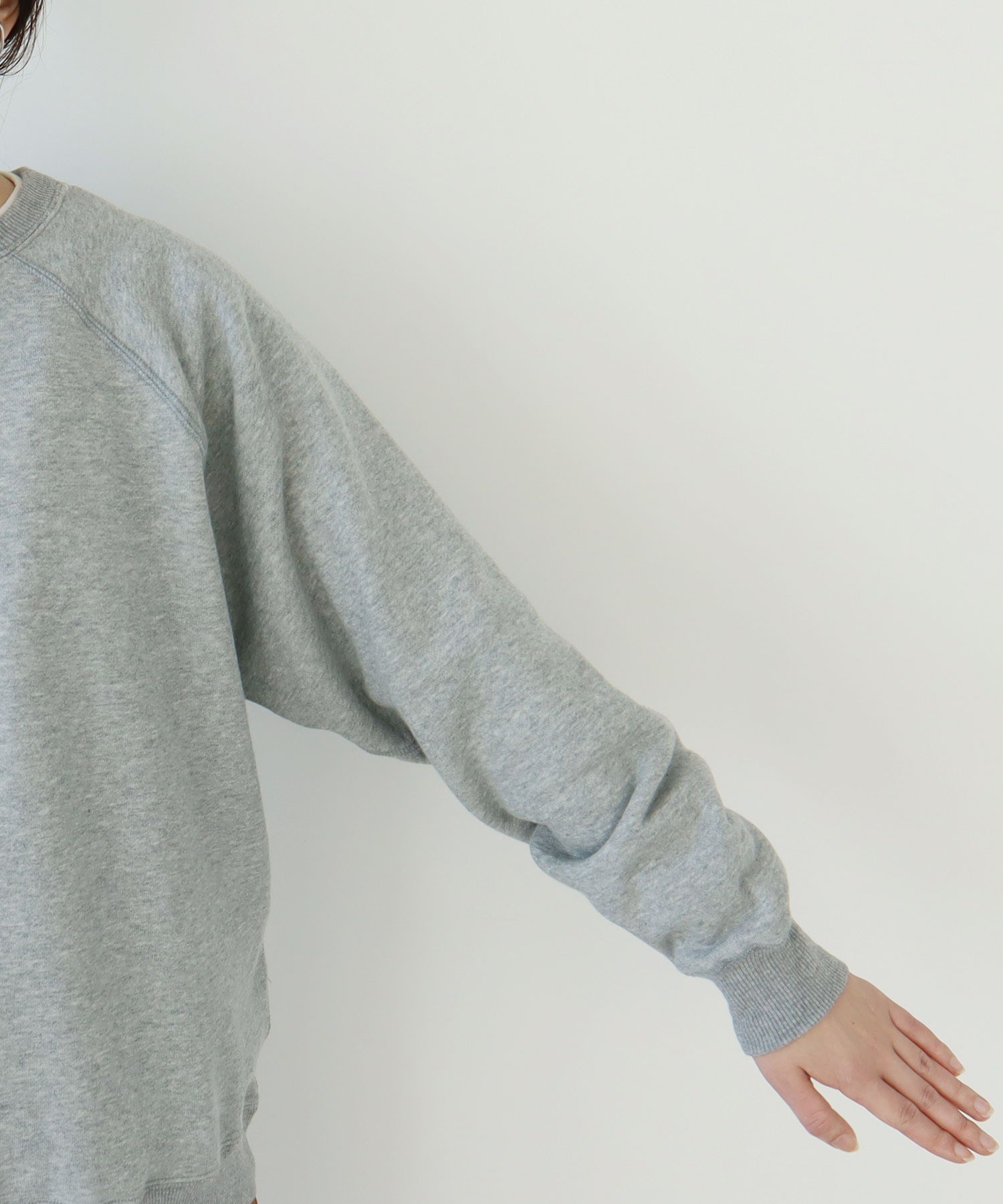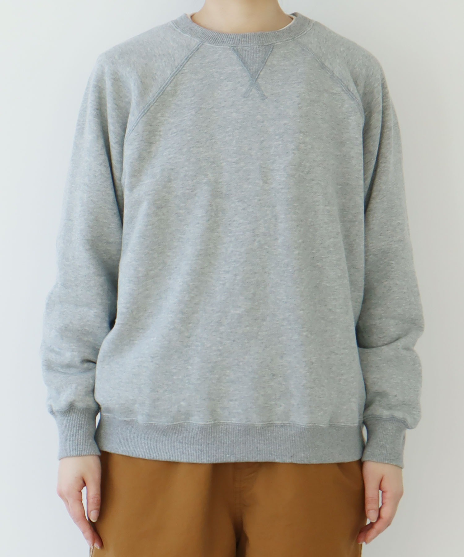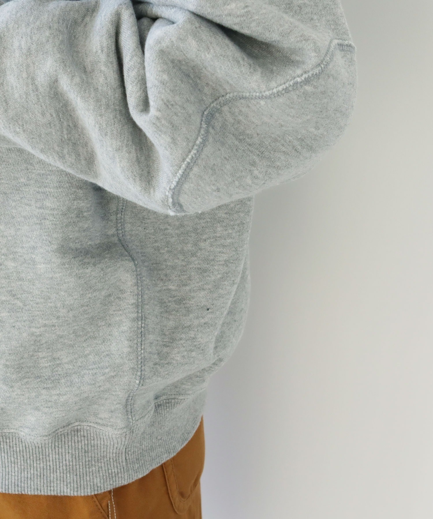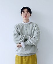 リサイクルコットンは生産工程で出る生地の裁断くずから作られた糸を使用しています。ある程度肉厚なスウェットは、目が詰まってガシッとした質感のものが多いですが、こちらはしっかりと着映えする厚みがありながらもソフトで着心地の良い柔らかさが特徴です。デイリーに着るアイテムには欠かせない、肌触りがよく気分の上がる生地感を目指しました。グレーは抜け感のある霜降り調です。