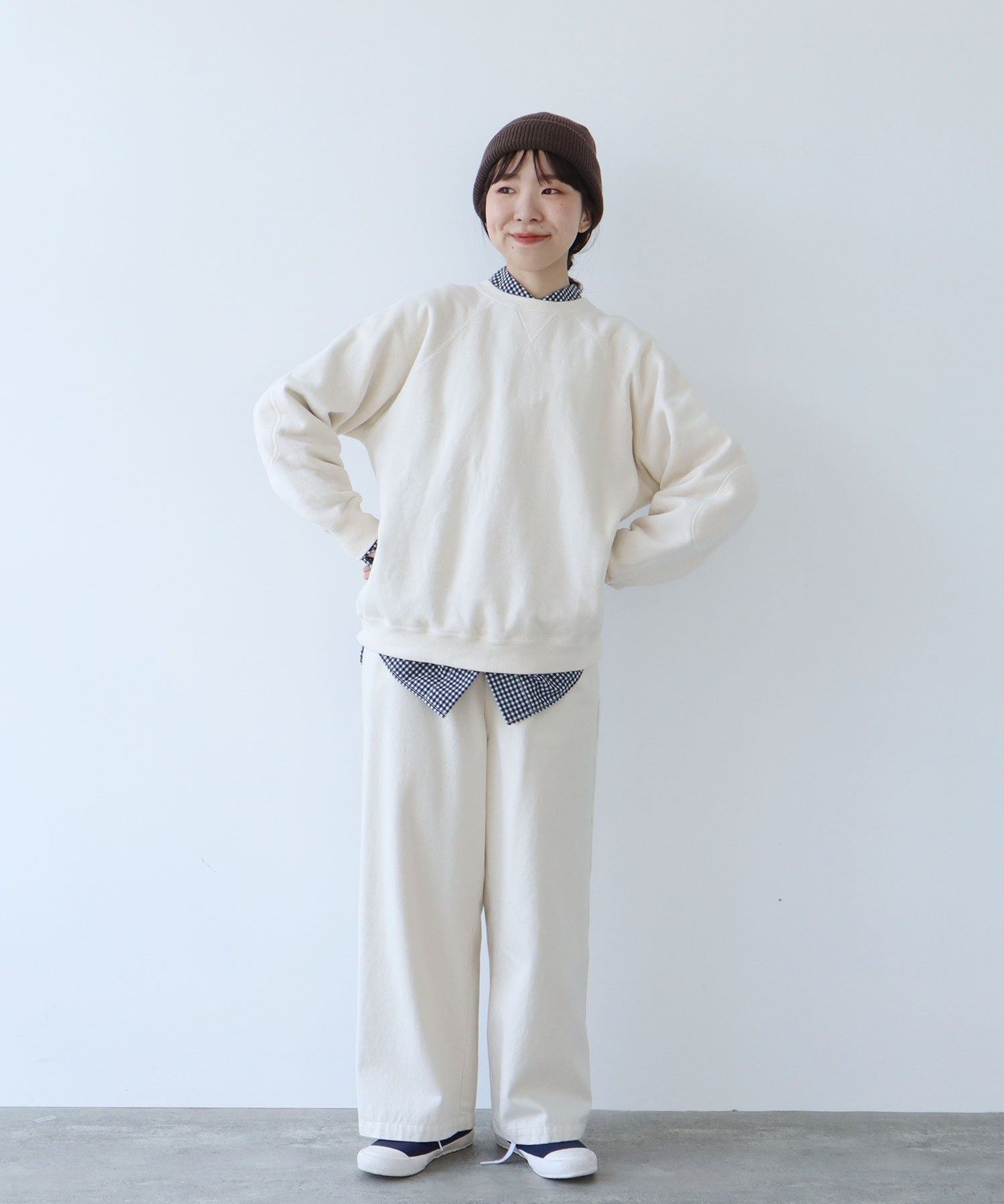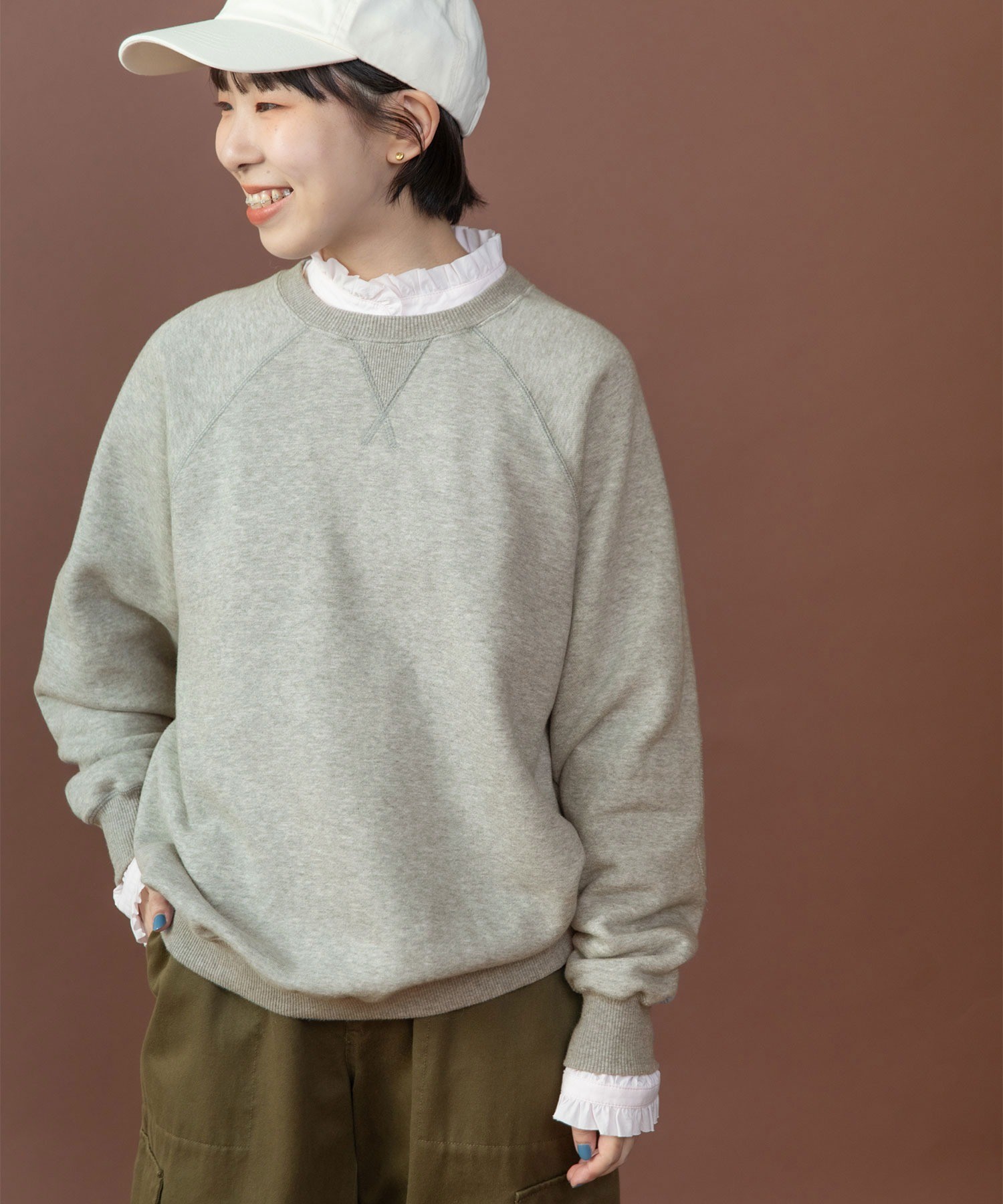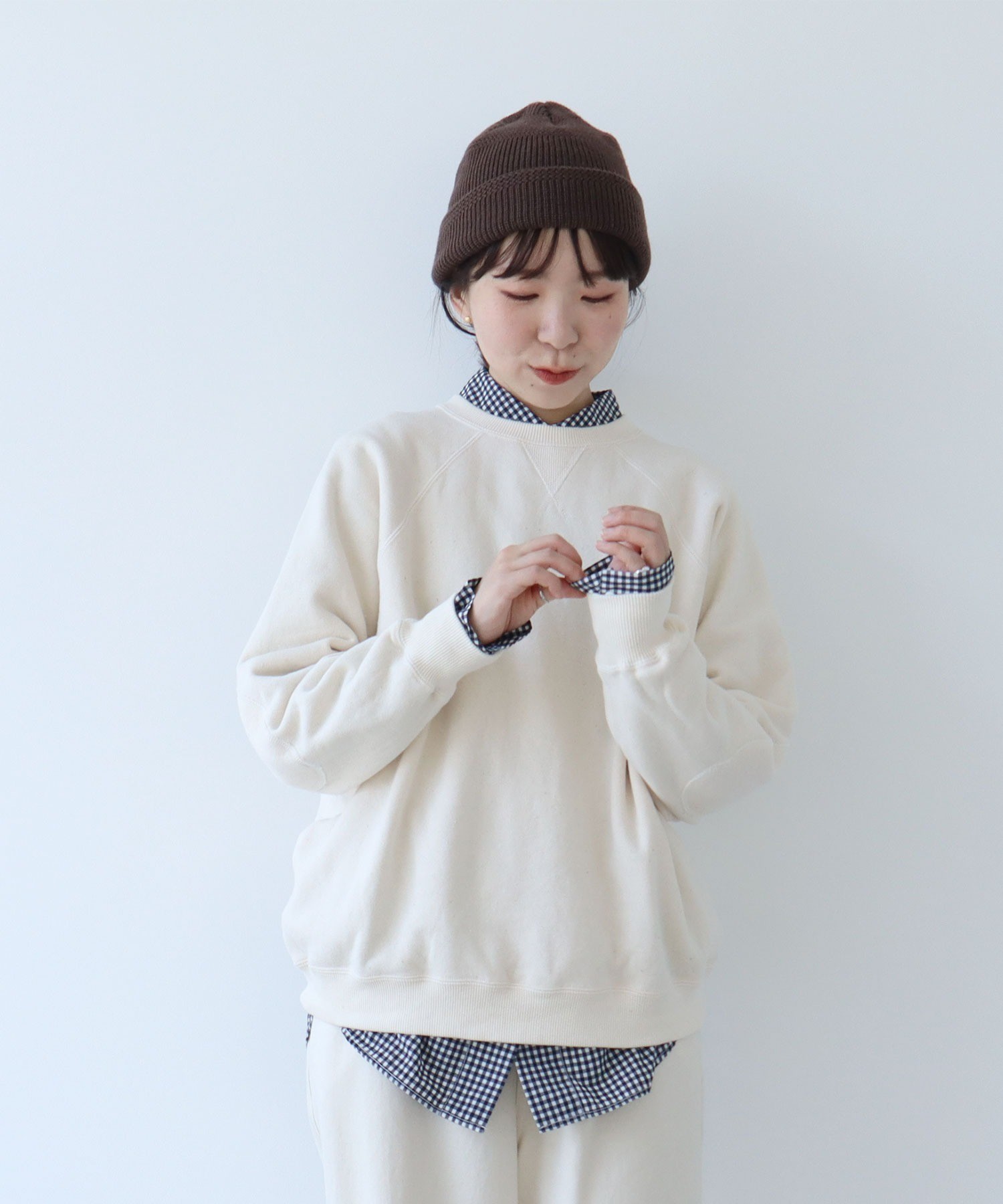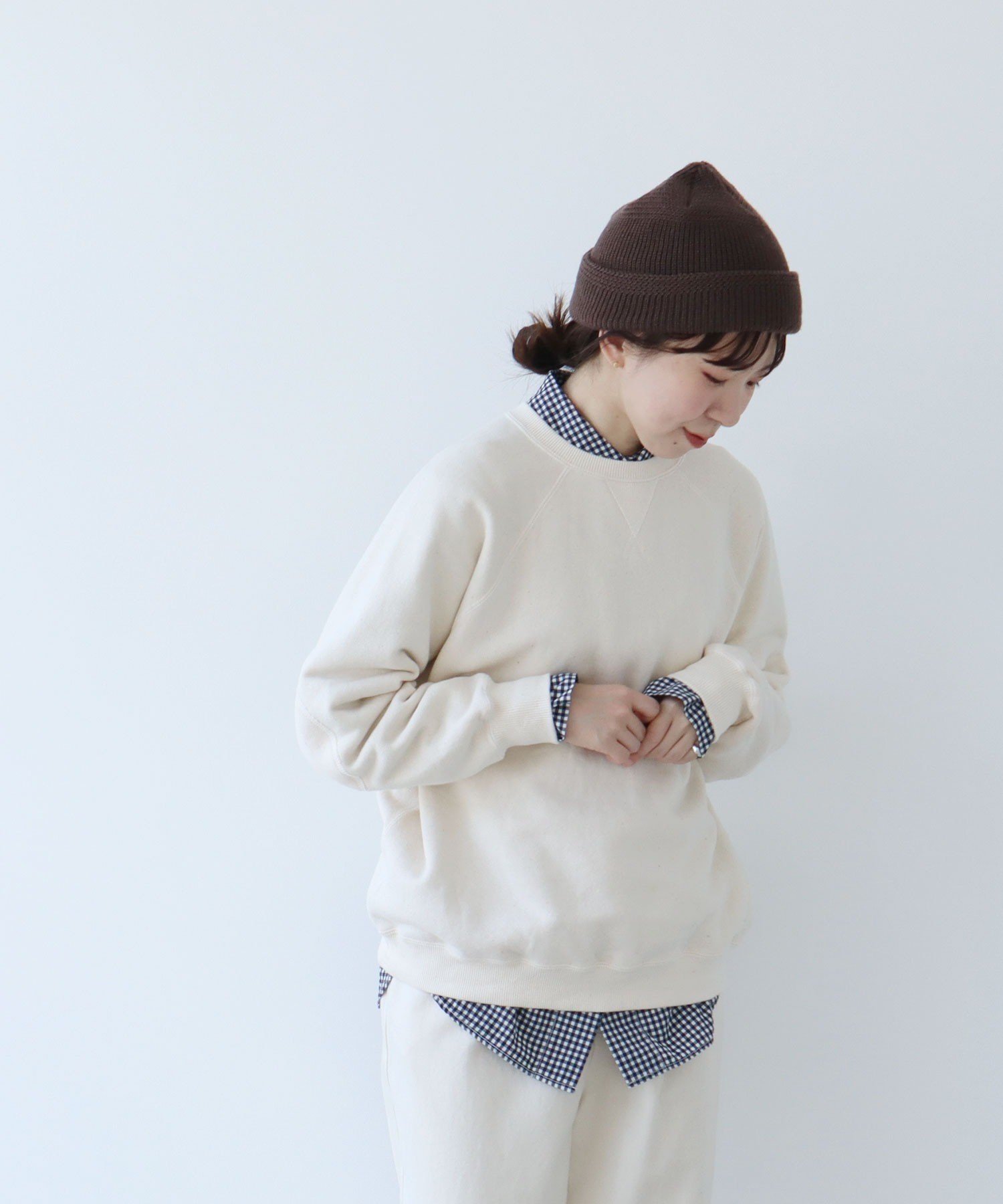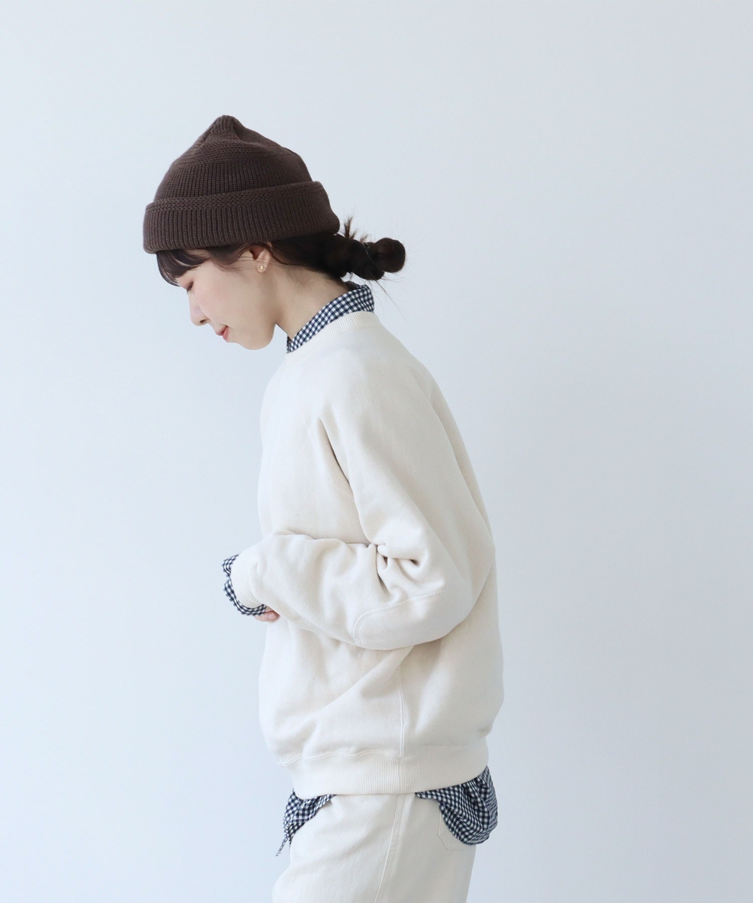 リサイクルコットンは生産工程で出る生地の裁断くずから作られた糸を使用しています。ある程度肉厚なスウェットは、目が詰まってガシッとした質感のものが多いですが、こちらはしっかりと着映えする厚みがありながらもソフトで着心地の良い柔らかさが特徴です。デイリーに着るアイテムには欠かせない、肌触りがよく気分の上がる生地感を目指しました。グレーは抜け感のある霜降り調です。
