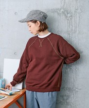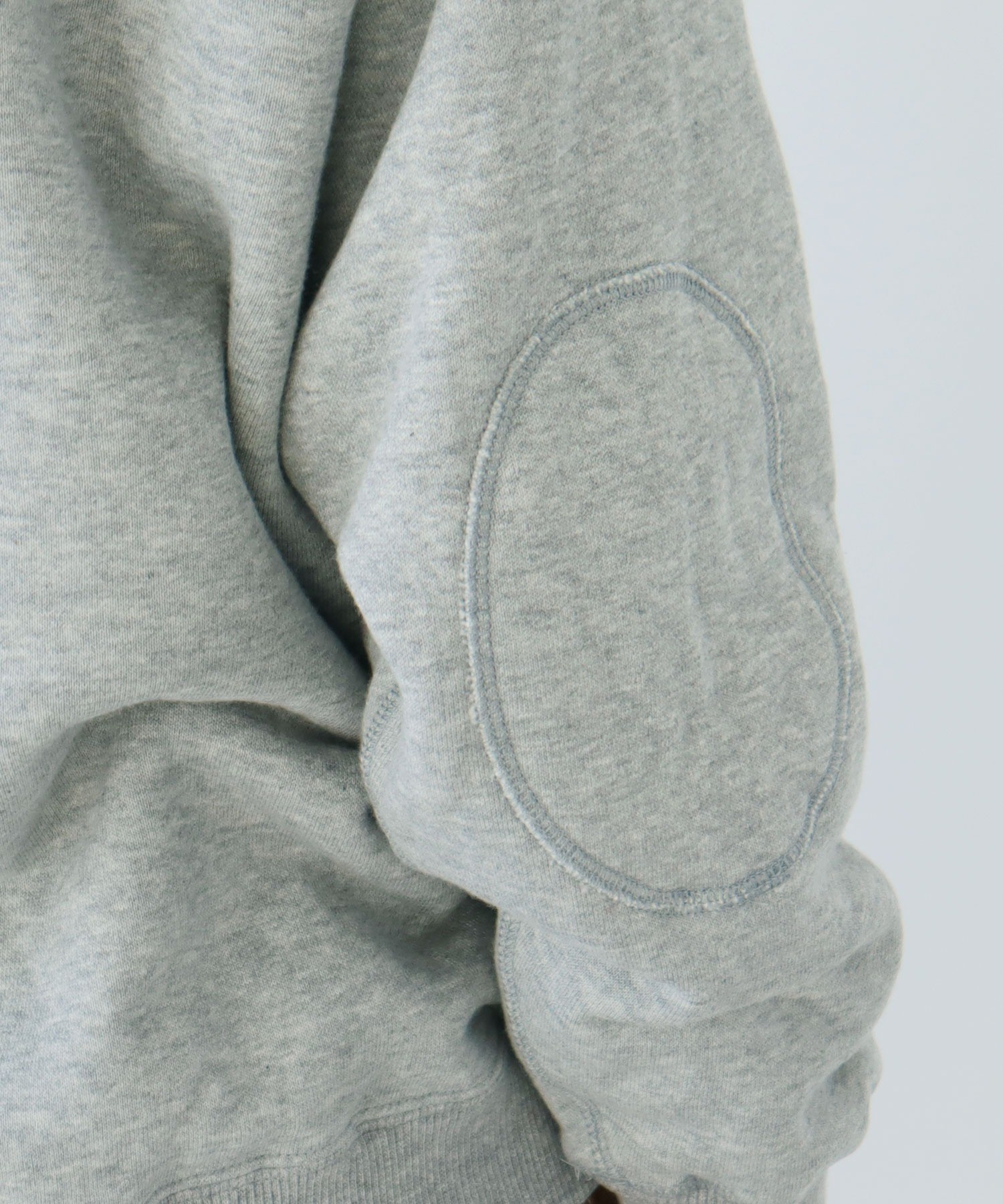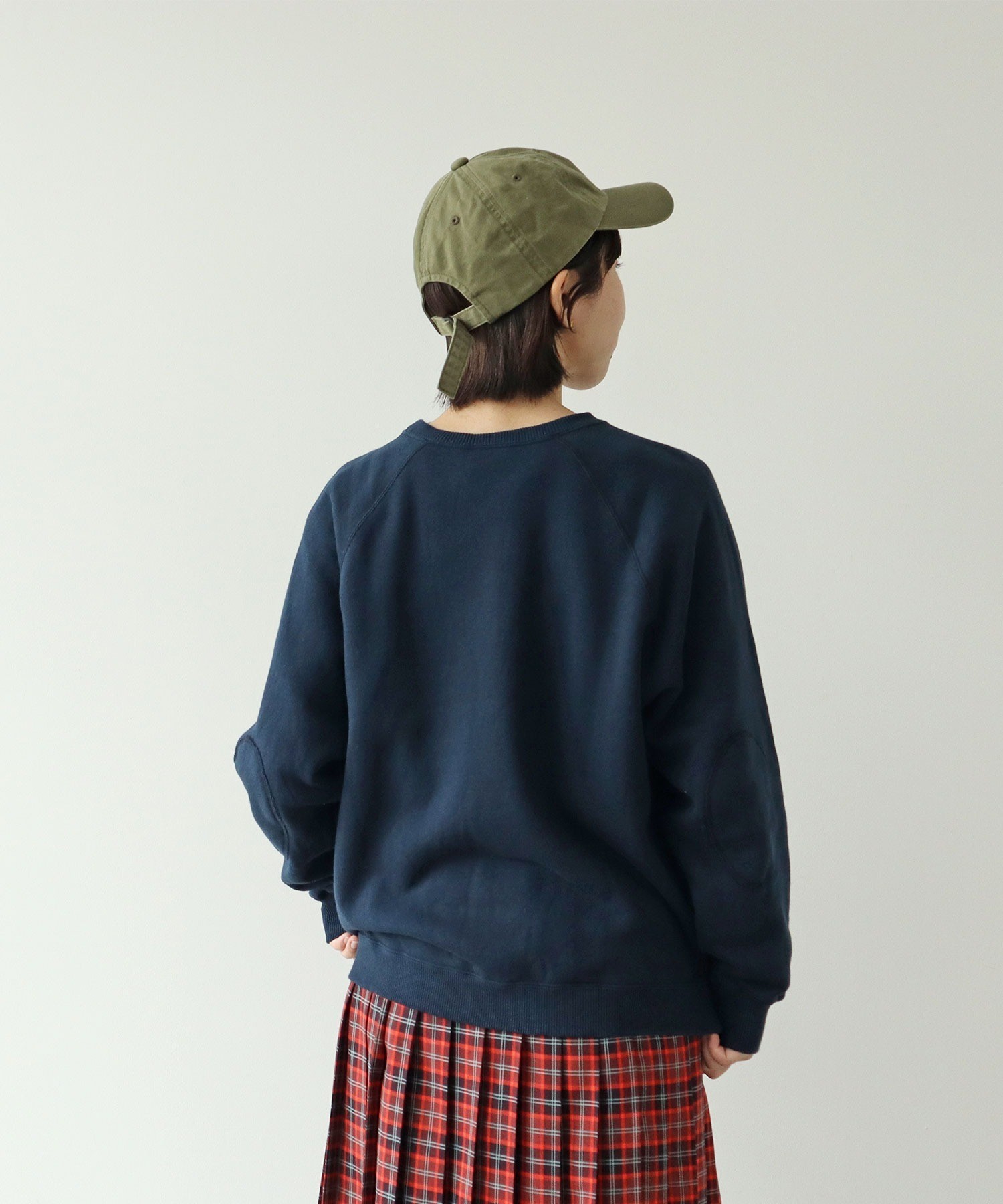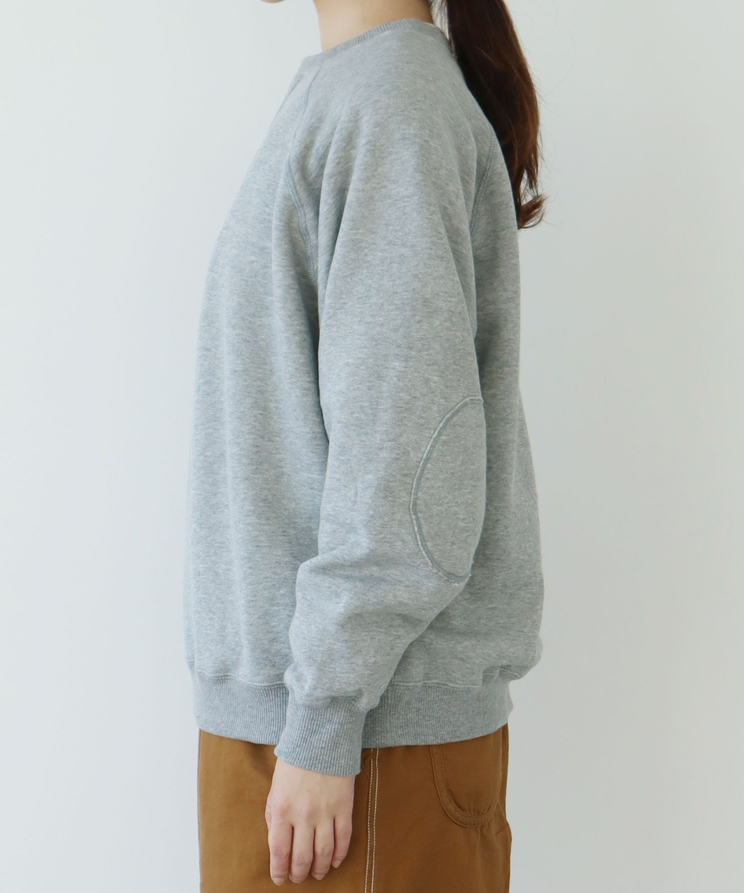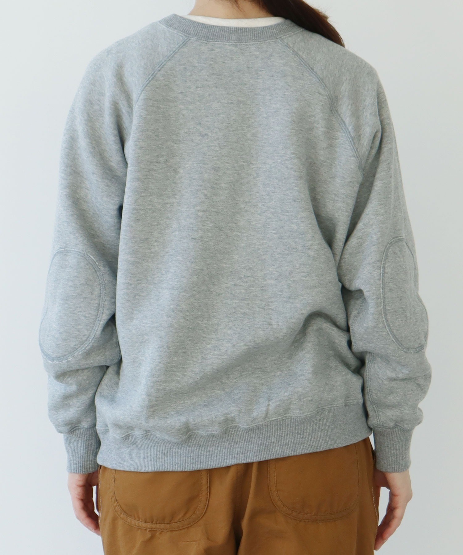 シャツやカットソーとの重ね着にも使いやすい絶妙な襟元の詰まり具合。やや着古したような生地と、スポーティーなアイテムの中にもクラシックさを感じるエルボーパッチが古着屋さんで見つけたような雰囲気。デニムジャケットやカバーオールのインナーに差し色として重ねたり、中にシャツを入れて小物はローファーをチョイスしたりとトラッドな合わせもおすすめです。