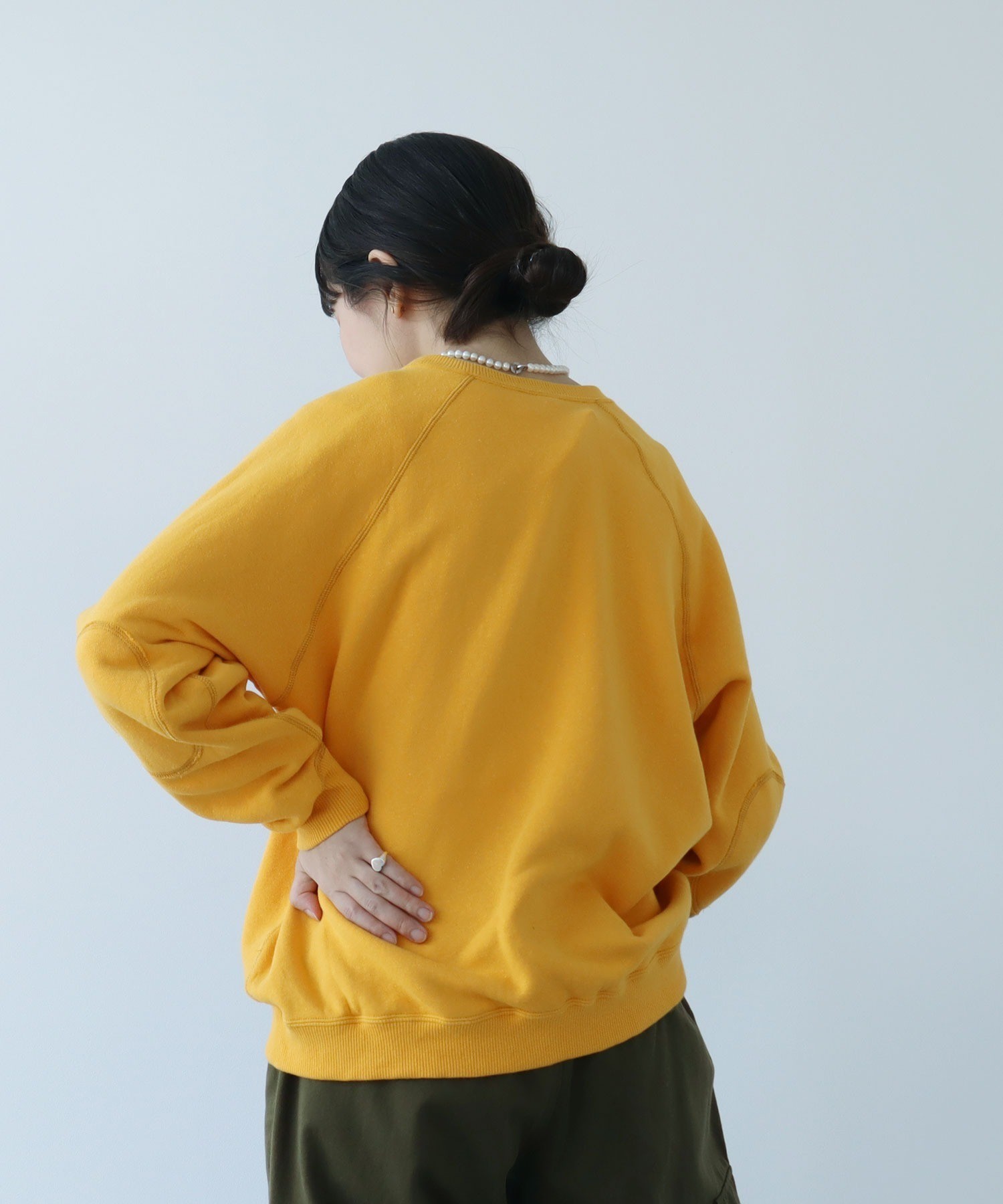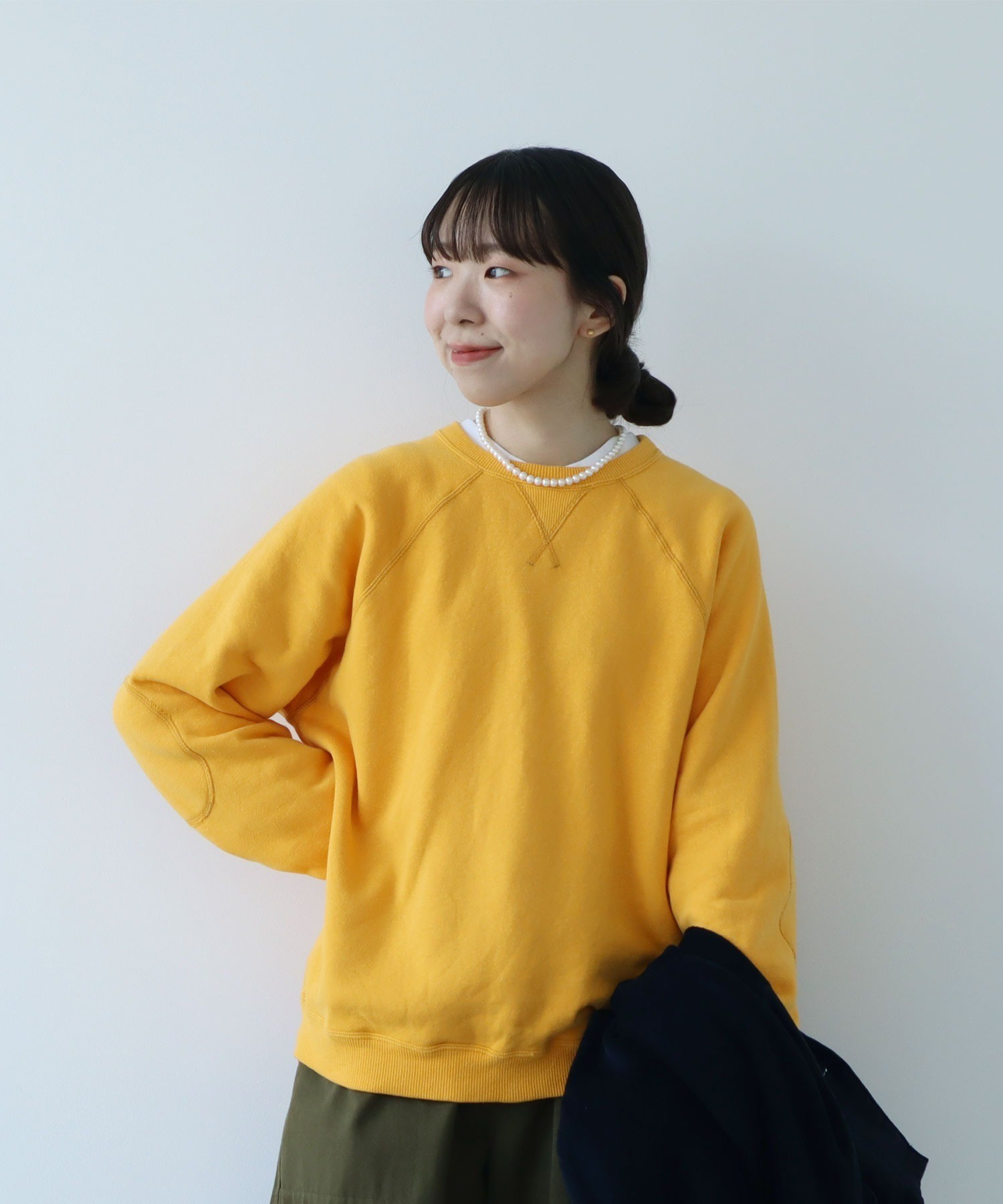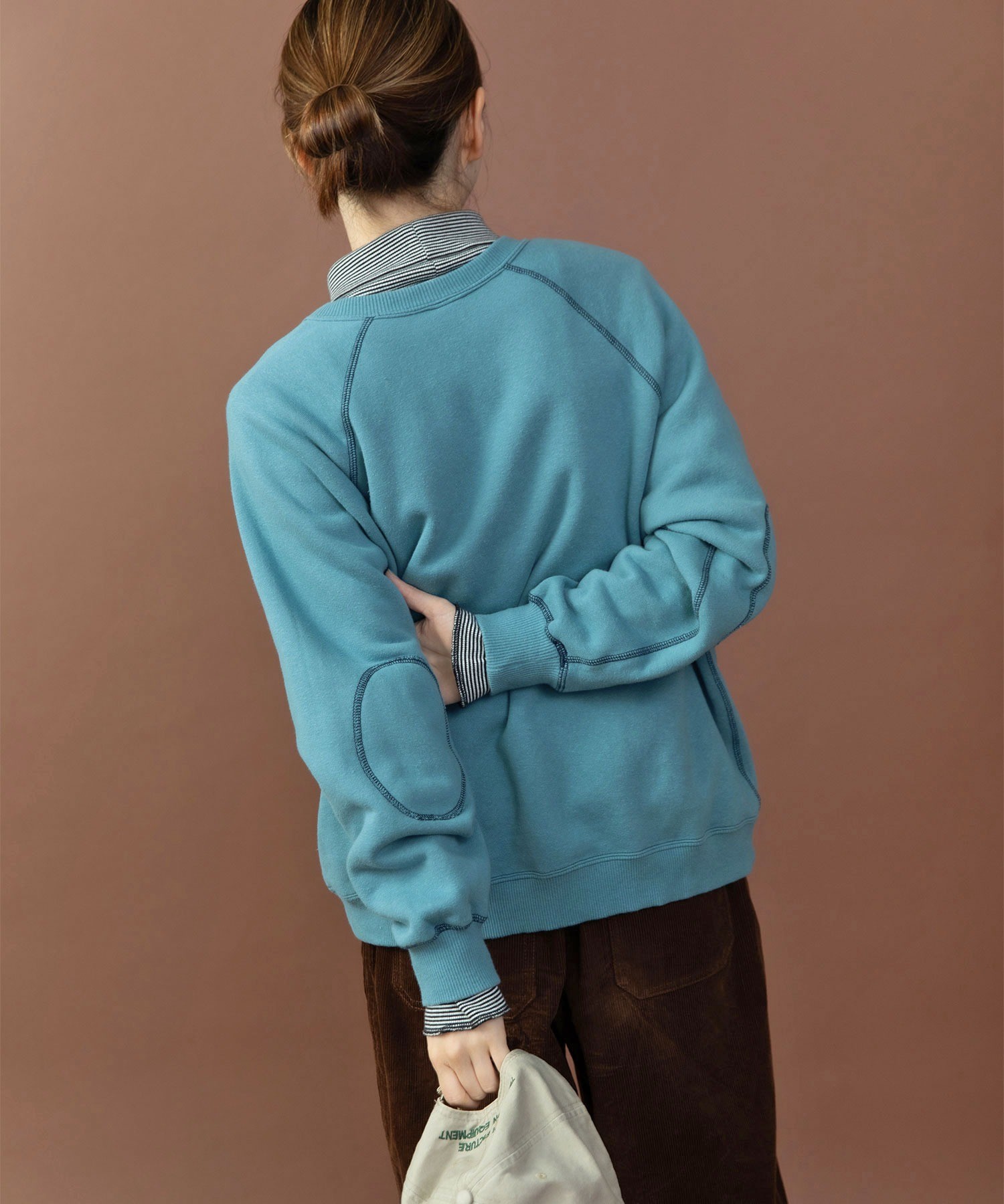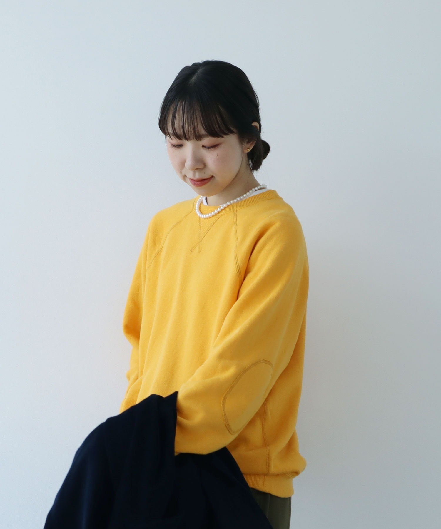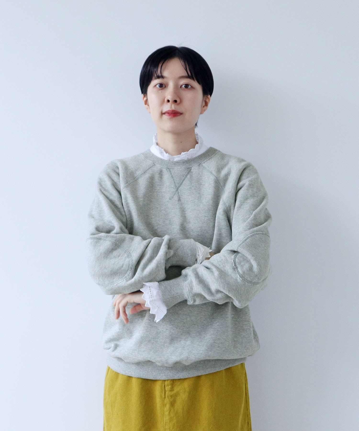 シャツやカットソーとの重ね着にも使いやすい絶妙な襟元の詰まり具合。やや着古したような生地と、スポーティーなアイテムの中にもクラシックさを感じるエルボーパッチが古着屋さんで見つけたような雰囲気。デニムジャケットやカバーオールのインナーに差し色として重ねたり、中にシャツを入れて小物はローファーをチョイスしたりとトラッドな合わせもおすすめです。