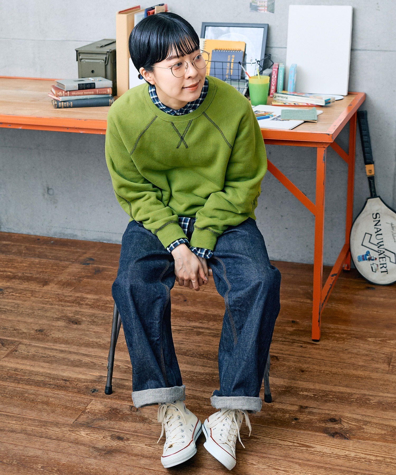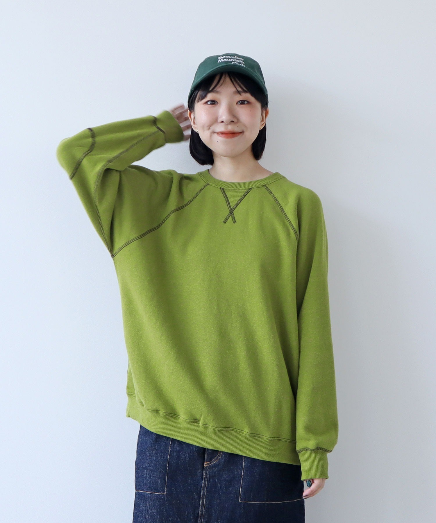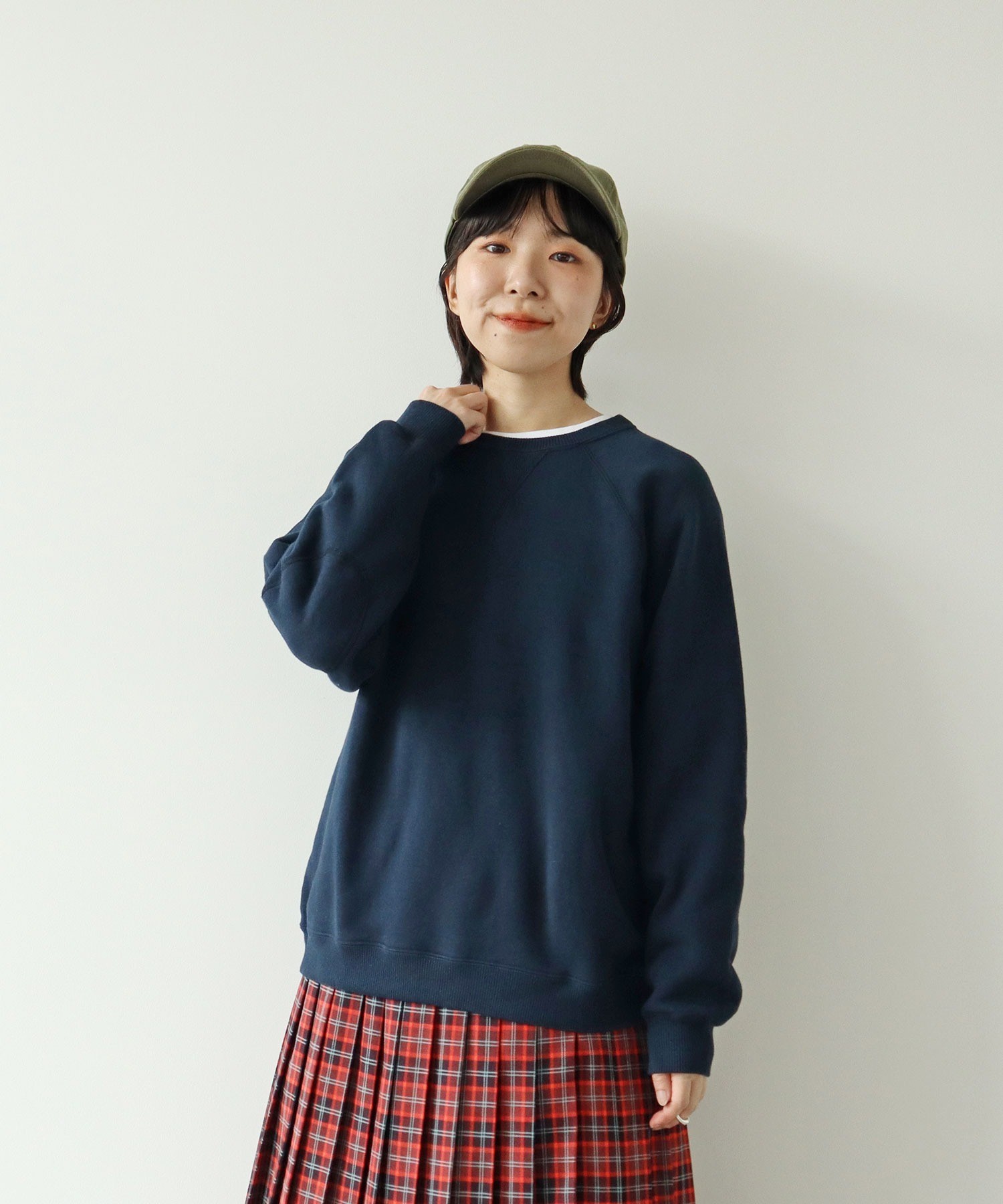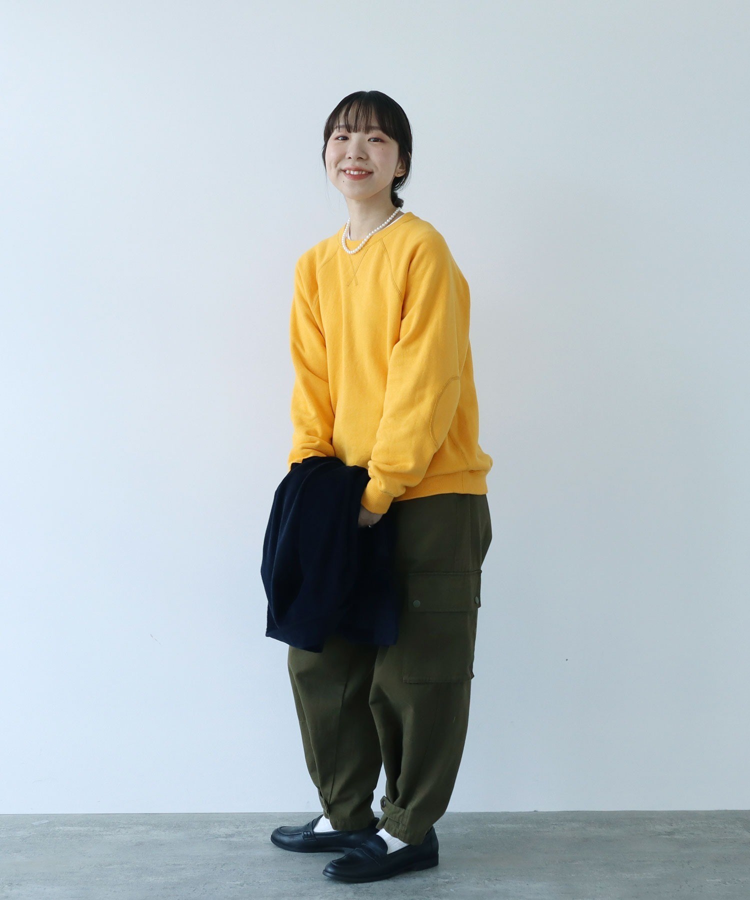 シャツやカットソーとの重ね着にも使いやすい絶妙な襟元の詰まり具合。やや着古したような生地と、スポーティーなアイテムの中にもクラシックさを感じるエルボーパッチが古着屋さんで見つけたような雰囲気。デニムジャケットやカバーオールのインナーに差し色として重ねたり、中にシャツを入れて小物はローファーをチョイスしたりとトラッドな合わせもおすすめです。