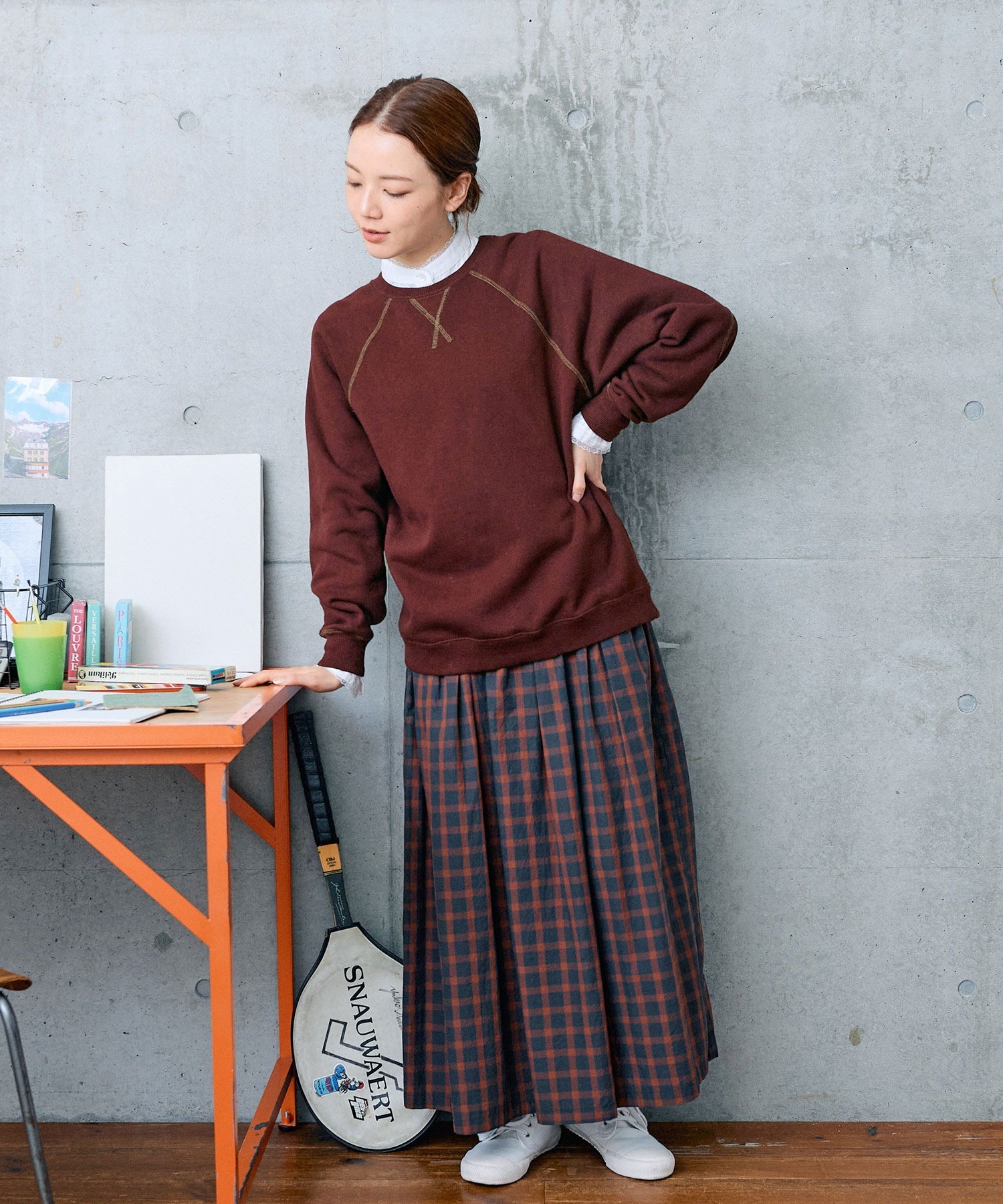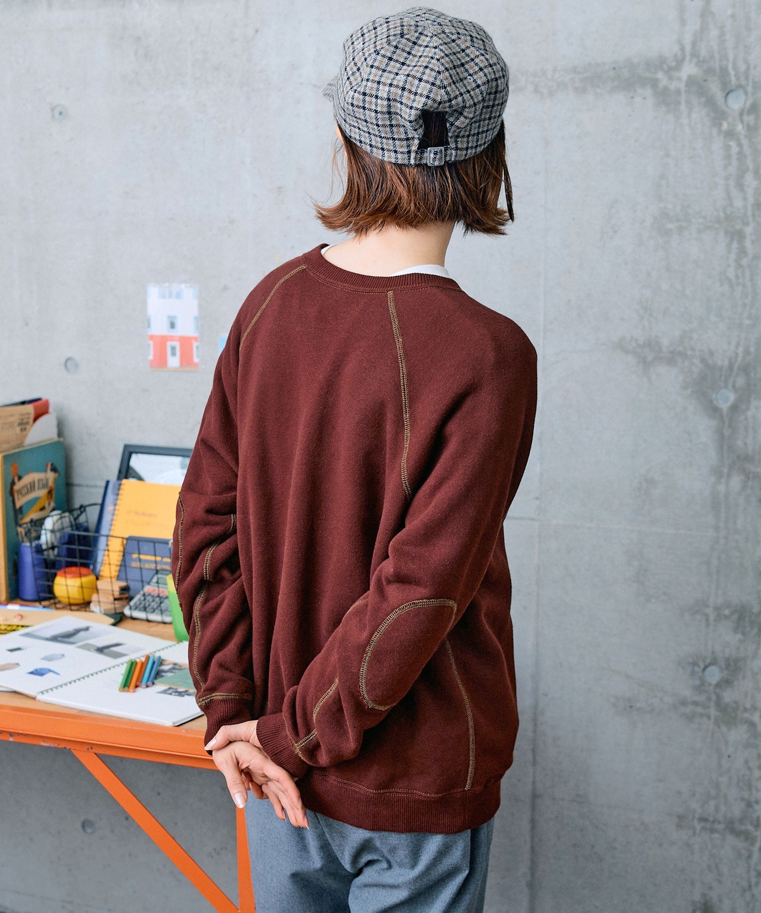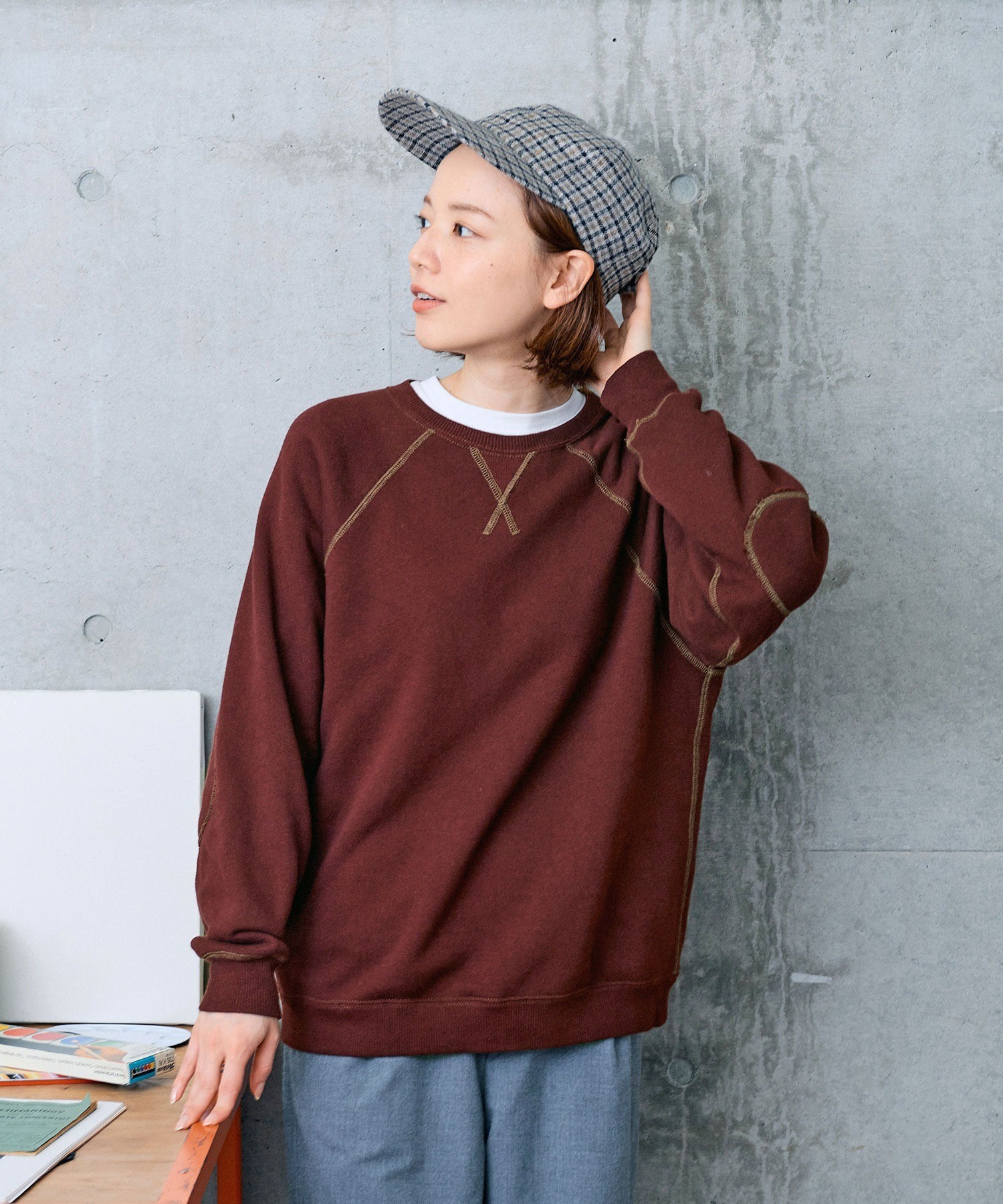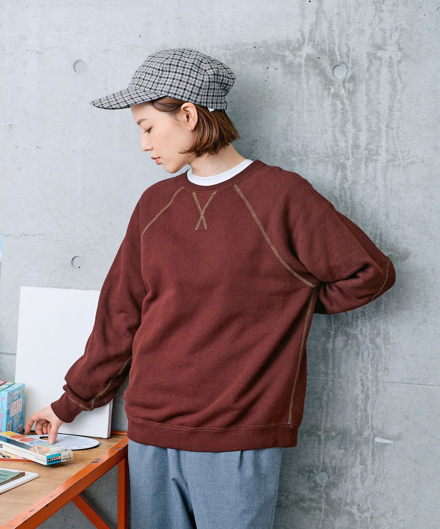 ※コンクリート背景のボルドーとグリーンの画像はサンプルを着用しています。