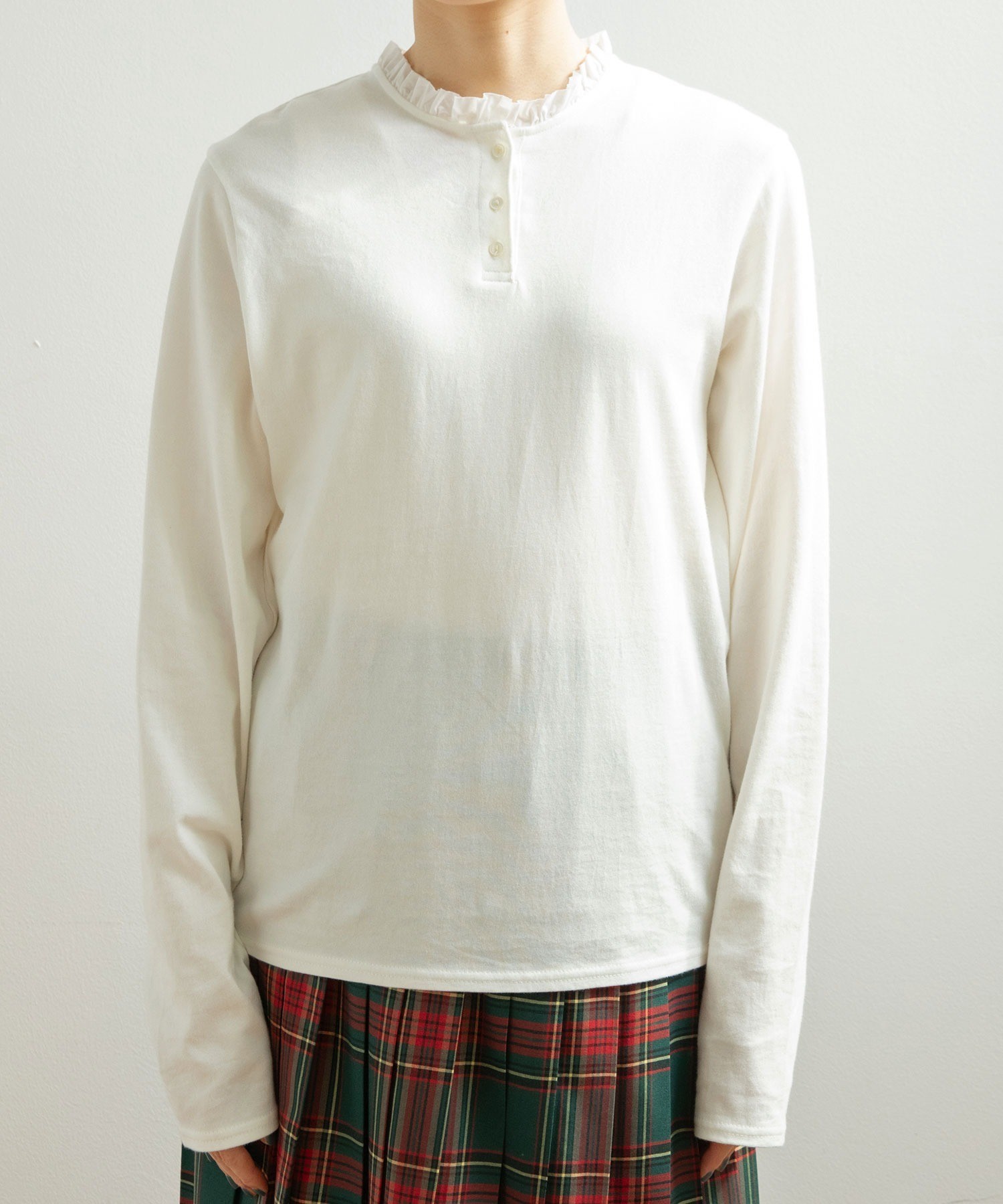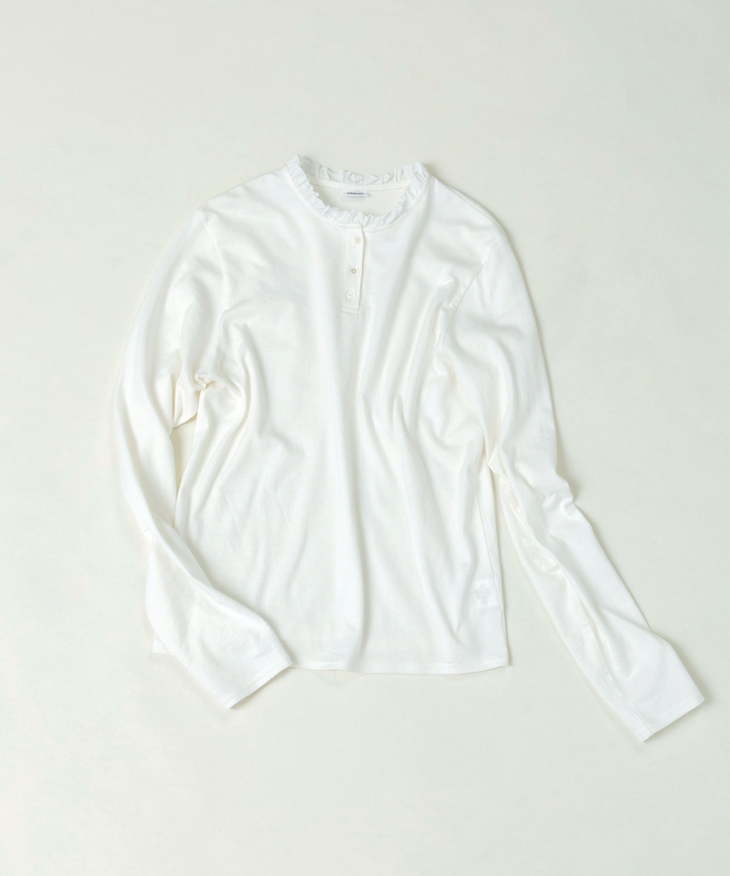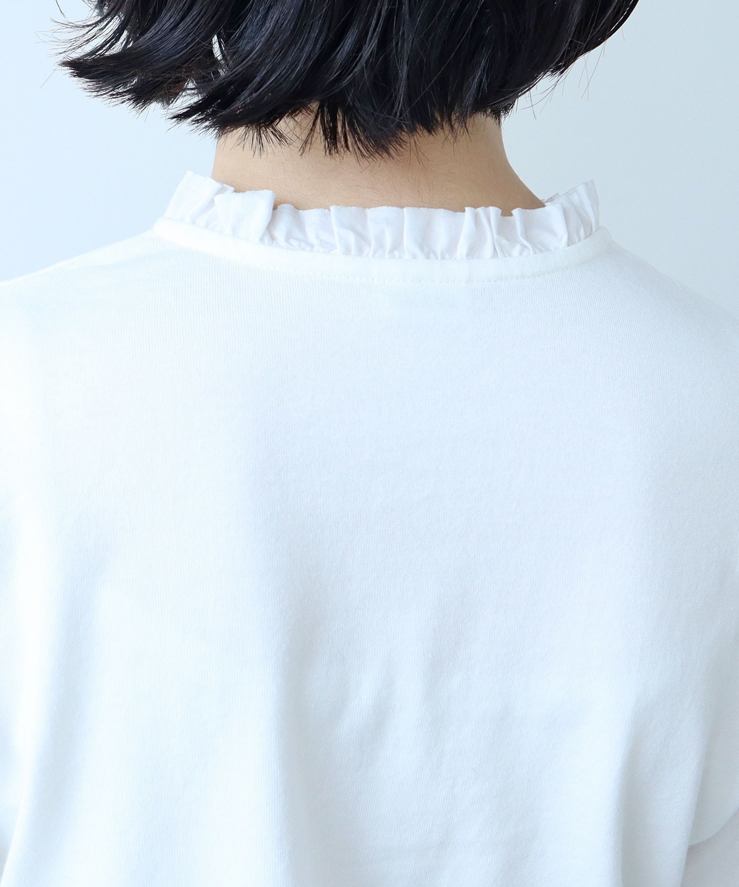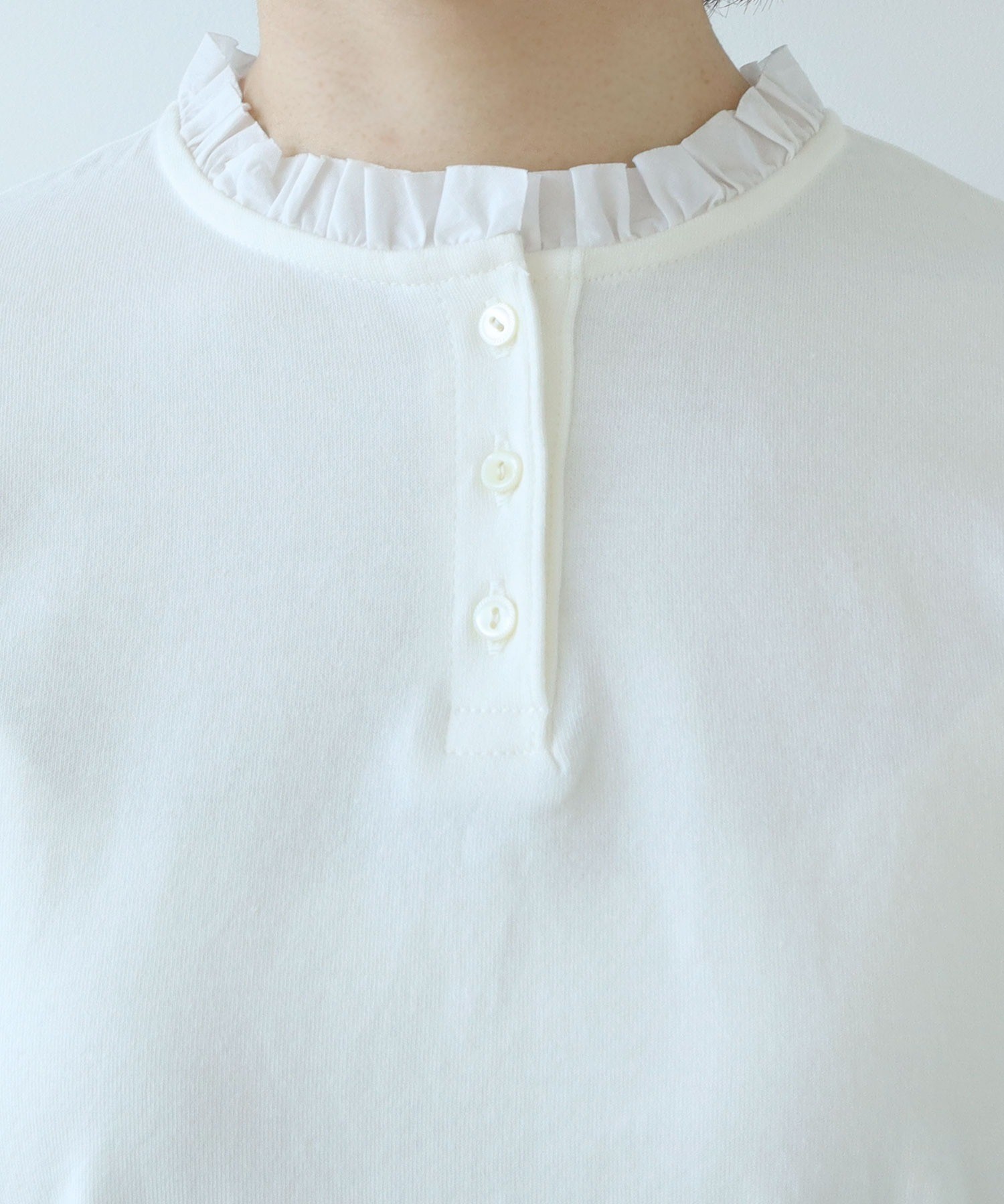 ソフトで滑らかな風合いを持つコーマフライス素材のボディに、しなやかで適度なハリ感のあるフリルを施し、ちょっぴり甘さのあるディテールをプラス。甘くなりすぎないよう、フリルは断ち切り仕様にすることでラフに仕上げました。肌に馴染む快適な着心地のカットソーは、重ね着した時にも動きやすくストレスフリーに着られます。ちょこんとした小さなサイズ感が愛らしいアンティークのような貝ボタンは、サロペットやカーディガンからちらっと覗かせてもスタイリングのポイントに。