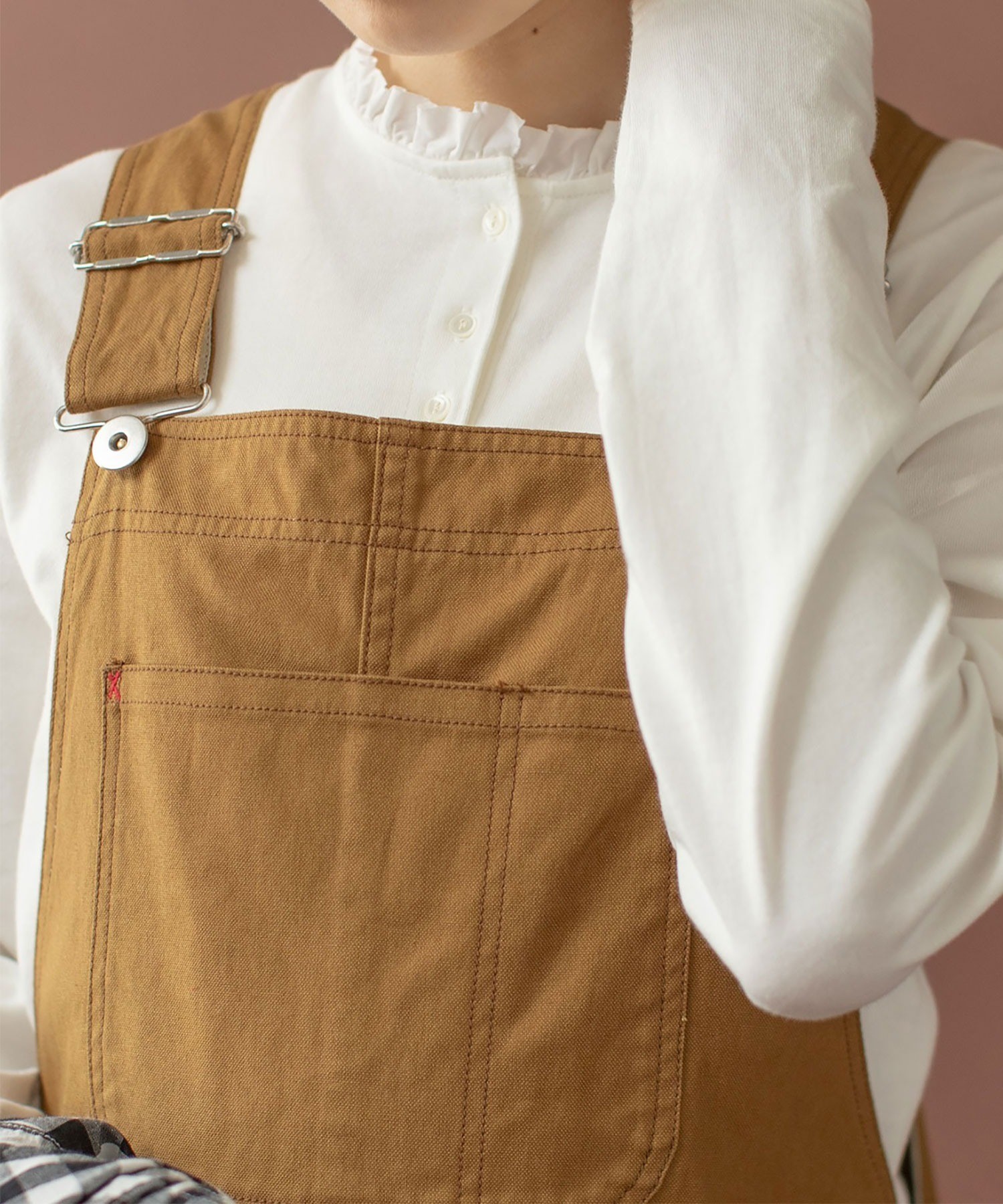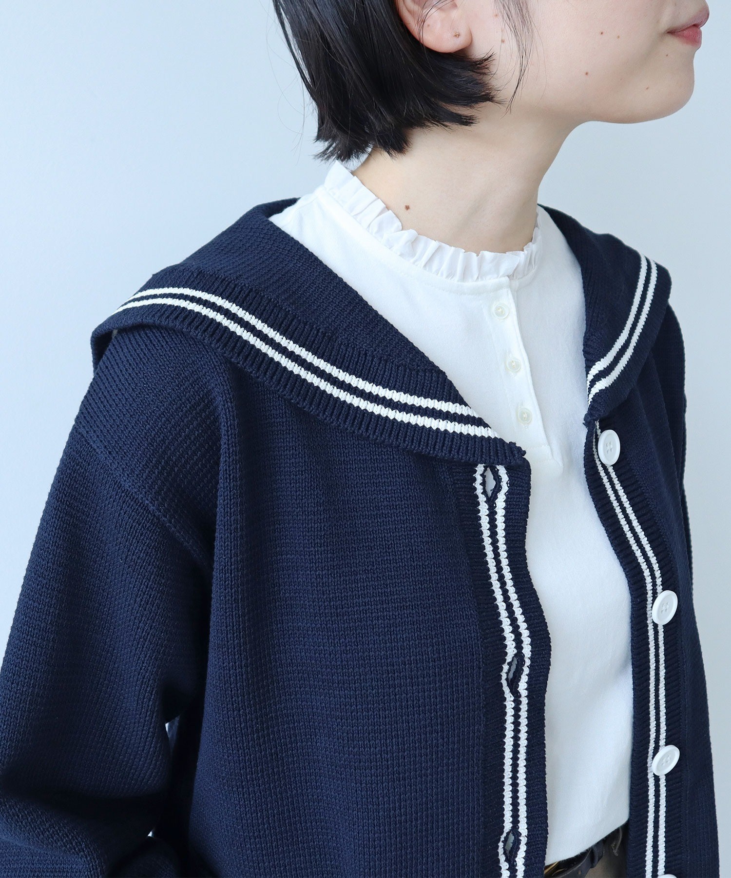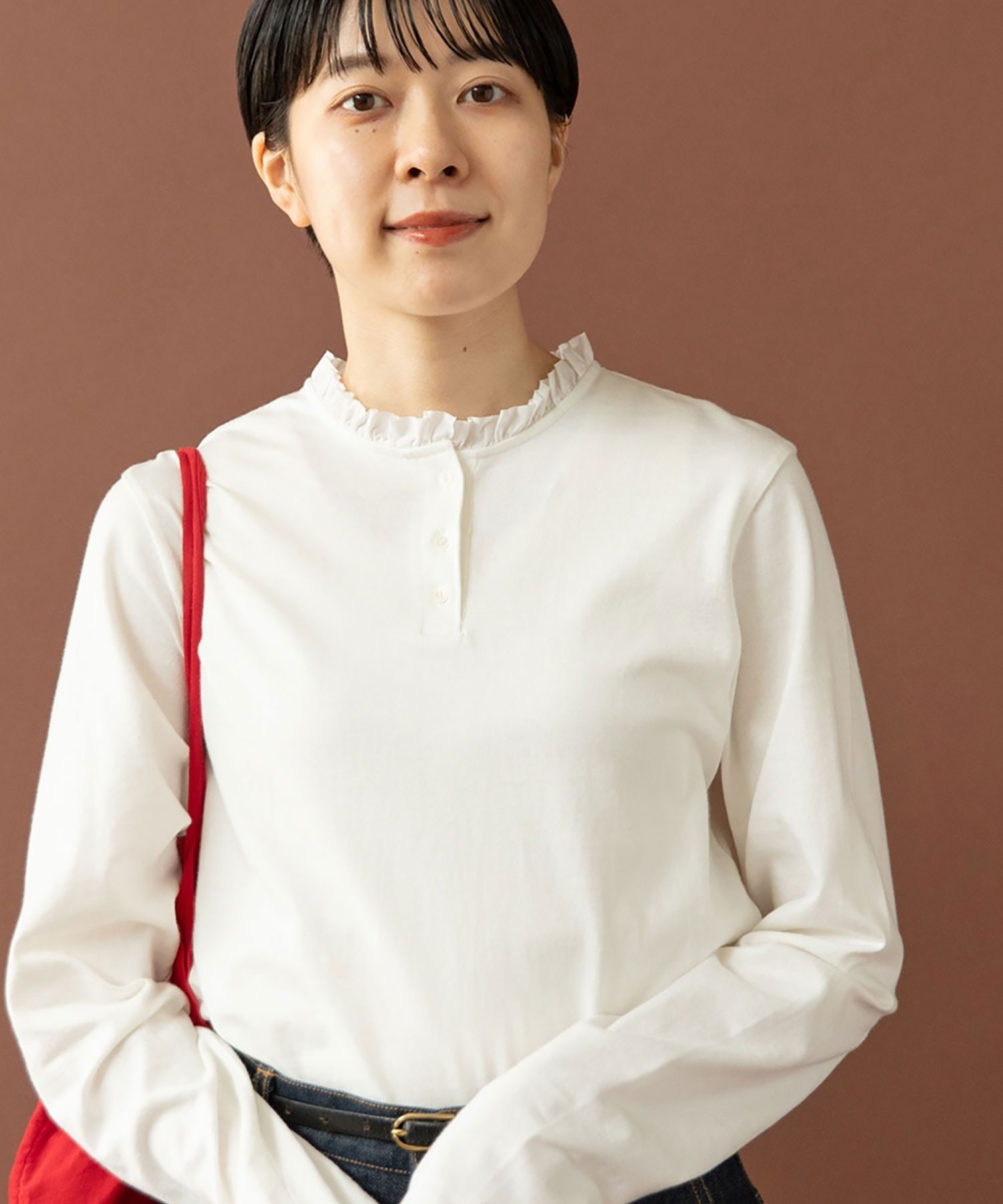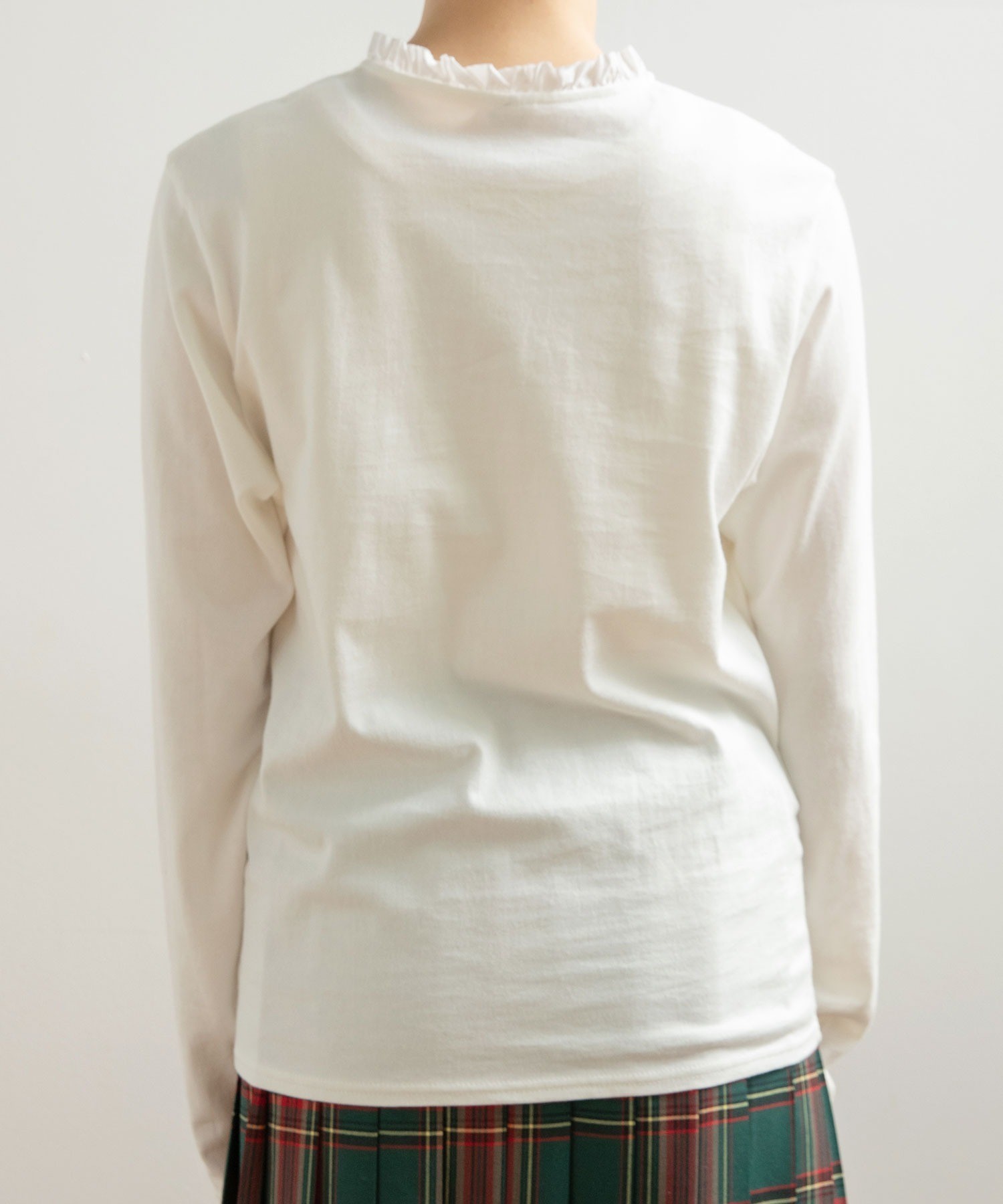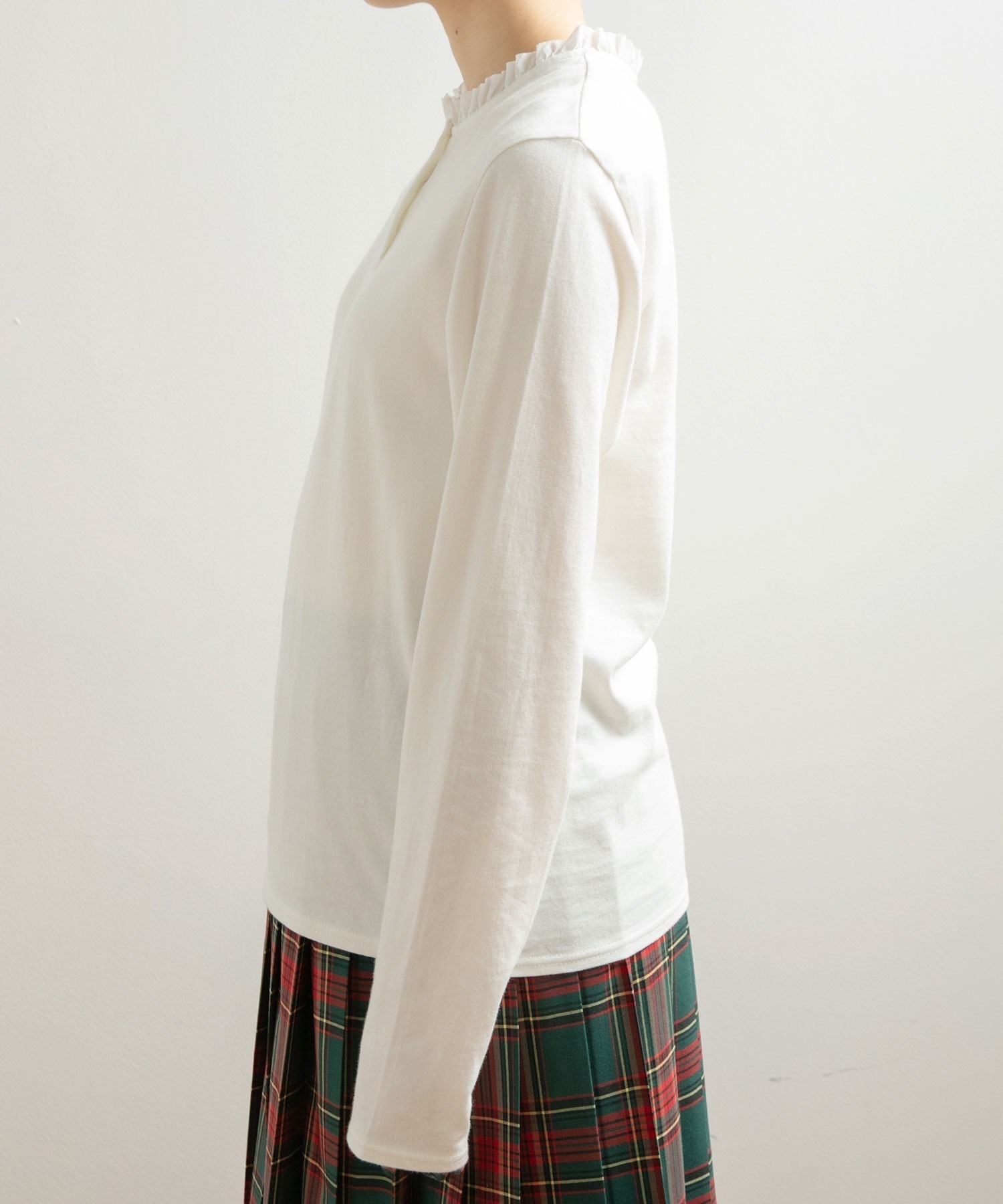 ソフトで滑らかな風合いを持つコーマフライス素材のボディに、しなやかで適度なハリ感のあるフリルを施し、ちょっぴり甘さのあるディテールをプラス。甘くなりすぎないよう、フリルは断ち切り仕様にすることでラフに仕上げました。肌に馴染む快適な着心地のカットソーは、重ね着した時にも動きやすくストレスフリーに着られます。ちょこんとした小さなサイズ感が愛らしいアンティークのような貝ボタンは、サロペットやカーディガンからちらっと覗かせてもスタイリングのポイントに。