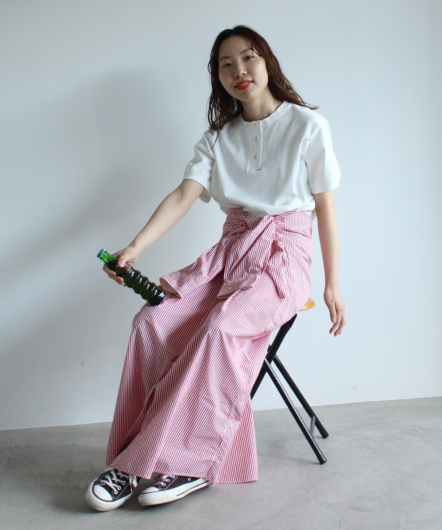 袖口をリブ仕様したことで程よくスポーティな要素をプラス。前開き部分のカンヌキや、裏返した時にちらっと見える裾の赤いミシンステッチが、シンプルな中にもさりげない遊び心を感じさせます。一枚着としてはもちろん、シャツやカーディガンのインナーとしても活躍するコーディネートの幅が広がる一着。