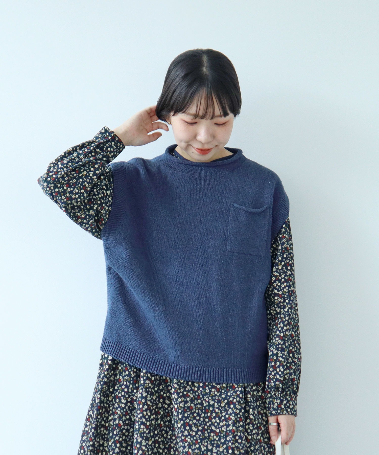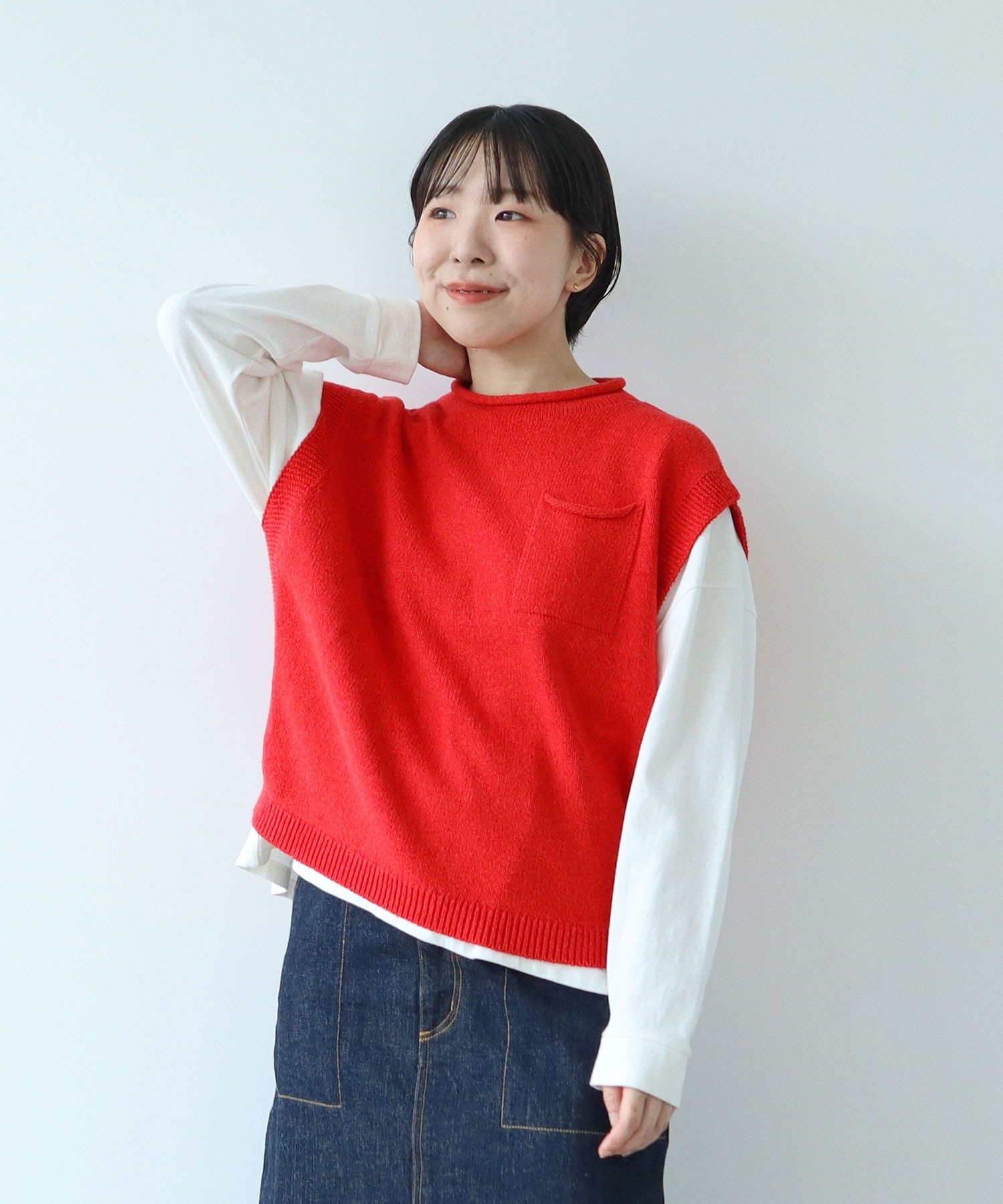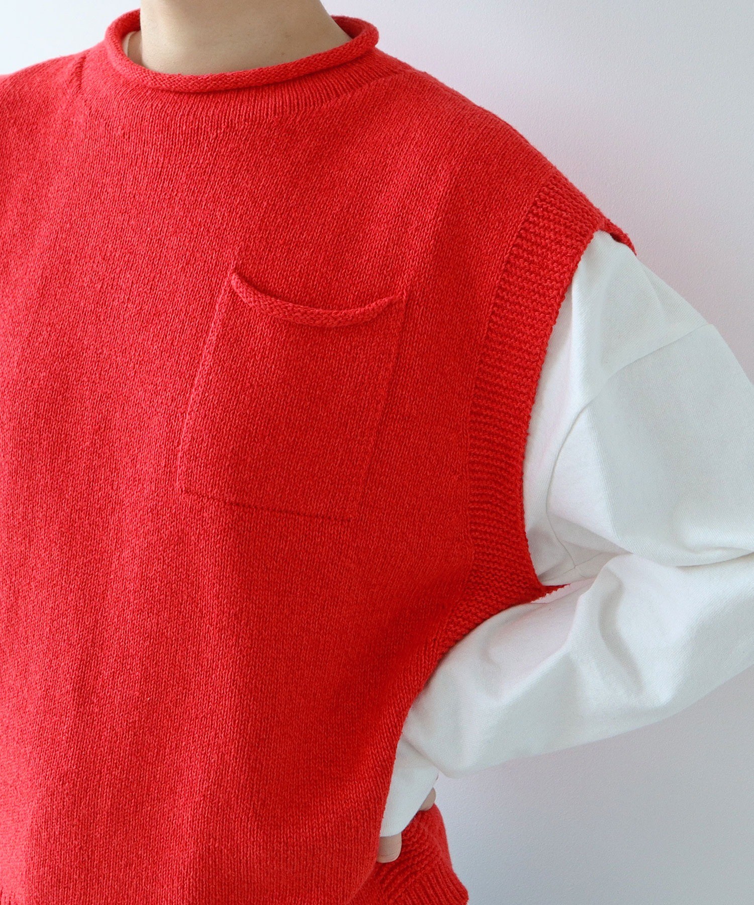 ニットを丸ごと編み上げるホールガーメント製法で、脇部分に接ぎ目がなく立体的に編み上げられるため、優れたフィット感と高い伸縮性でストレスフリーな着心地。アームホールと裾にガーター編みで切り替えを作り、くるんとしたポケット口やロールネックで、シンプルながらもちょっぴり遊び心のある一着。暑さの残る日には半袖Tシャツと合わせて。ボーダーカットソーや柄物ワンピースとも相性抜群です。季節でインナーを変えてロングシーズン着こなしを楽しめます。同素材でVネックカーディガン(5001KN004252)もご用意しております。