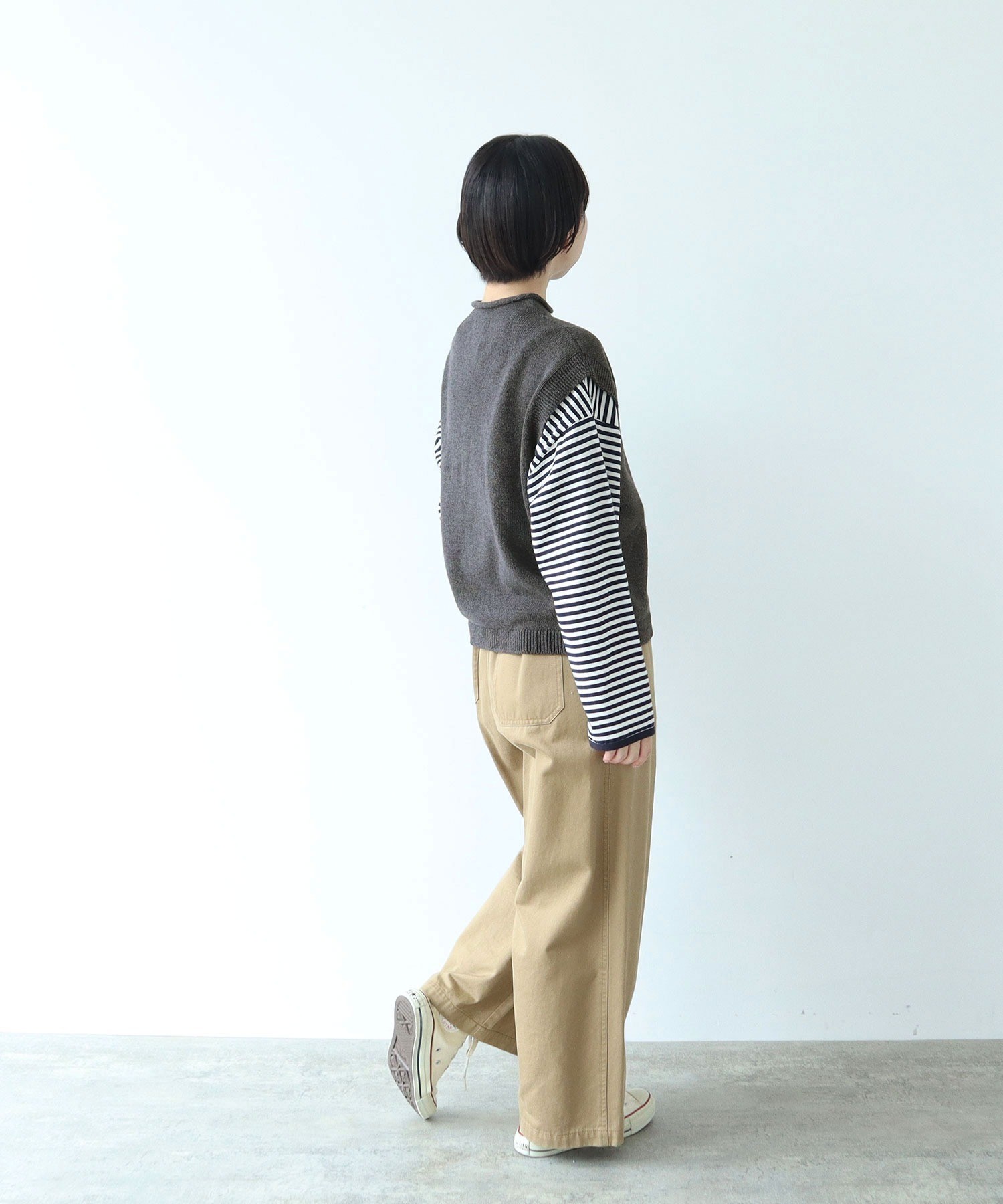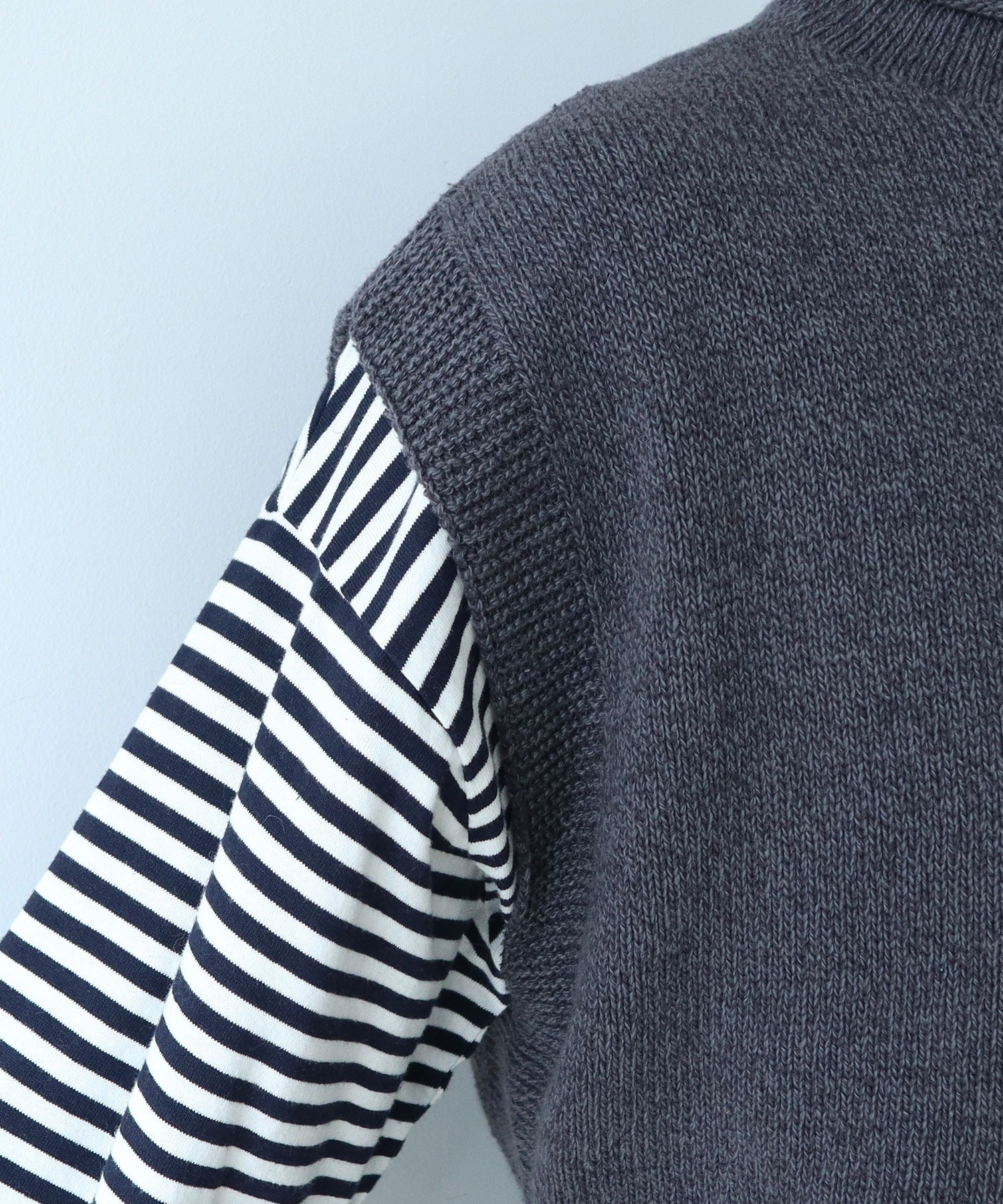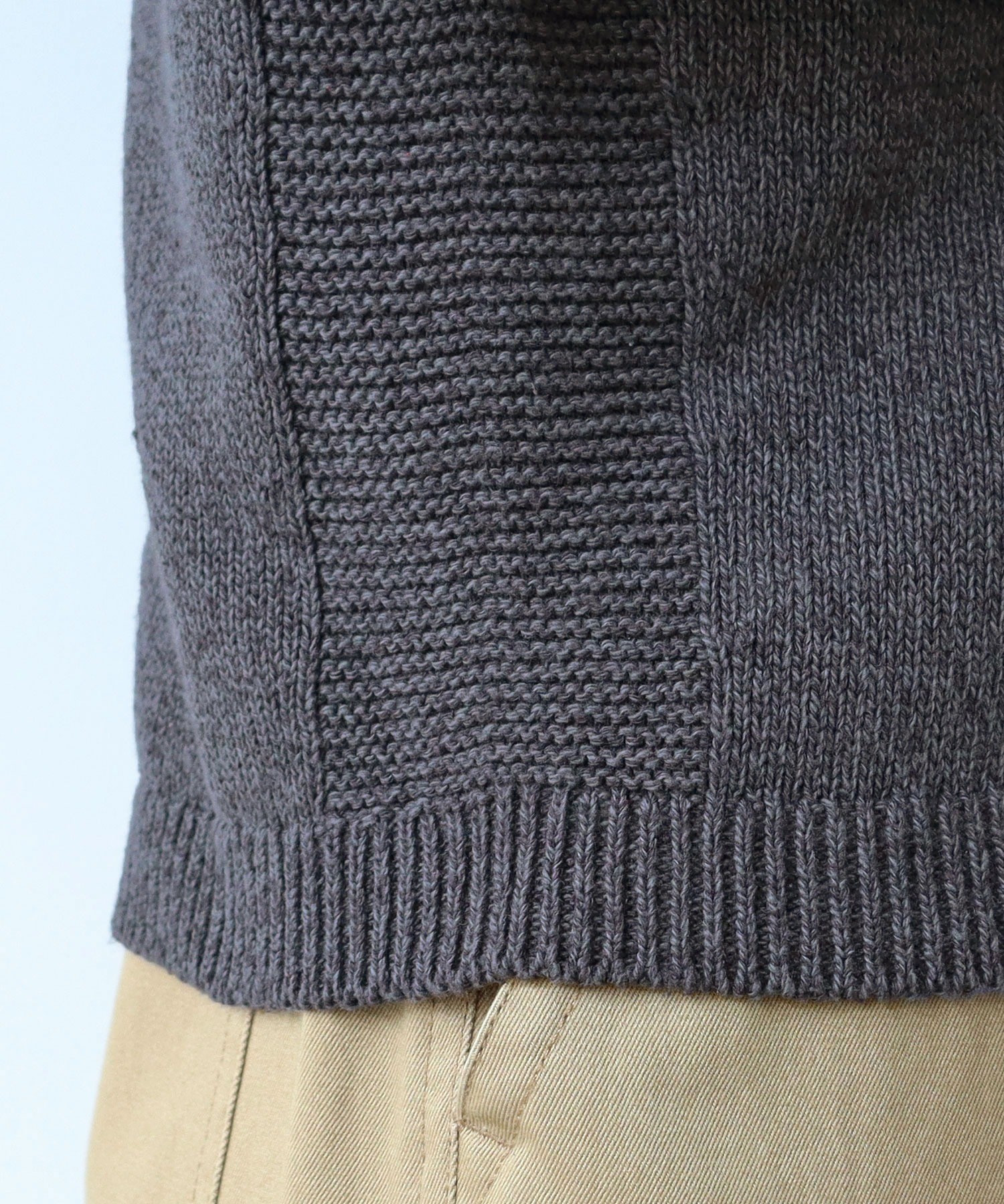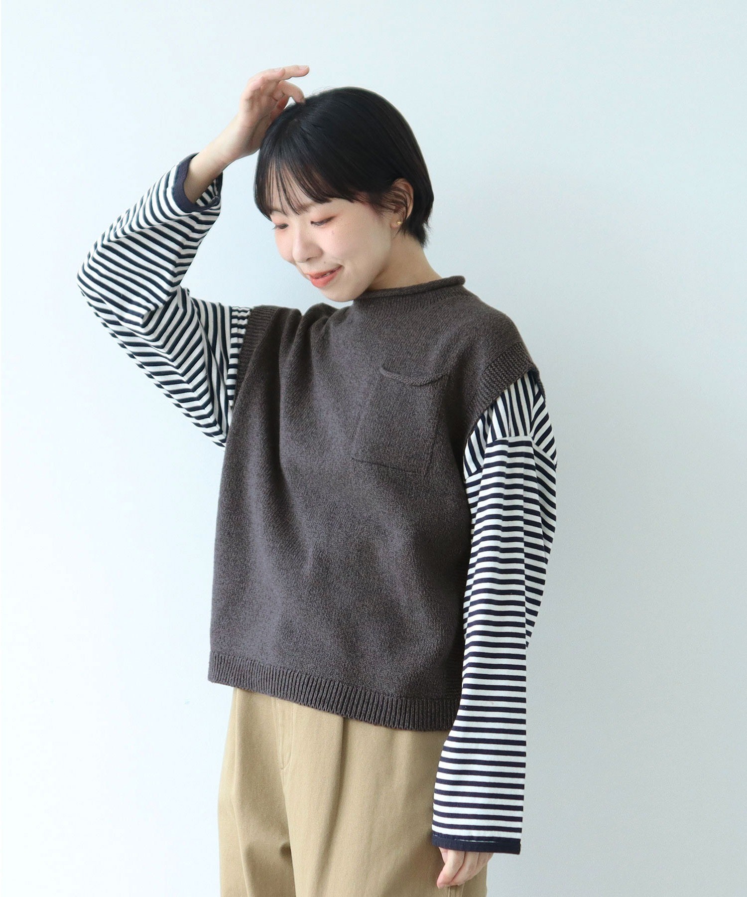ニットを丸ごと編み上げるホールガーメント製法で、脇部分に接ぎ目がなく立体的に編み上げられるため、優れたフィット感と高い伸縮性でストレスフリーな着心地。アームホールと裾にガーター編みで切り替えを作り、くるんとしたポケット口やロールネックで、シンプルながらもちょっぴり遊び心のある一着。暑さの残る日には半袖Tシャツと合わせて。ボーダーカットソーや柄物ワンピースとも相性抜群です。季節でインナーを変えてロングシーズン着こなしを楽しめます。同素材でVネックカーディガン(5001KN004252)もご用意しております。