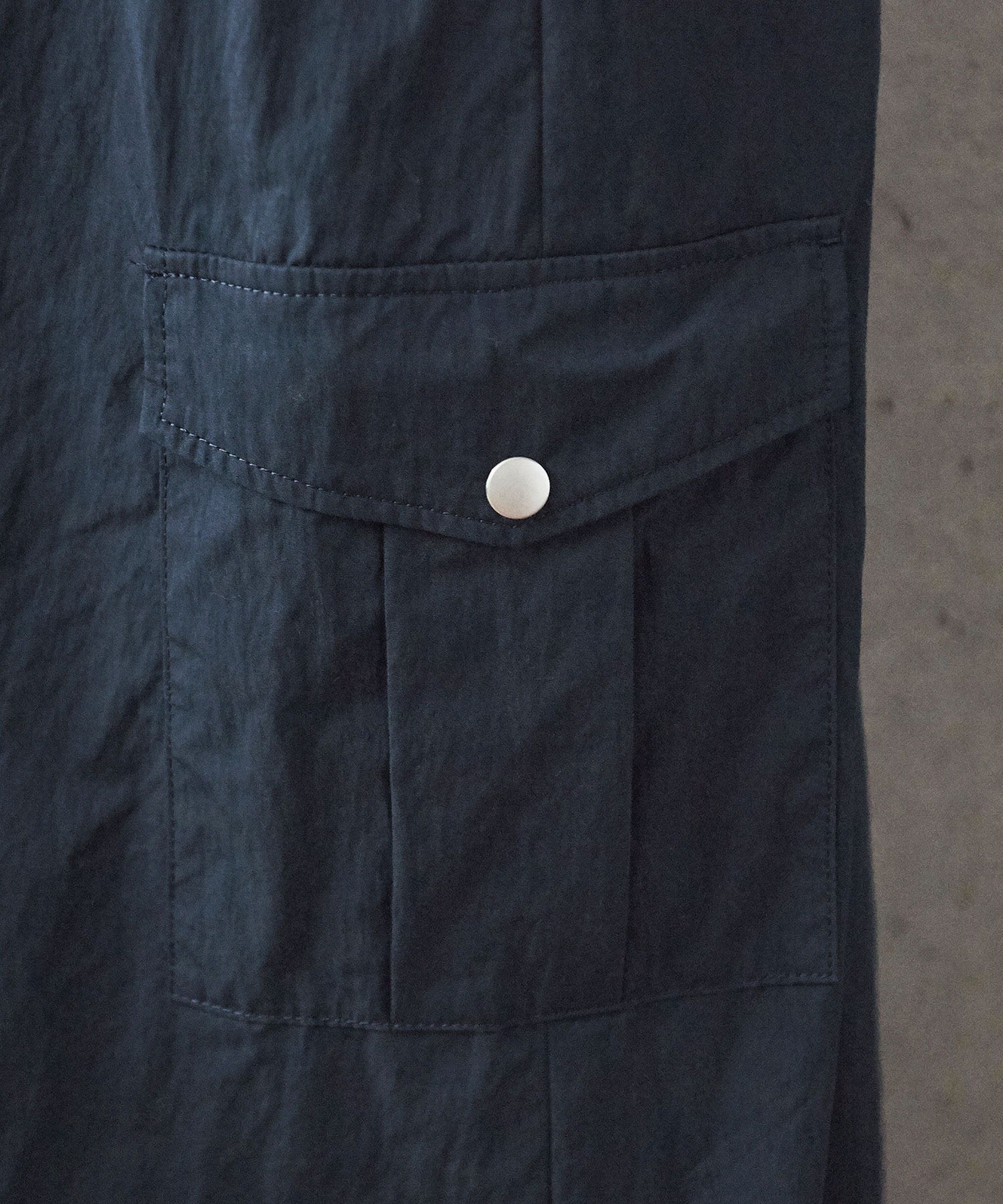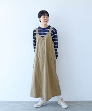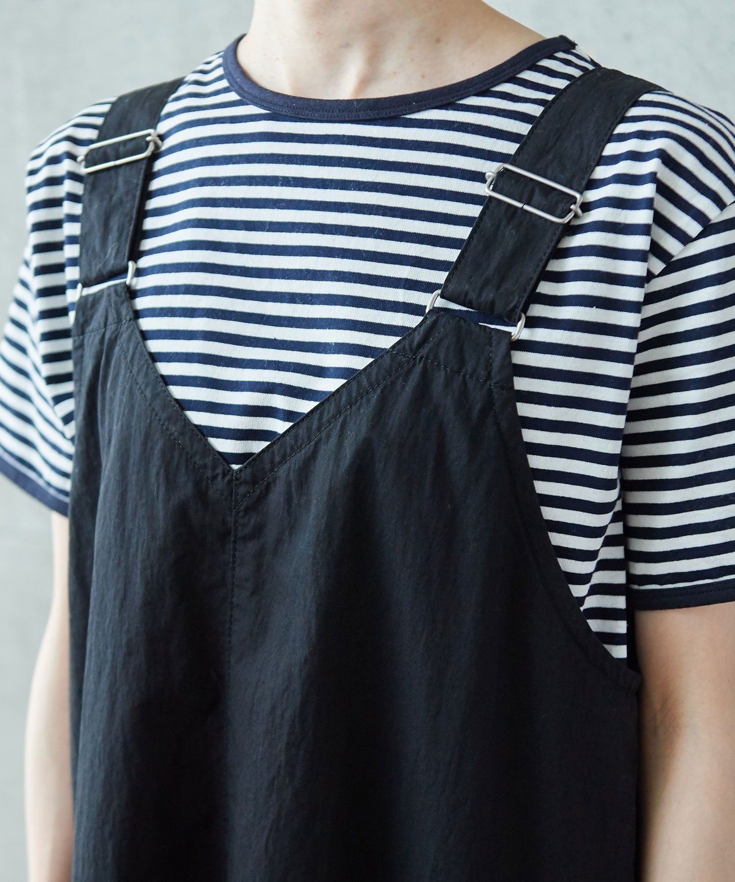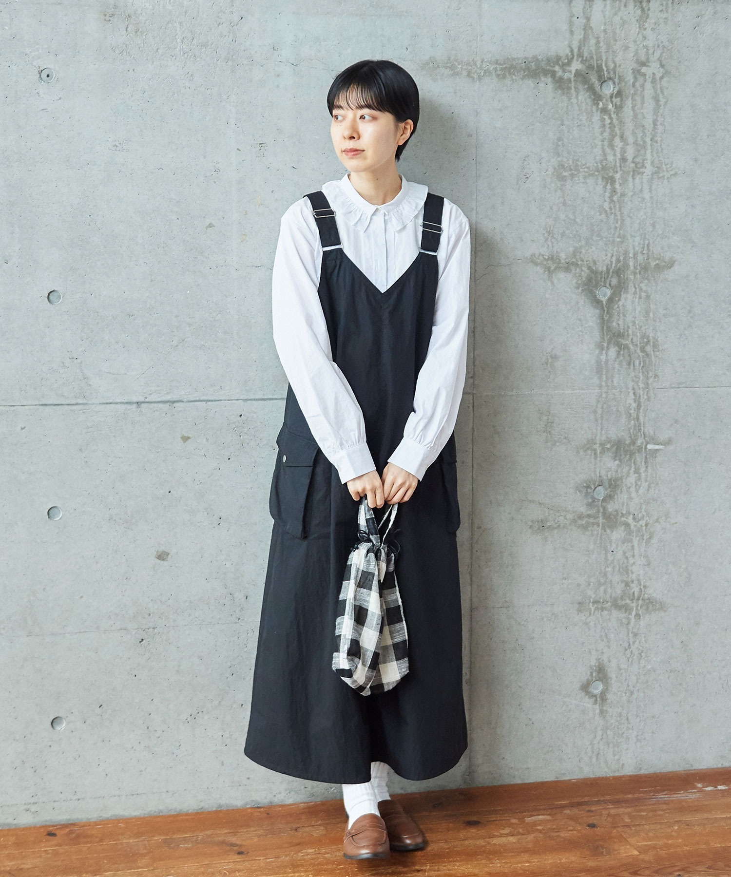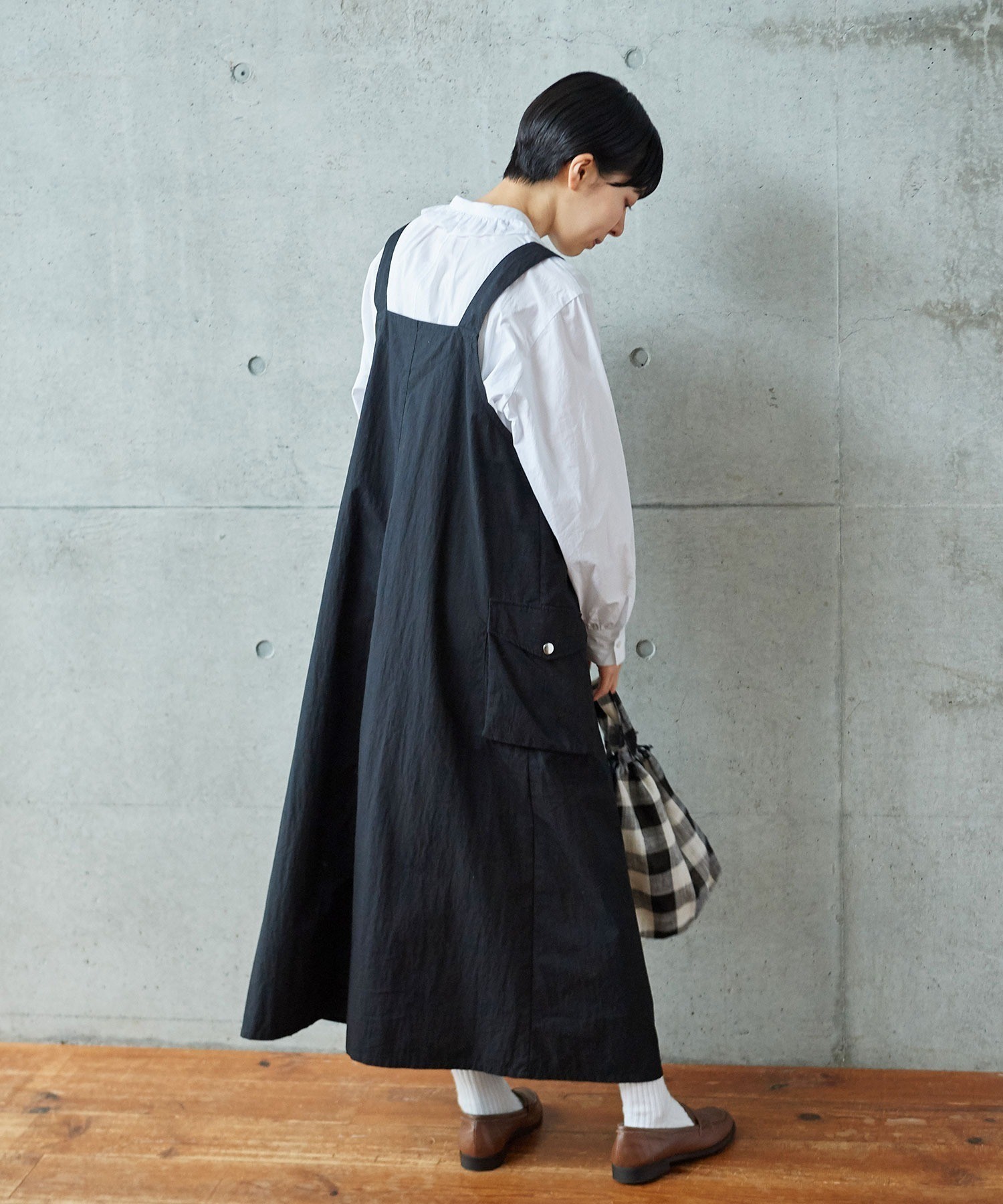 フロントを深めのVネックにしたことで、野暮ったくならず洗練された印象に。スナップボタンの付いたポケットや肩ひもの付属の金具など、所々ボーイズライクなディティールが光ります。