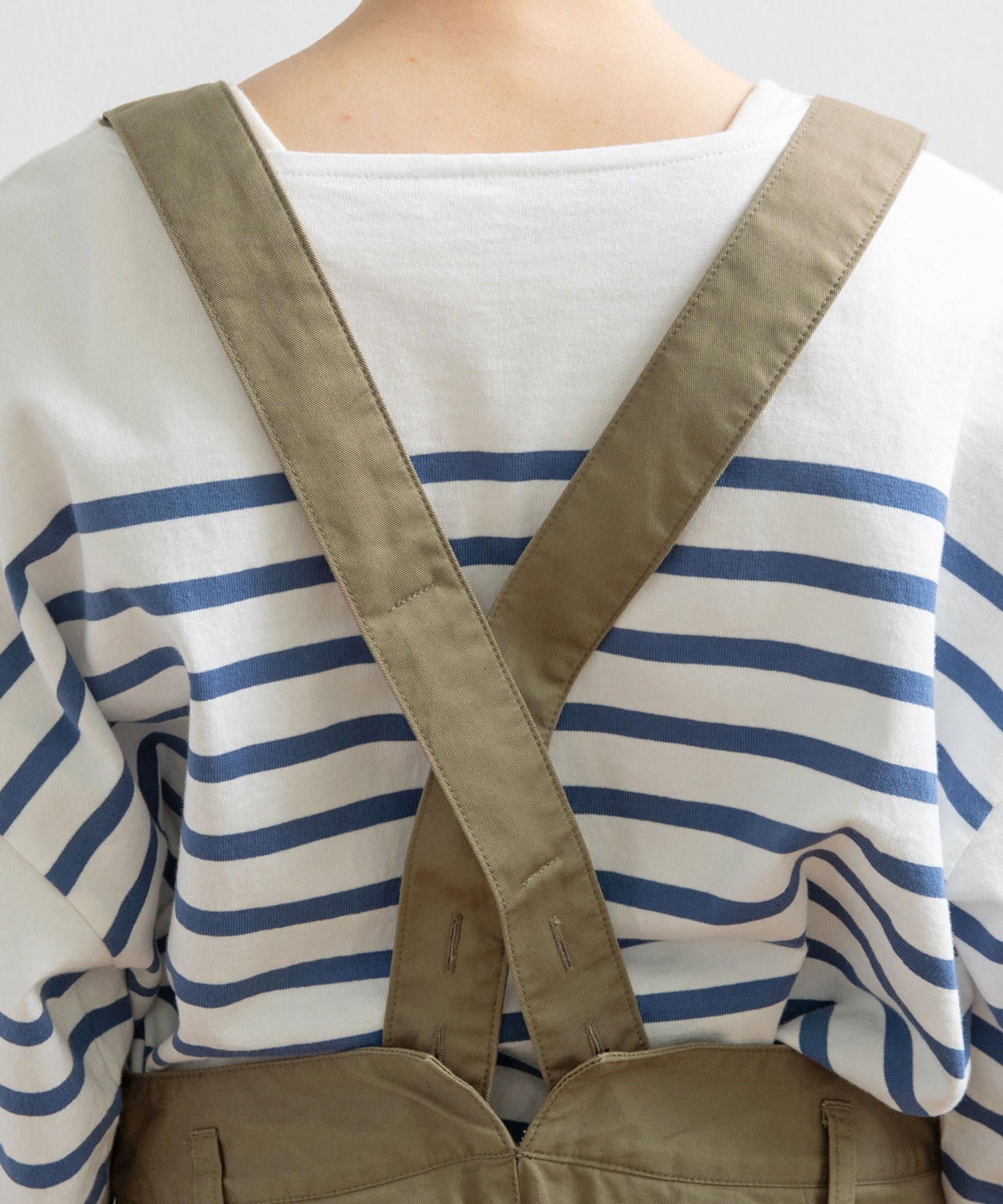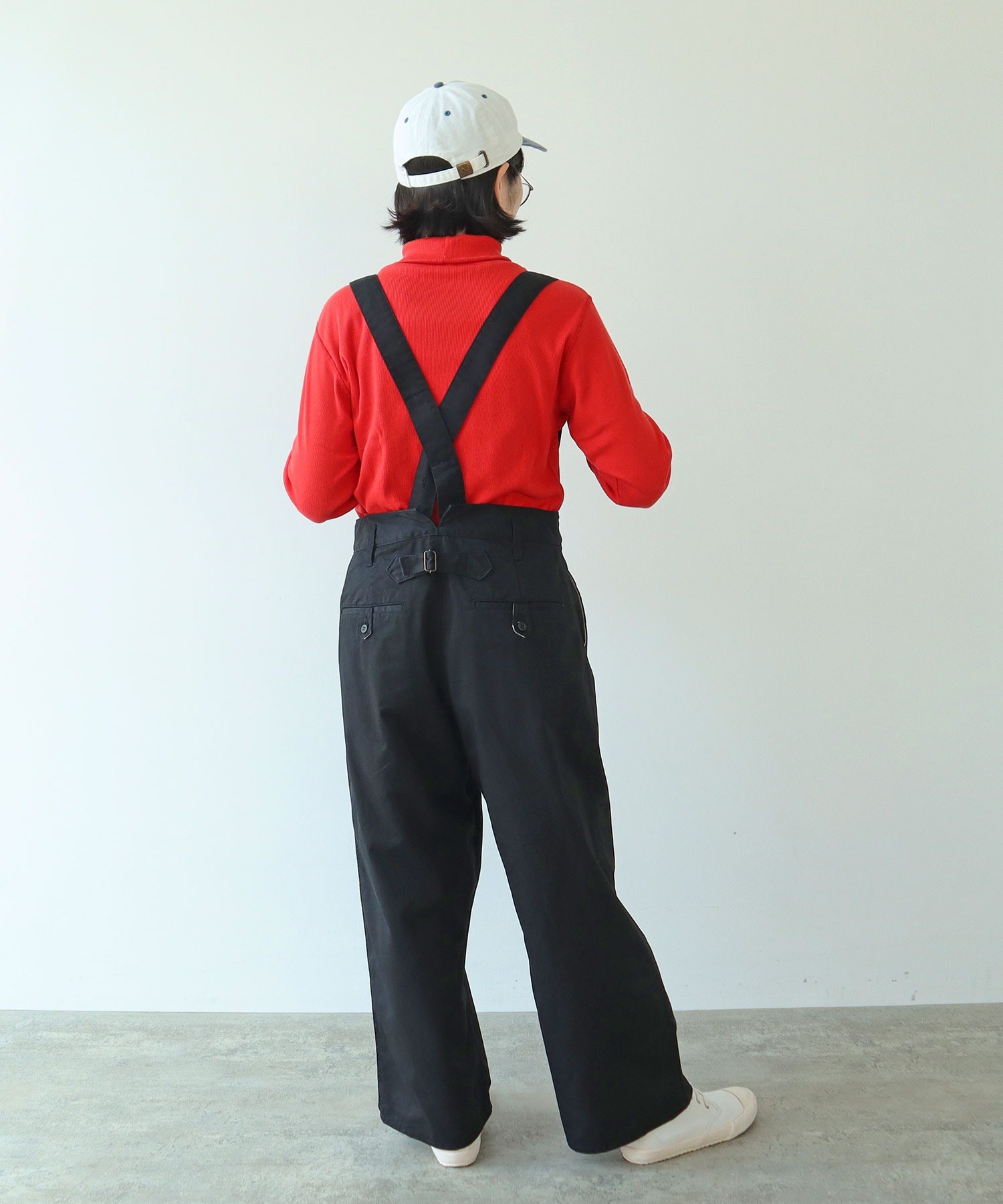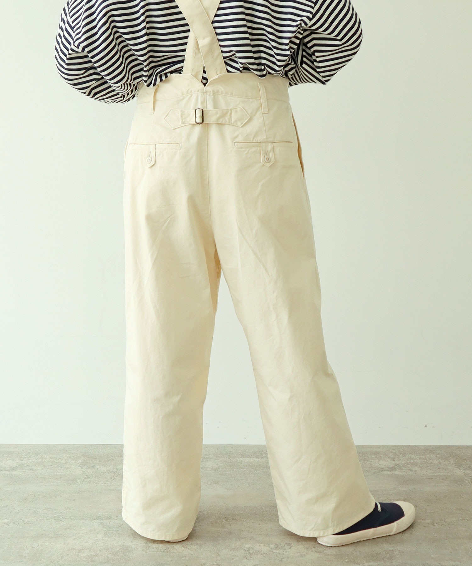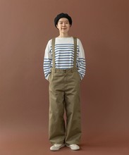 程良くワイドな太さで様々なトップスと相性の良いパンツは、肩紐を絶妙な太さにすることでカジュアルすぎない印象に。長さ調整が可能なホール付きなので身長を問わず、吊りパンツを履いた事がない方も挑戦していただきやすいアイテムです。小さめのボタンが二つ並んだウエスト部分や、ワークディテールのタブ等ブランドらしいこだわりを詰め込みました。主張しすぎずにスタイリングに馴染むので、飽きずにオールシーズン履けるところも嬉しい。