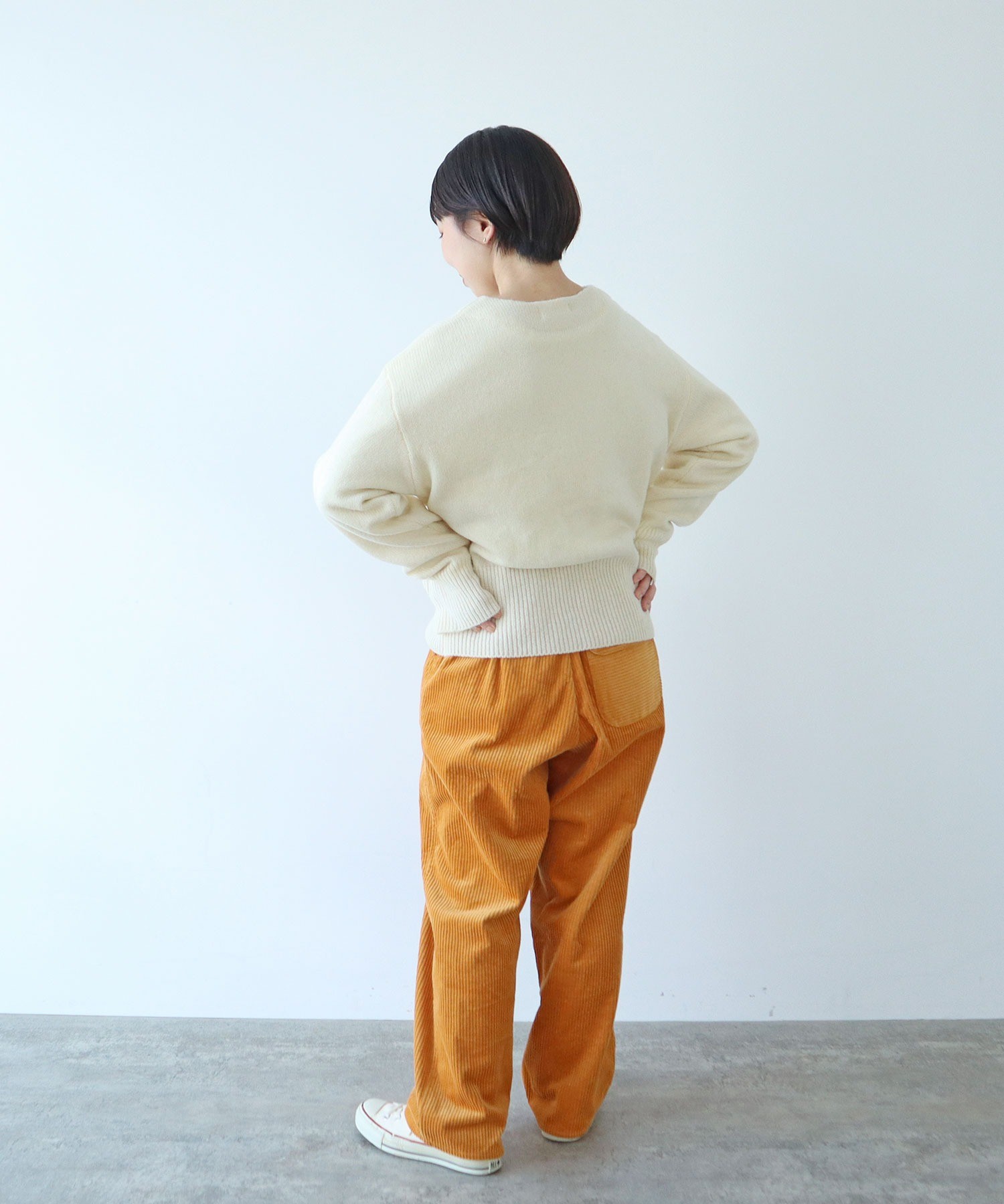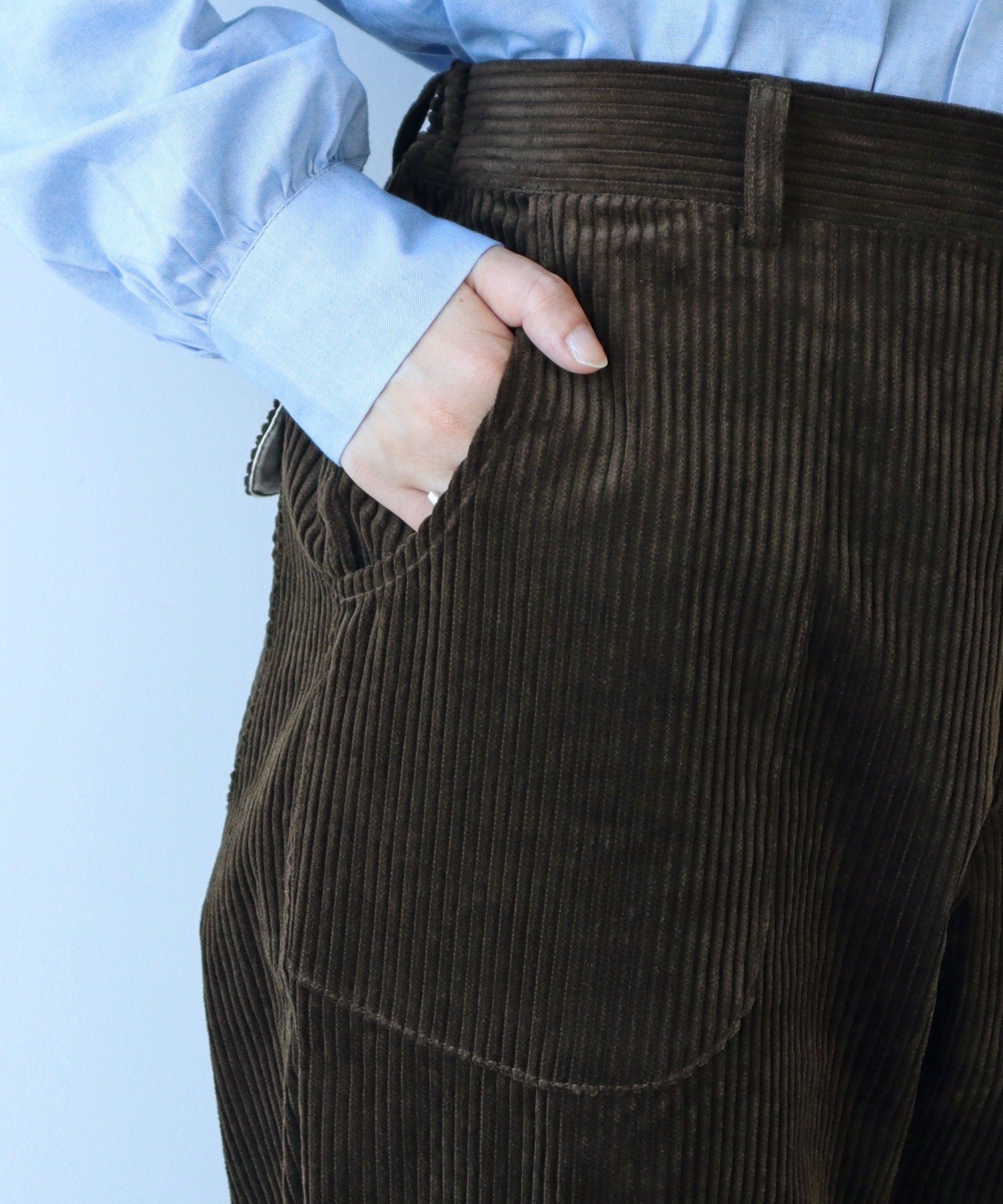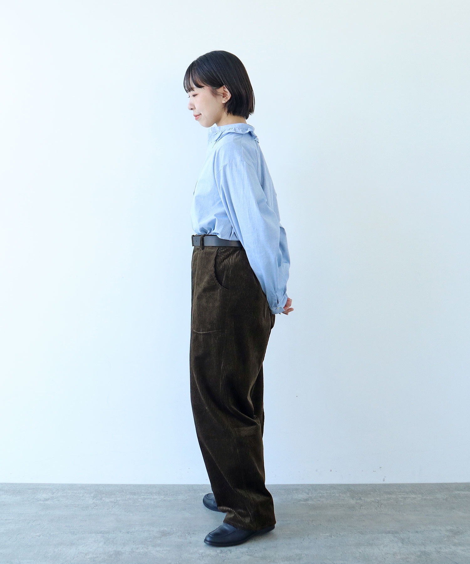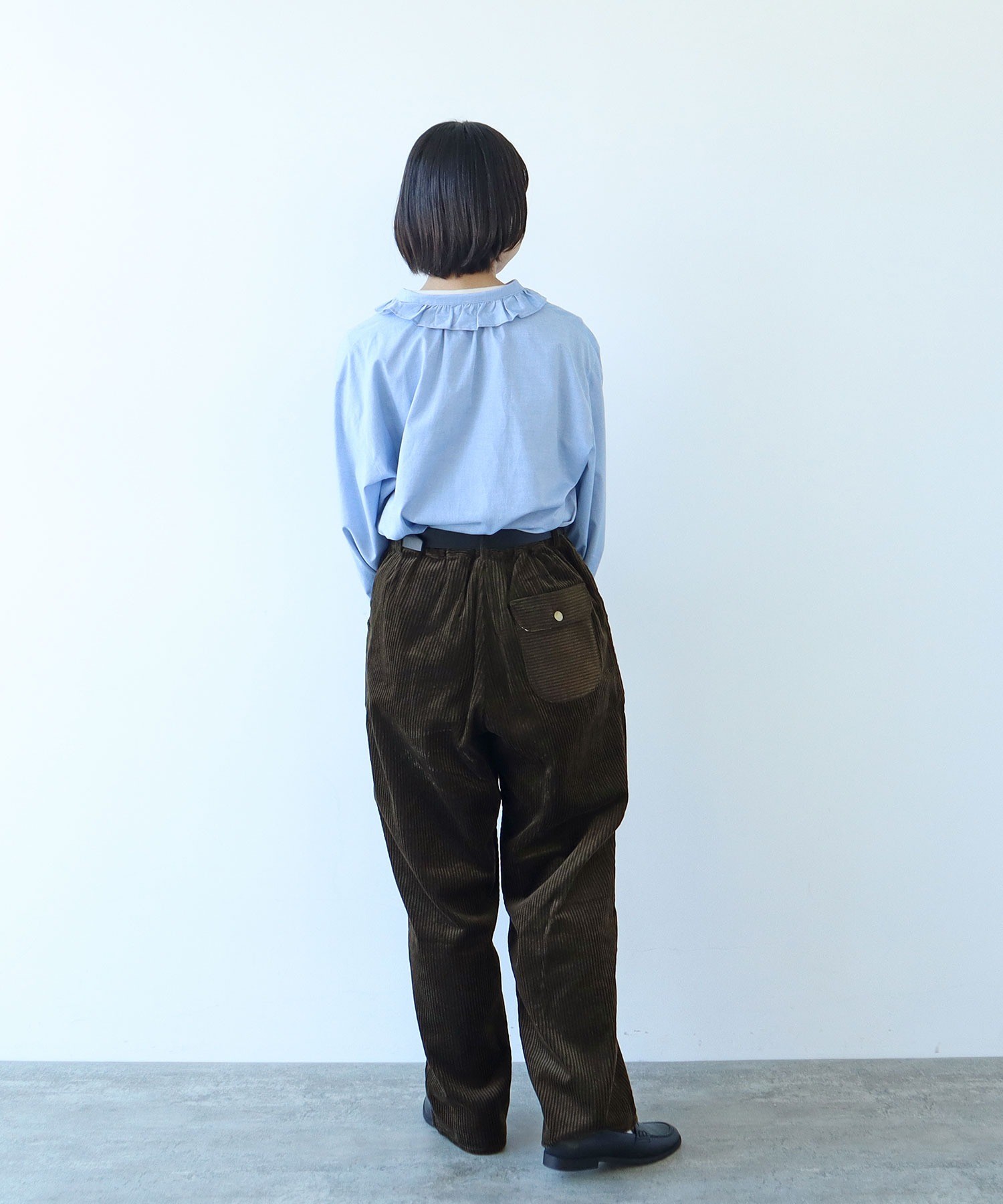 ウォーム感のある起毛素材はシンプルなスタイリングでもさまになります。本格的な寒さが来る前からスタイリングに取り入れることで季節感を高めてくれます。秋口にはシャツやスウェット、気温が低い日にはボリュームのあるニットと合わせて。同素材でブルゾン(5001BZ003252)とスカート(5001SK004252)もご用意しております。