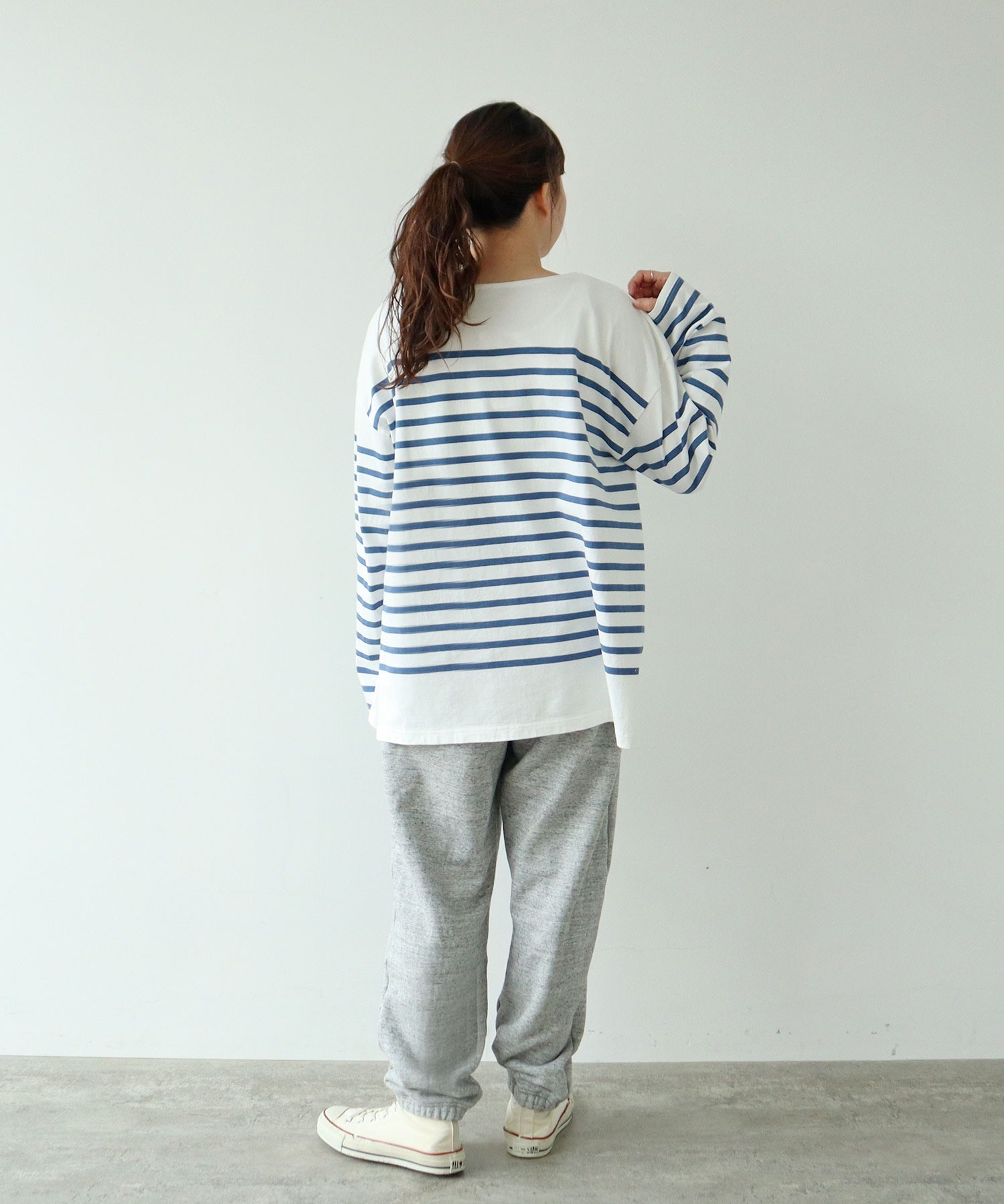 ヒップ周りに適度にゆとりのある絶妙なサイジングとルーズすぎないシルエットで、さらっと履いてもさまになる一着に仕上げました。ポケットと裾に施した微配色のミシンワークや、スポーティーな印象のラバープリントでさりげない存在感をプラス。“NAVYS”のワードはPAR ICIのブランドカラーでもある紺色から連想しました。