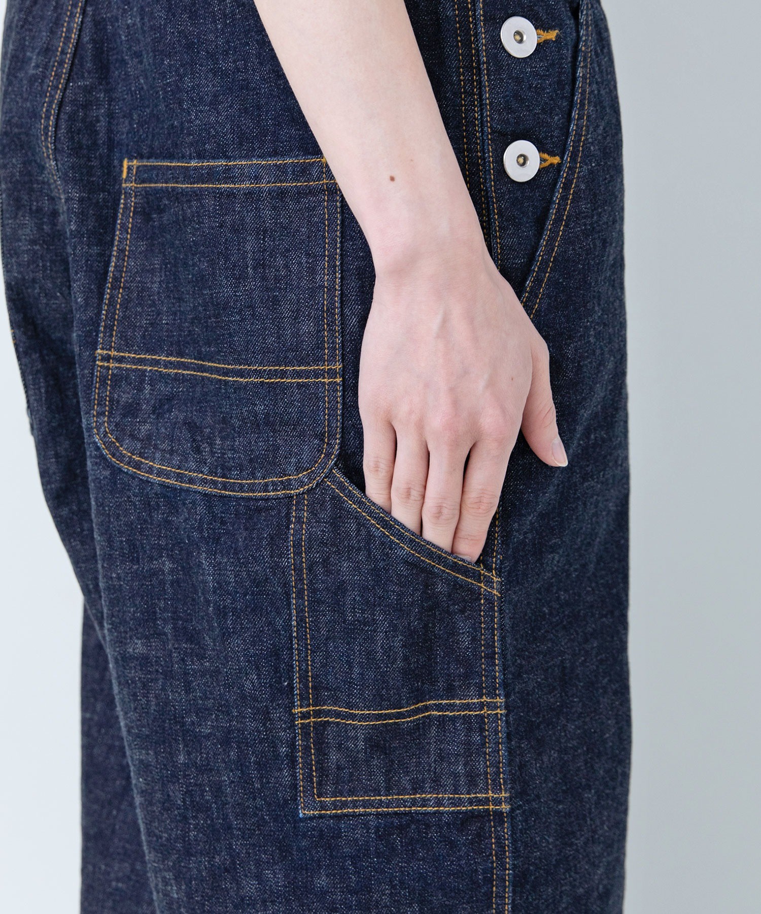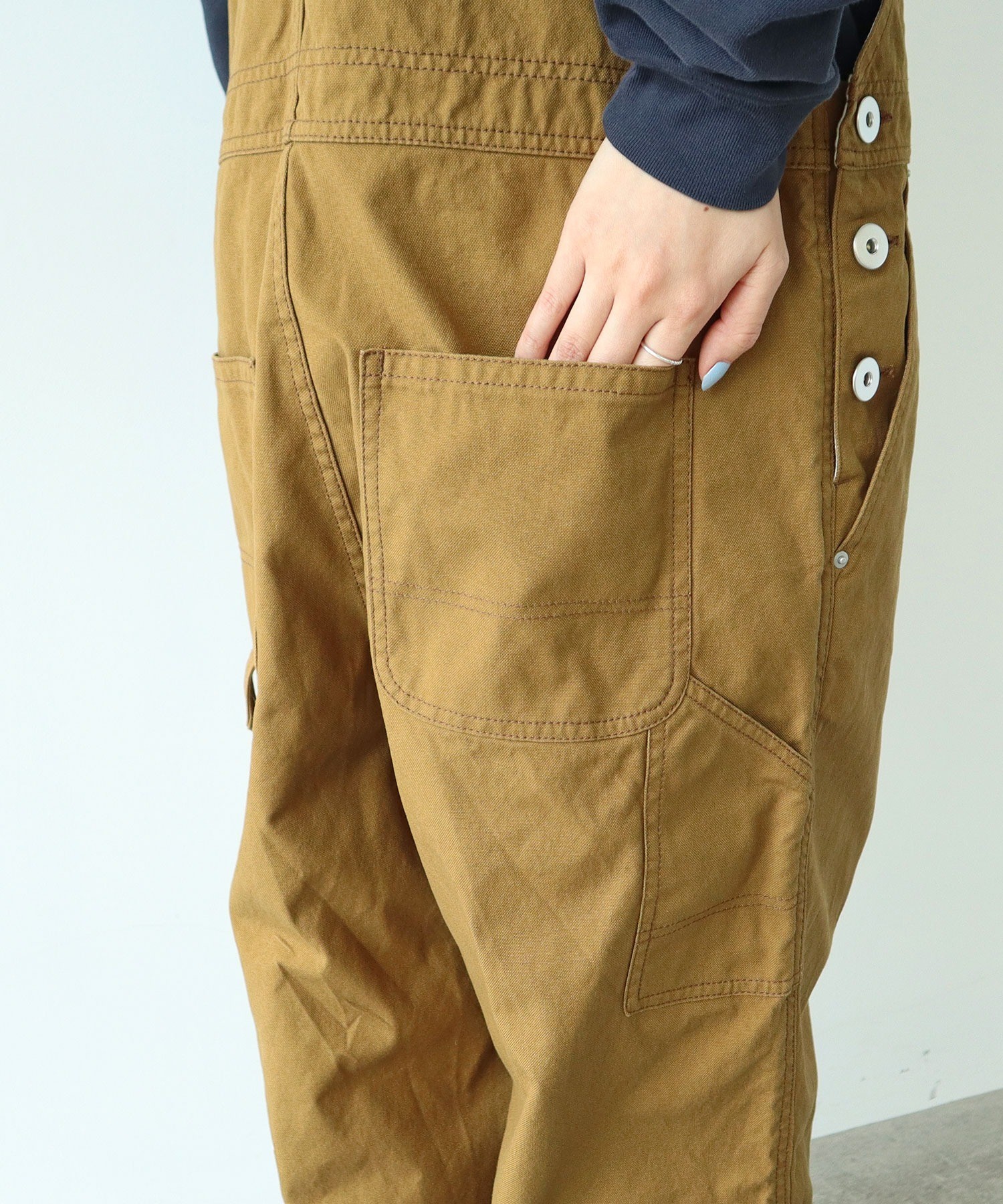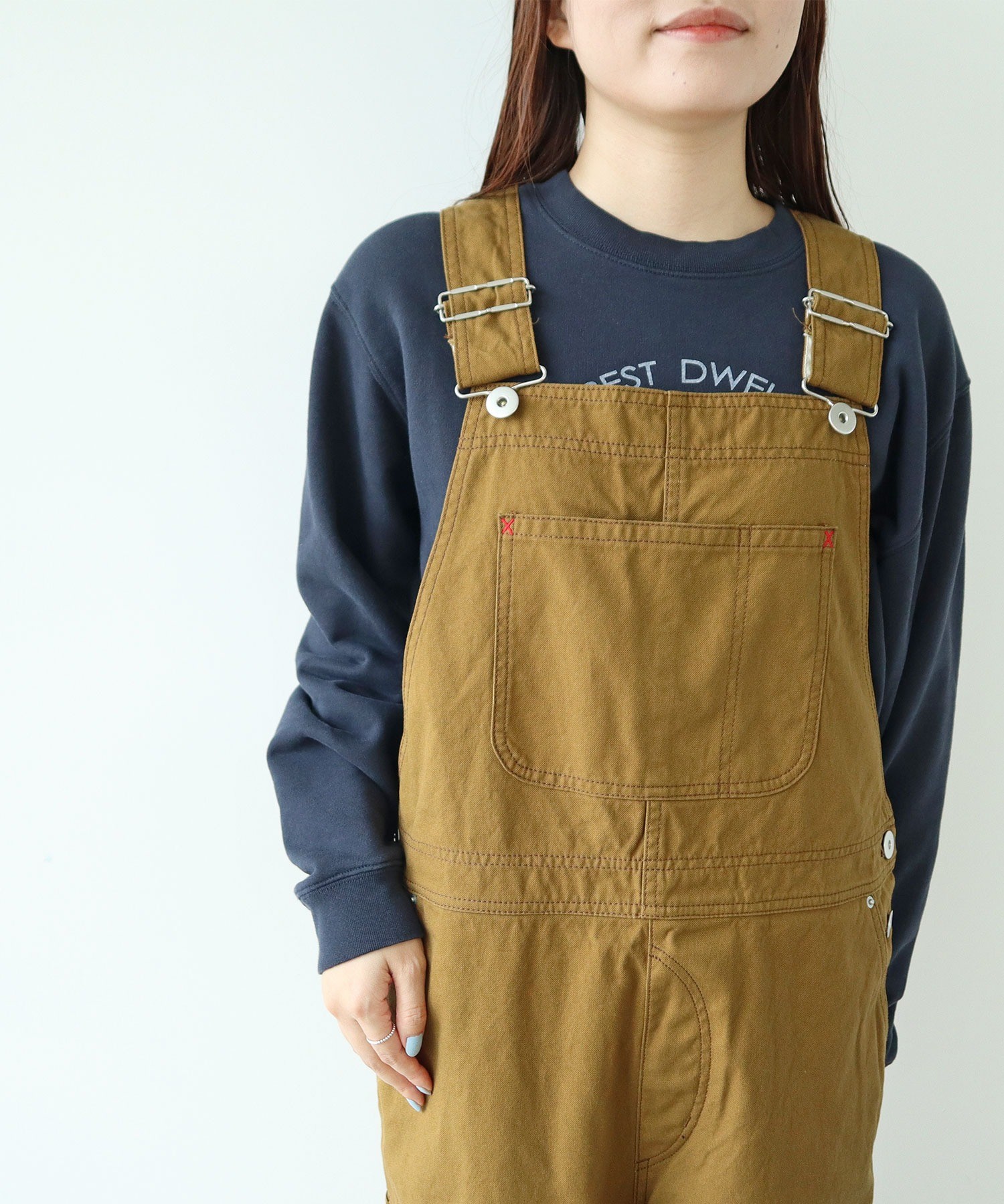 太めの肩ひもや腰幅、ハンマーループにスケールポケット、クロスステッチやリベットなど、ブランドらしいワークディテールをしっかりと入れながらも、配色のカンヌキや長すぎない丈感、ややルーズなシルエットなど女性が着やすい程よく無骨なアイテムに仕上げました。