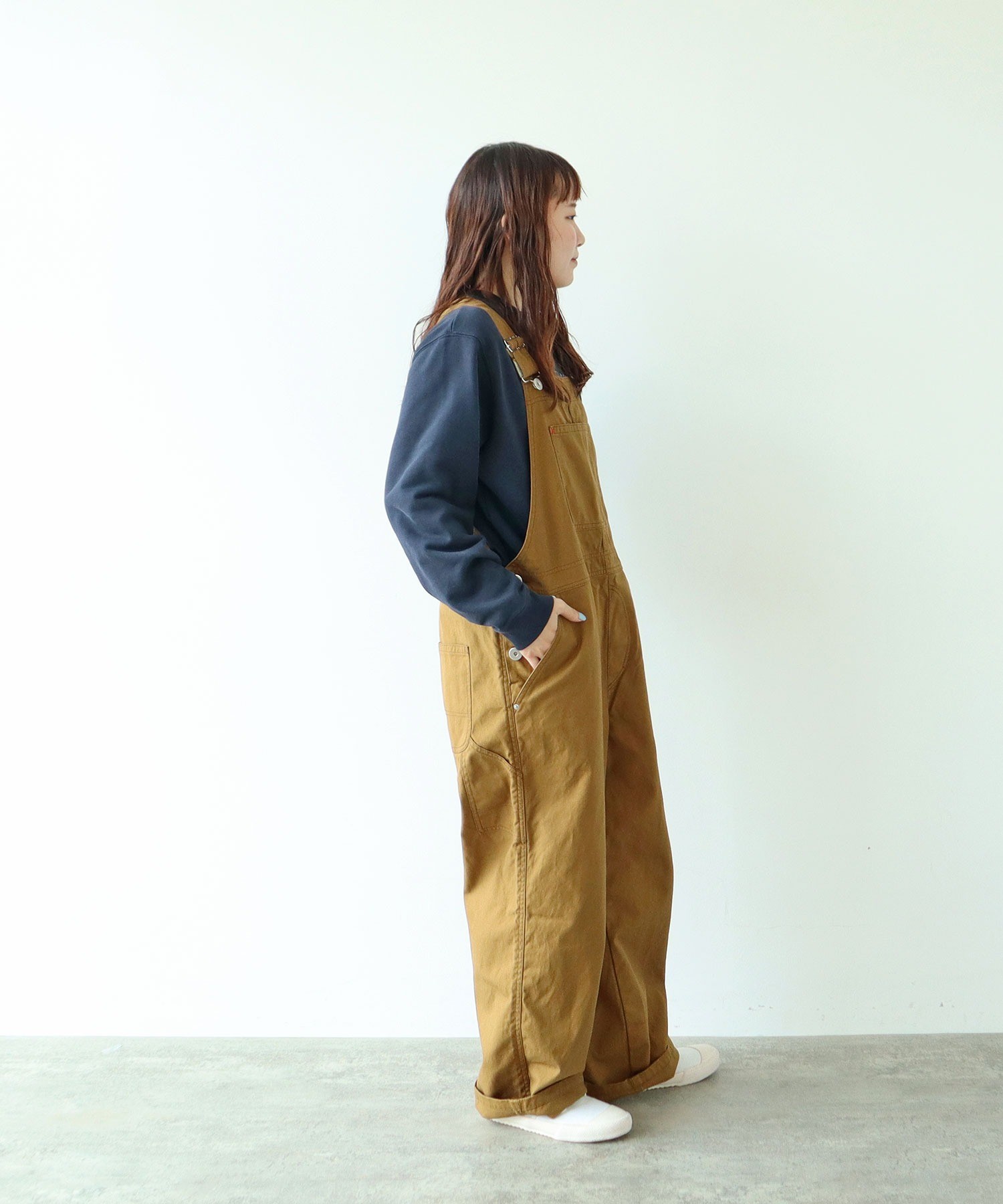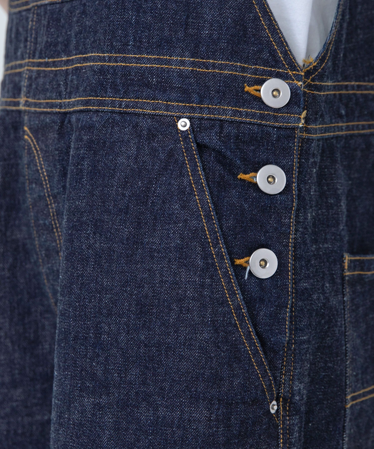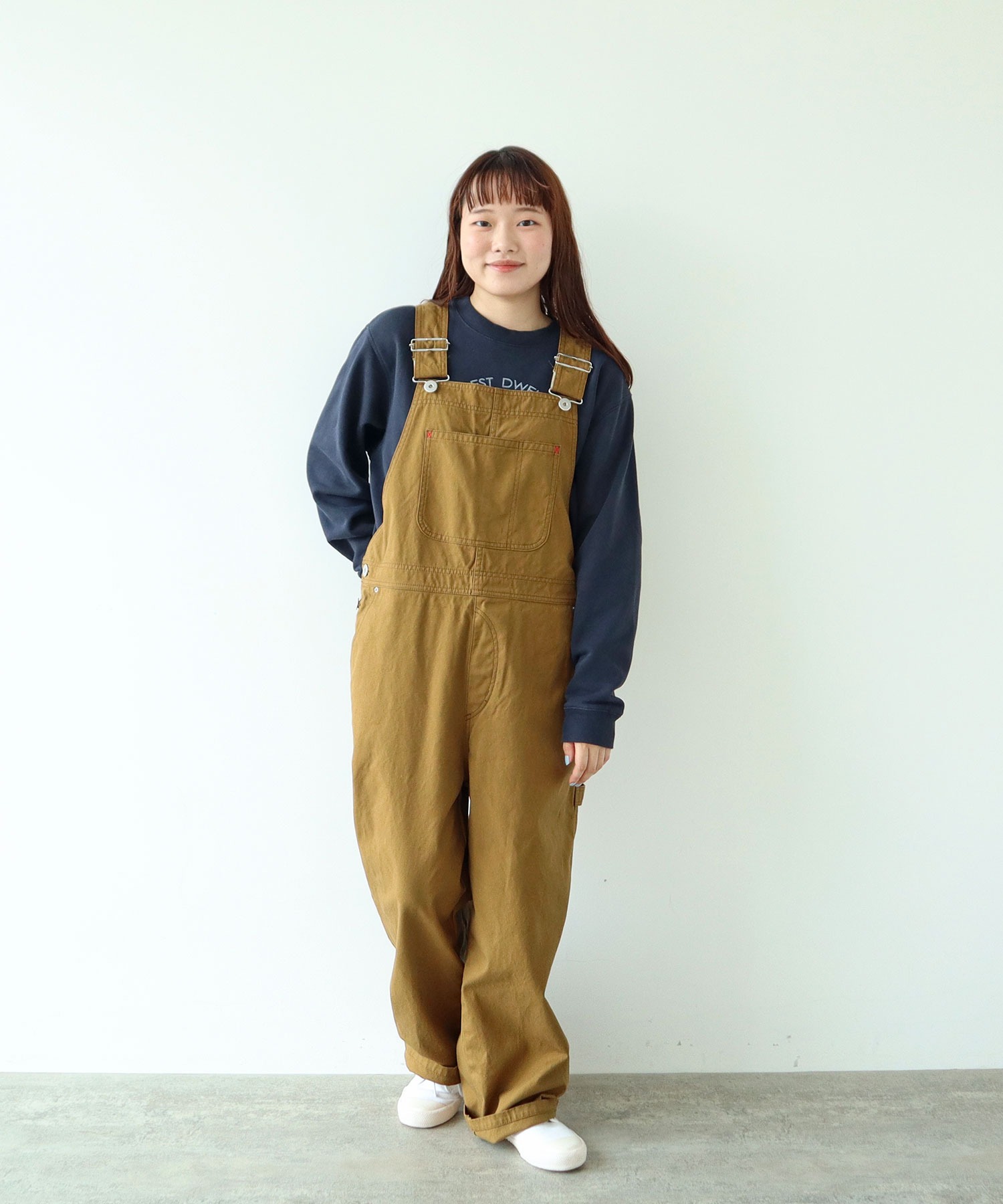 太めの肩ひもや腰幅、ハンマーループにスケールポケット、クロスステッチやリベットなど、ブランドらしいワークディテールをしっかりと入れながらも、配色のカンヌキや長すぎない丈感、ややルーズなシルエットなど女性が着やすい程よく無骨なアイテムに仕上げました。