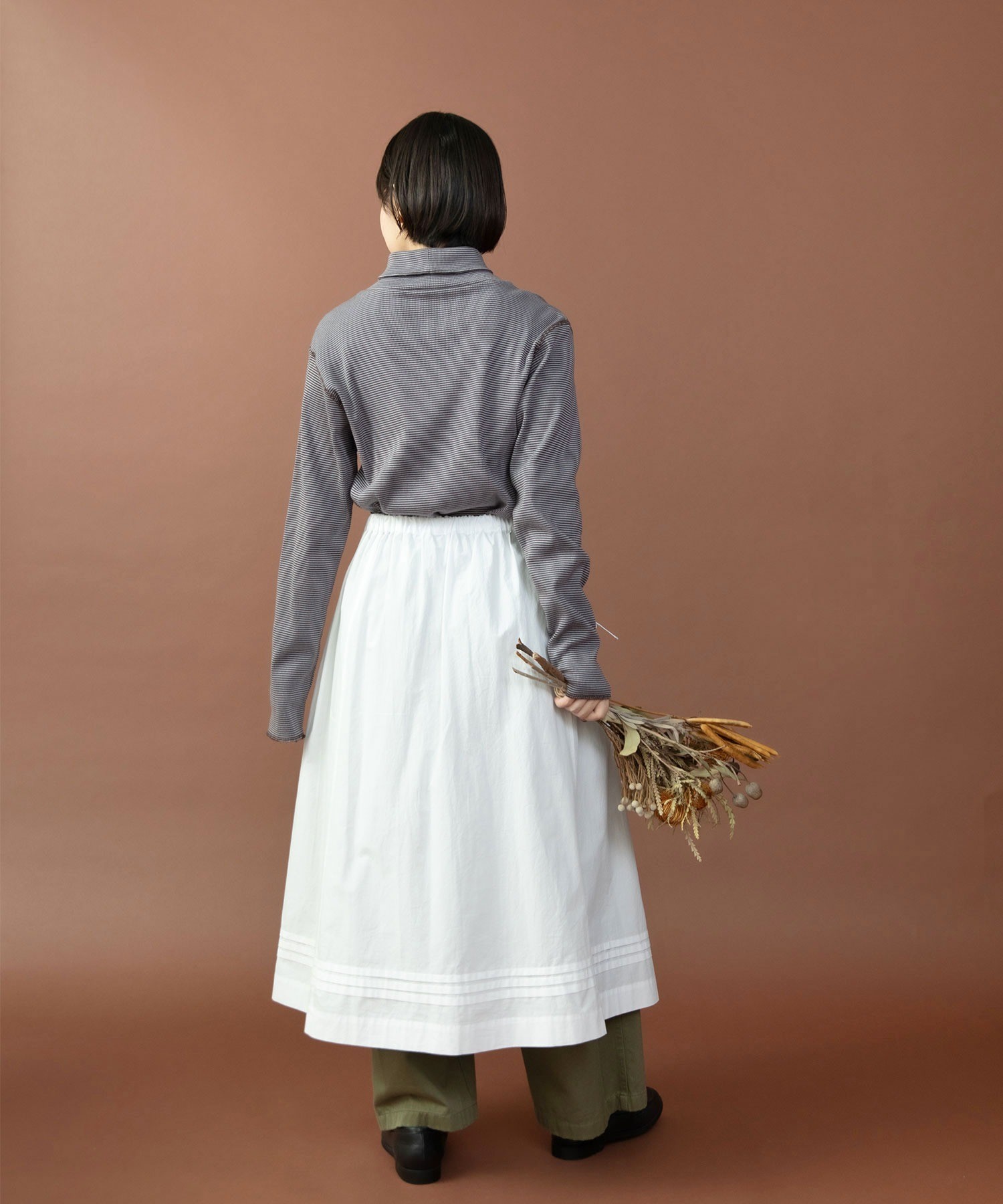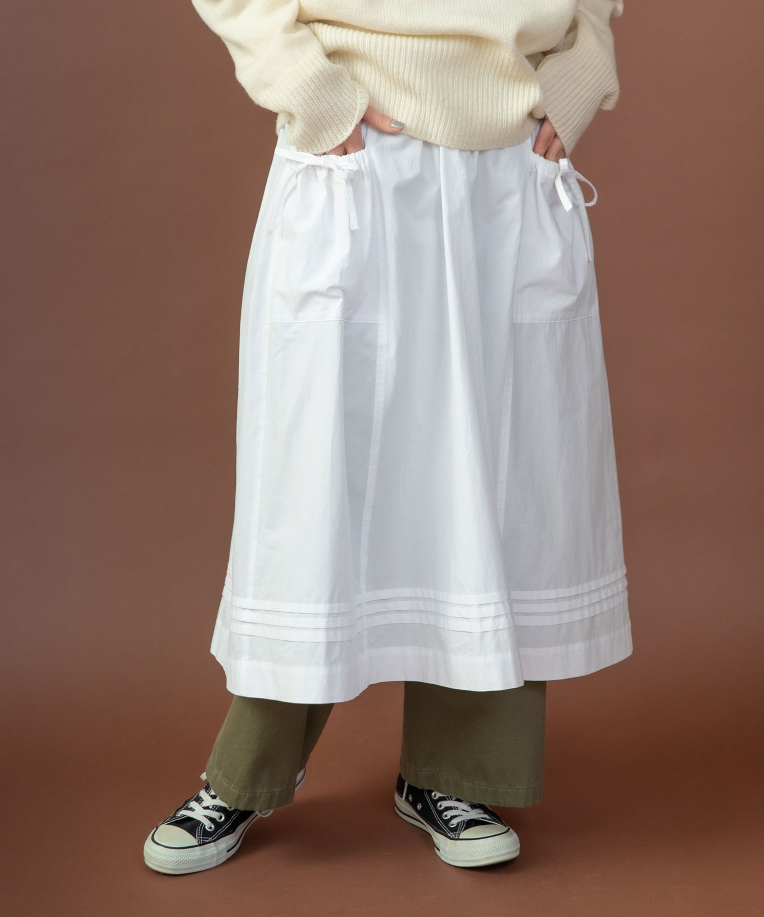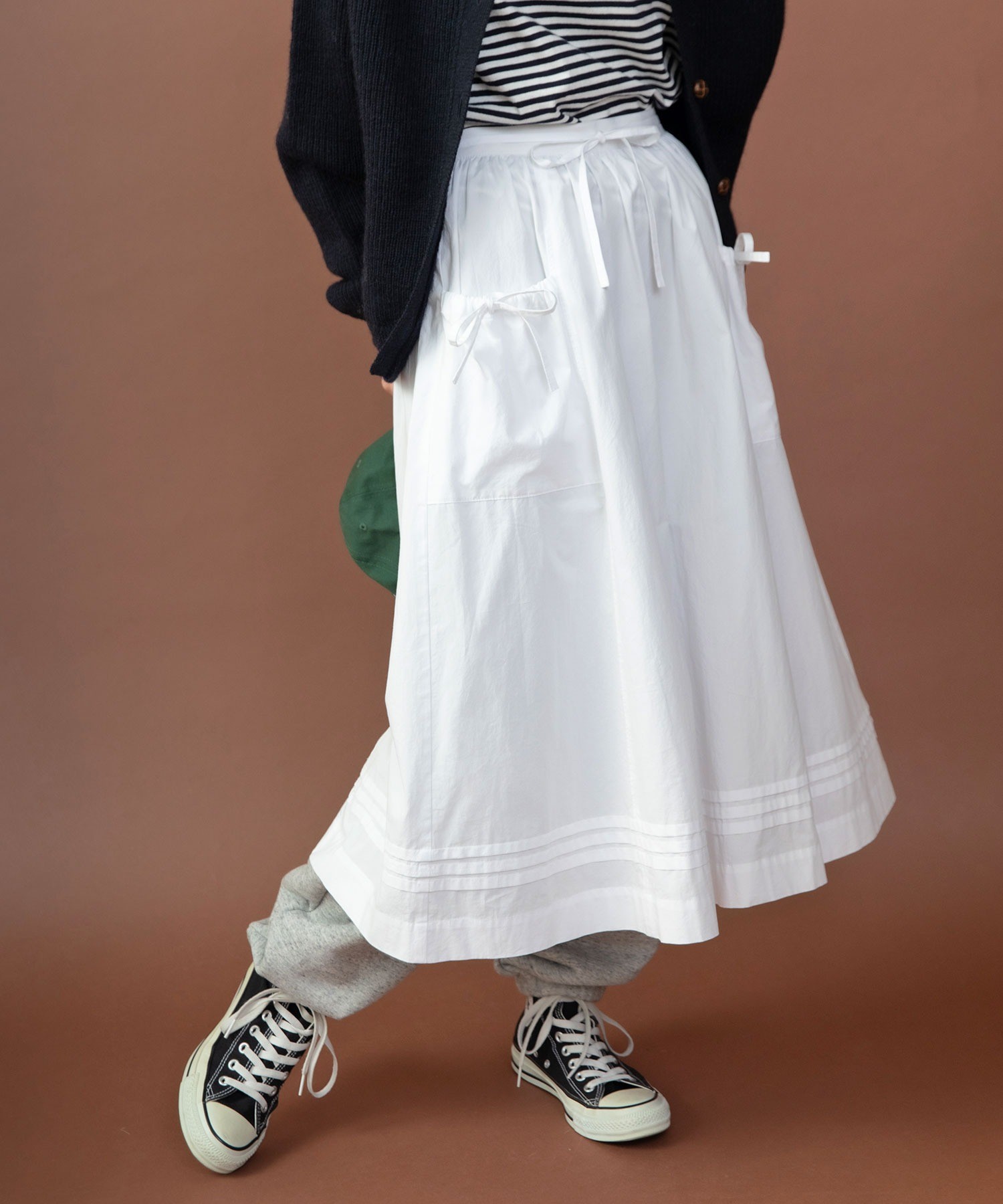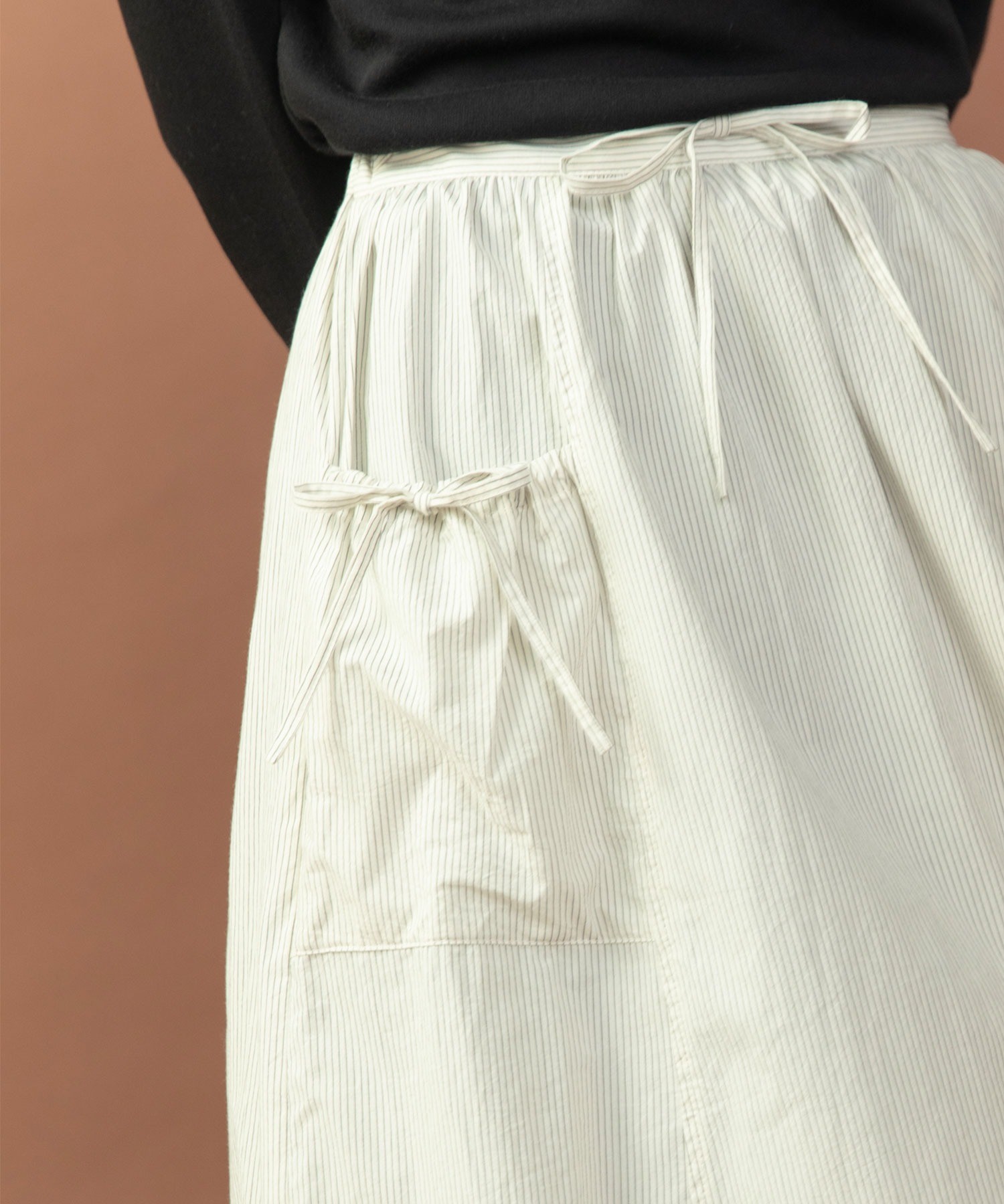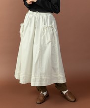 重ね履きしたボトムが覗く絶妙な着丈とボリュームで、シンプルなスタイリングに取り入れるだけで奥行きのある着こなしに。ウエストリボンはフロントやバックで結んでエプロンのように着たり、サイドポケットのリボンはあえて結ばすに垂らしてもリラックスした抜け感が出ます。リボンの結び具合によってシルエットの変わるポケットのギャザーや裾のピンタックなど、ほのかにかわいらしいディテールをメンズライクなアイテムに合わせるバランスがおすすめ。デニムやカーゴパンツを合わせれば、ちょうど良い甘さ加減のカジュアルスタイルが完成します。